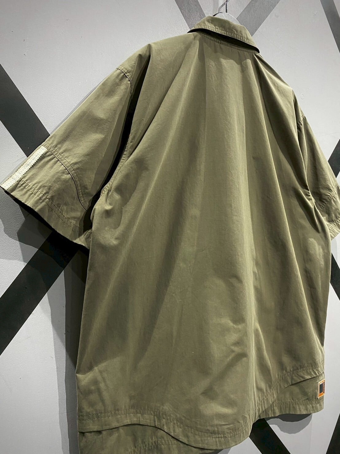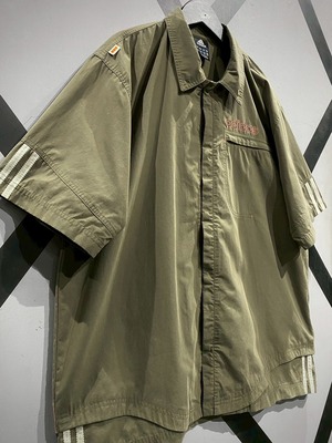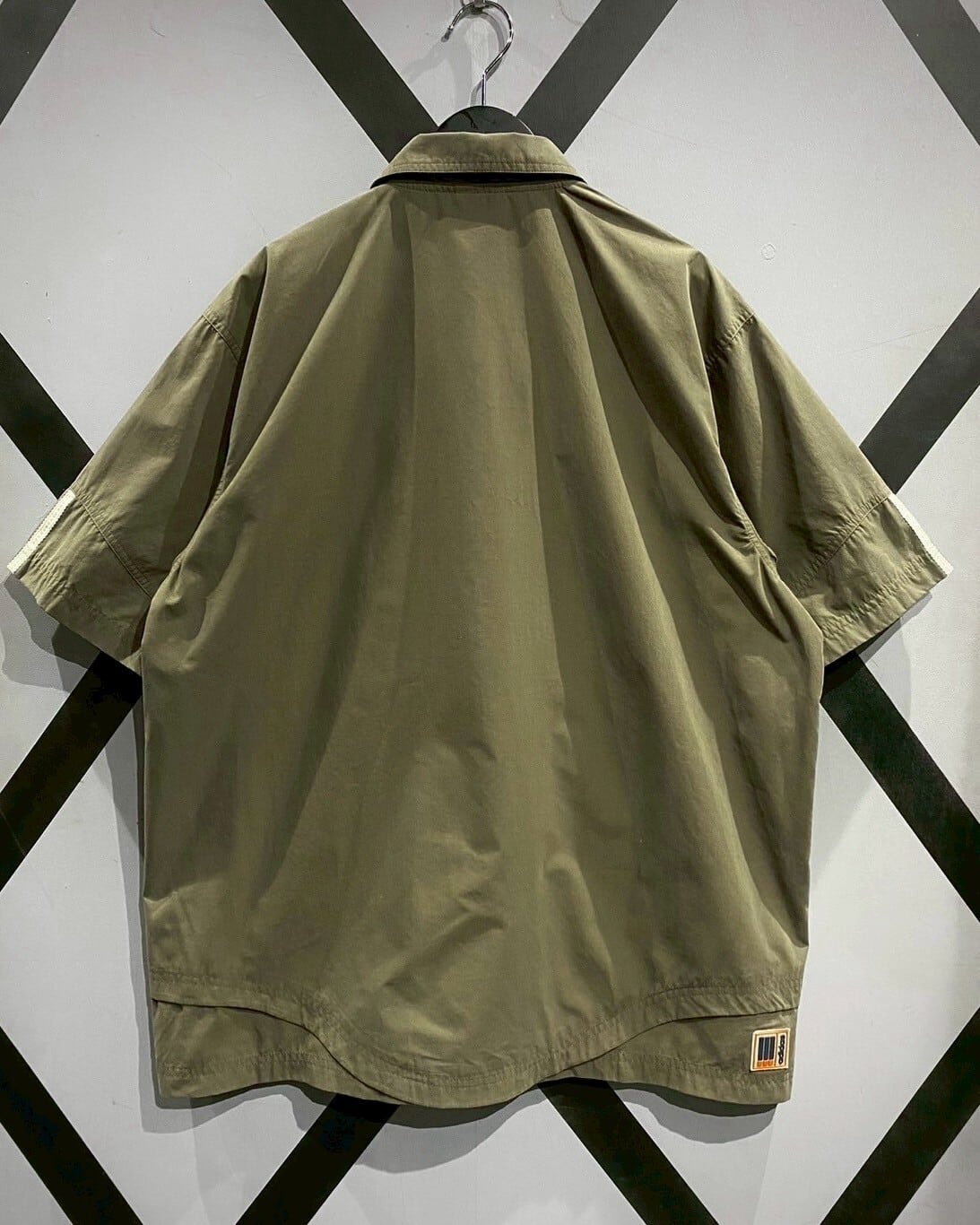 カーキのボディに、裾付近に曲線の切り替えを施し、袖口、ボディサイドに3ストライプを載せた半袖シャツ。