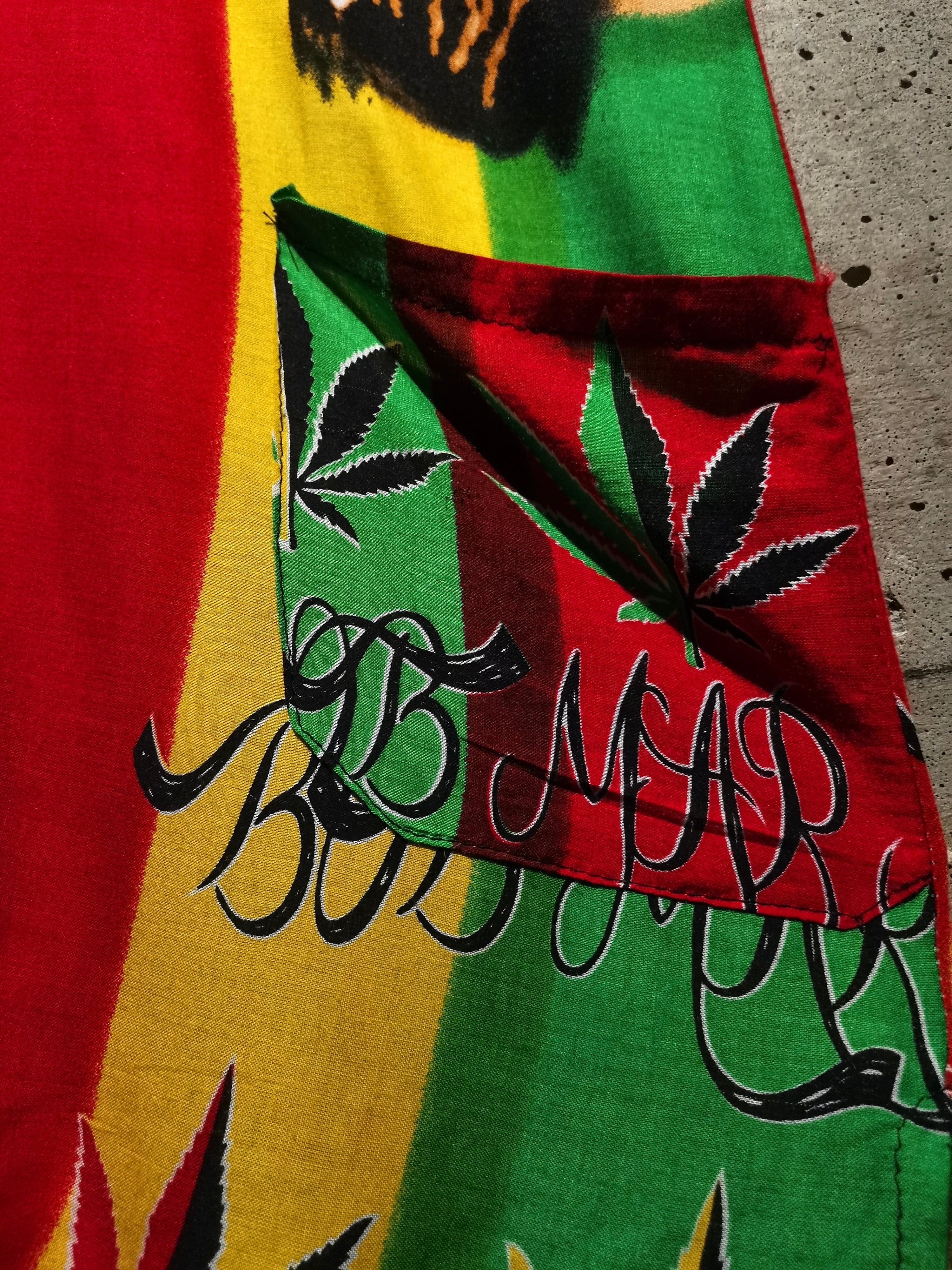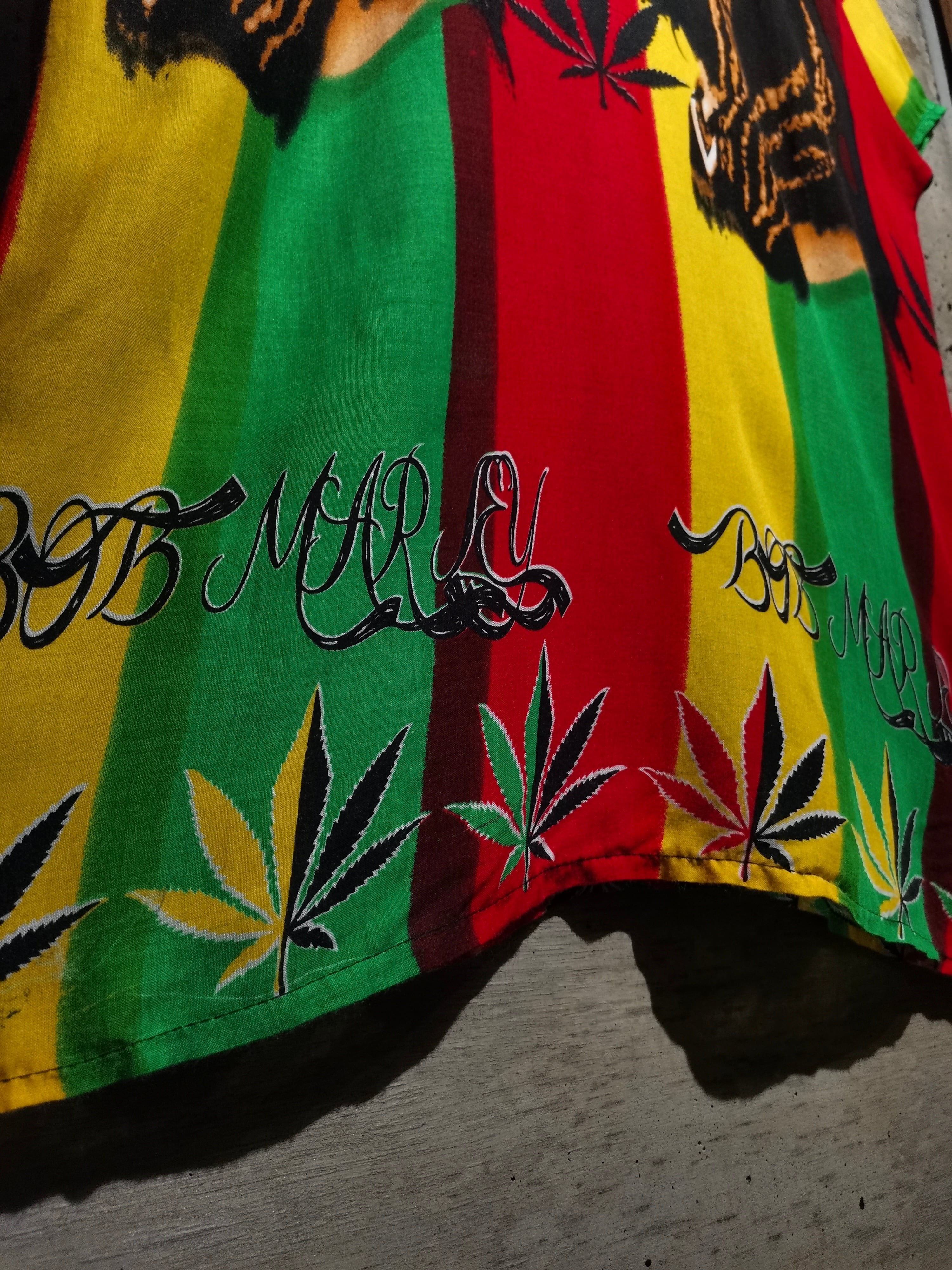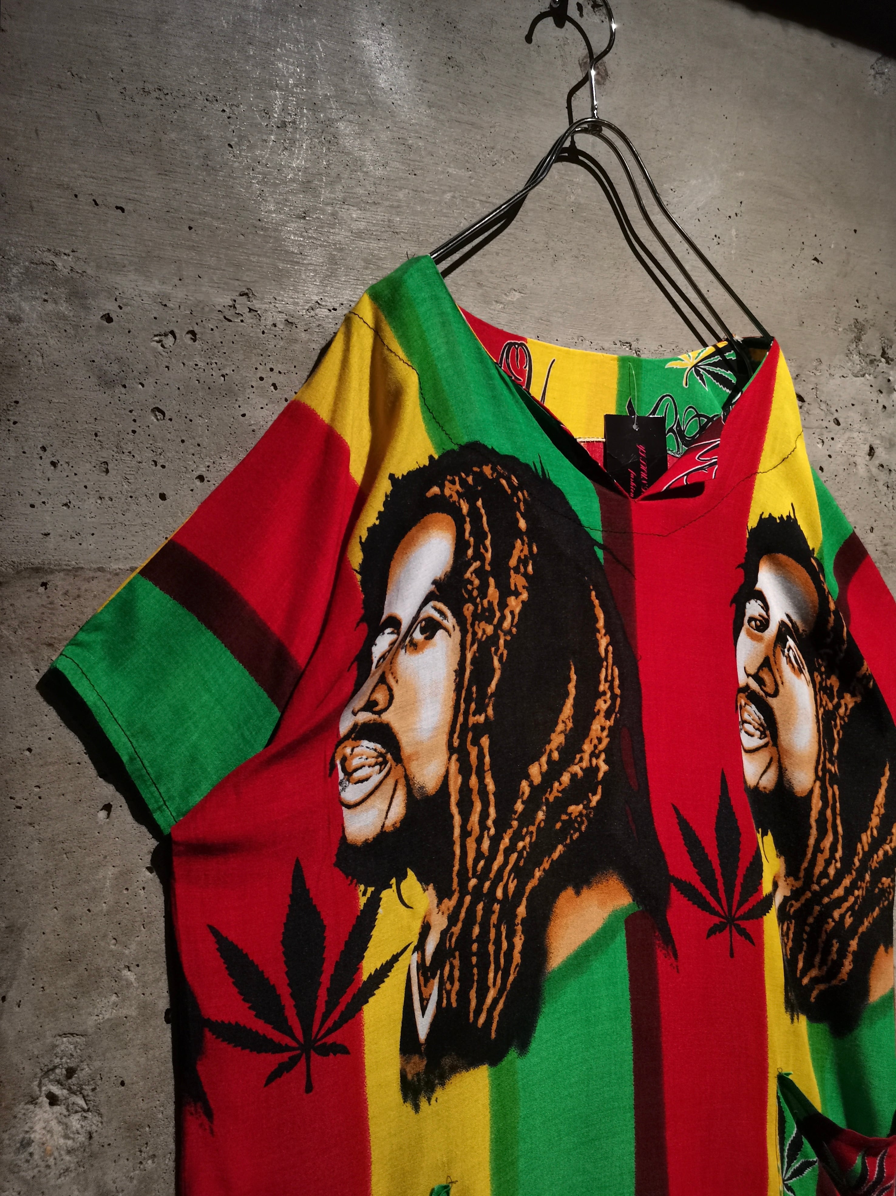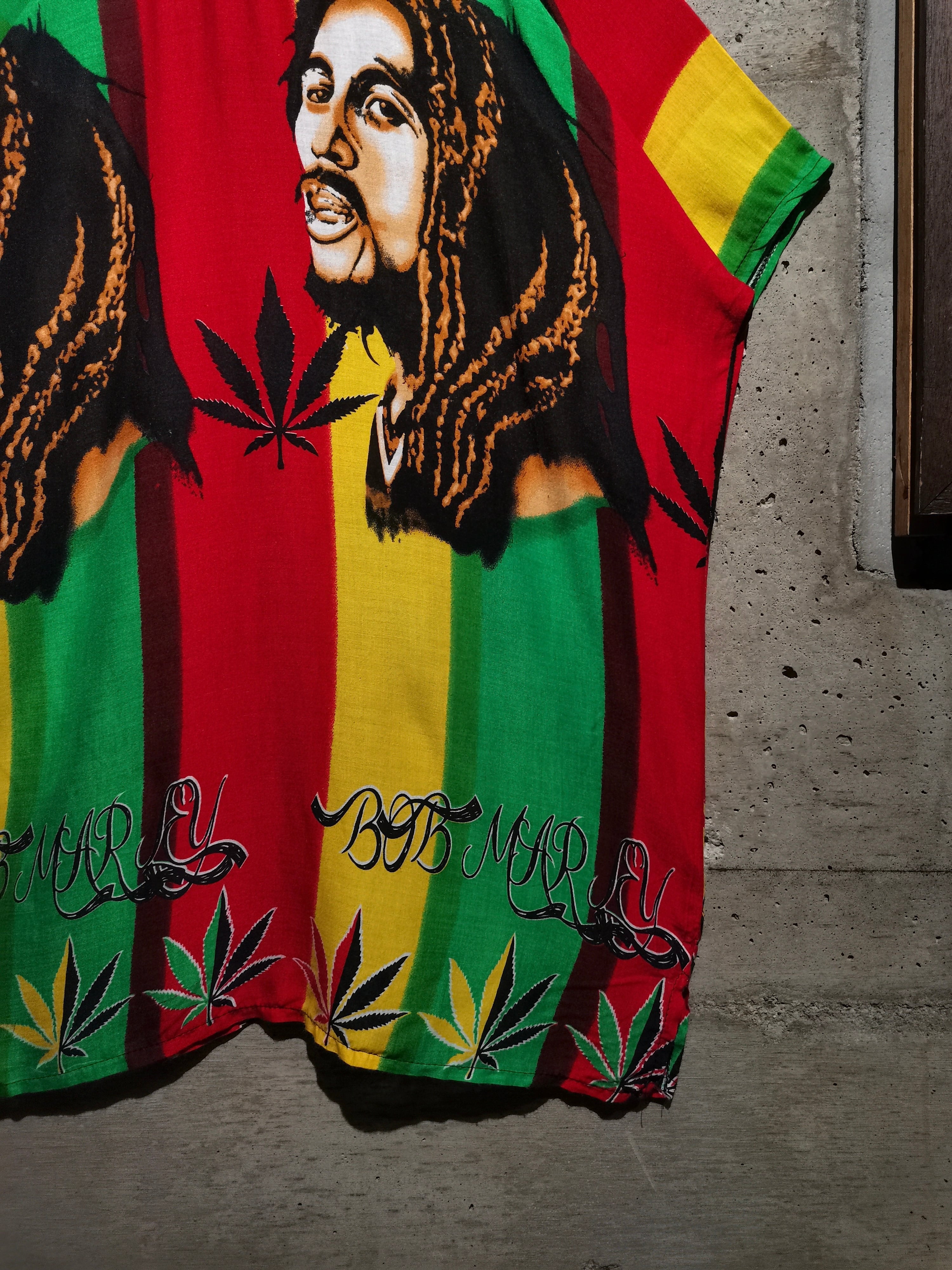 深みのあるラスタカラーをベースに、大胆に描かれたBOB MARLEYのポートレートが目を奪う1着。マリファナリーフモチーフのグラフィックと相まって、ストリートカルチャーとレゲエスピリットが存分に詰め込まれています。