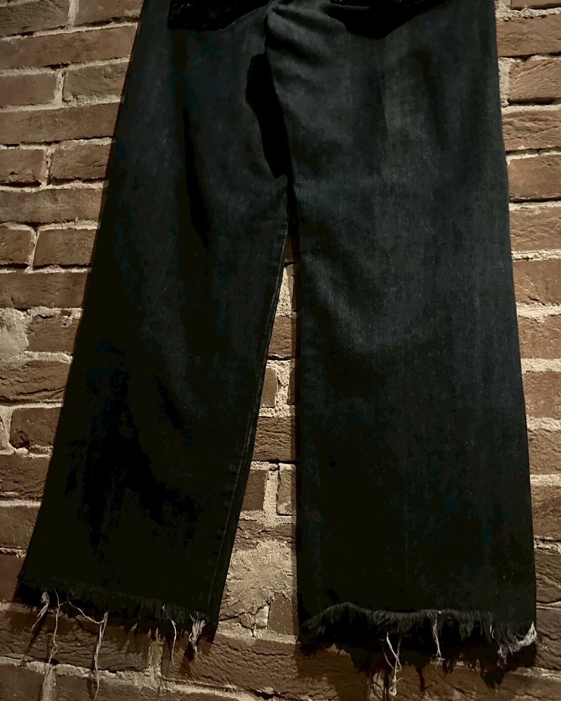 ブラックのデニムをベースに、バックポケットにベロア素材を切り替えたバギーデニムパンツ。