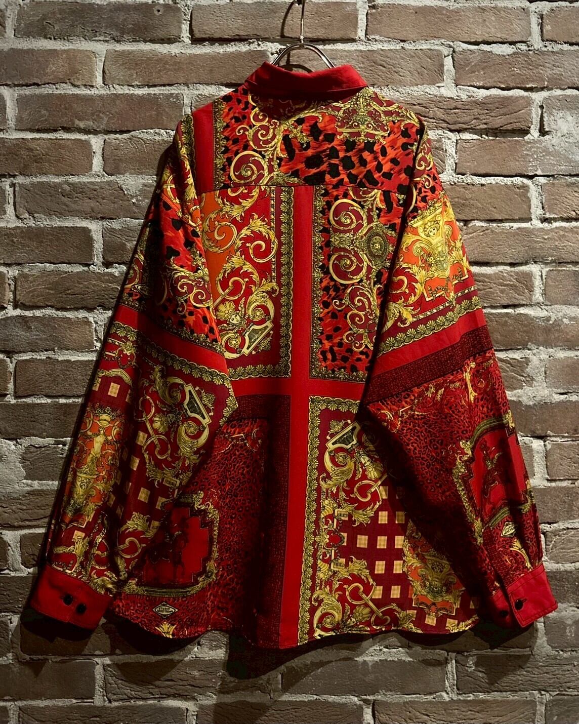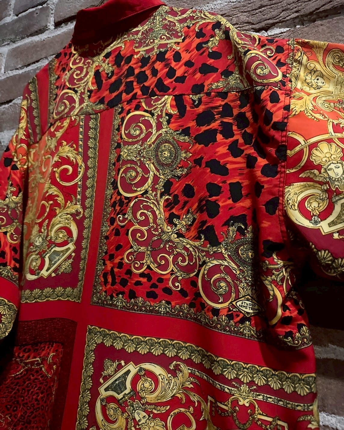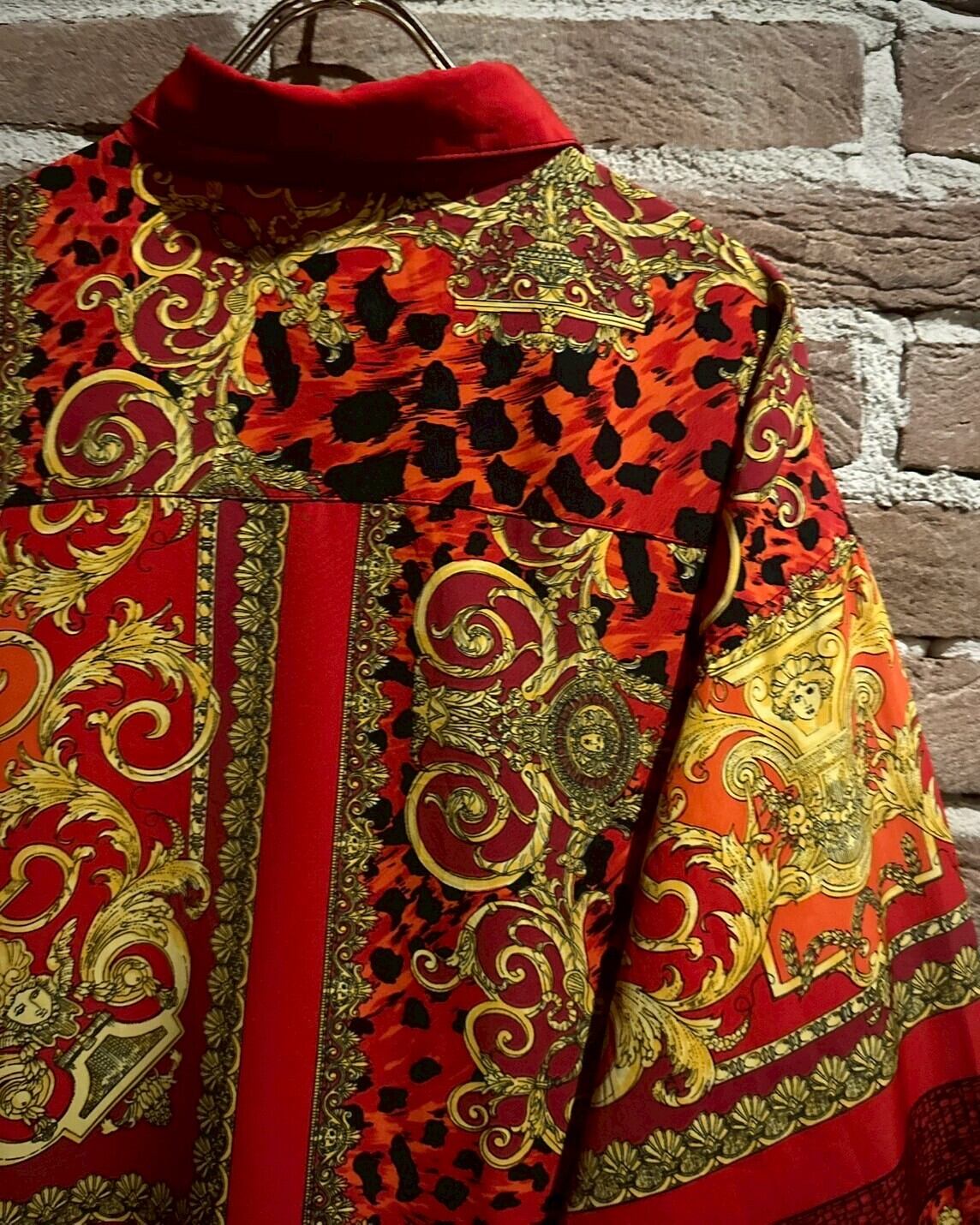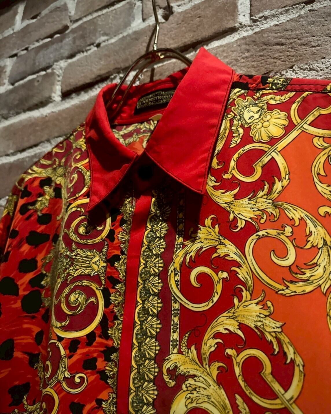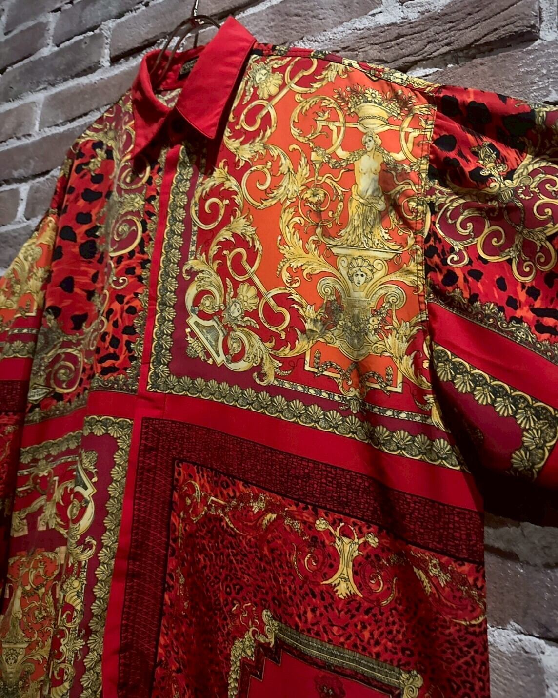 発色の良い赤色をベースに、レオパードや馬、黄色の装飾柄等、ラグジュアリーな雰囲気をムンムンに放つデザインが載った長袖シャツ。