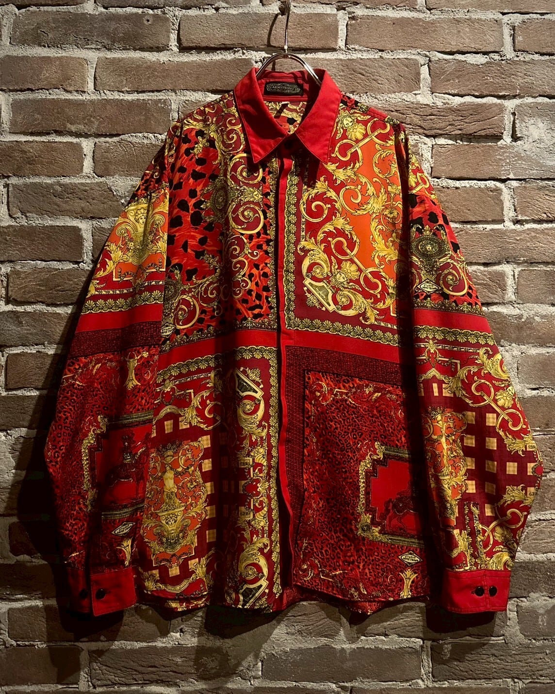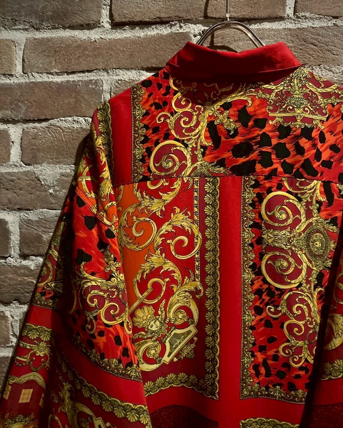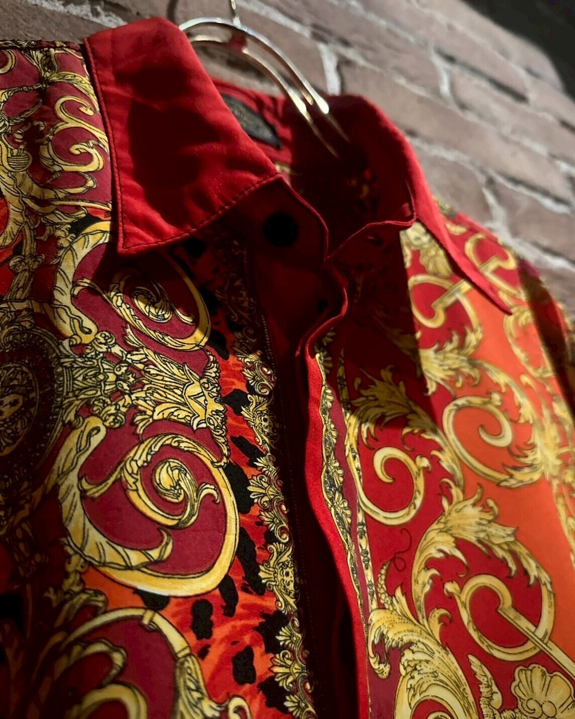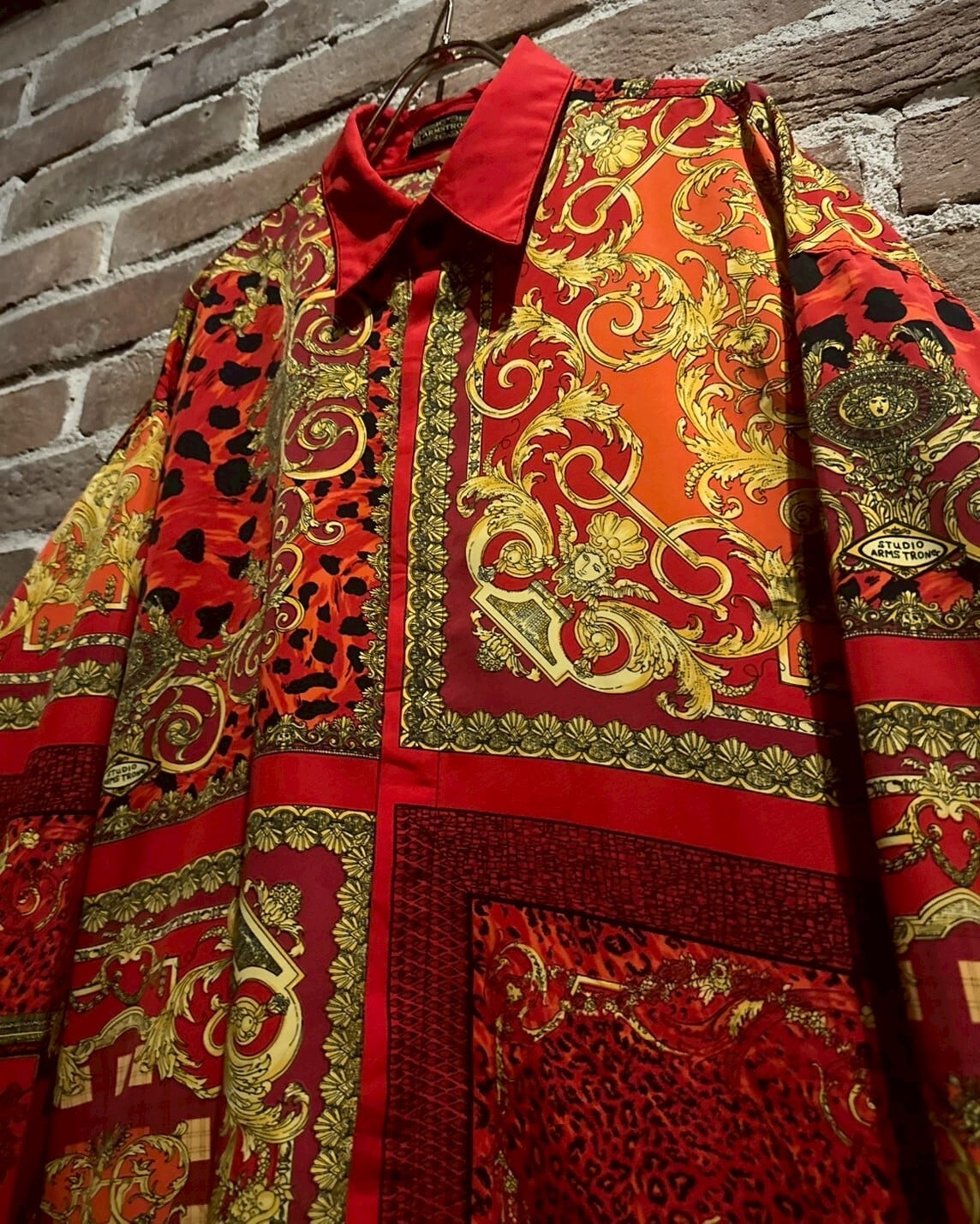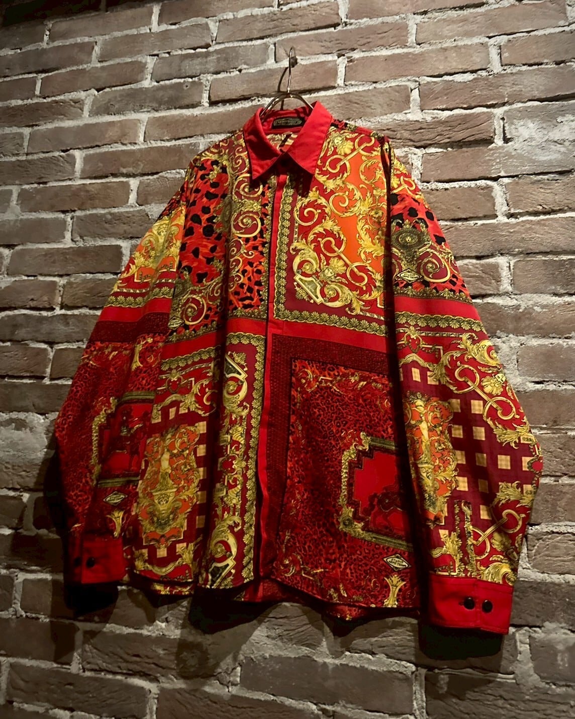 発色の良い赤色をベースに、レオパードや馬、黄色の装飾柄等、ラグジュアリーな雰囲気をムンムンに放つデザインが載った長袖シャツ。