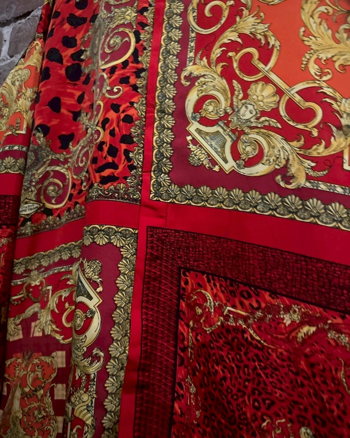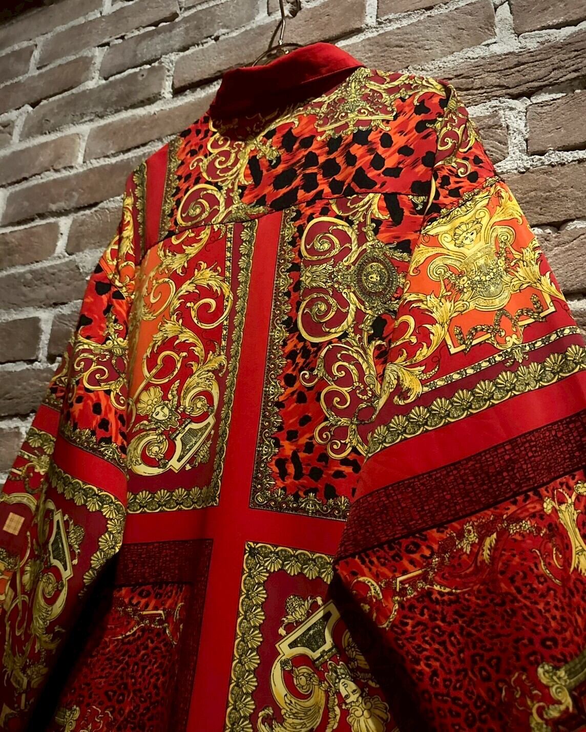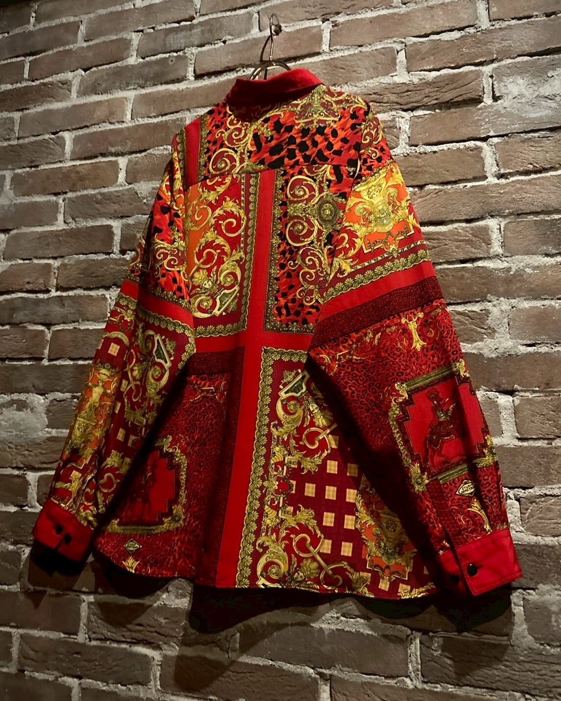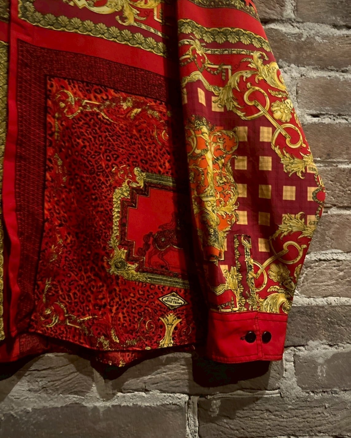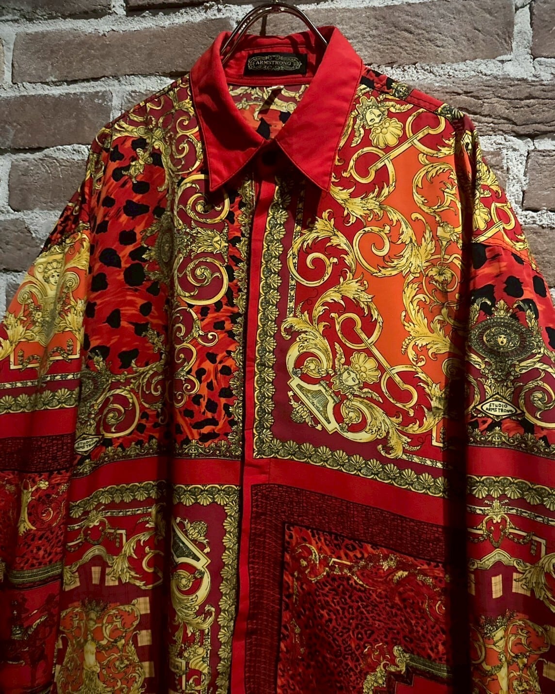 発色の良い赤色をベースに、レオパードや馬、黄色の装飾柄等、ラグジュアリーな雰囲気をムンムンに放つデザインが載った長袖シャツ。