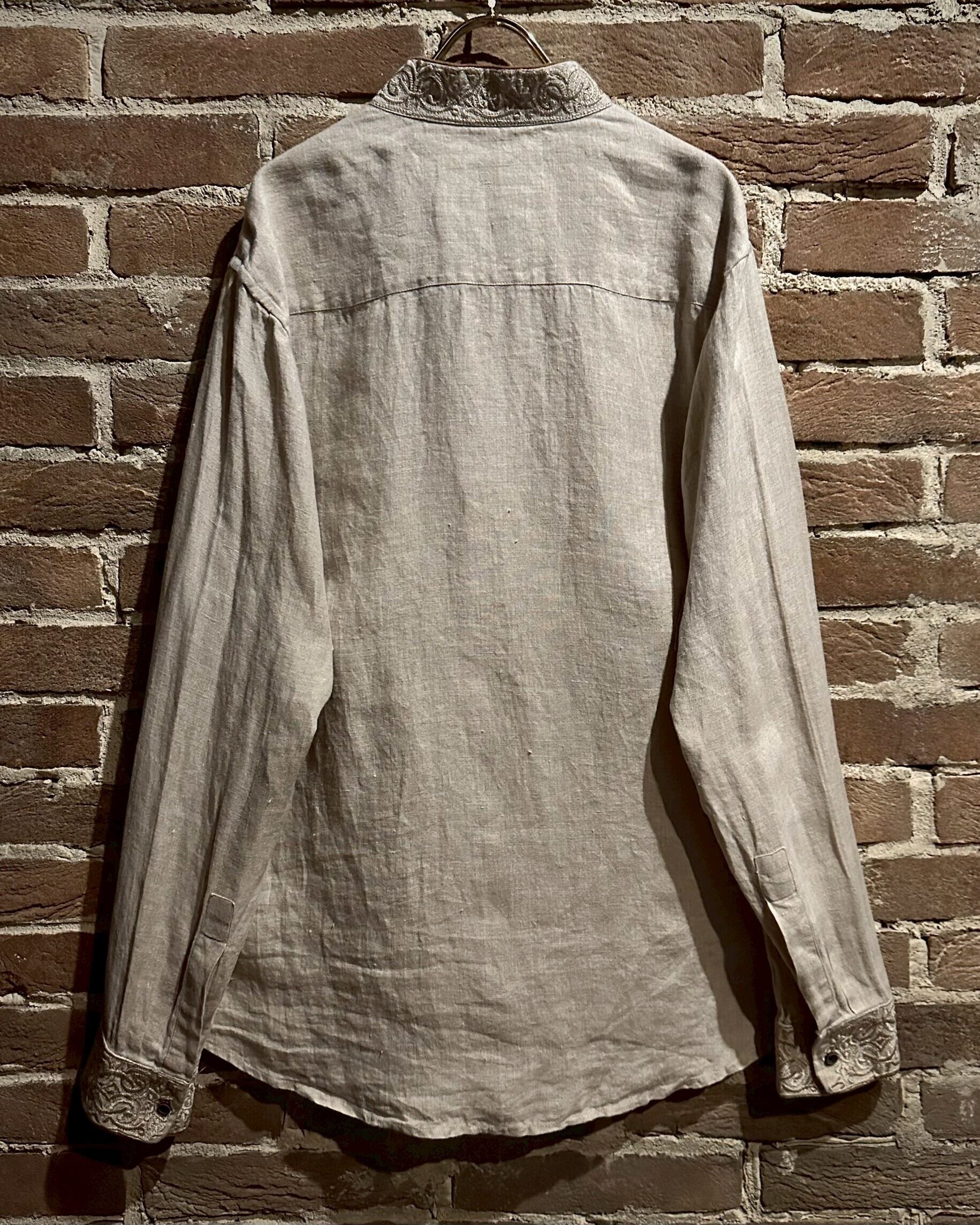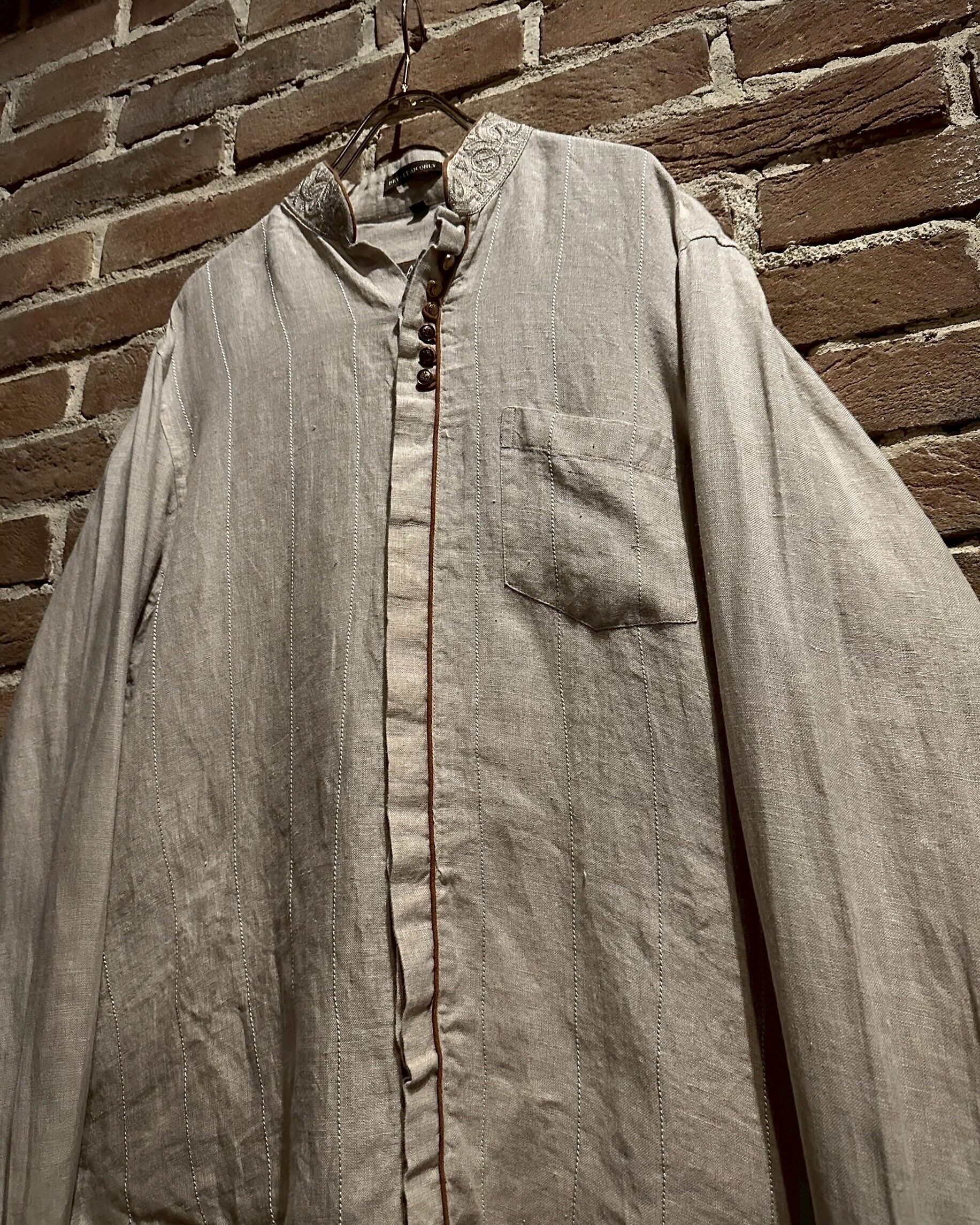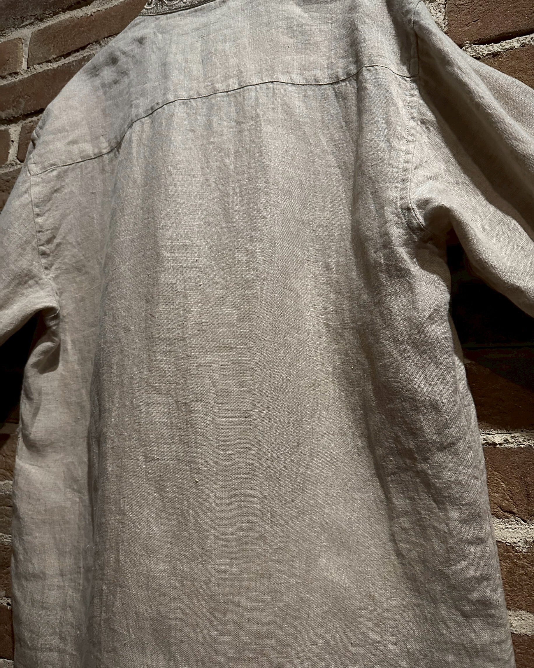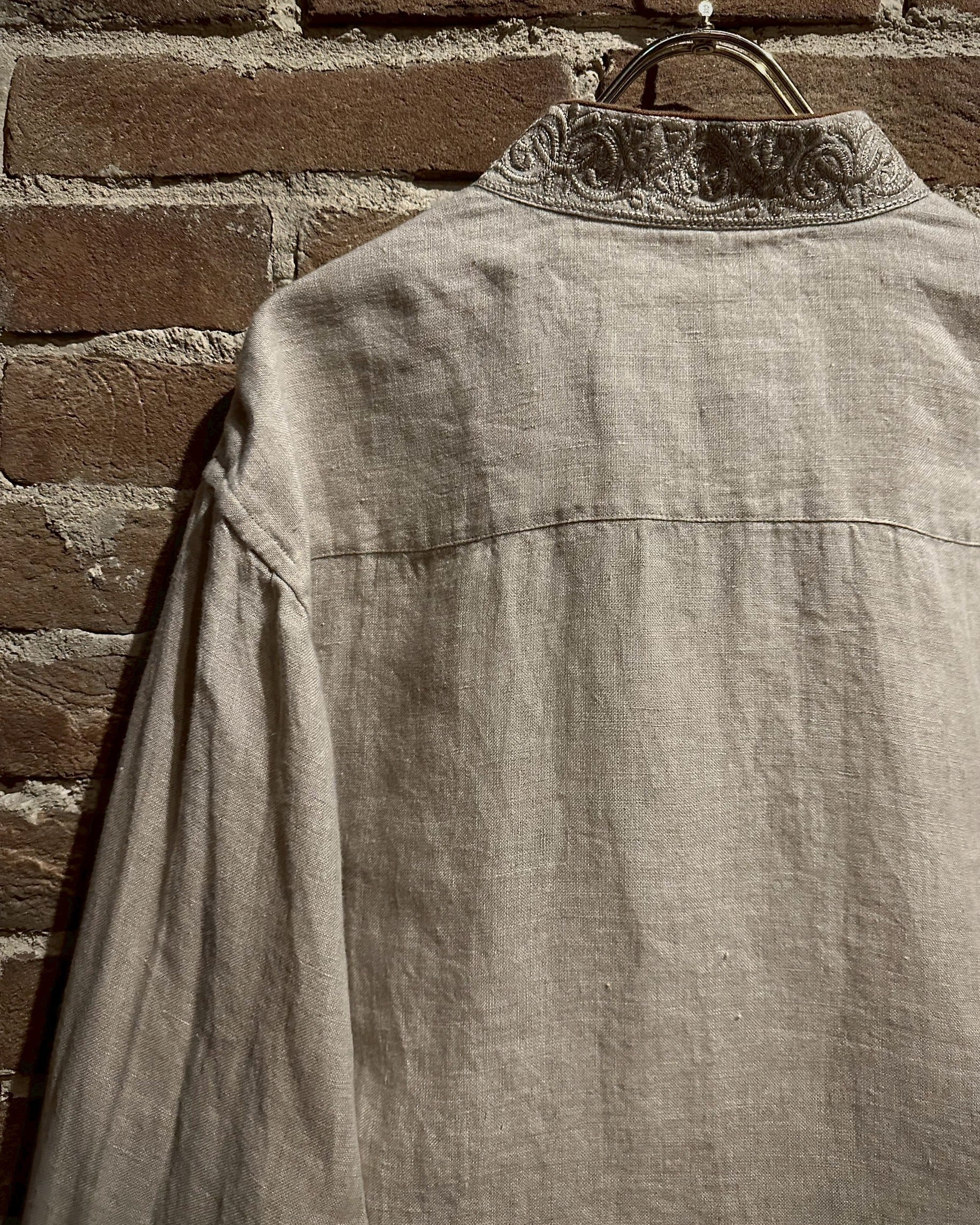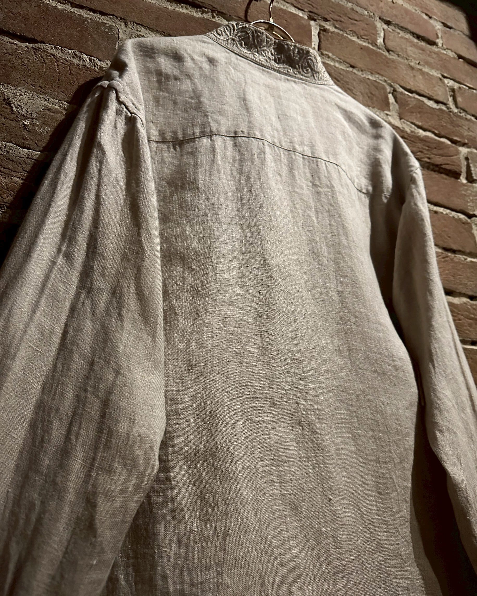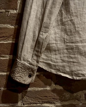 生成りのリネン生地をボディに使用し、襟&袖口に繊細な美しい刺繍を刻み込んだスタンドカラーリネンシャツ。