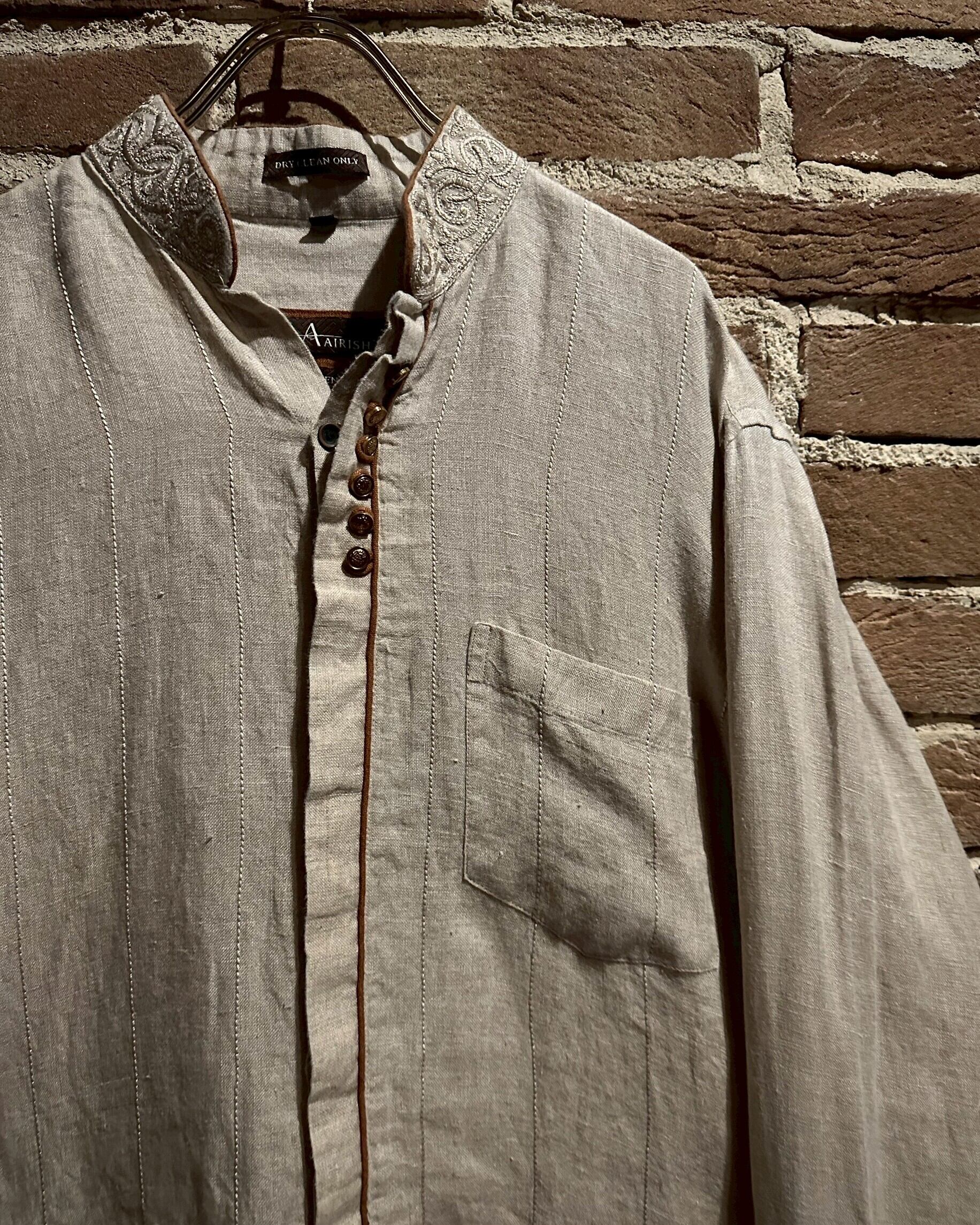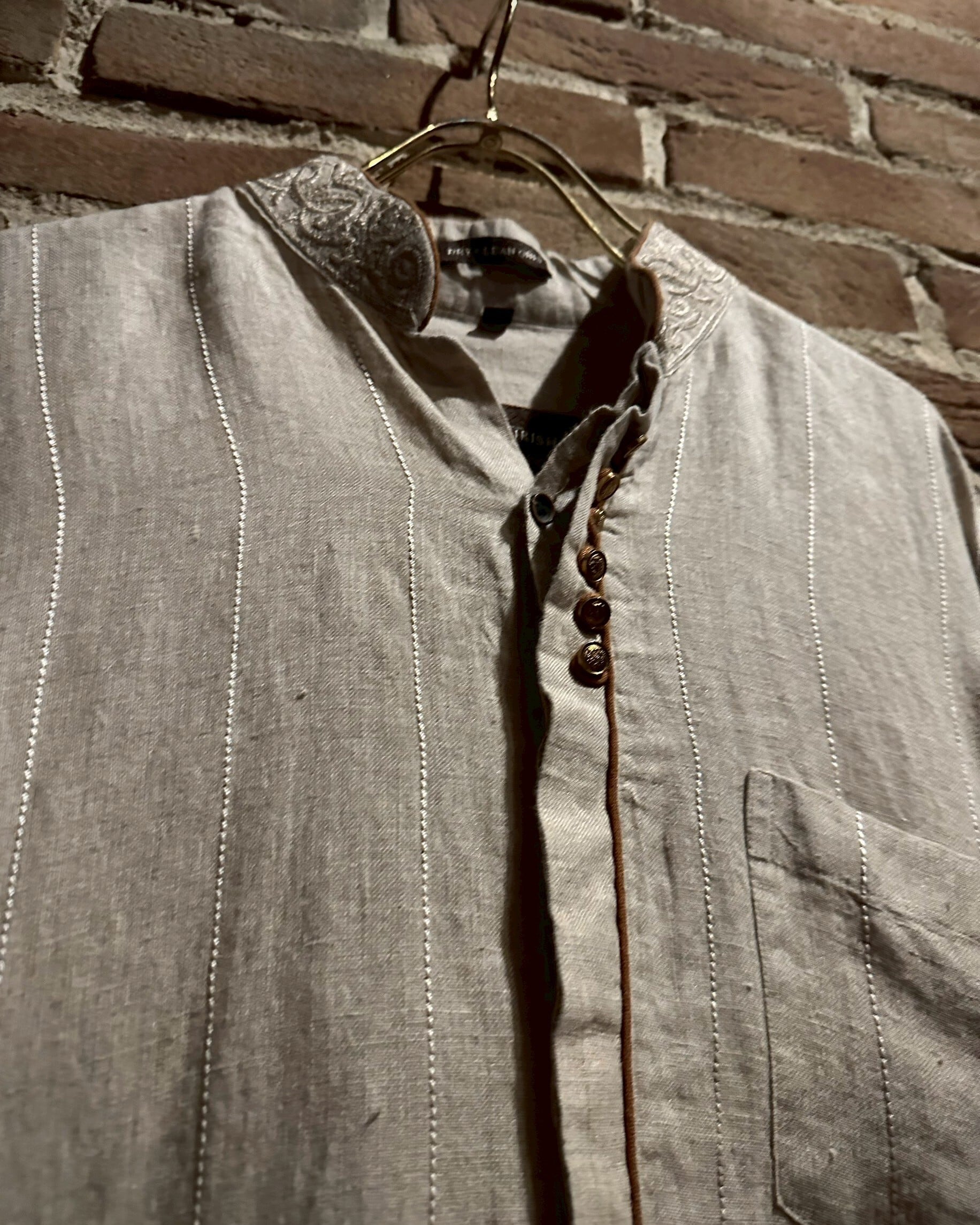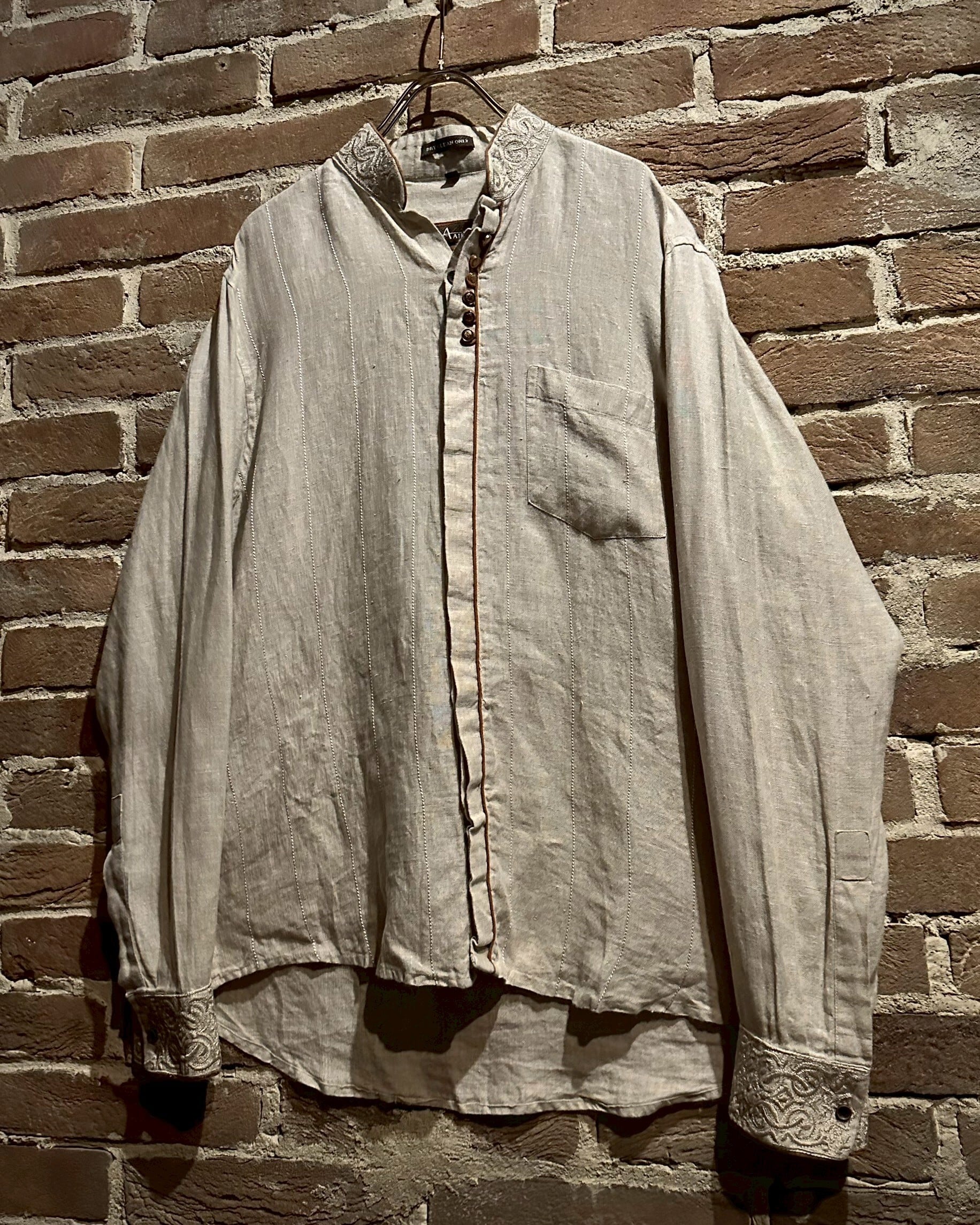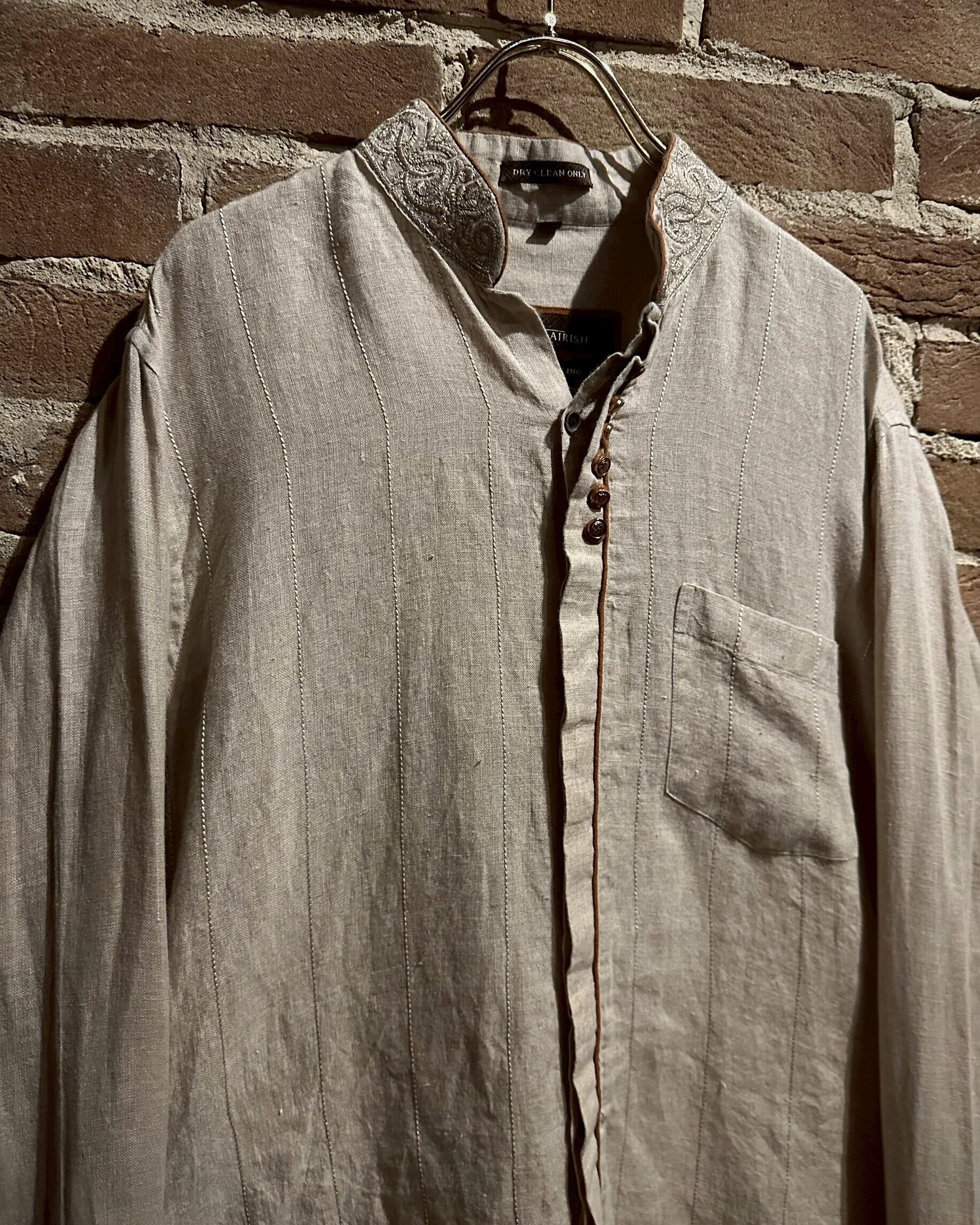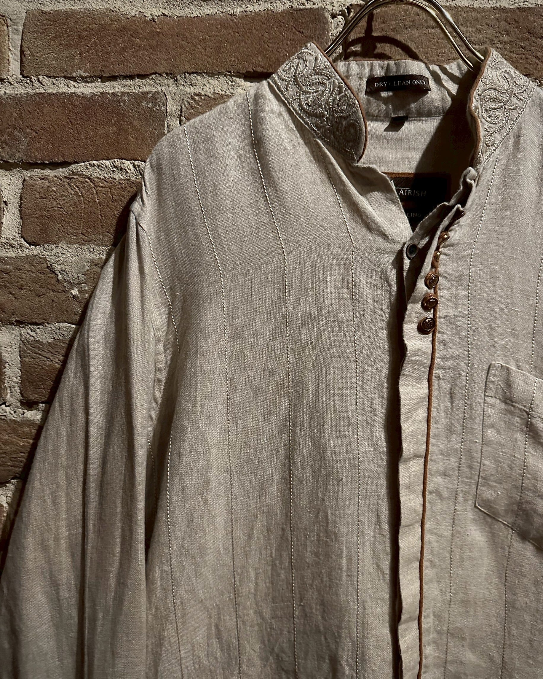 生成りのリネン生地をボディに使用し、襟&袖口に繊細な美しい刺繍を刻み込んだスタンドカラーリネンシャツ。