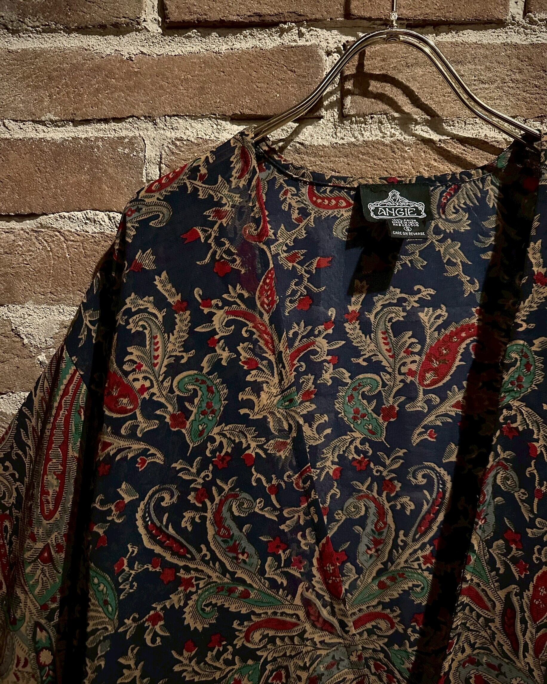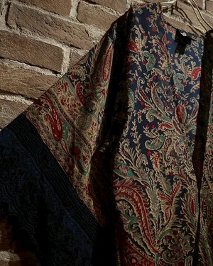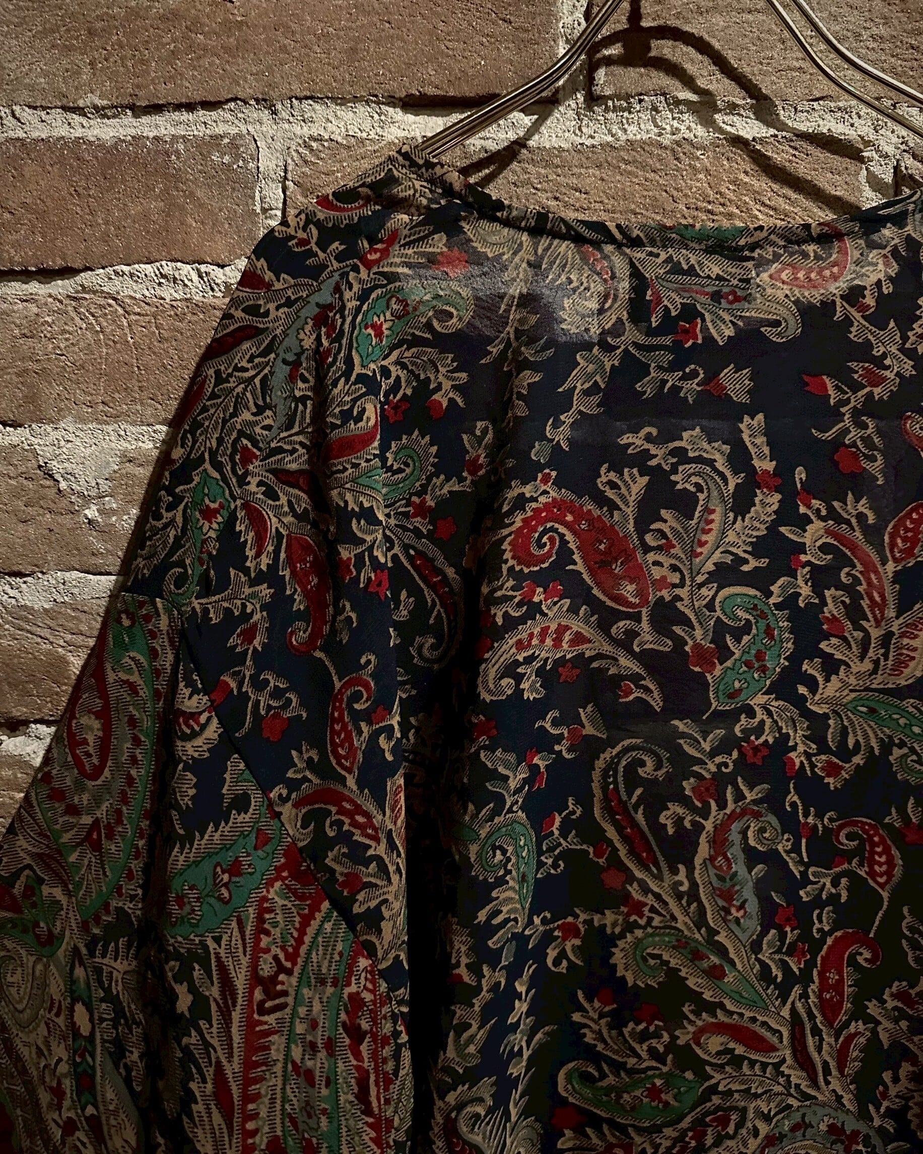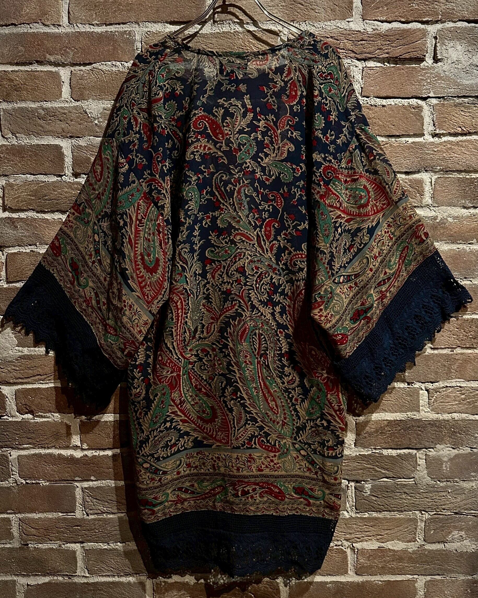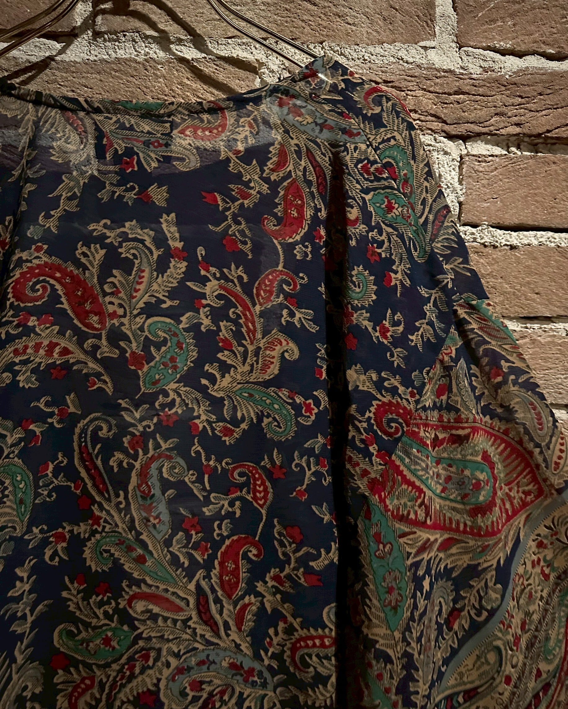 透け感のあるシアー生地をボディに用い、上品なペイズリー柄をボディ全面に載せ、袖口、裾にレースの装飾を施したガウン。