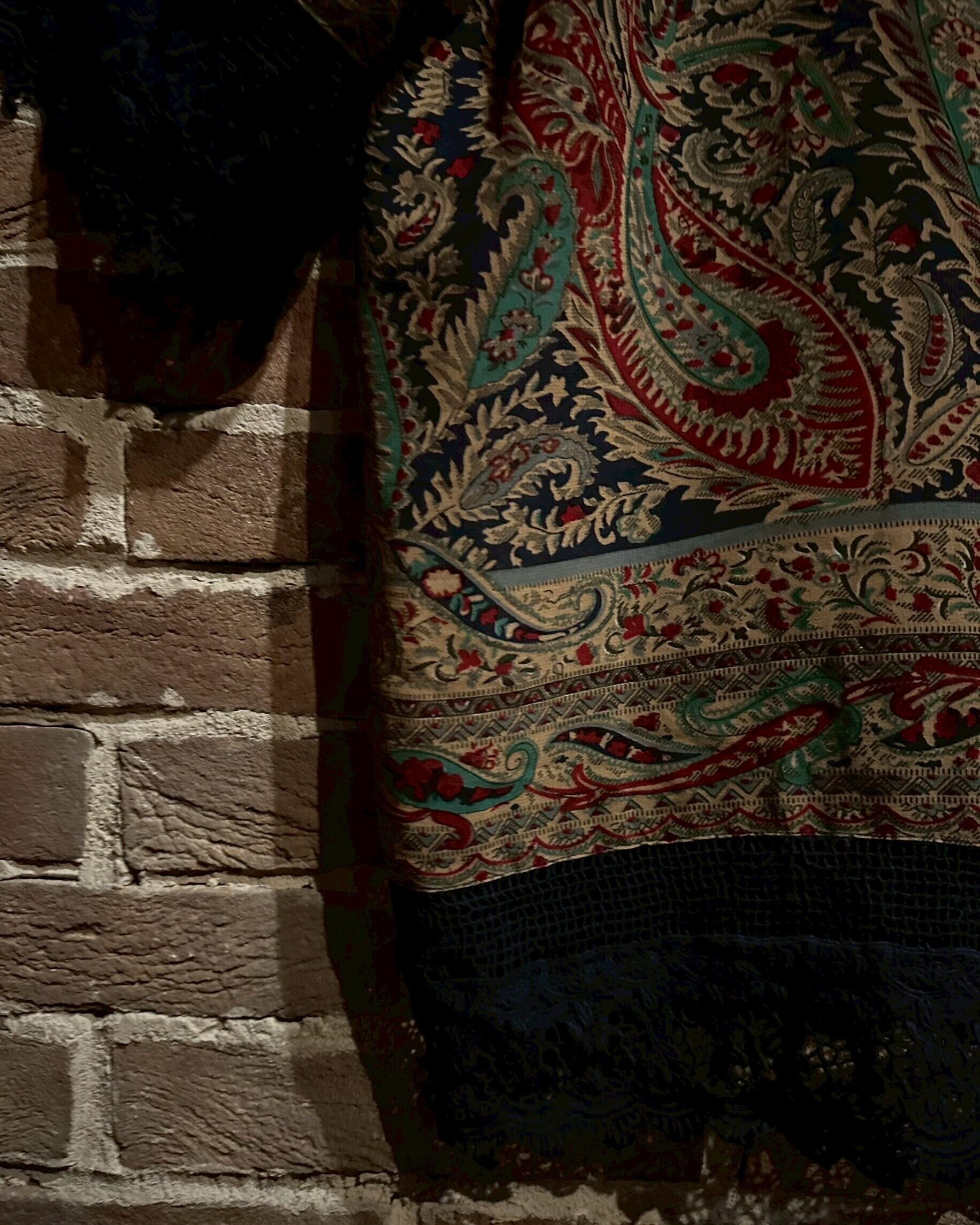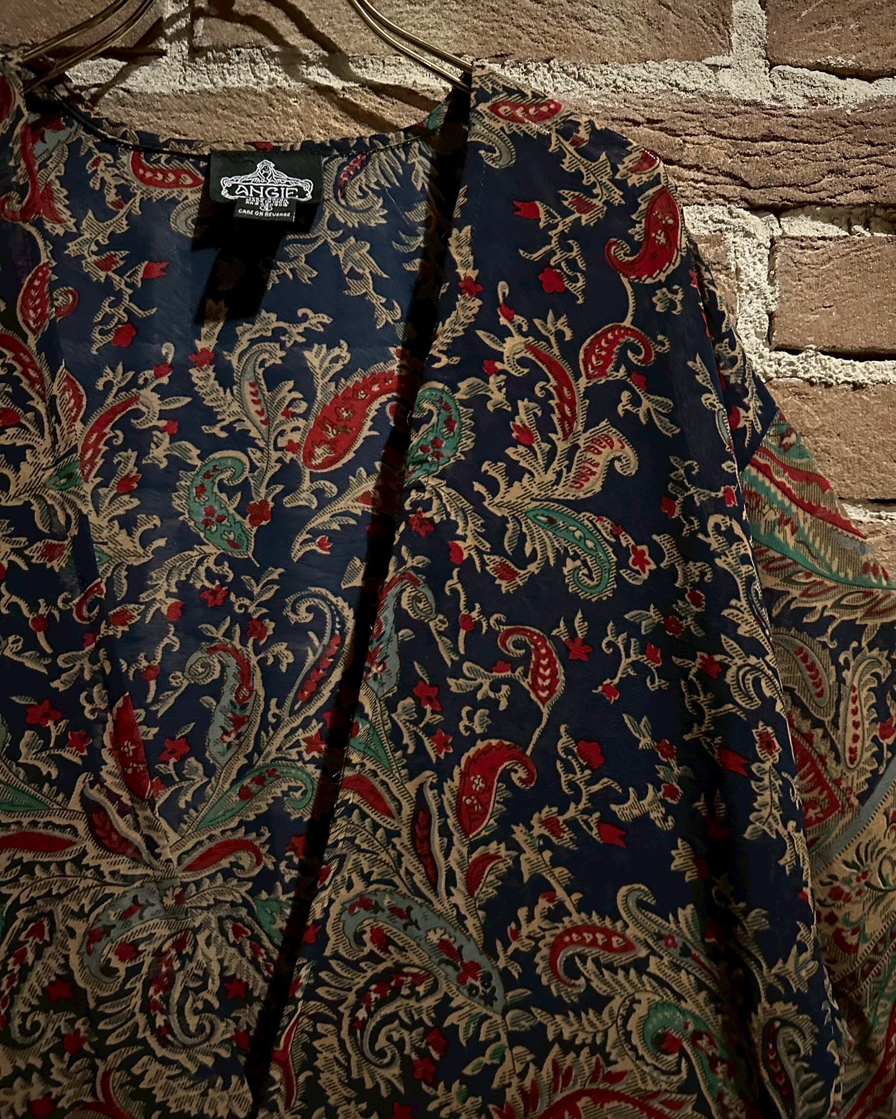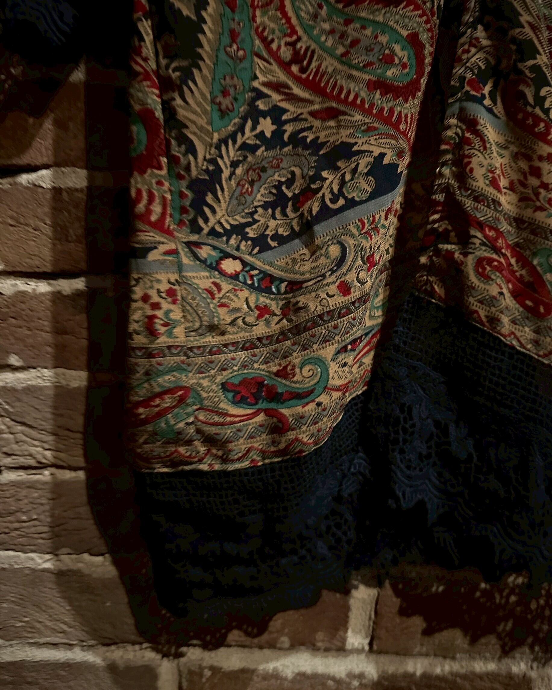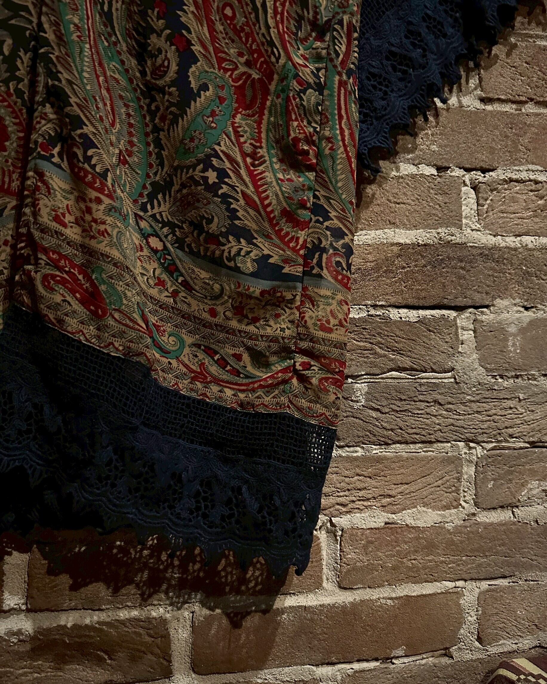透け感のあるシアー生地をボディに用い、上品なペイズリー柄をボディ全面に載せ、袖口、裾にレースの装飾を施したガウン。