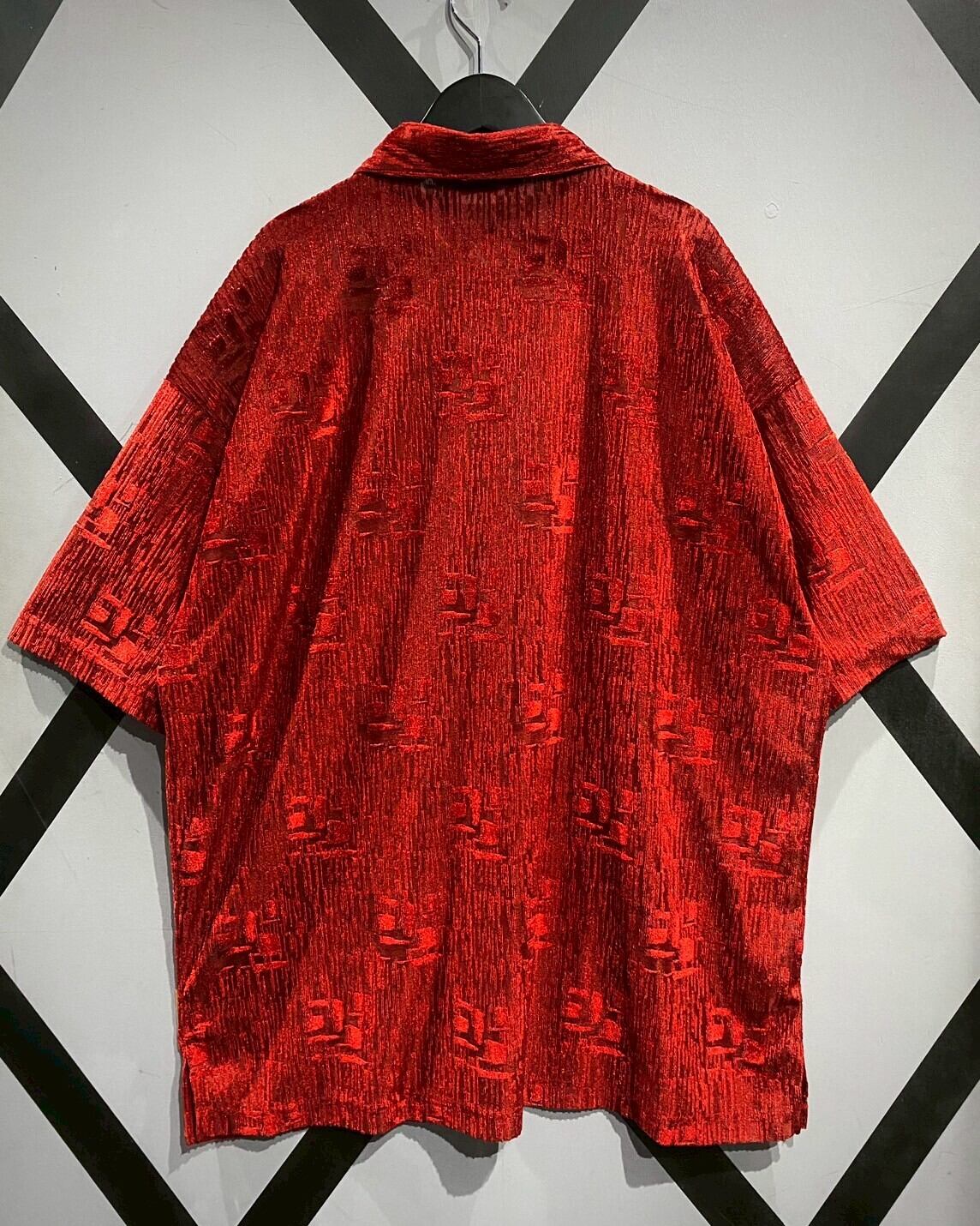 透け感のあるシアーのボディに、織りによってアーティスティックなデザインを載せた半袖シャツ。