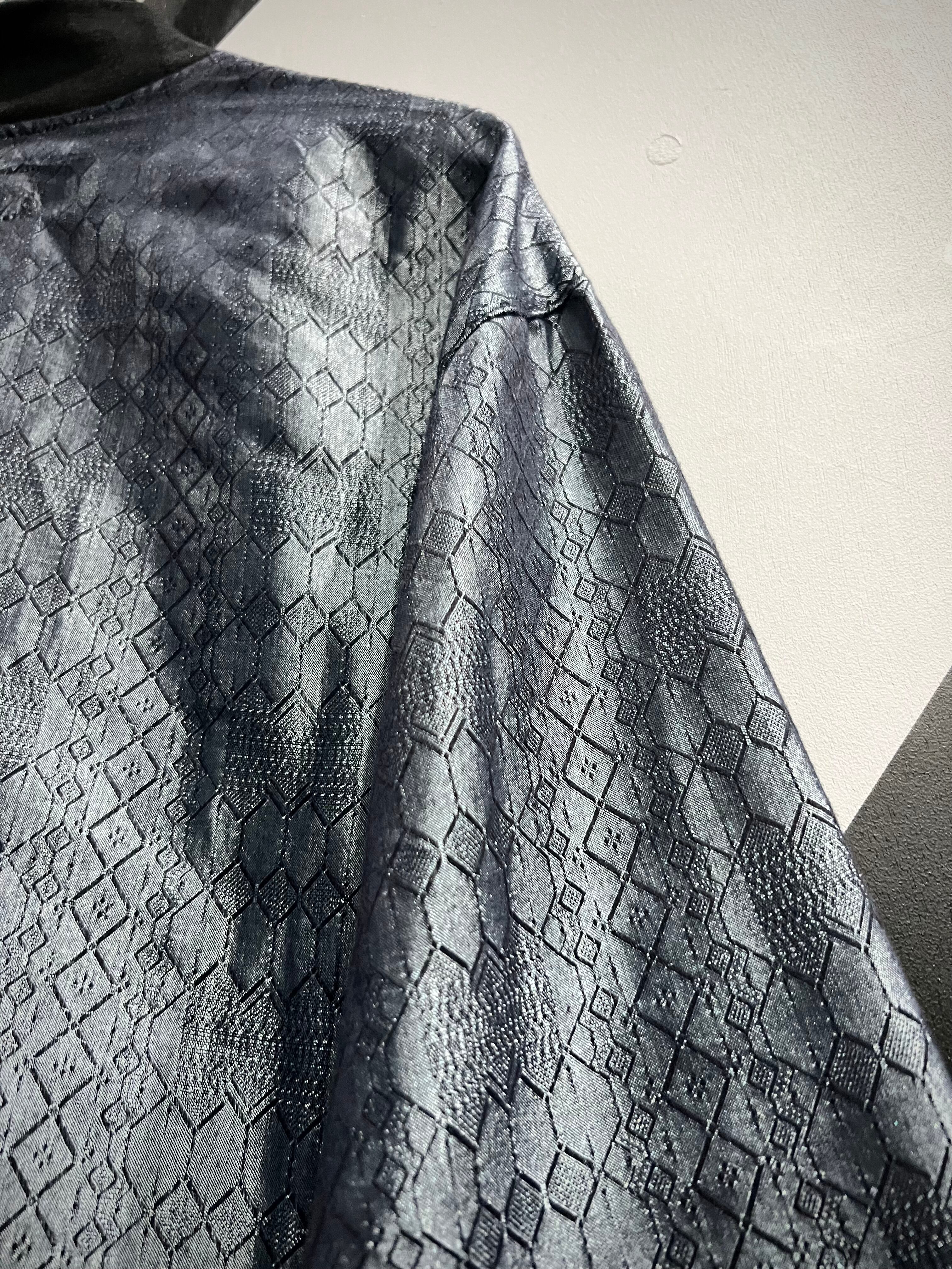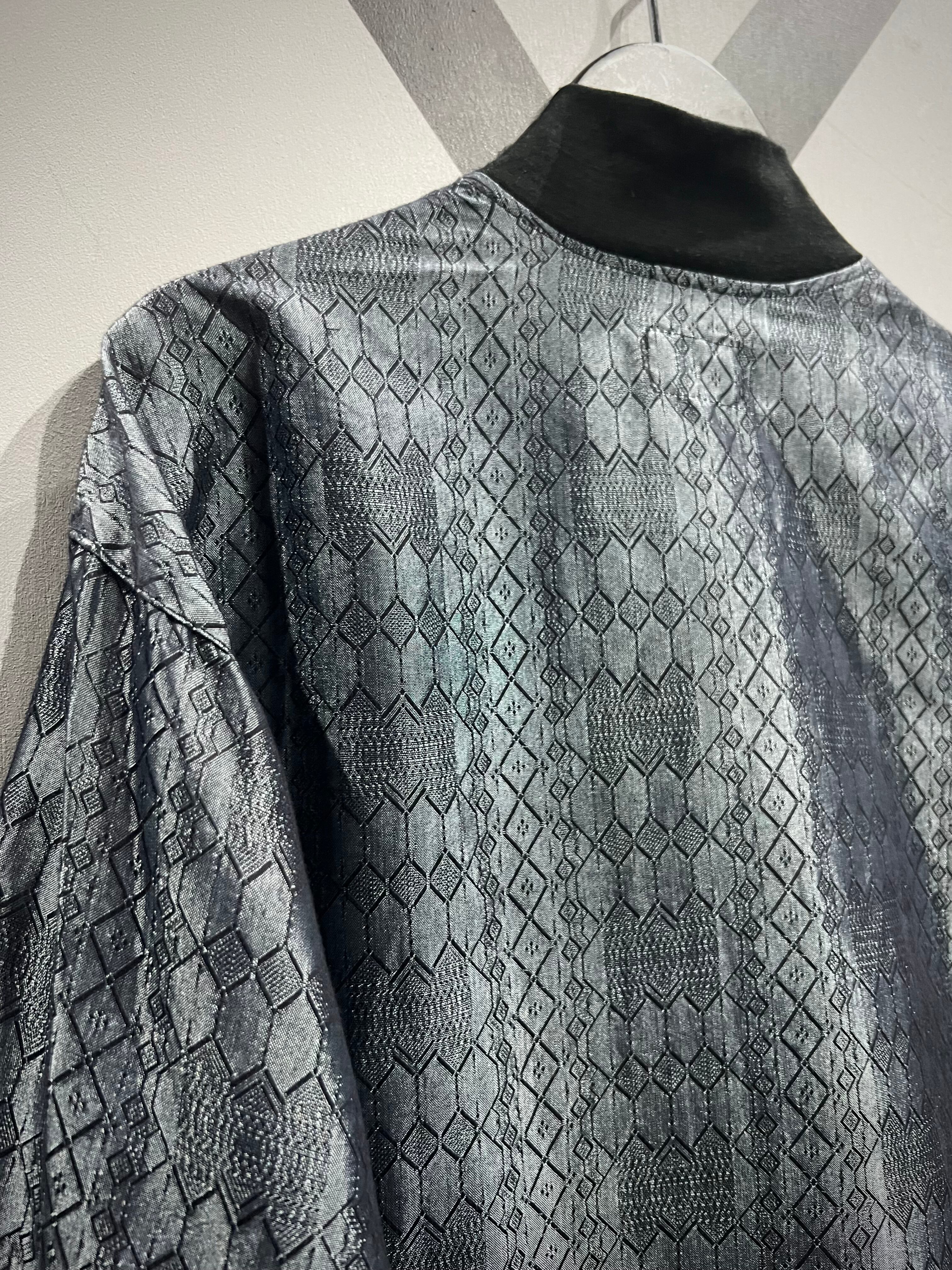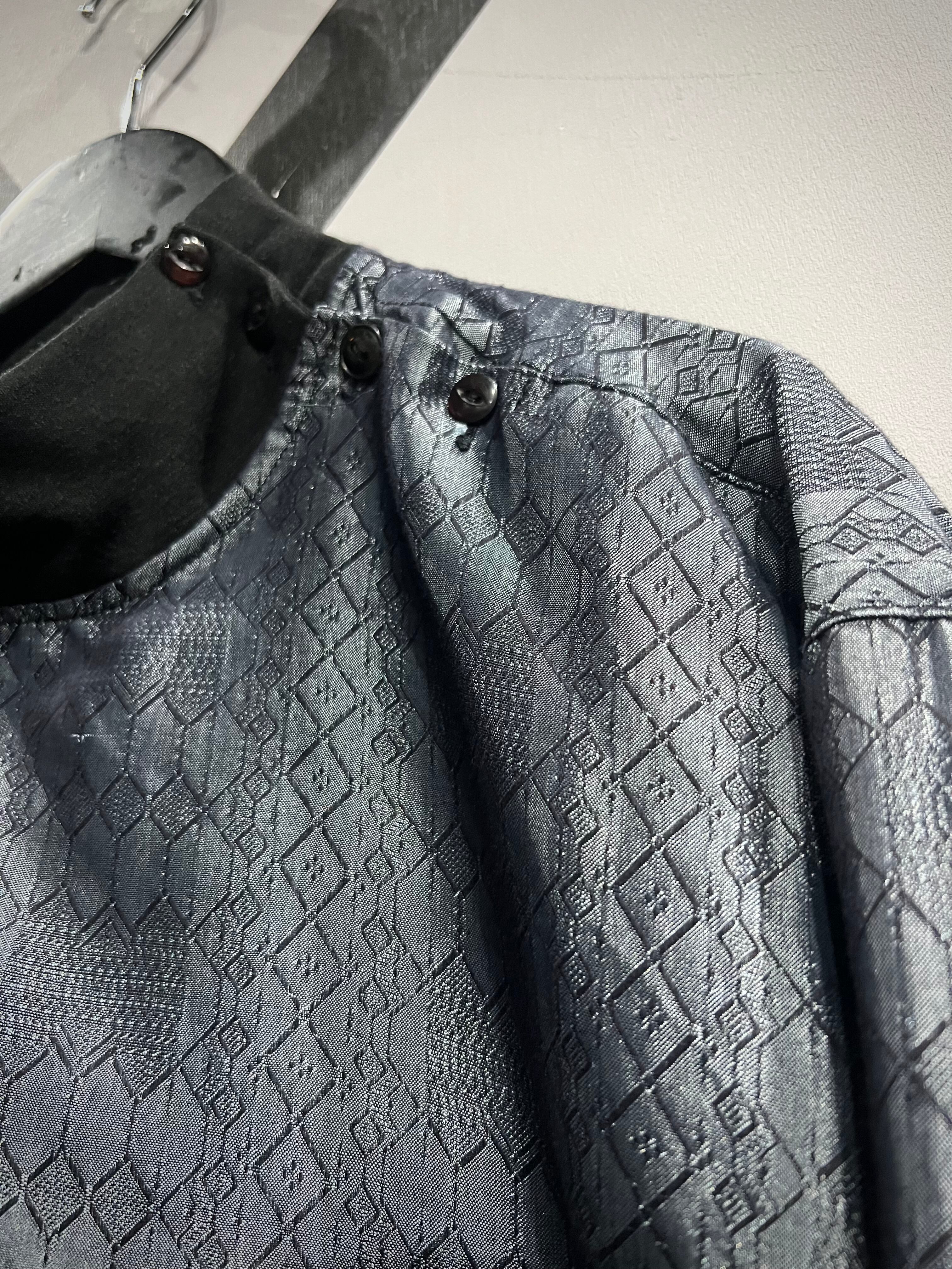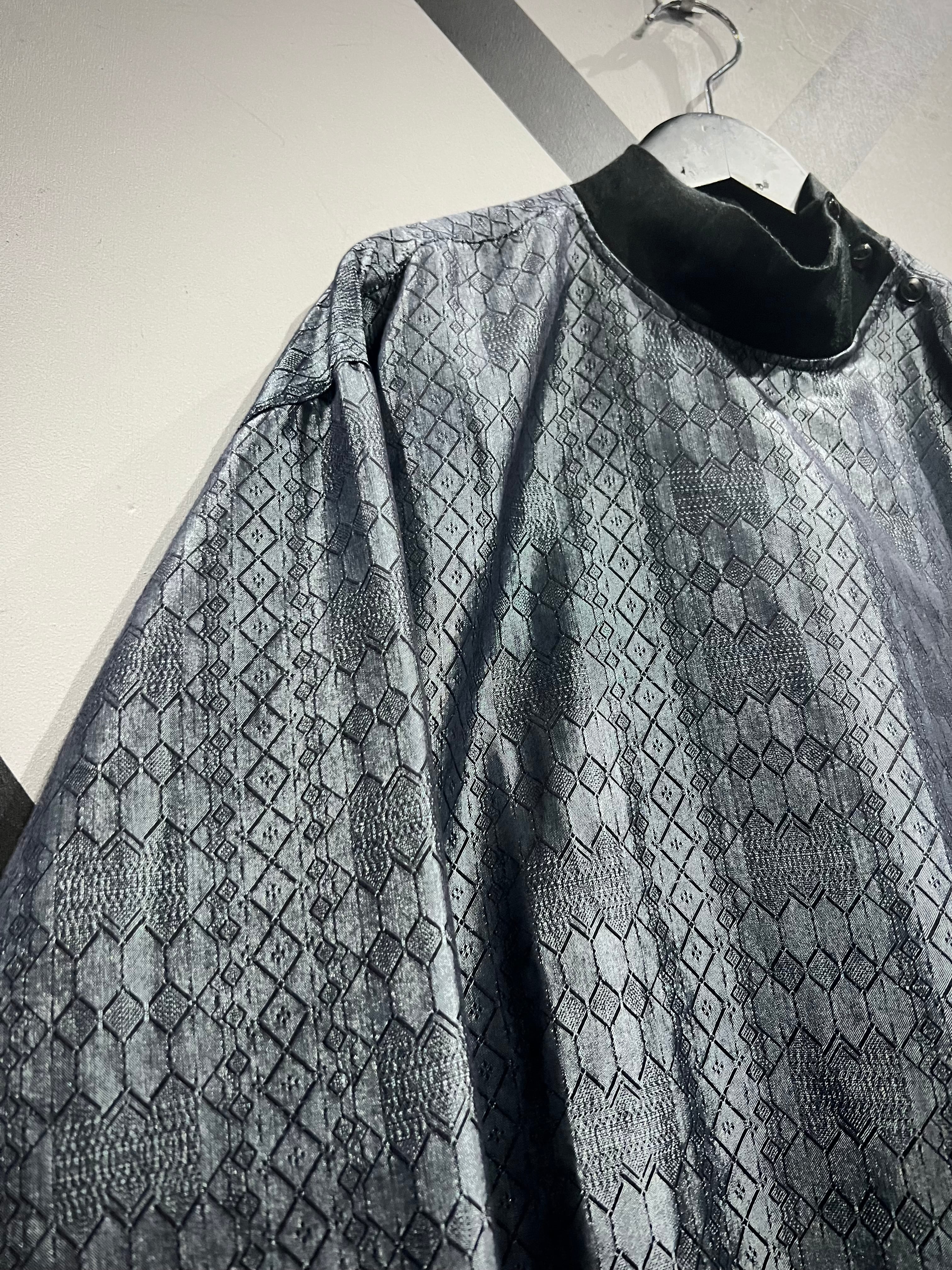 ソリッドな光沢に幾何学柄を掛け合わせた事でモードな雰囲気を漂わせる仕上がり。今季メタリックやグリッターノリは超気分、めちゃくちゃイケてます、、、ネック部分のボタンもデザインのアクセントに。