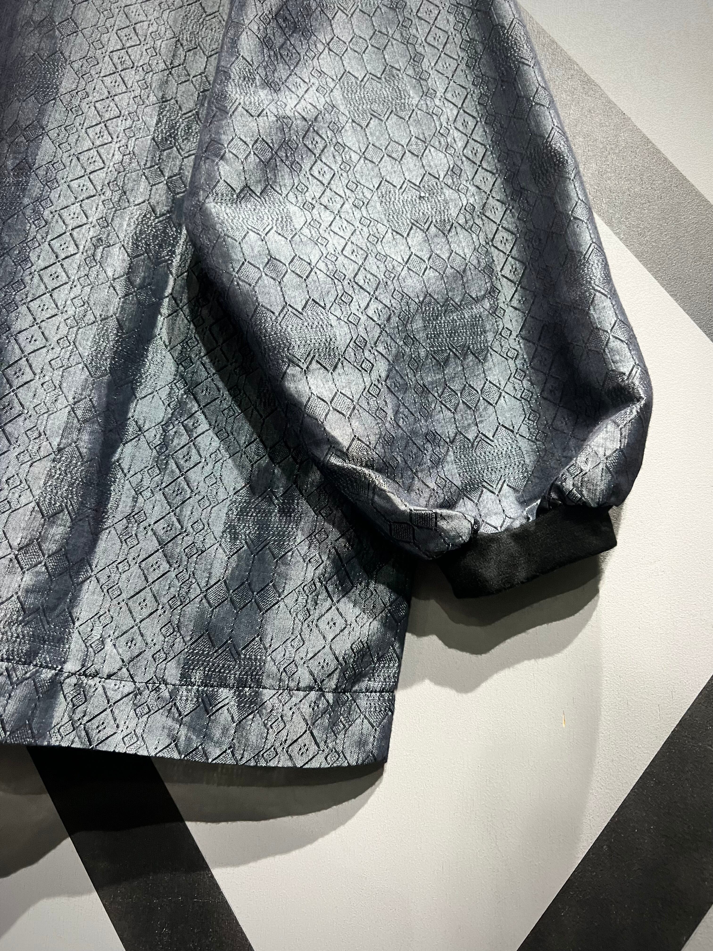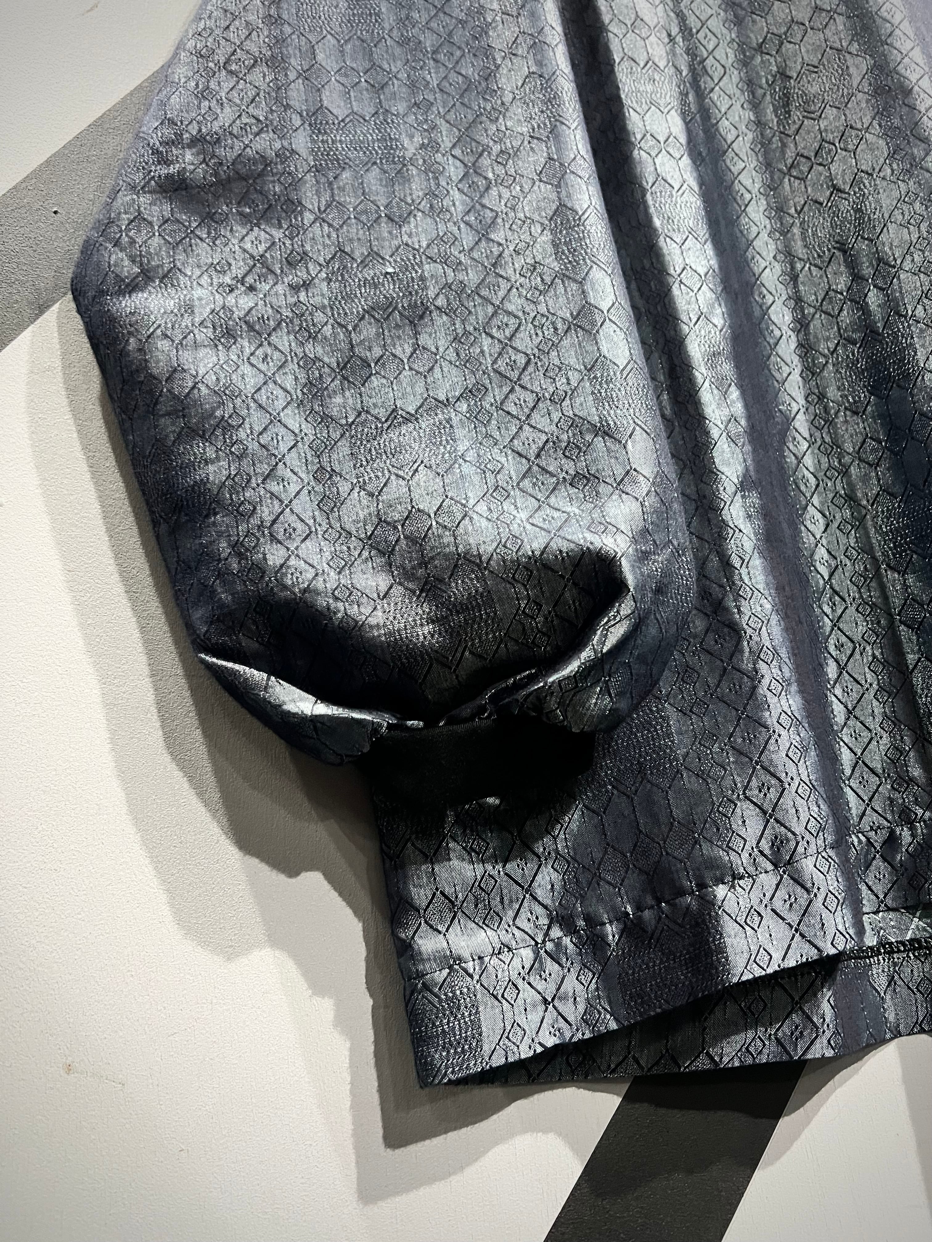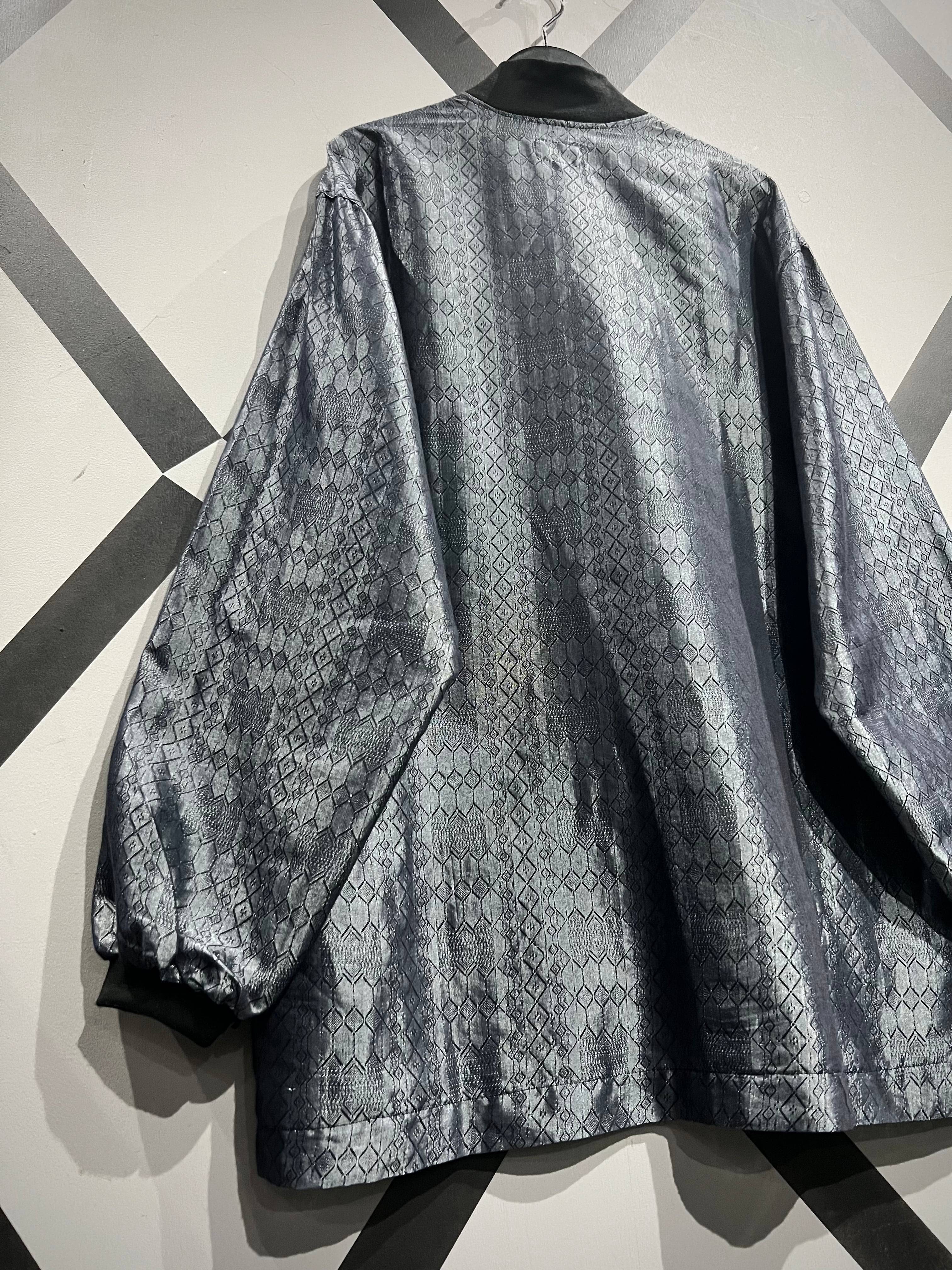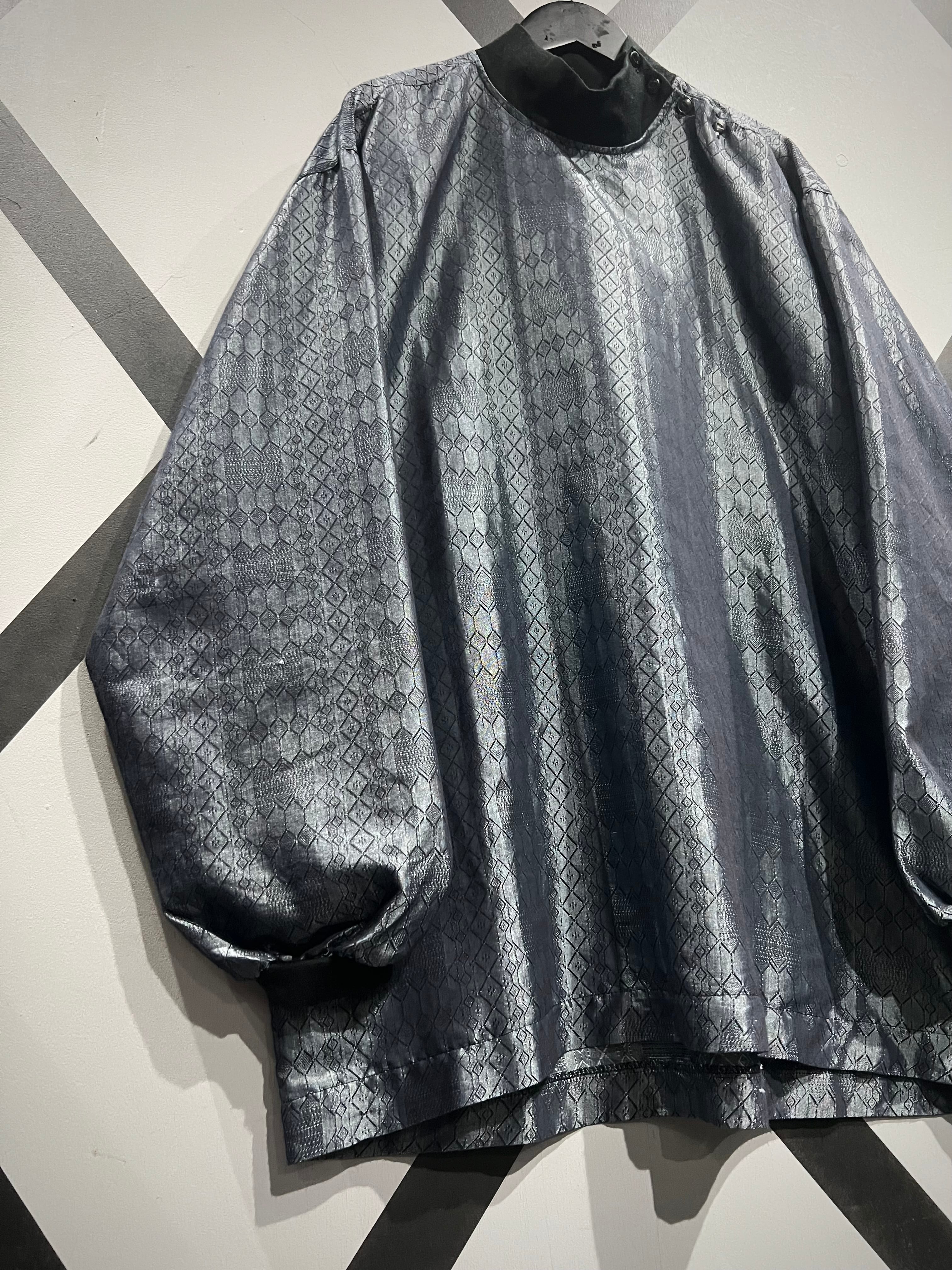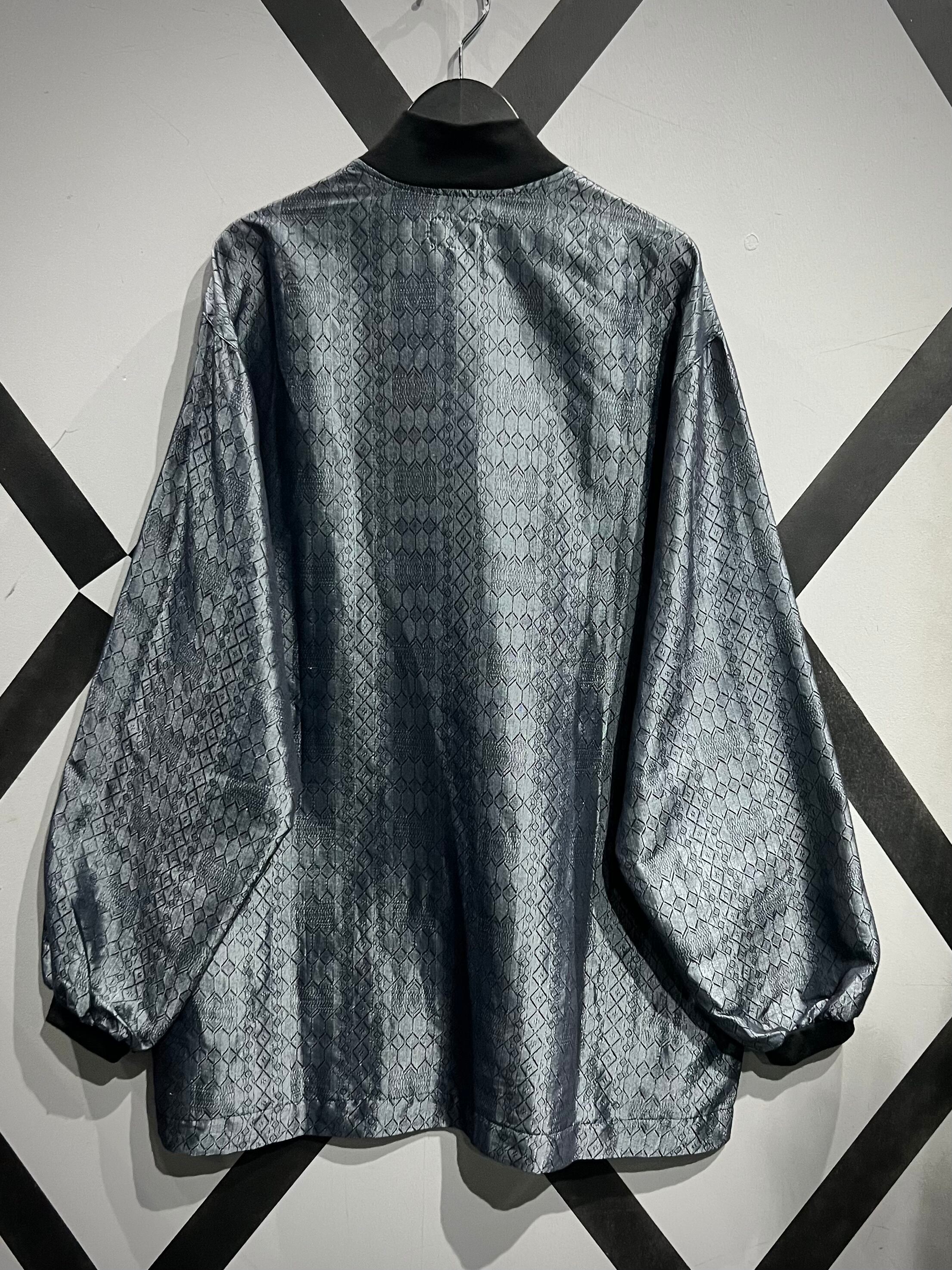 光の当たり加減で鈍く光沢を放つメタリックのコットンポリのボディに、幾何学柄を載せたプルオーバー。