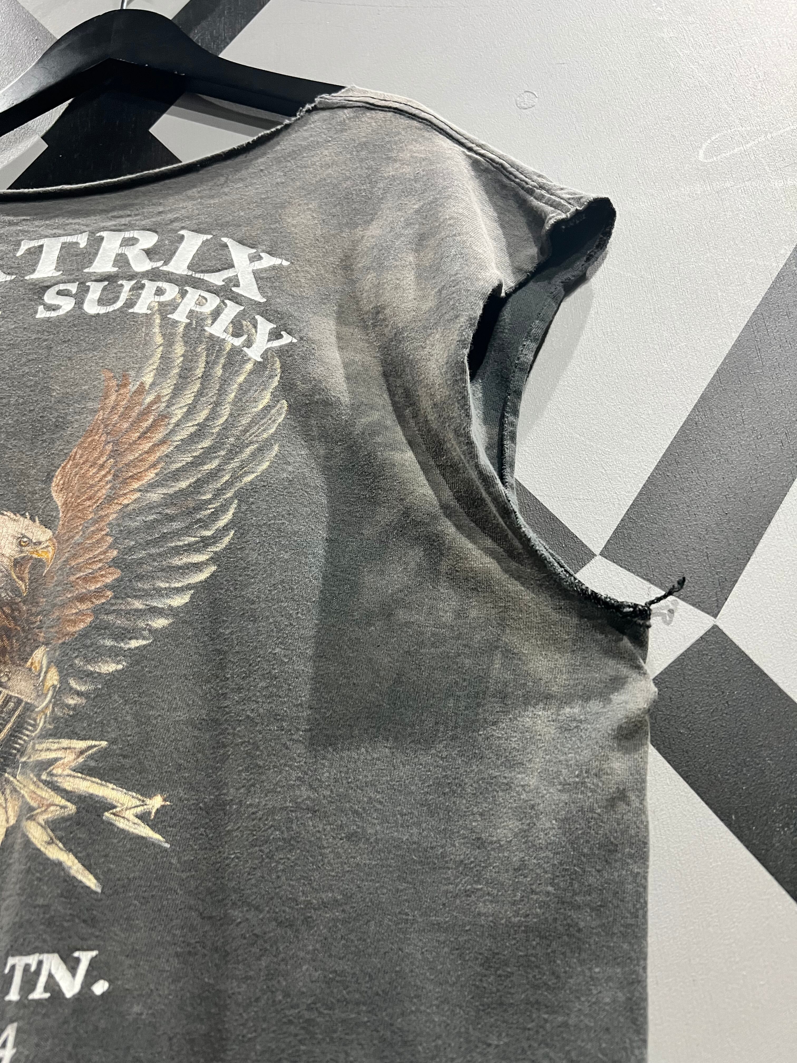 ブランドネームに、背面にはエンジンに載るワシのデザインを載せたバイカー系のTシャツの袖をカットオフしたノースリーブ。