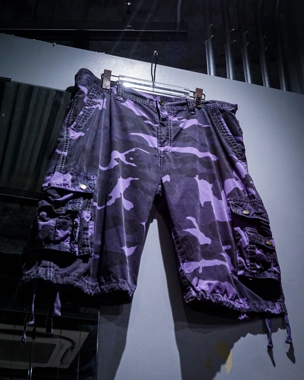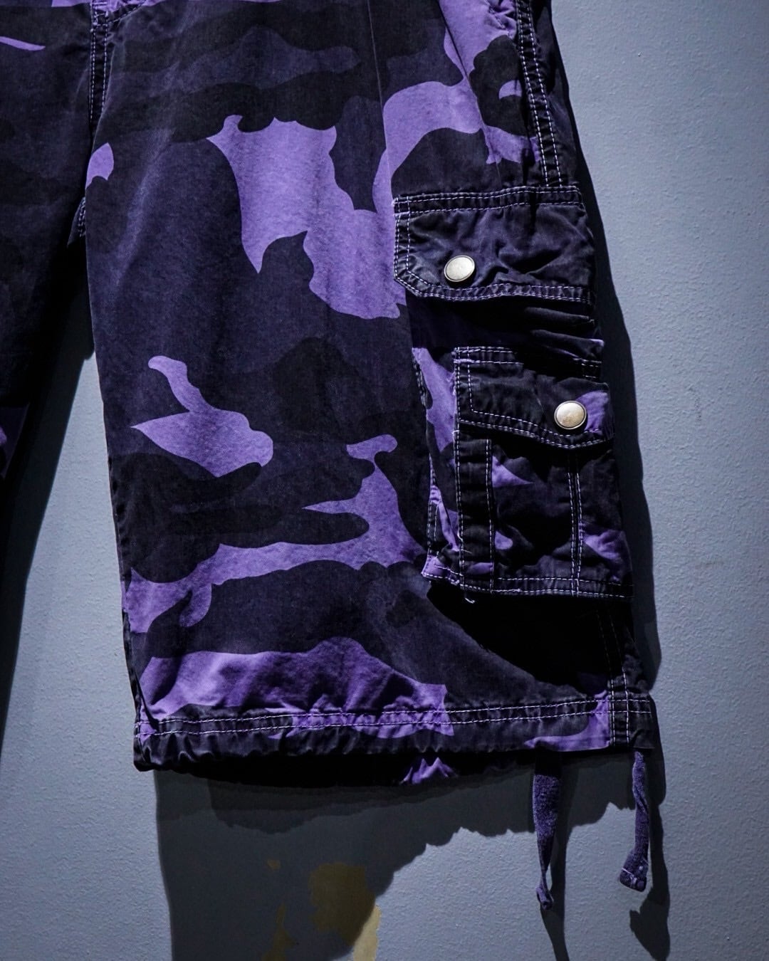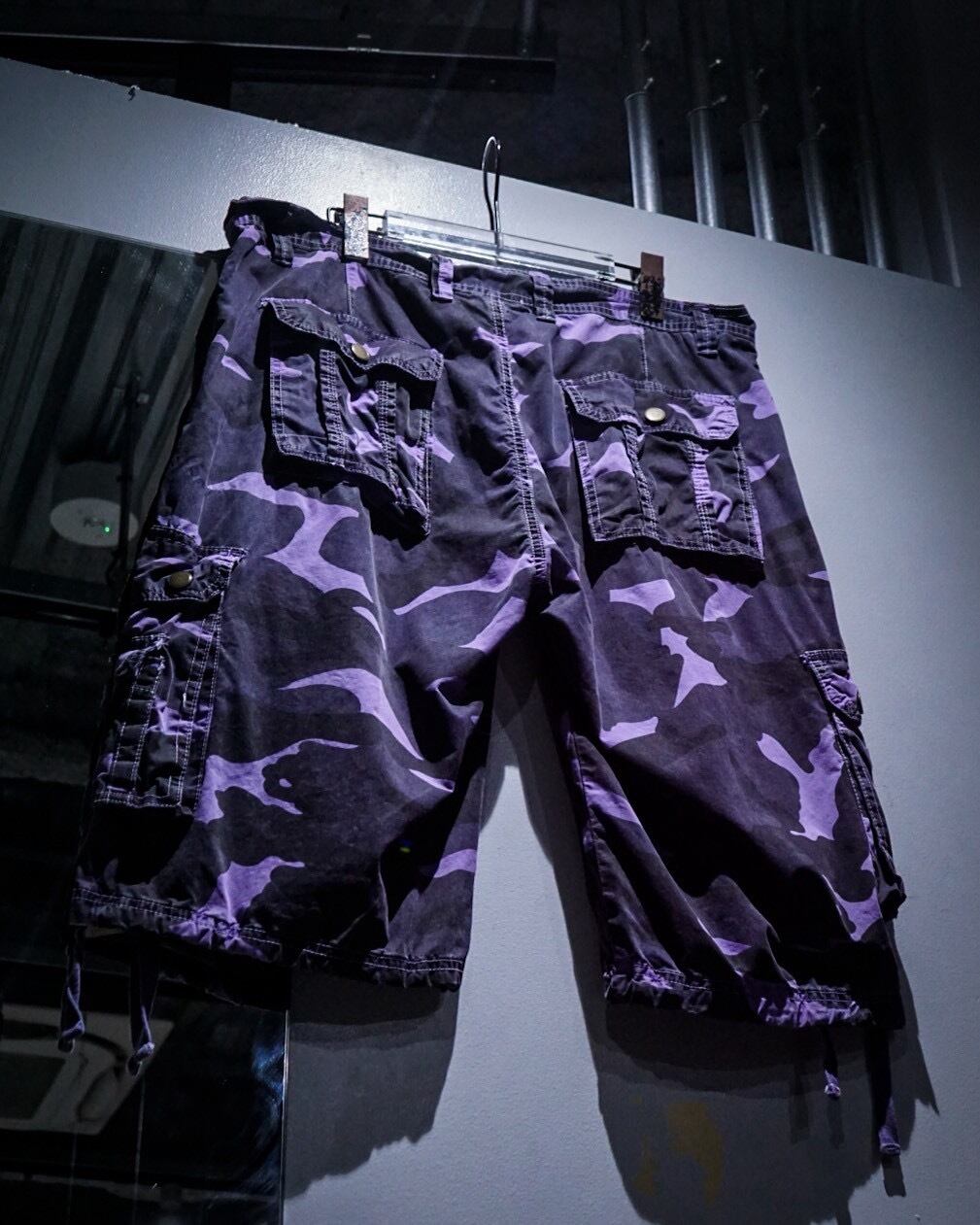 パープルをベースとしたカモフラージュ柄をボディ全面に配したカーゴショーツ。