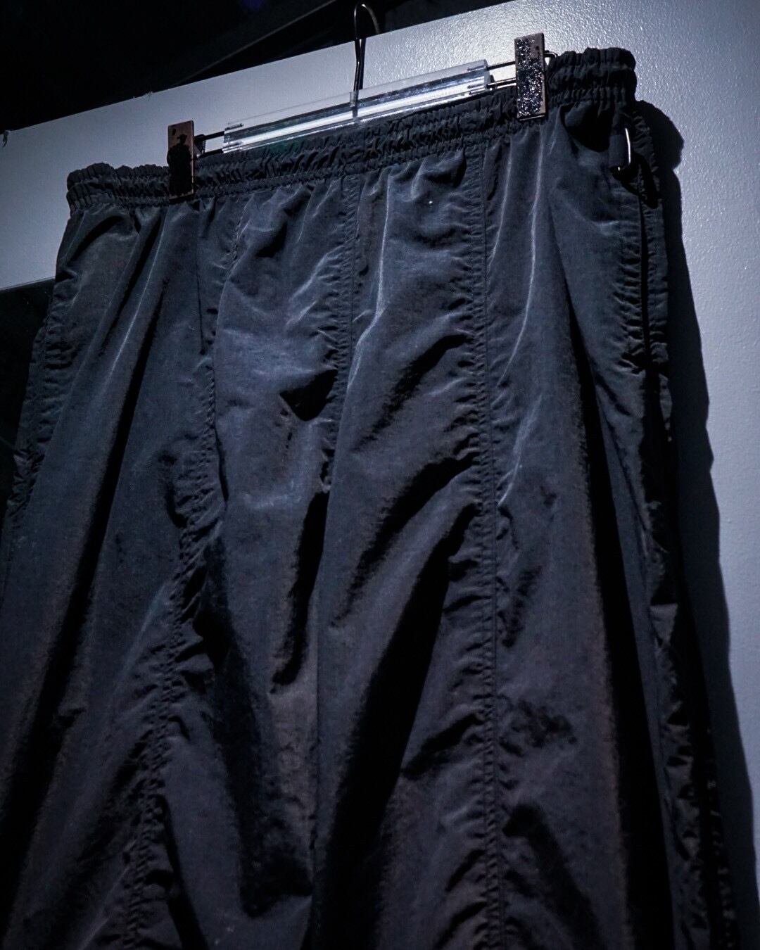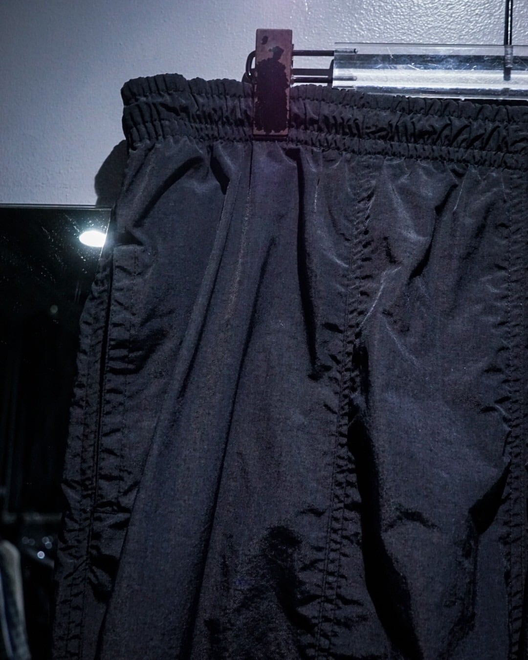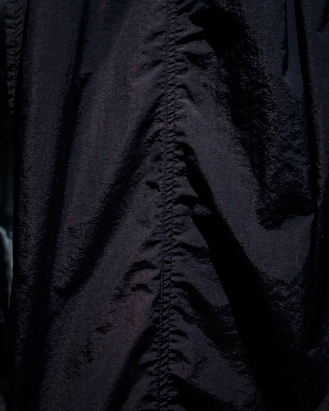 ハリのあるブラックナイロンをボディに使用し、裾にジップによるギミックを施したナイロンパンツ。