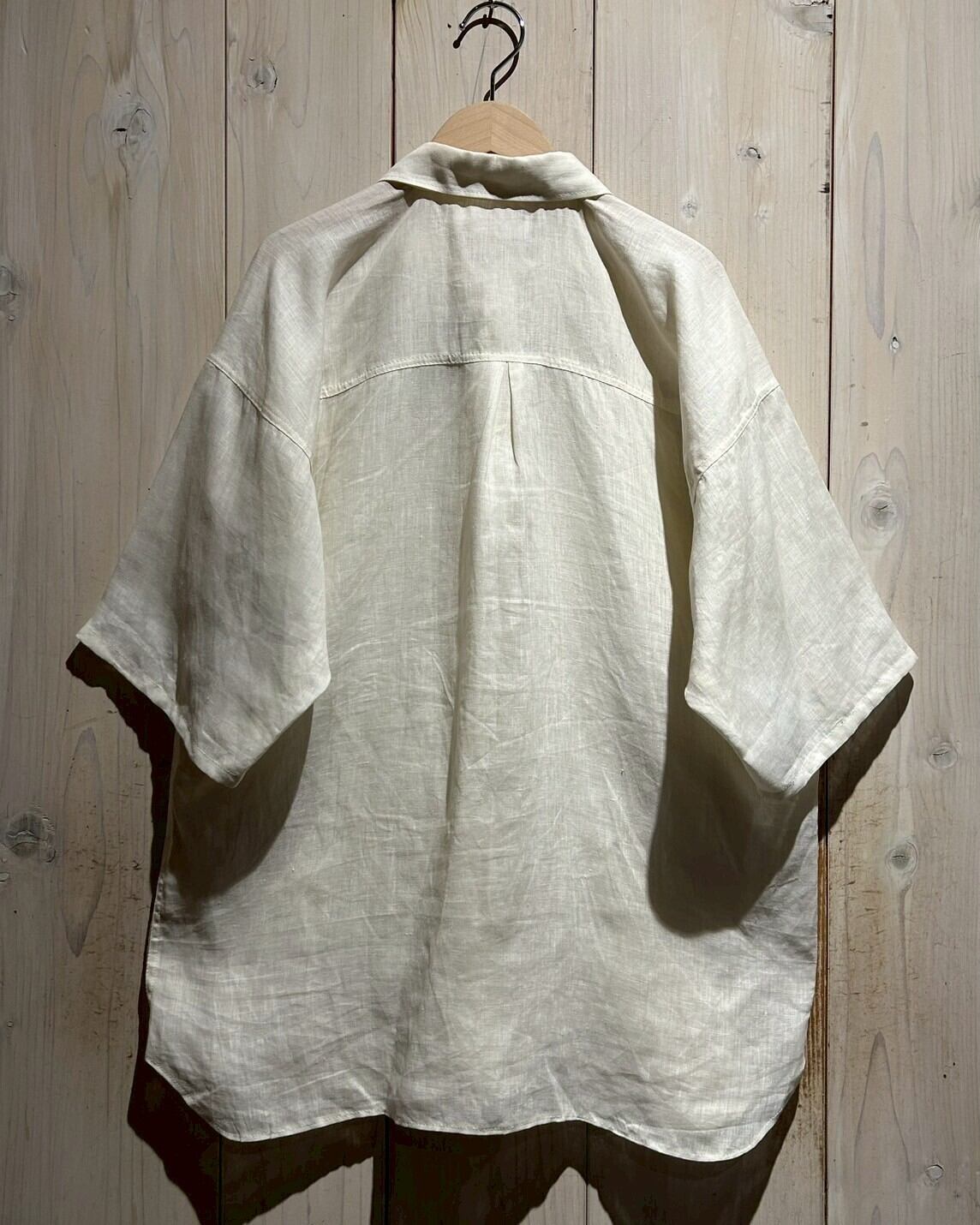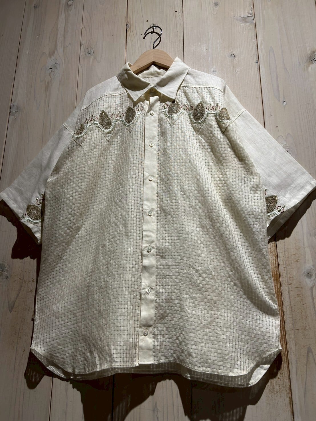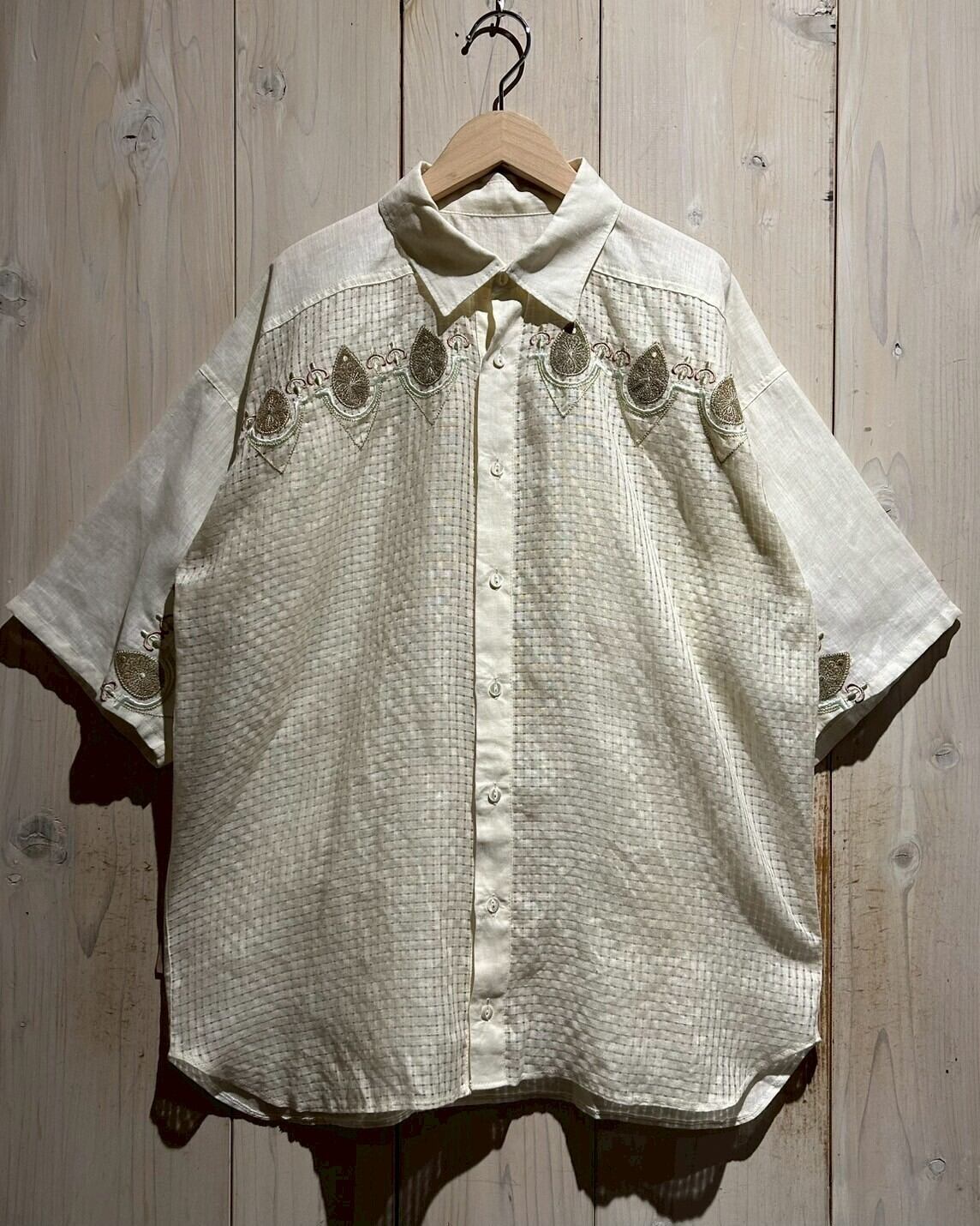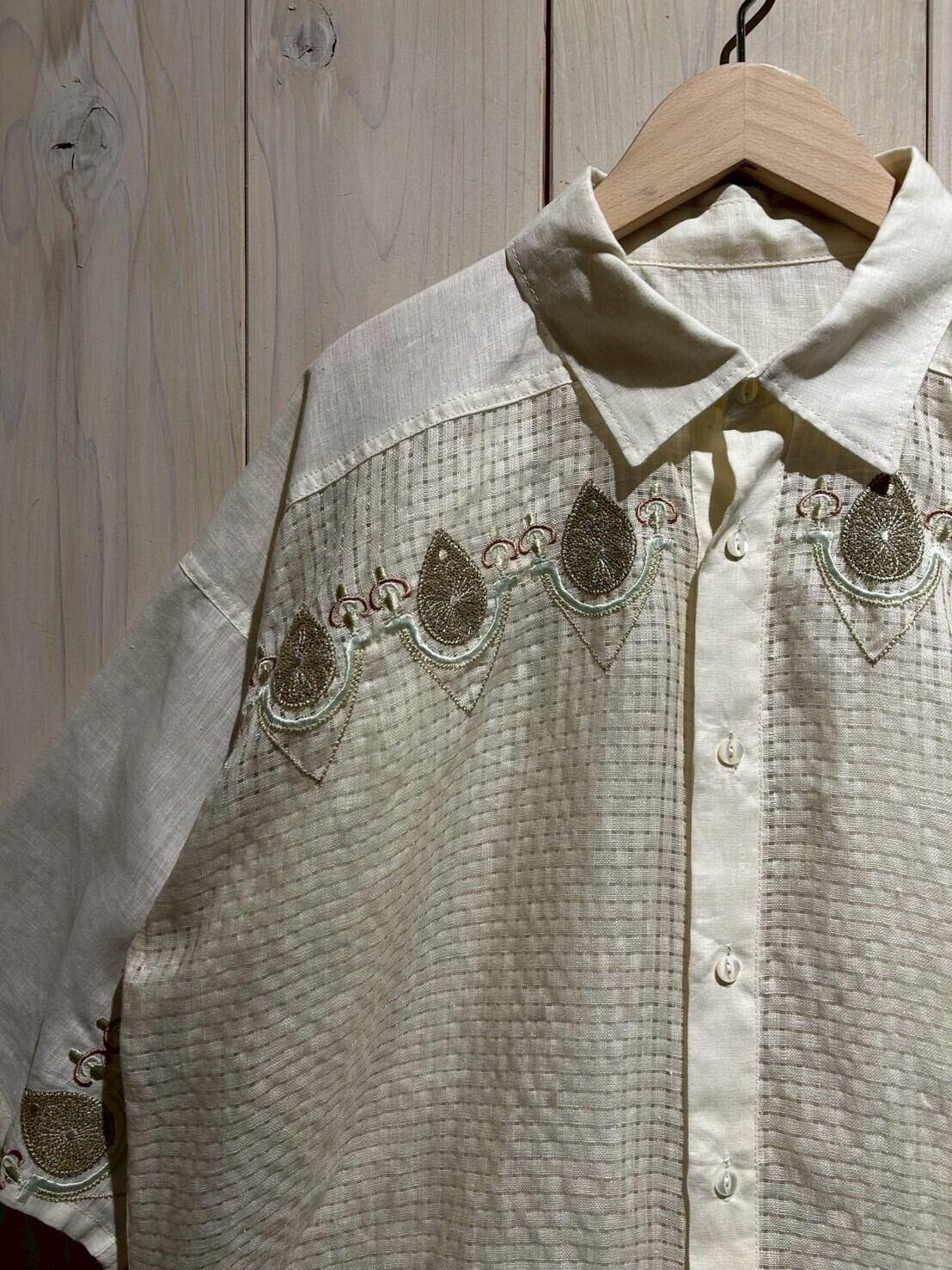 白のリネン生地をボディのベースに、フロントを透け感のあるシアー生地で切り替え。フロントからアームにかけてエスニックな刺繍を刻み込んだ半袖シャツ。