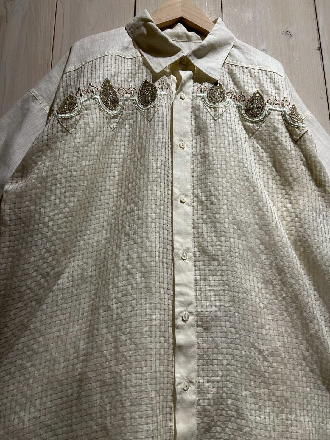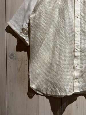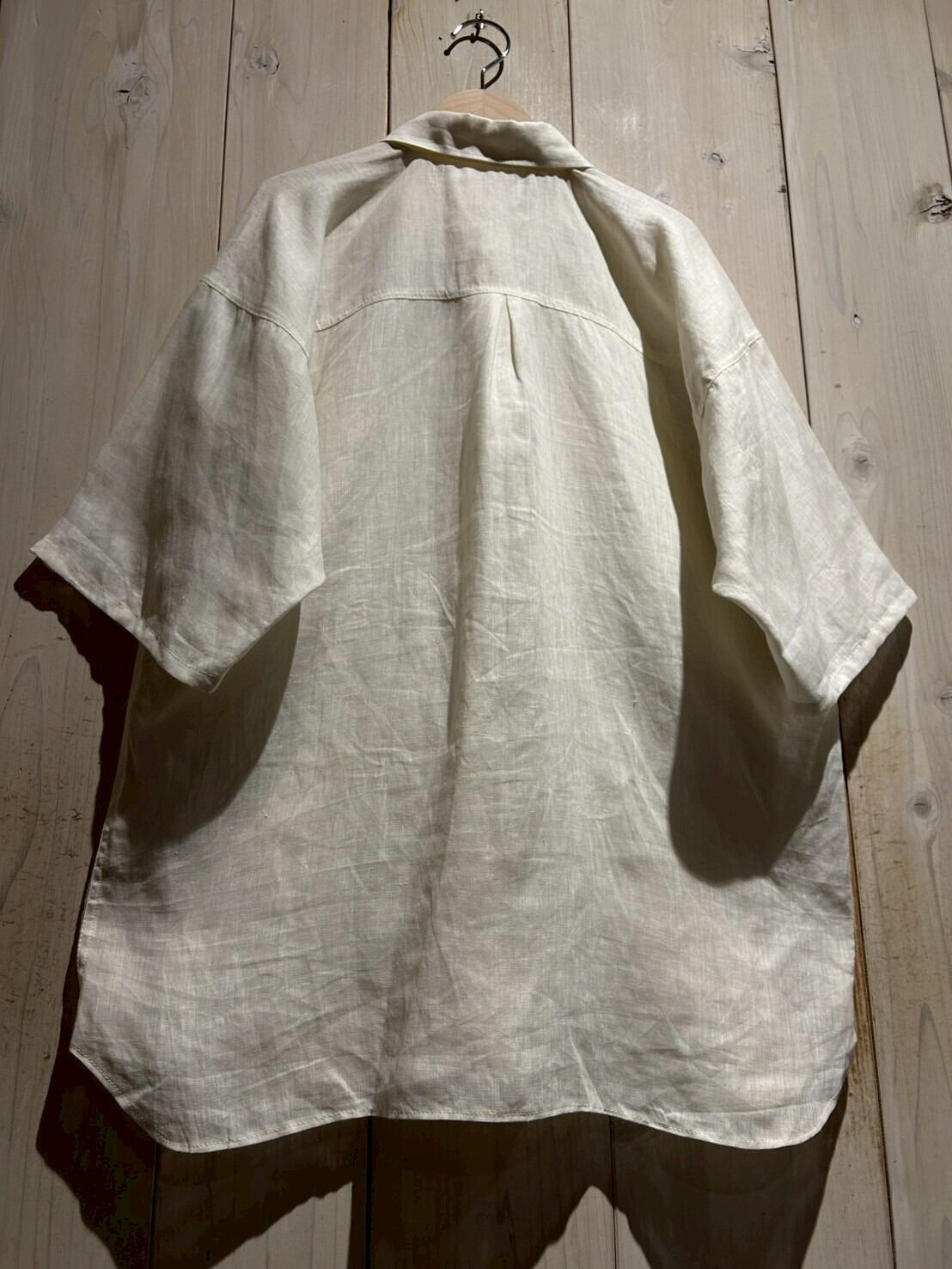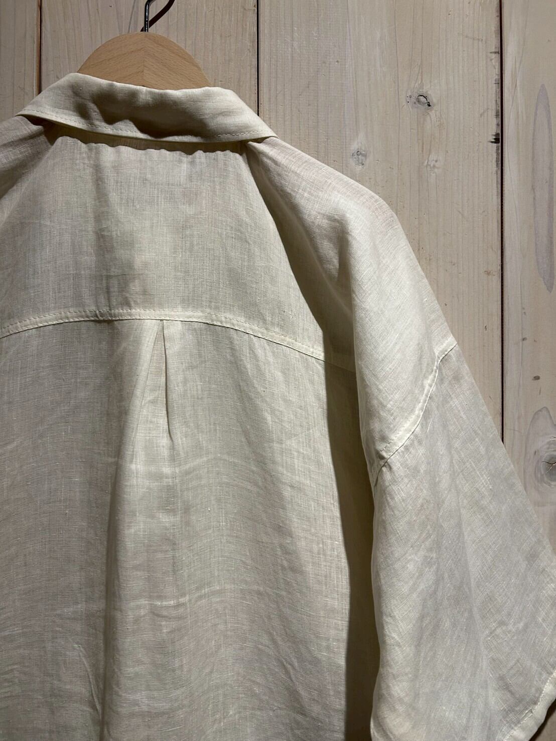 白のリネン生地をボディのベースに、フロントを透け感のあるシアー生地で切り替え。フロントからアームにかけてエスニックな刺繍を刻み込んだ半袖シャツ。