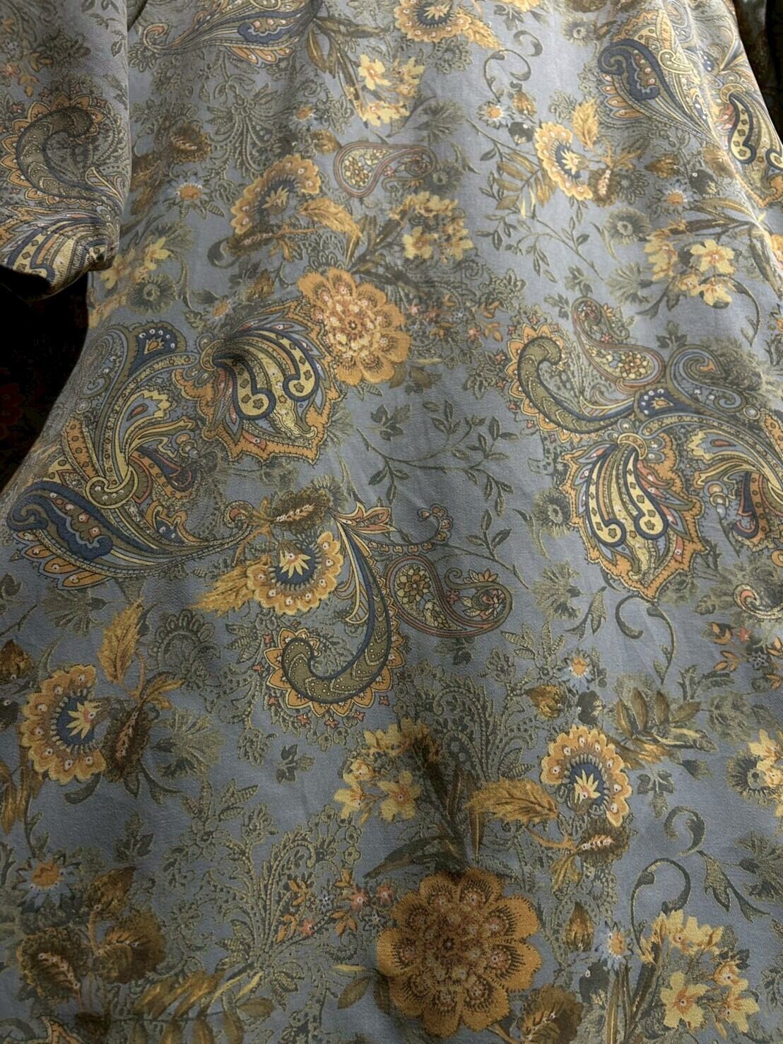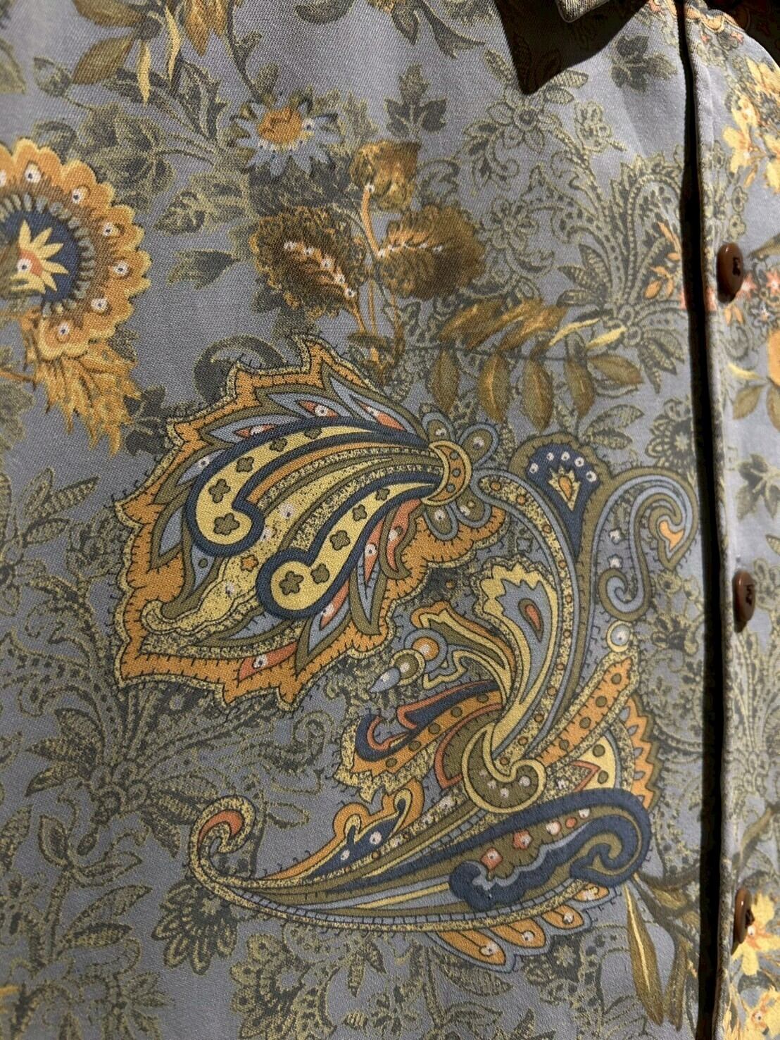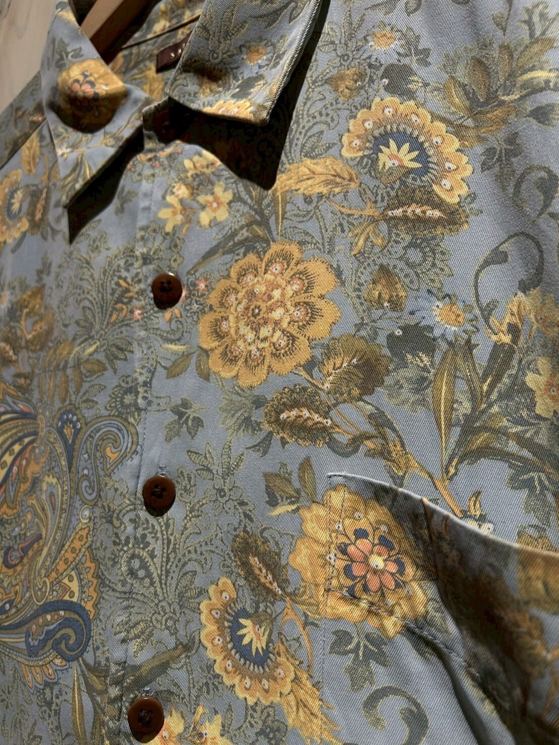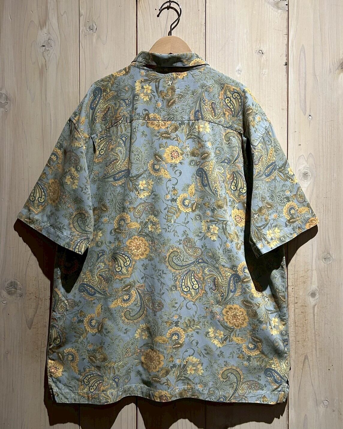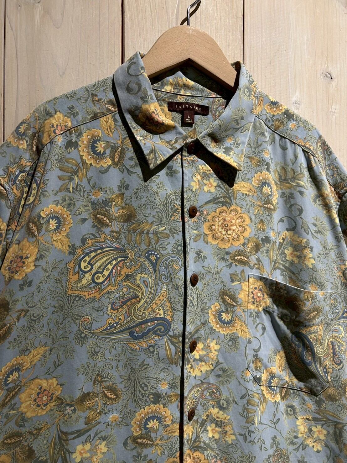 ライトブルーのボディをベースに鮮やかなペイズリー柄を載せたシルク×コットンの半袖シャツ。