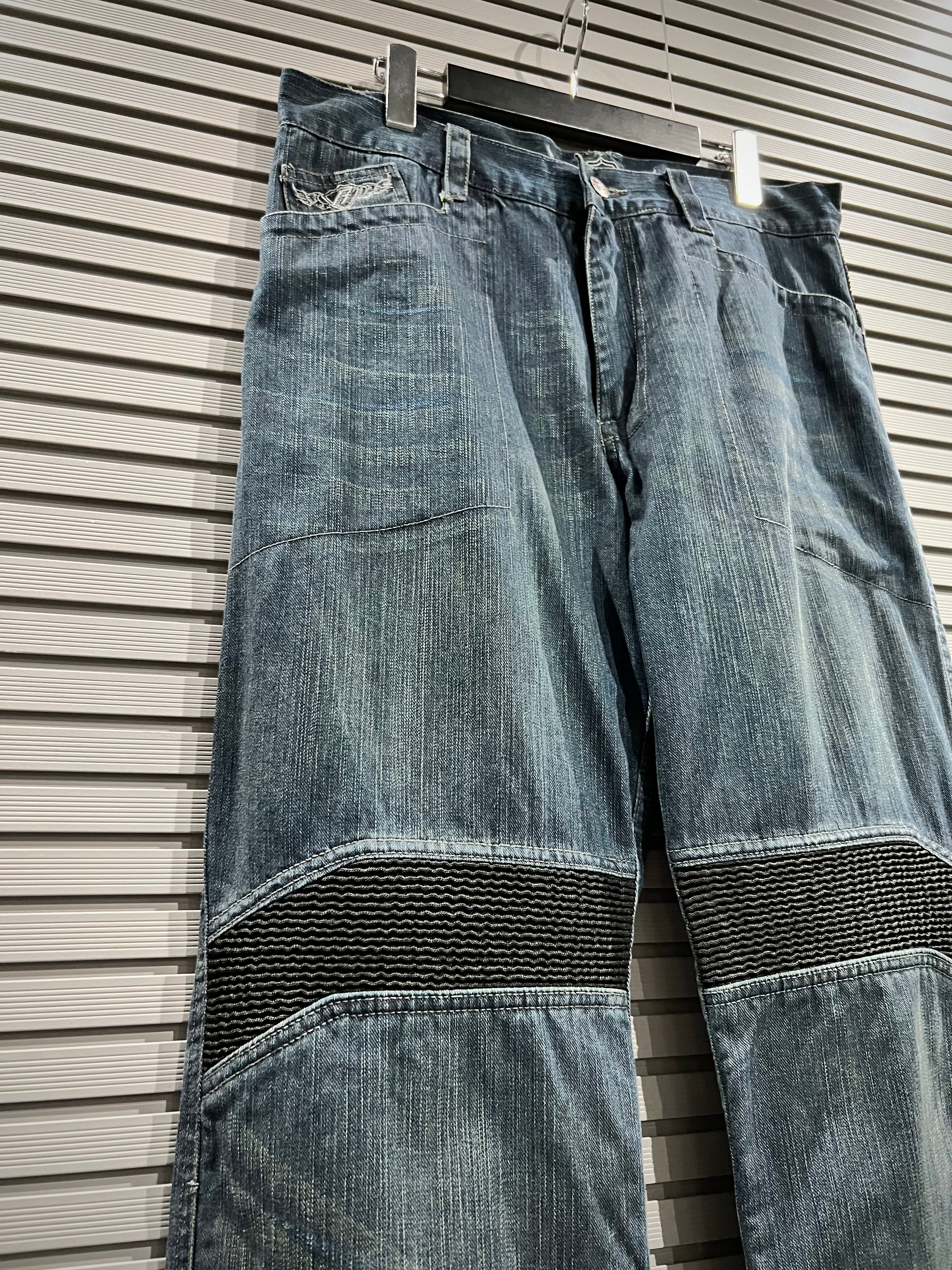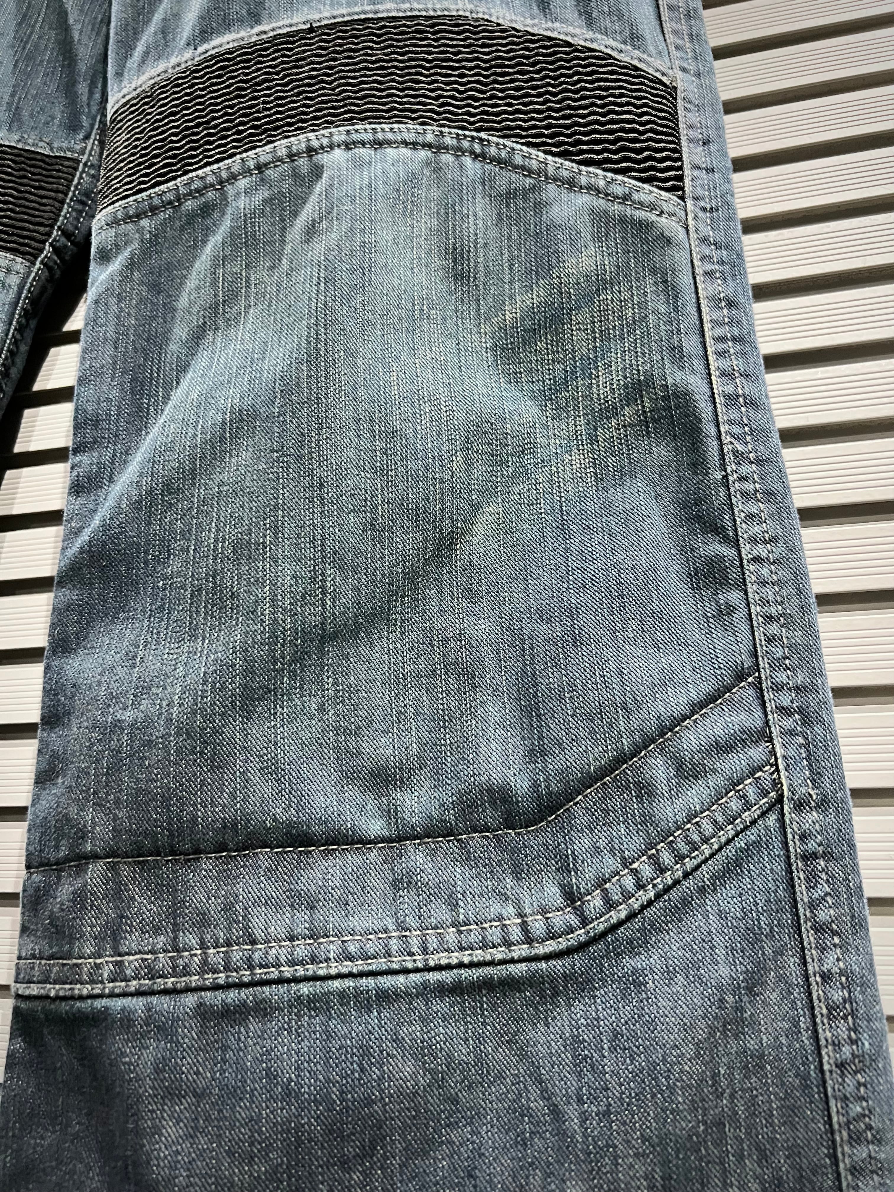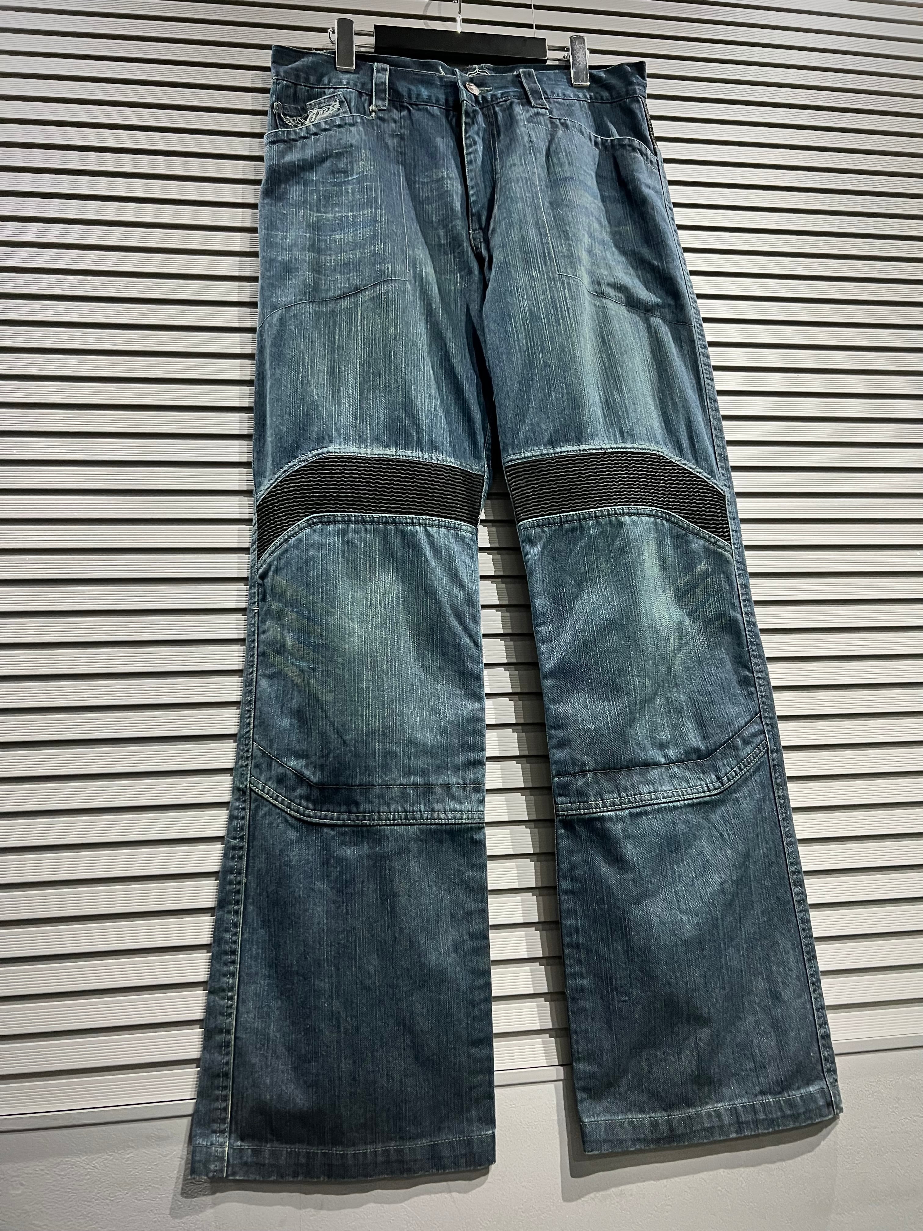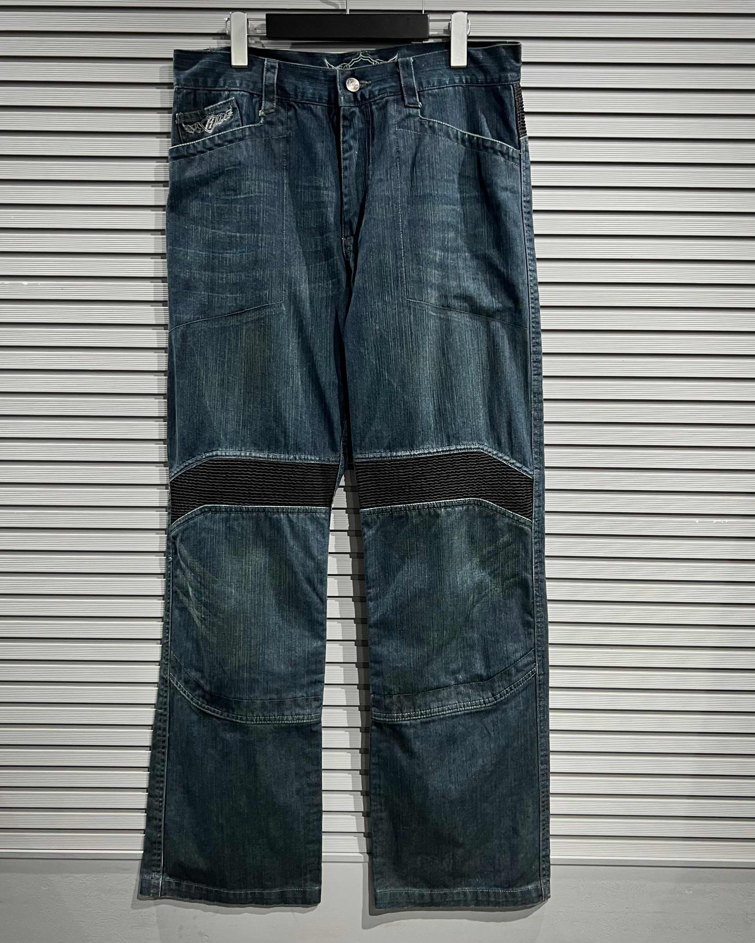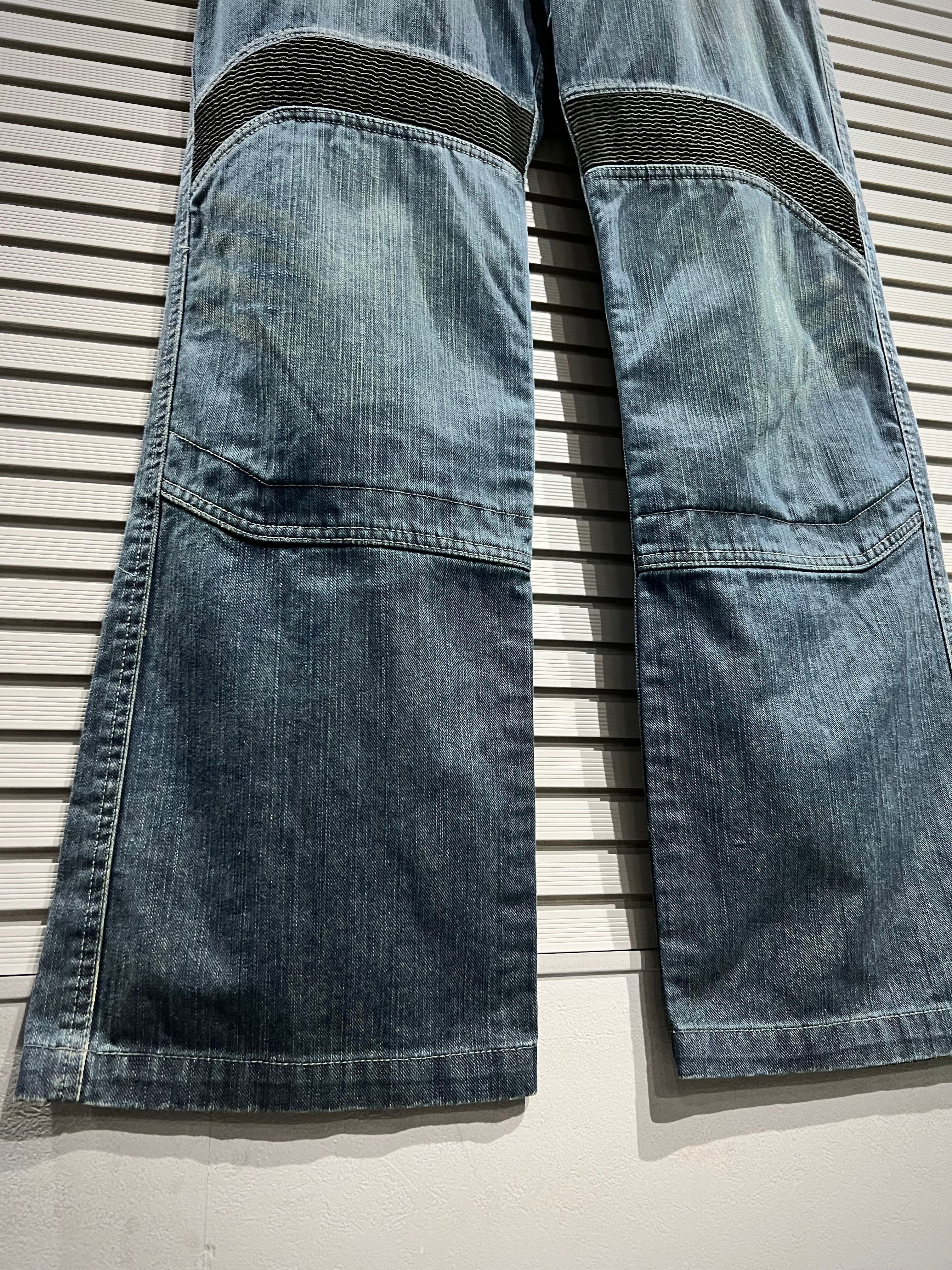 モーターサイクルパンツのディテールが各所にレイアウトされたデザイン性の非常に高いデニムパンツ。