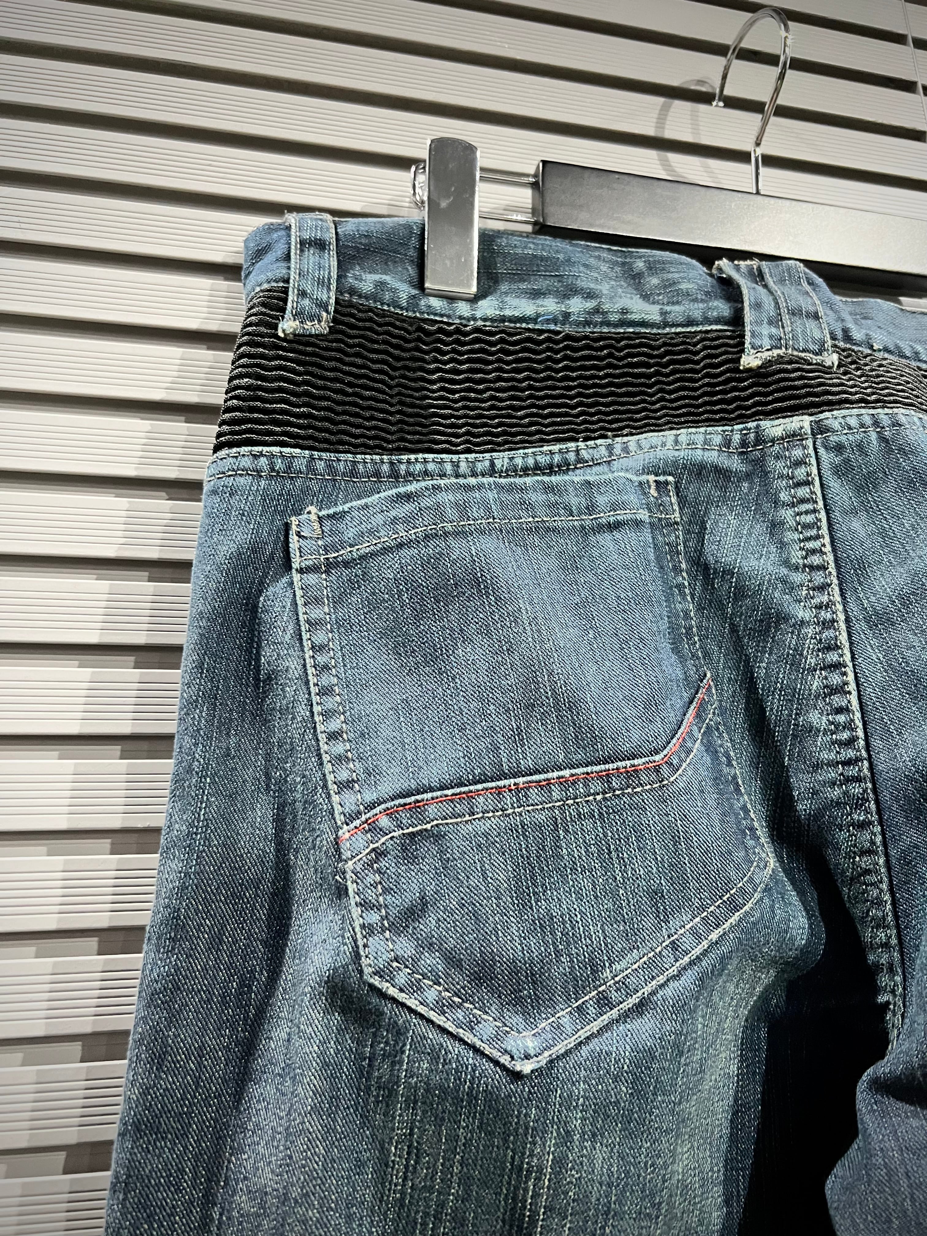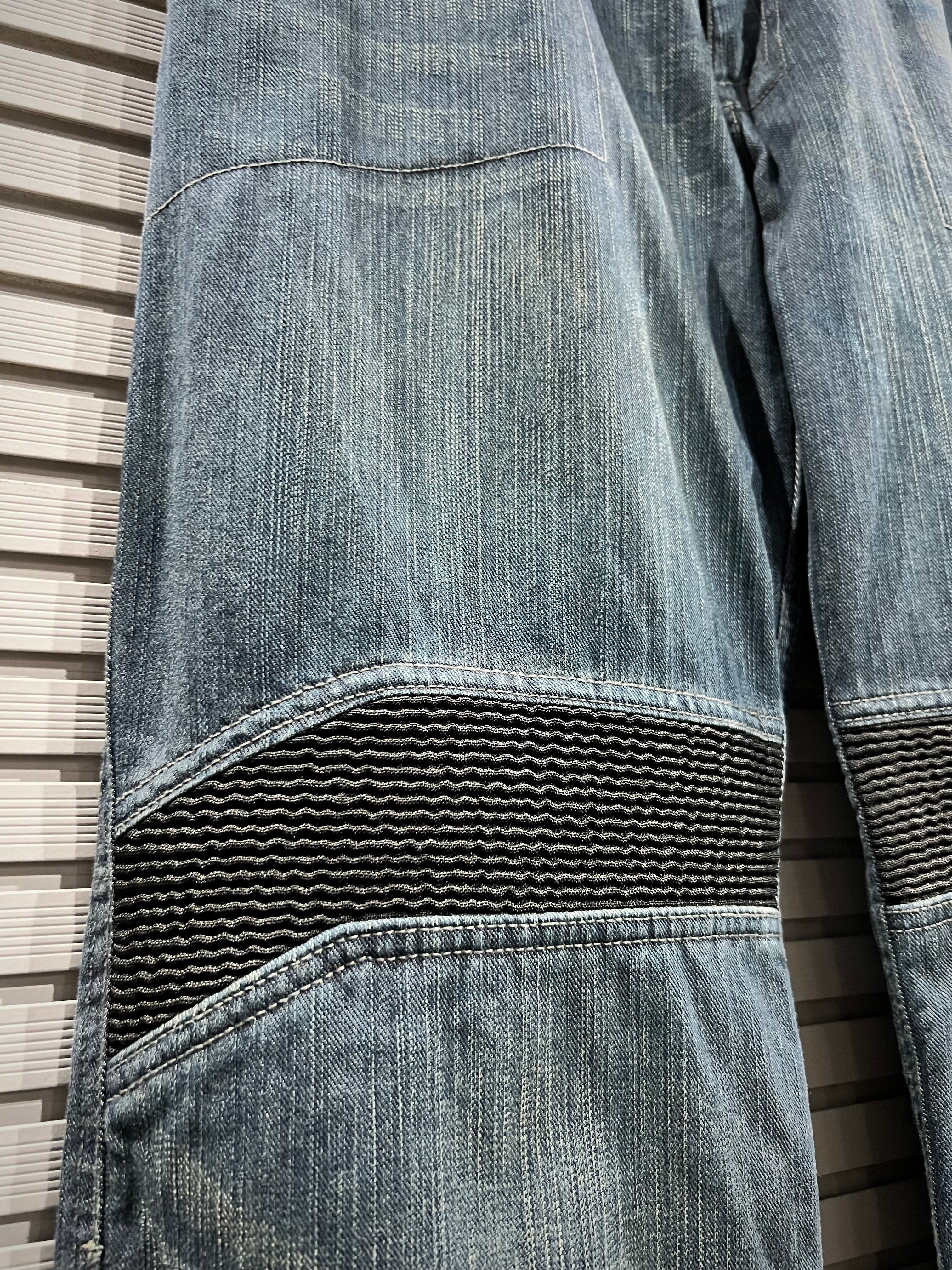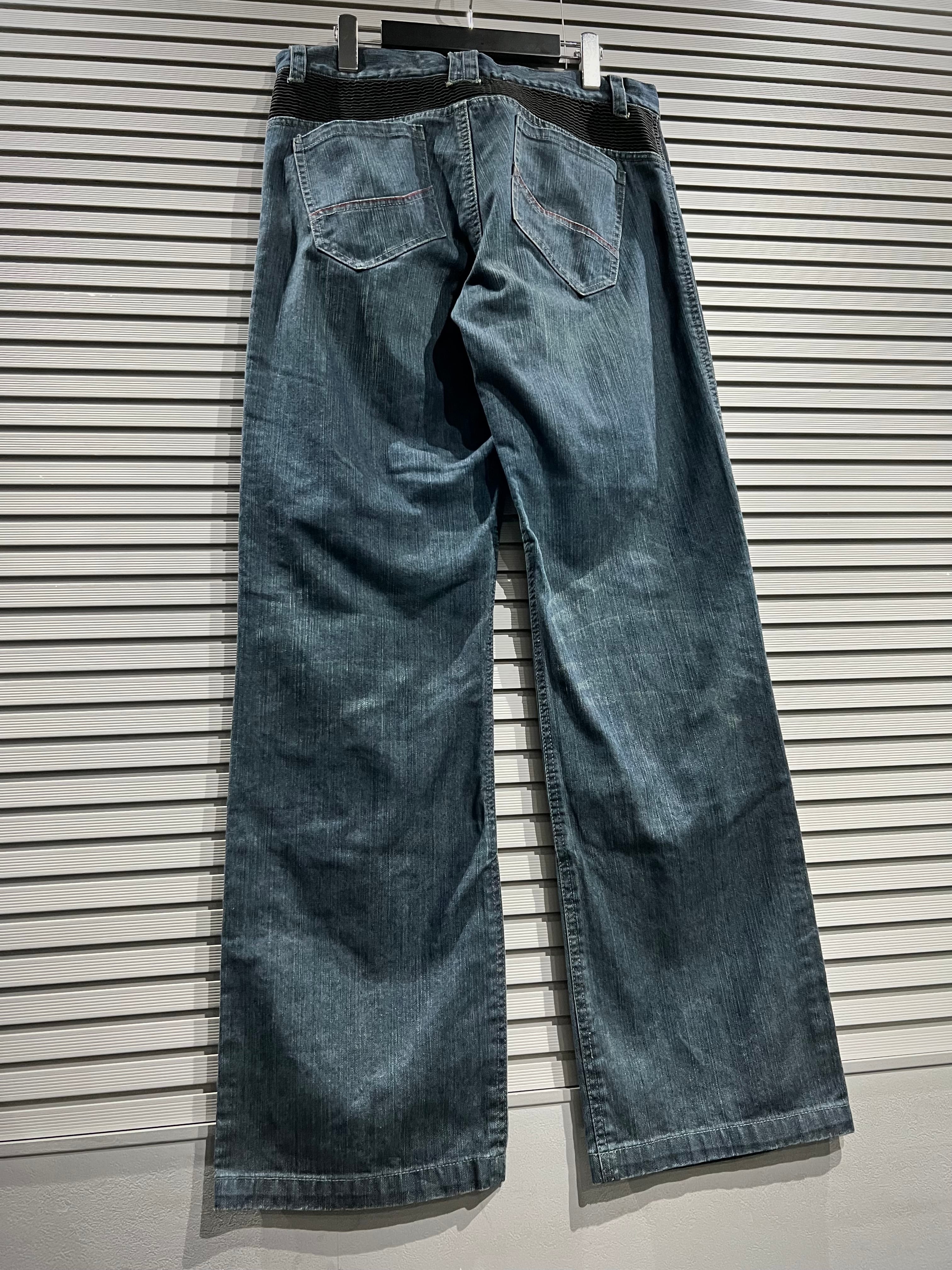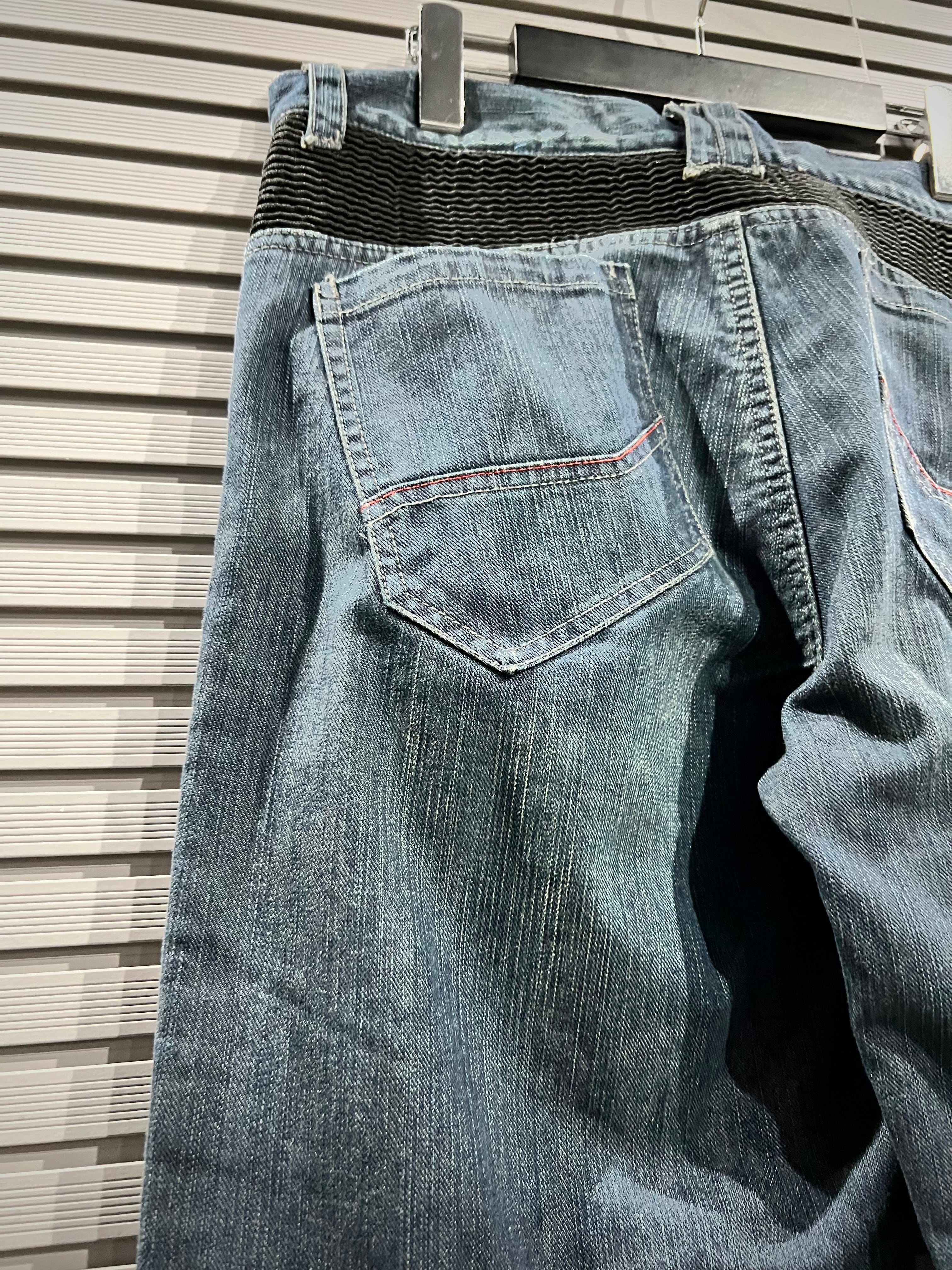 モーターサイクルパンツのディテールが各所にレイアウトされたデザイン性の非常に高いデニムパンツ。