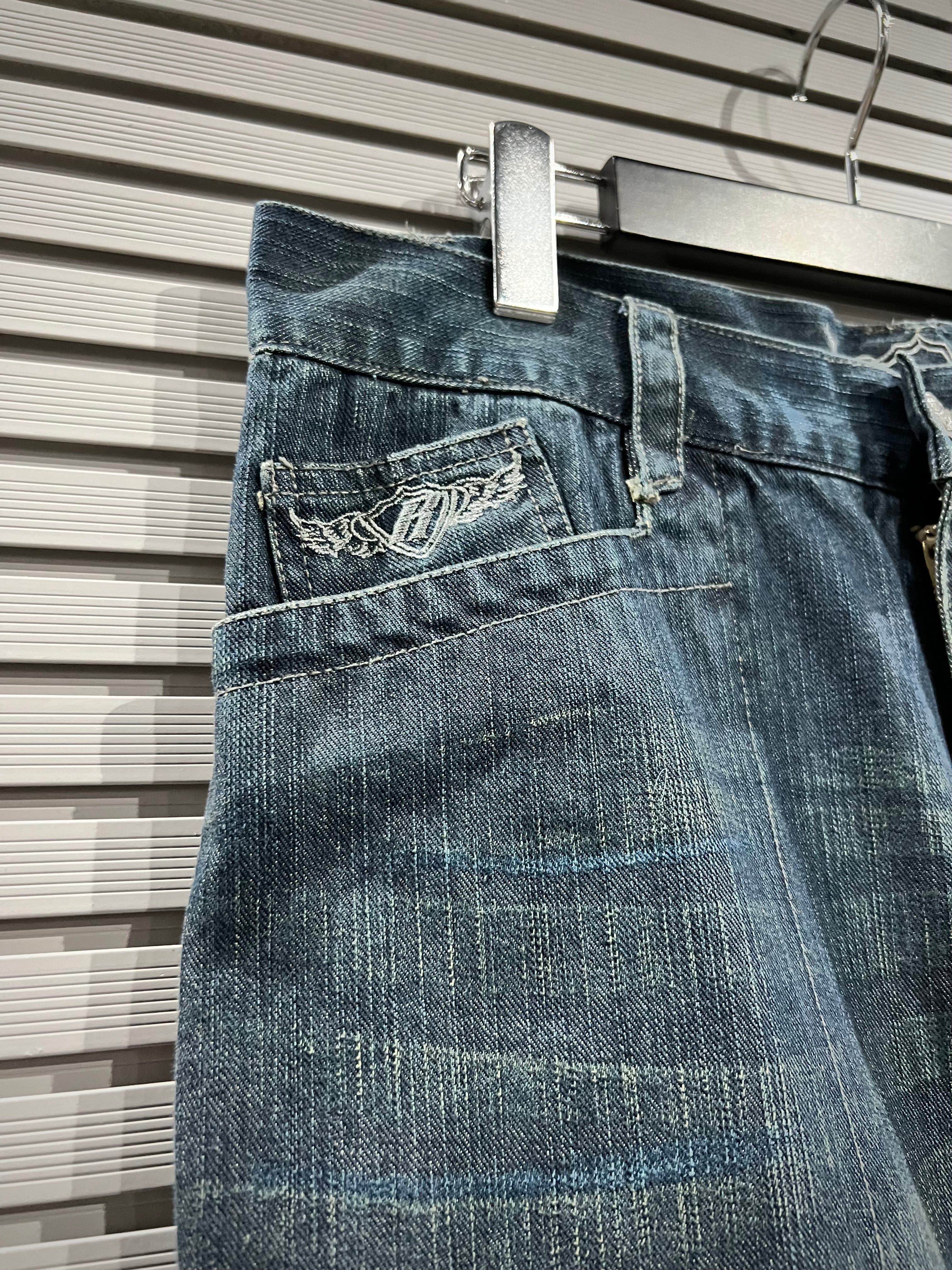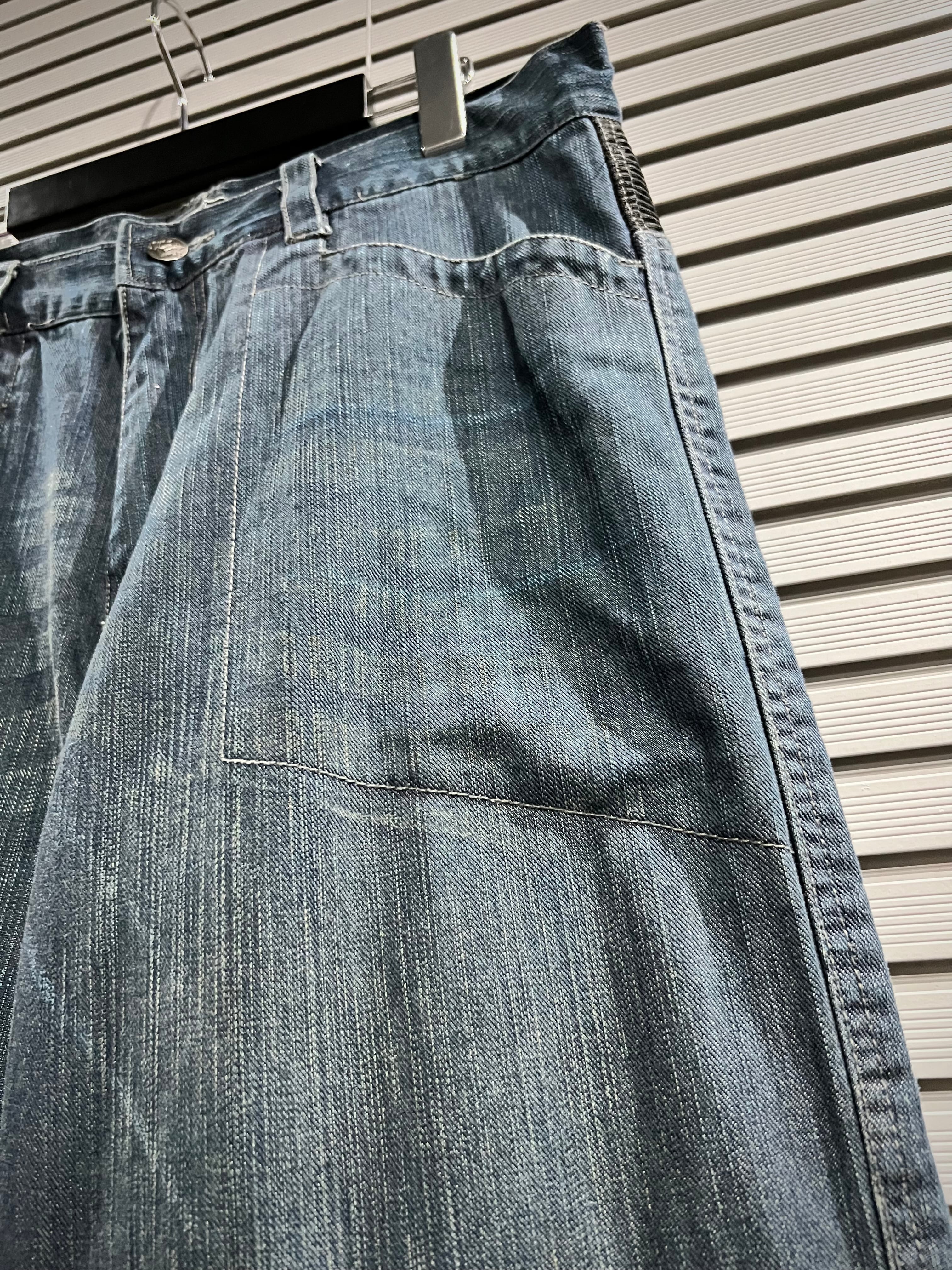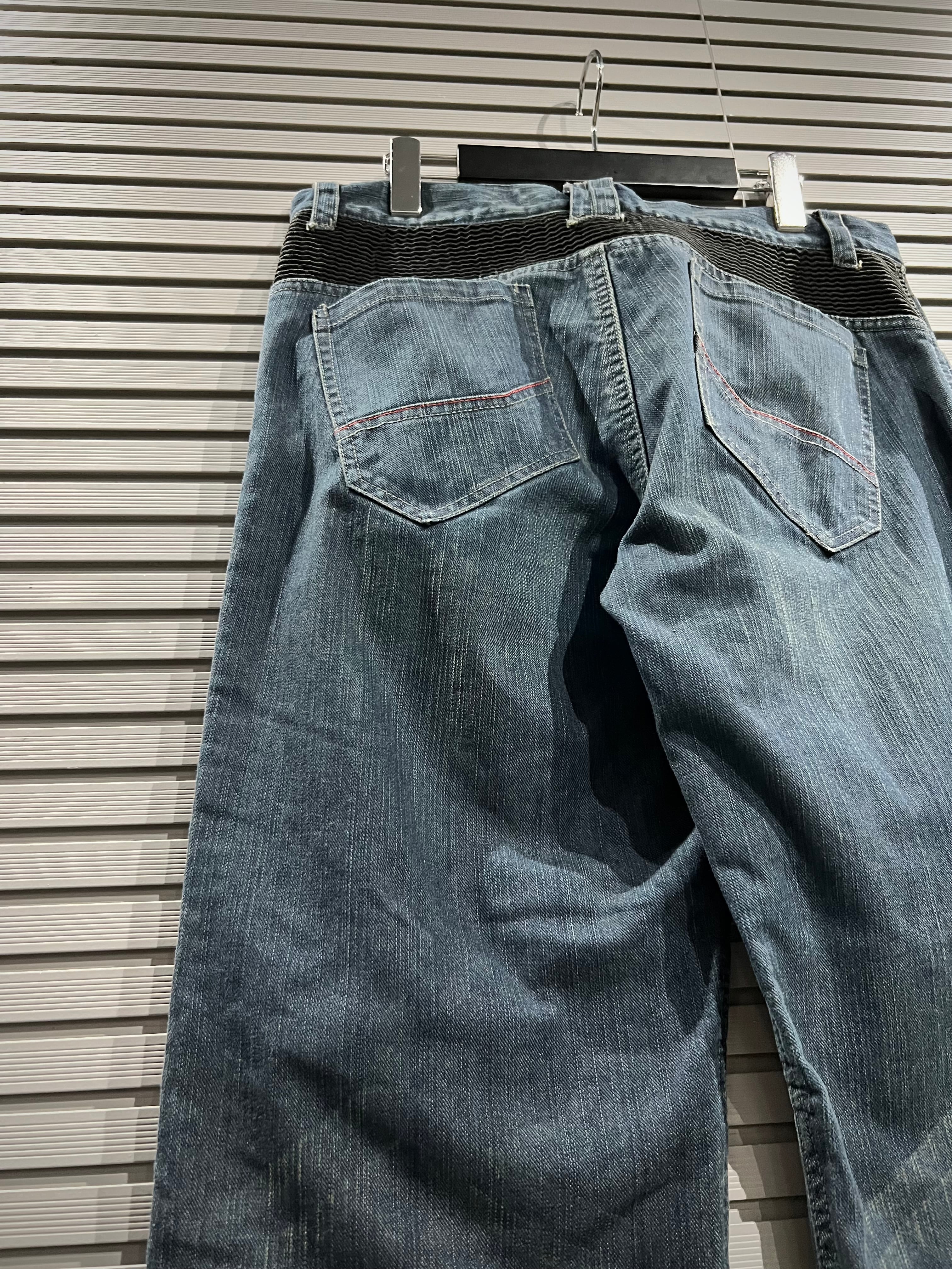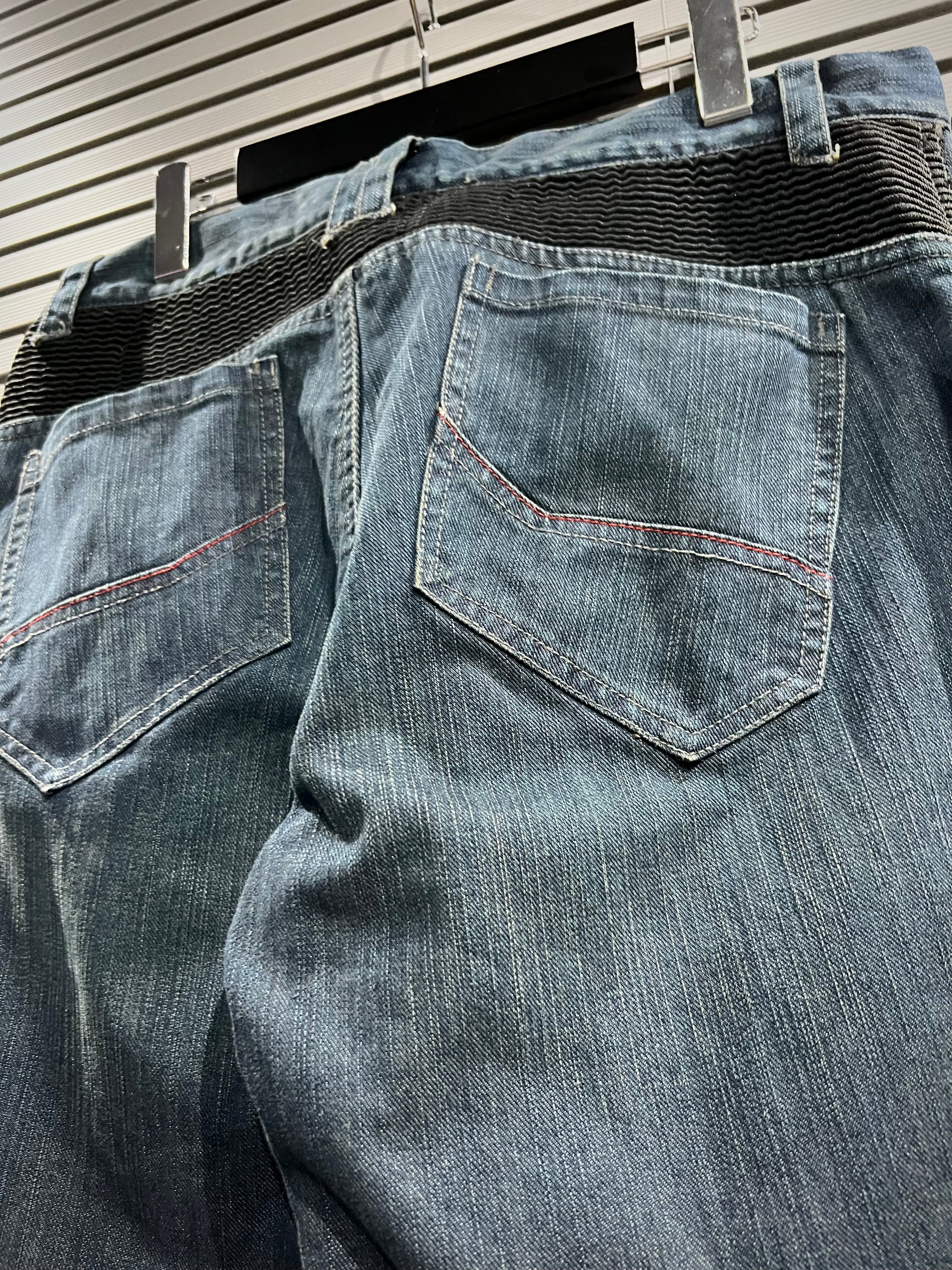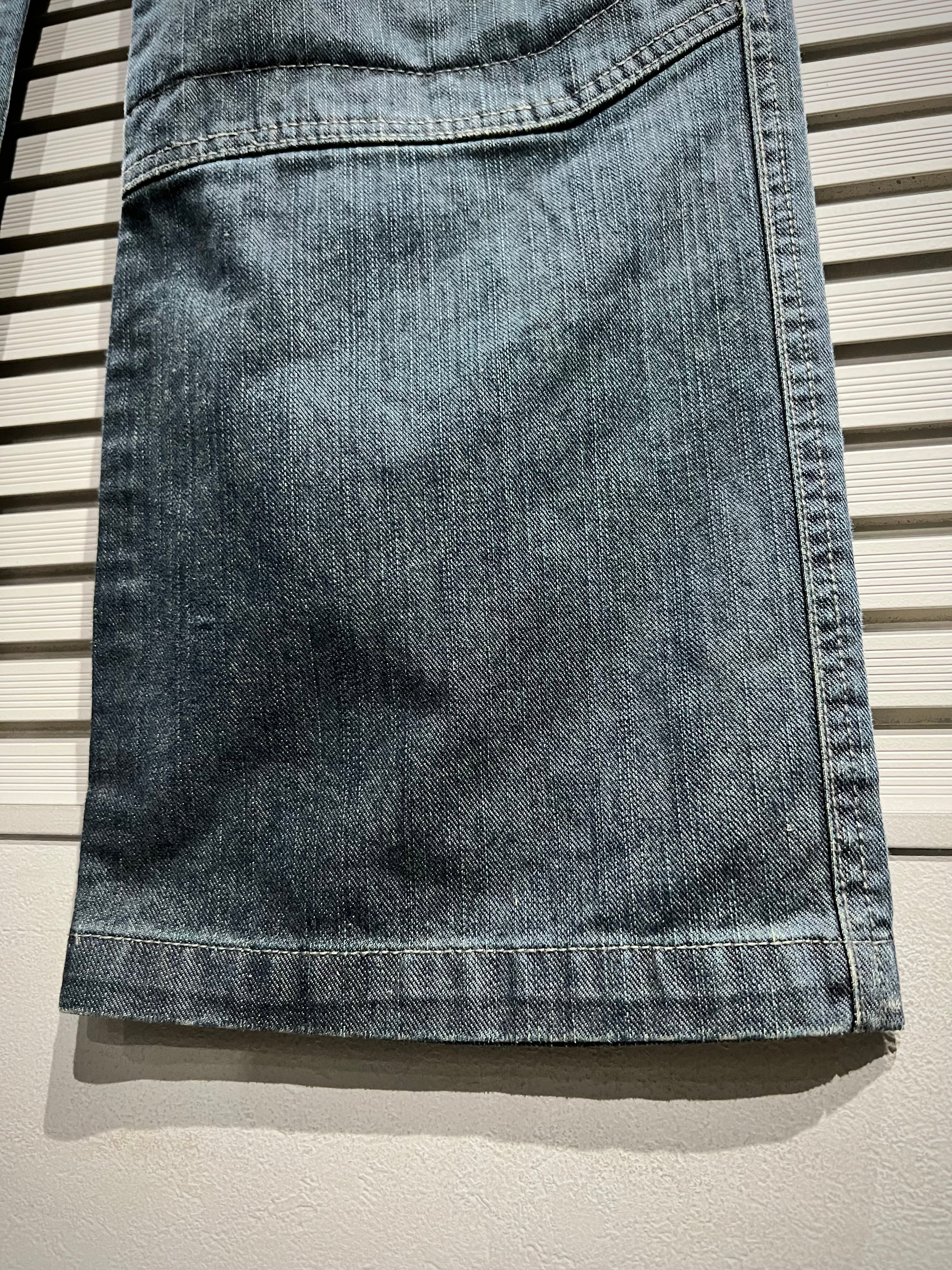モーターサイクルパンツのディテールが各所にレイアウトされたデザイン性の非常に高いデニムパンツ。