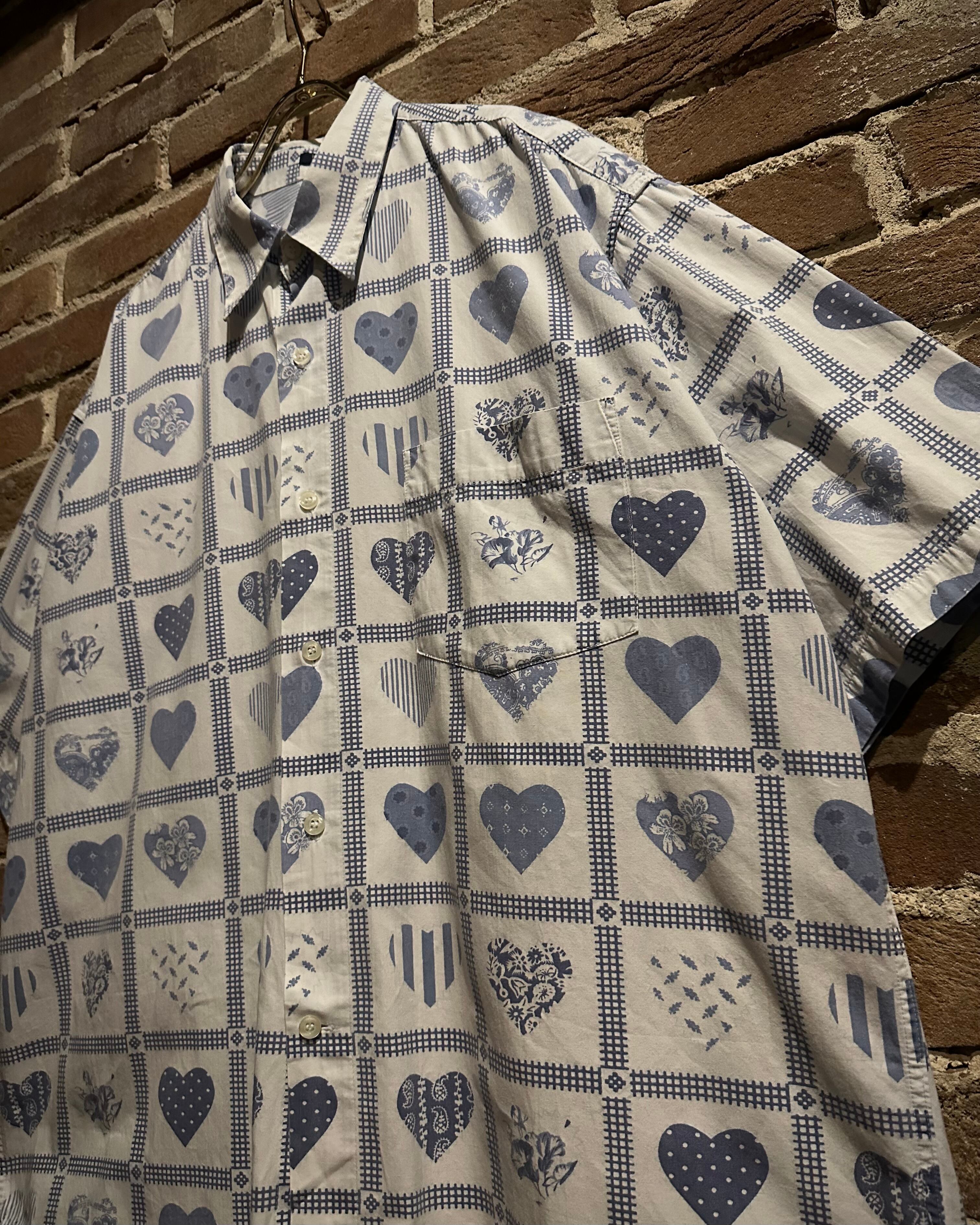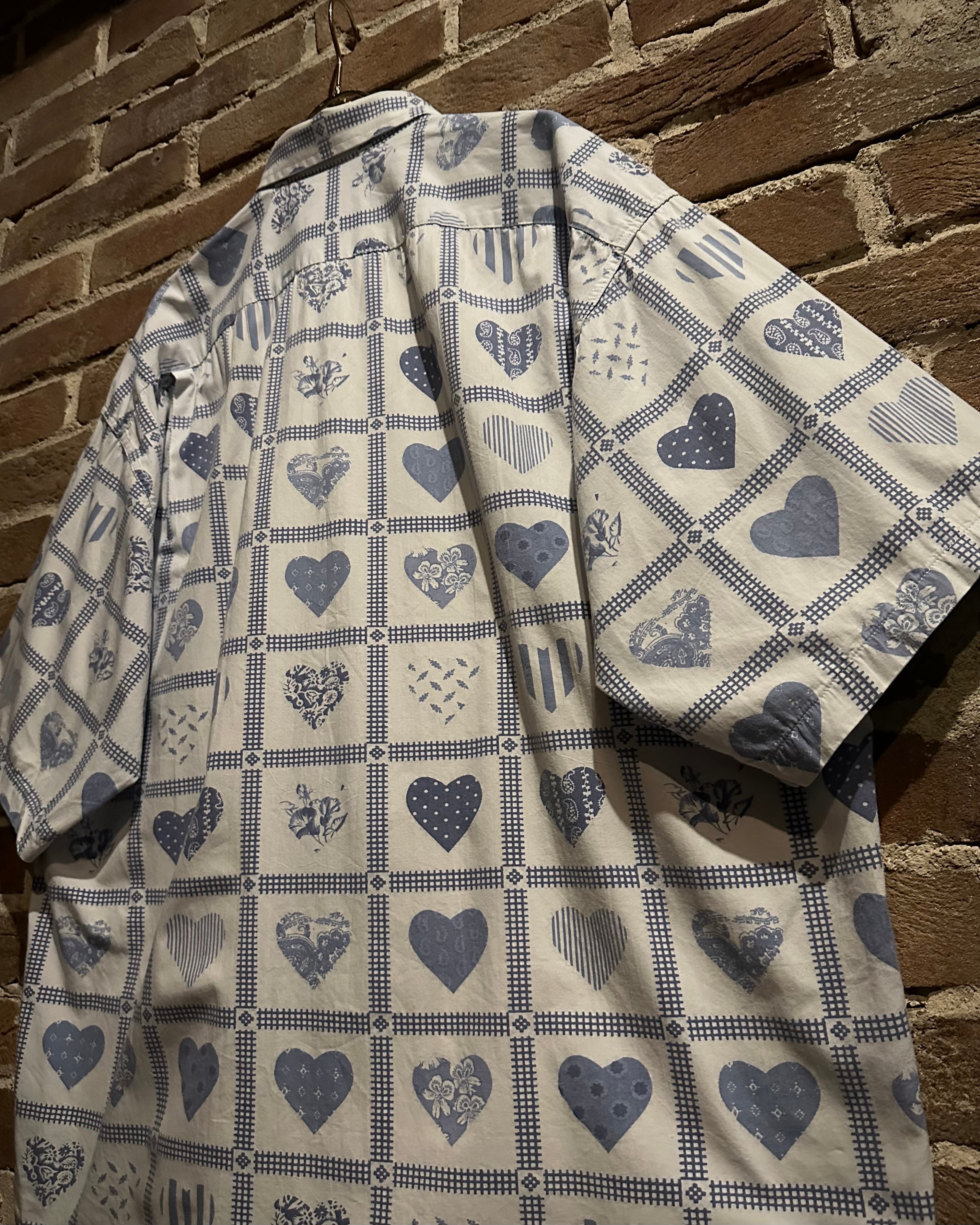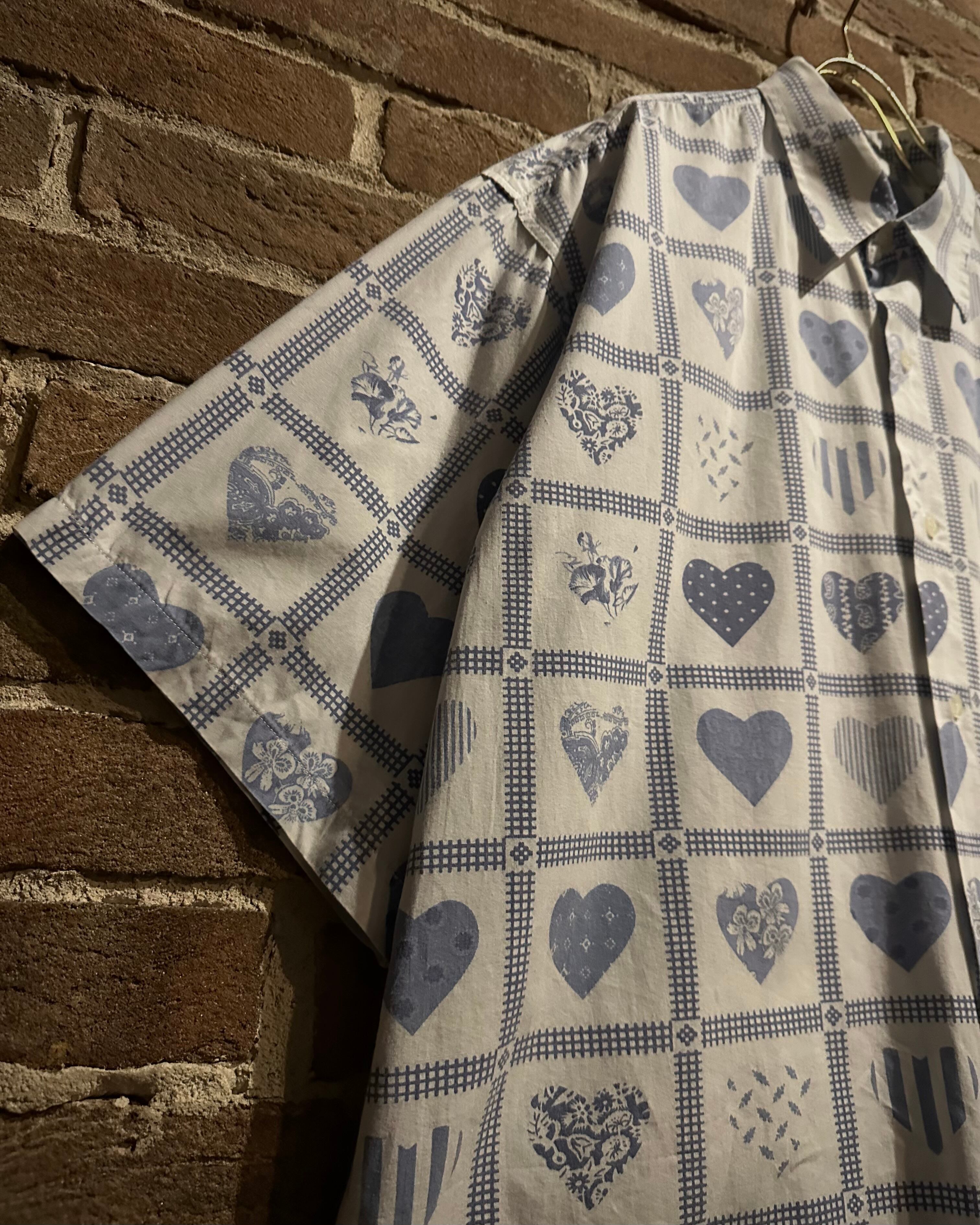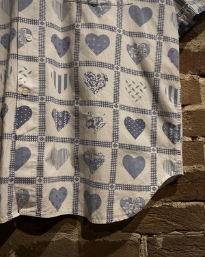 柔らかく肌触りの良いホワイトのコットンを用いたボディに、ハート柄を載せた半袖シャツ。