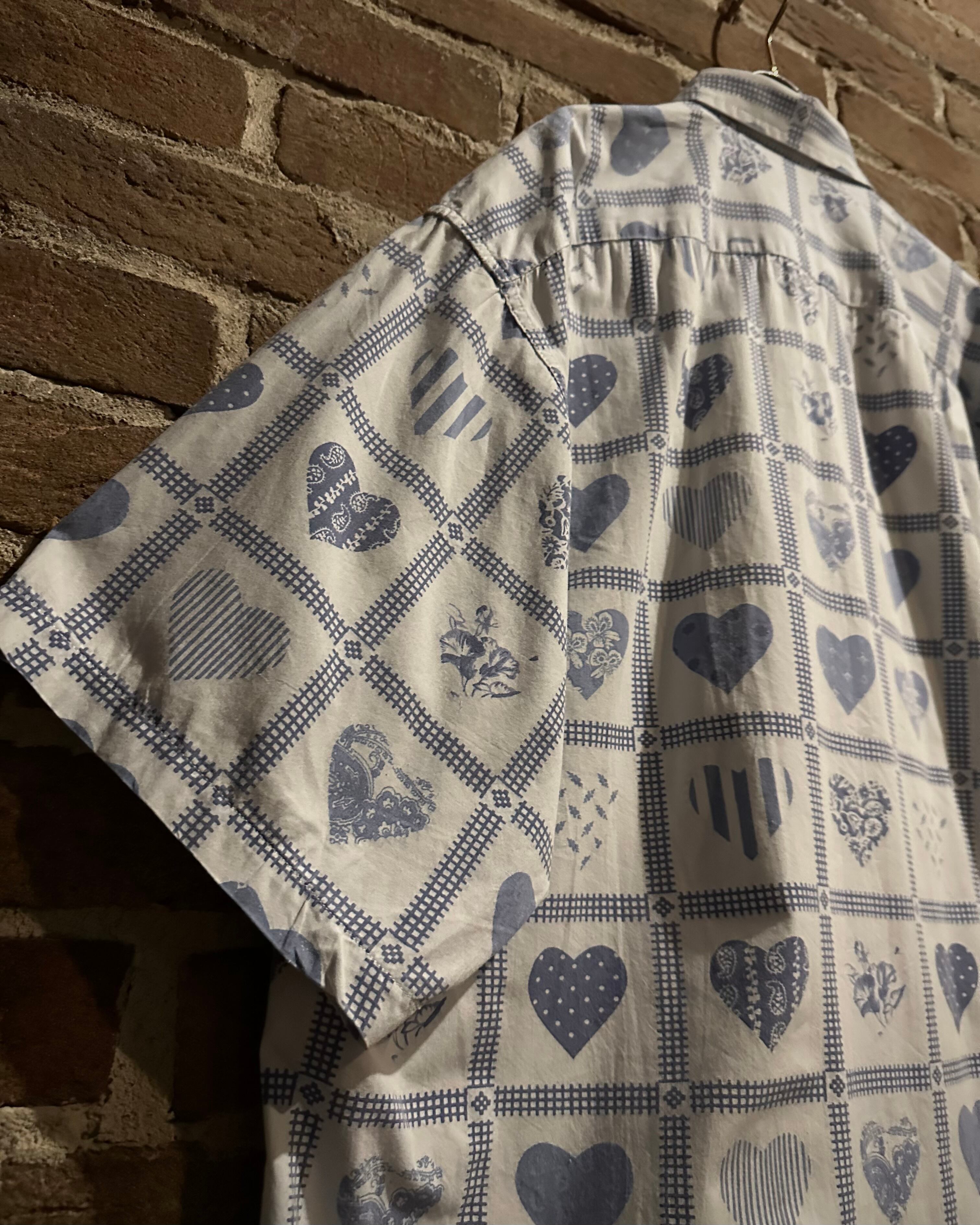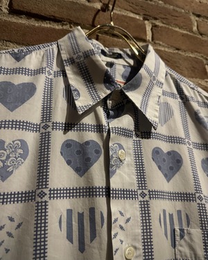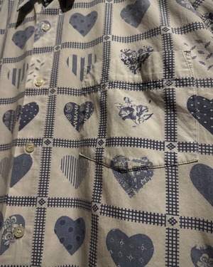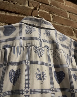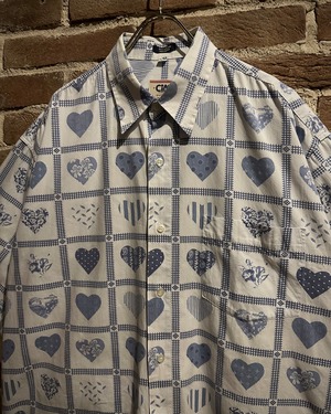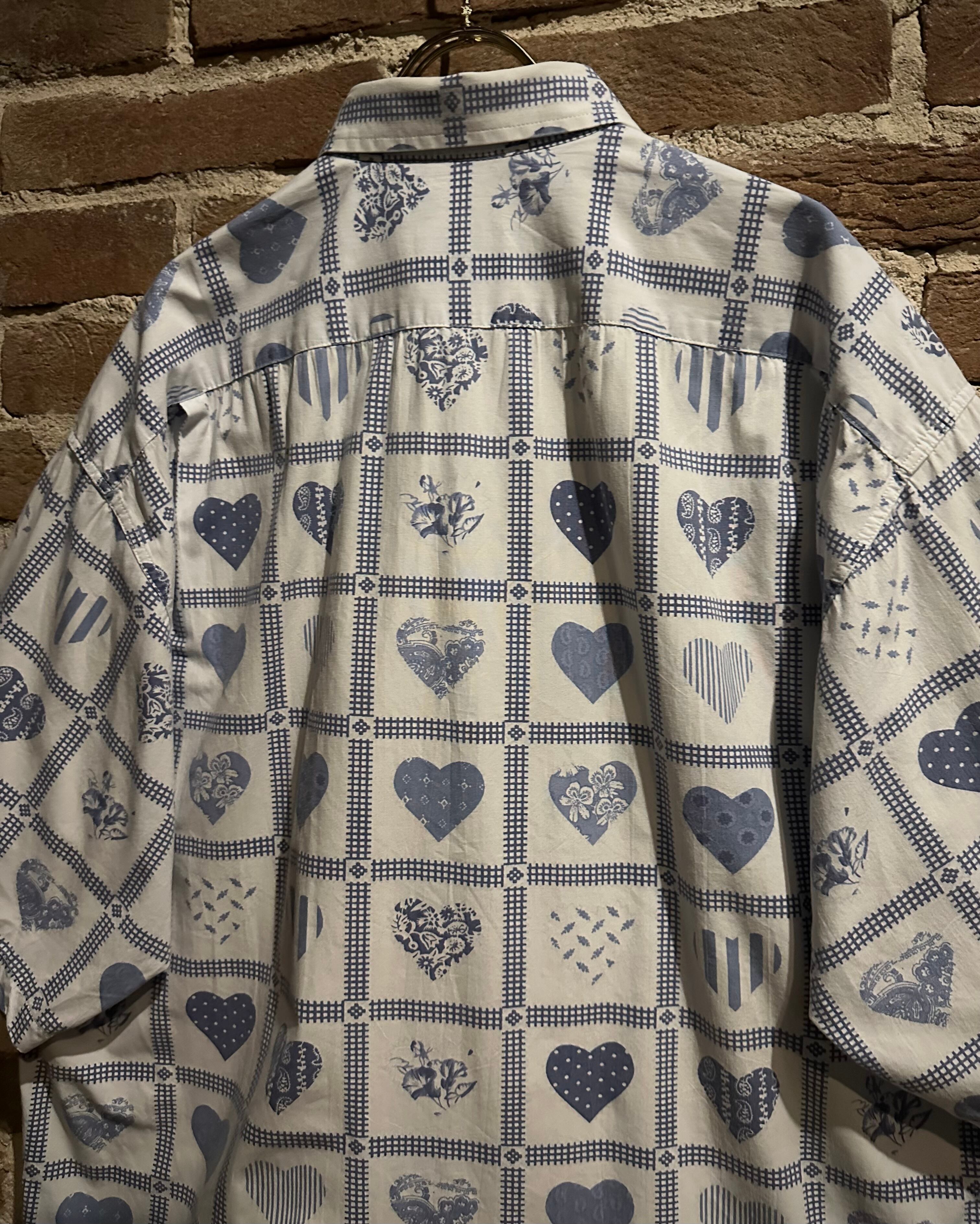 柔らかく肌触りの良いホワイトのコットンを用いたボディに、ハート柄を載せた半袖シャツ。