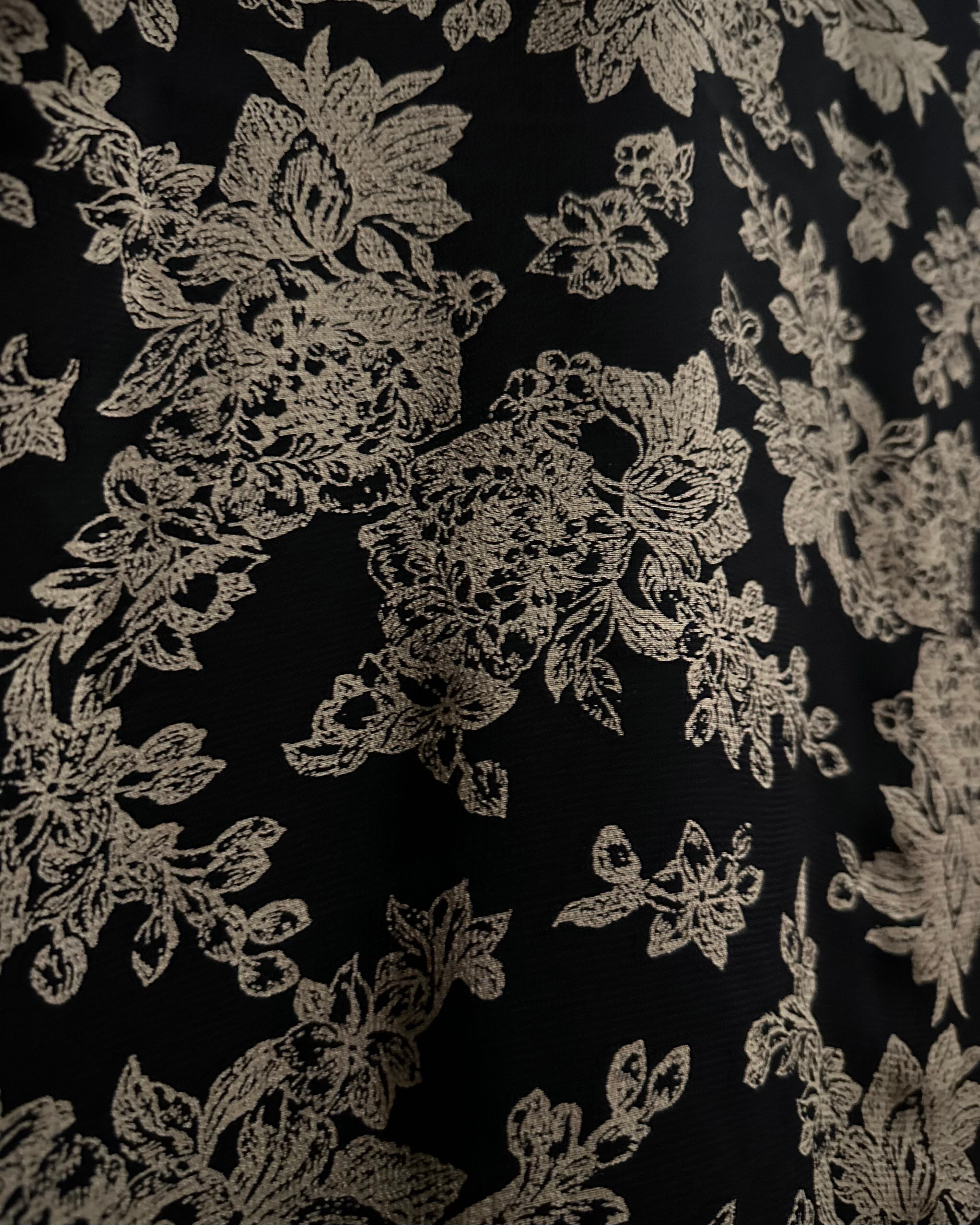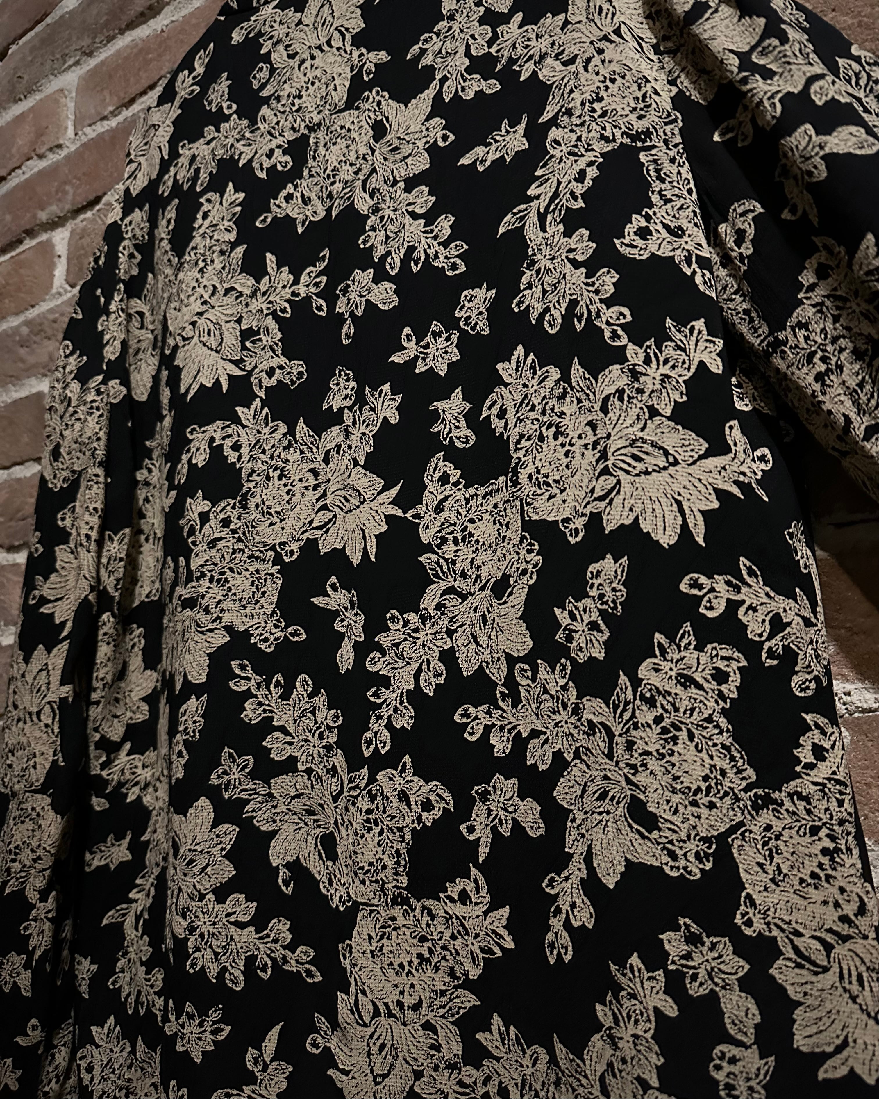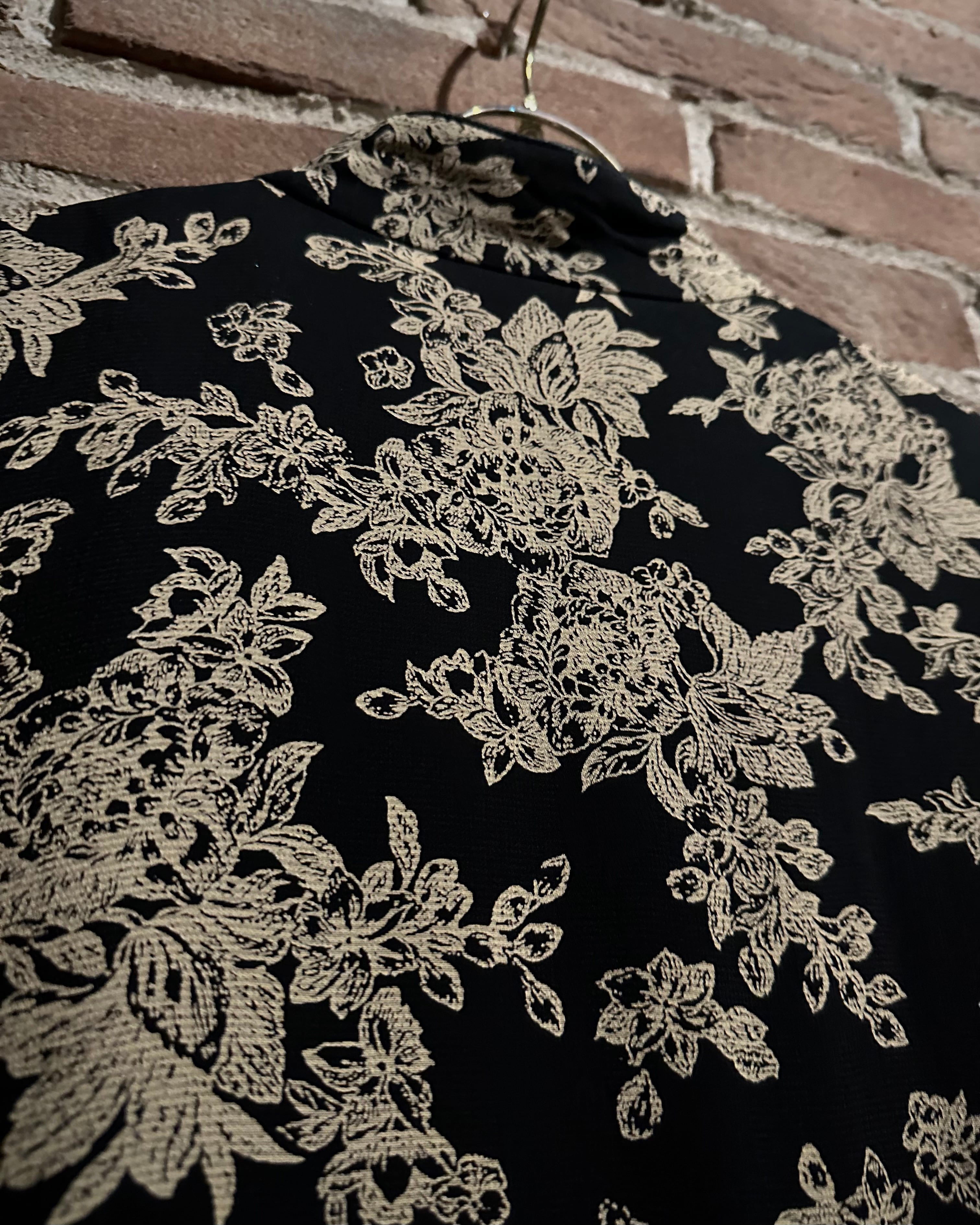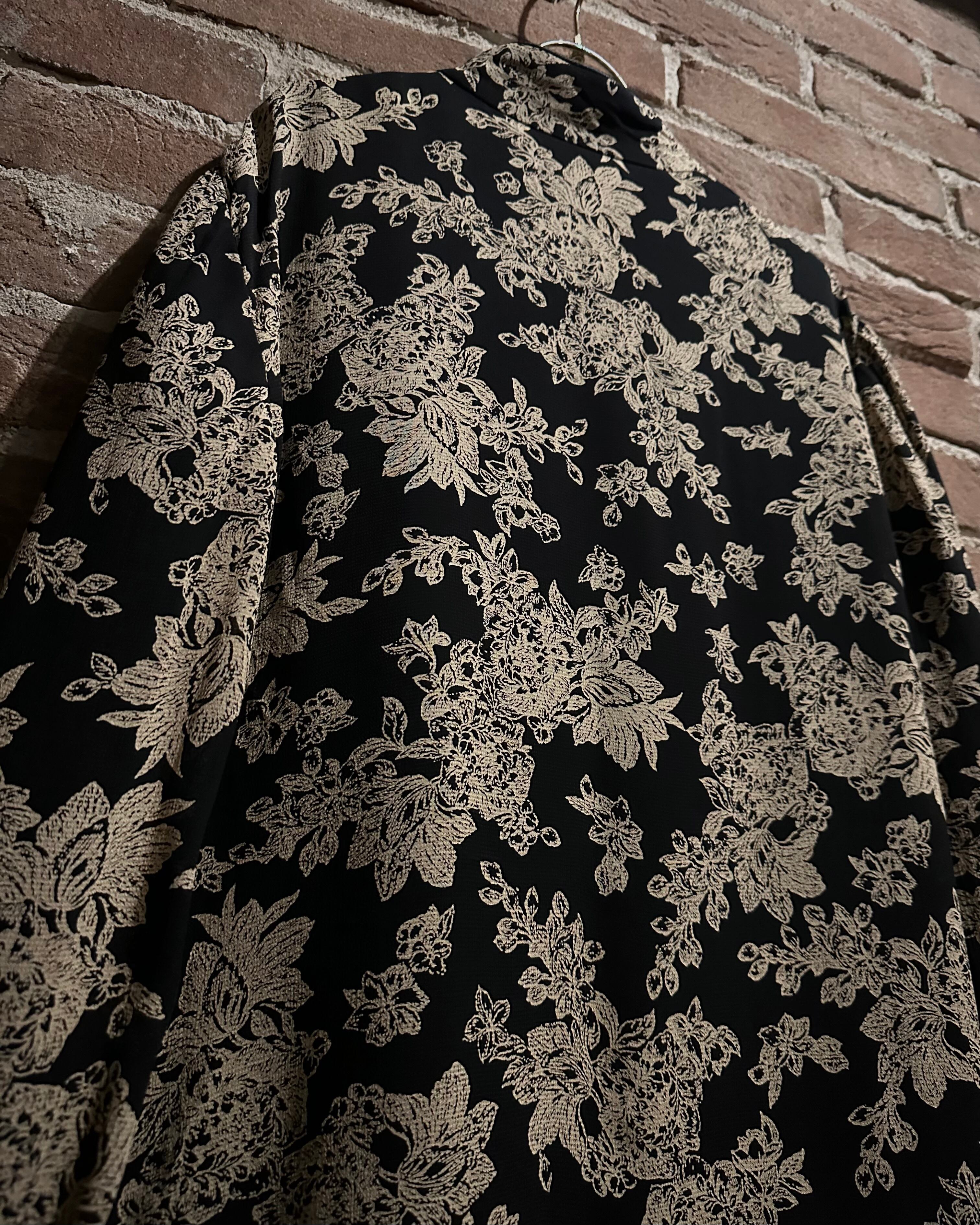 サラッと肌触りの優しいレーヨンをベースに、レトロな花柄を載せたチャイナシャツジャケット。