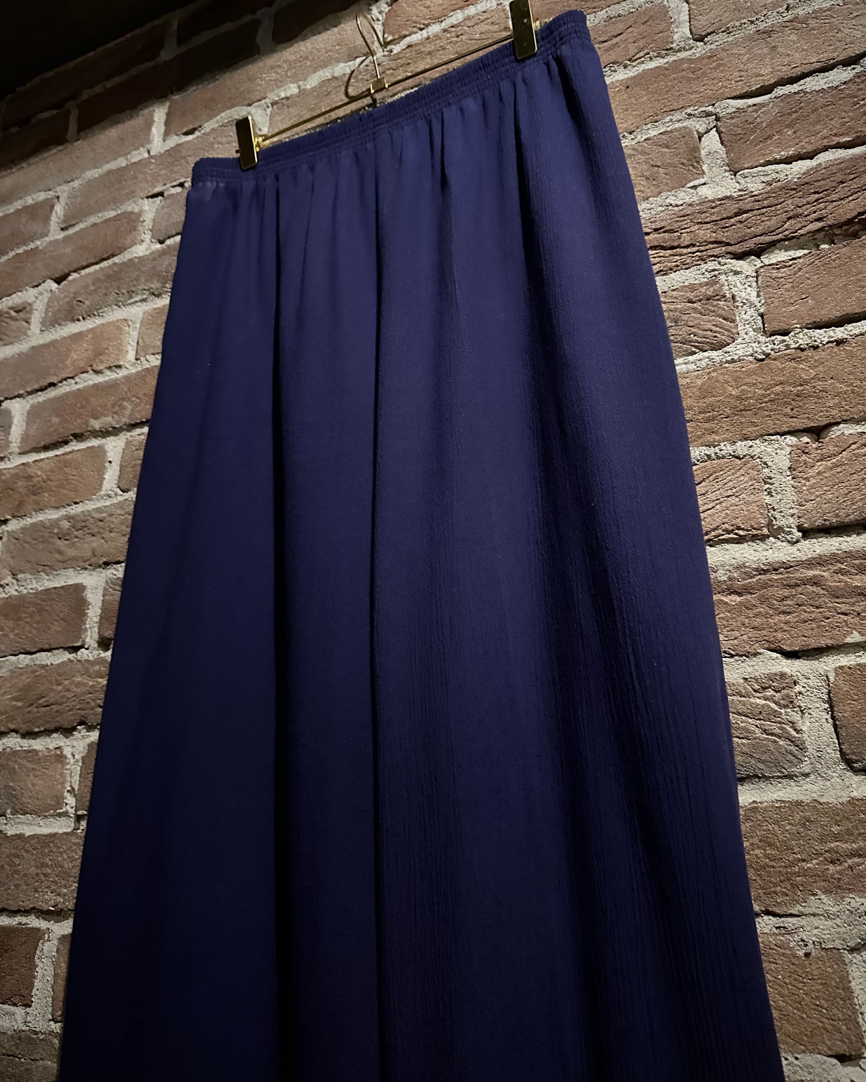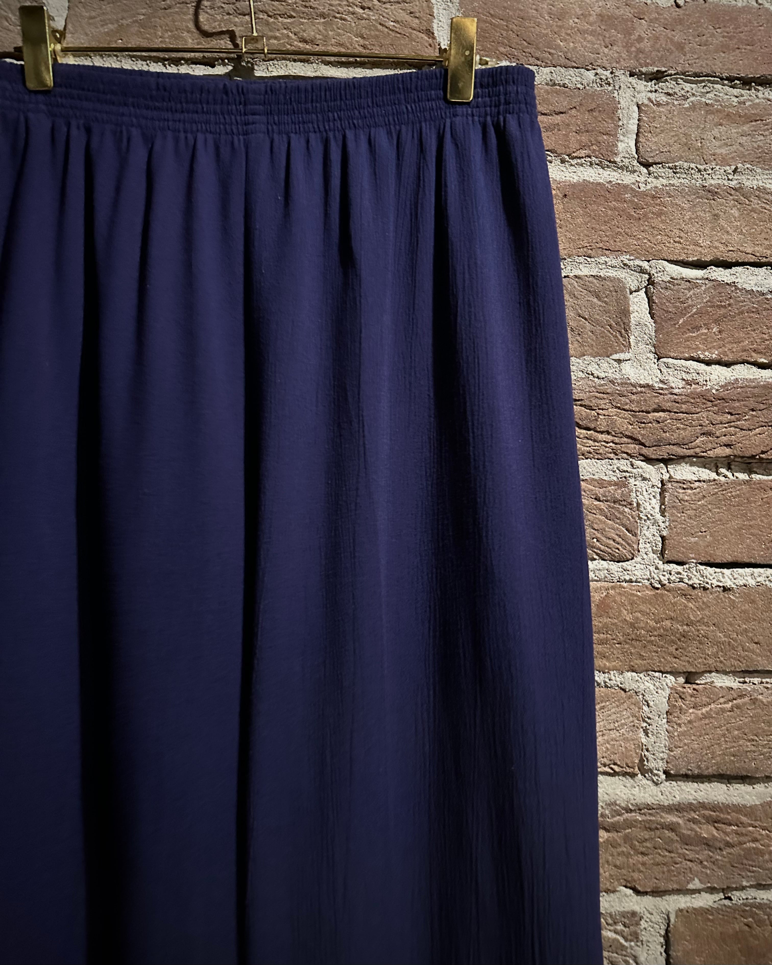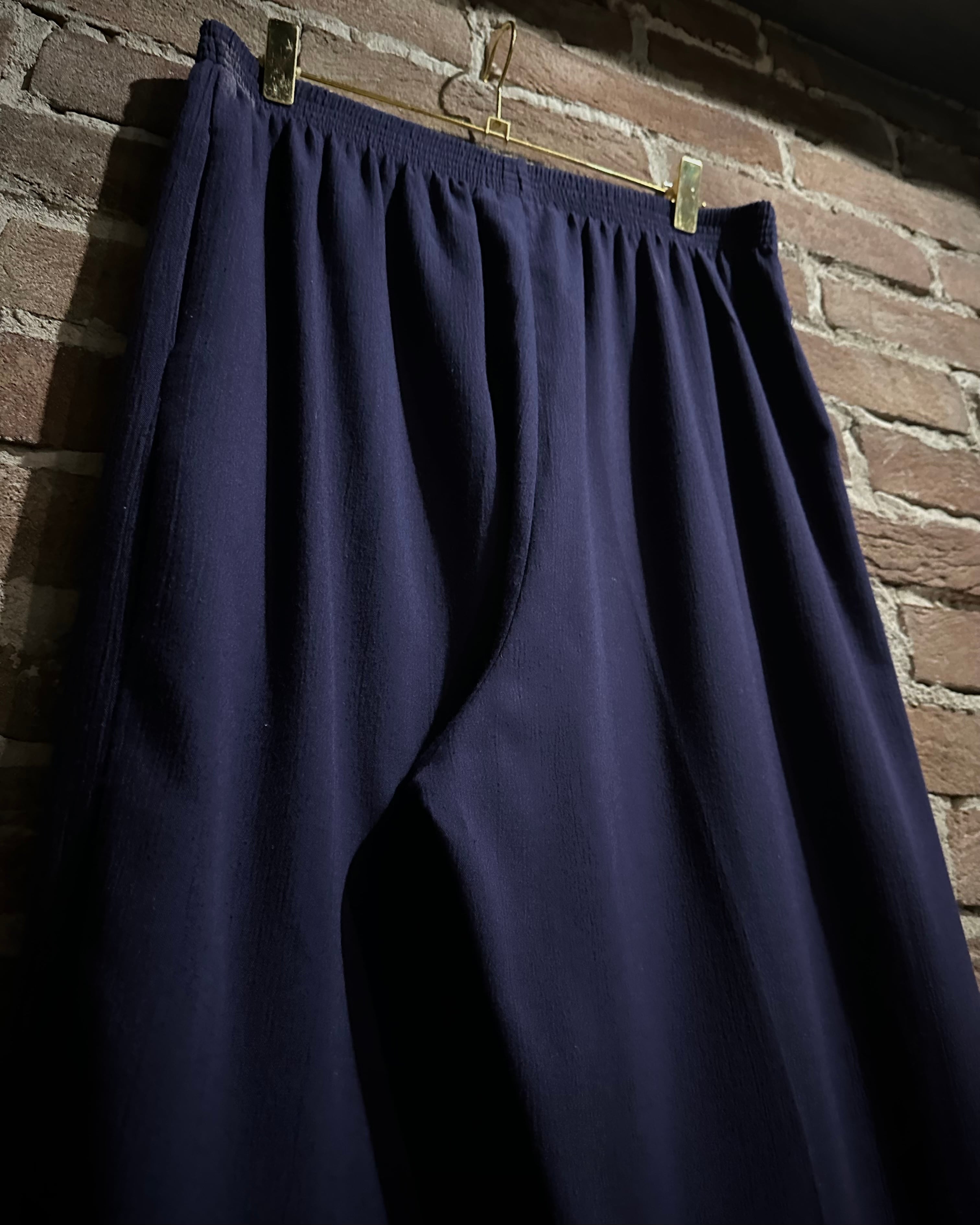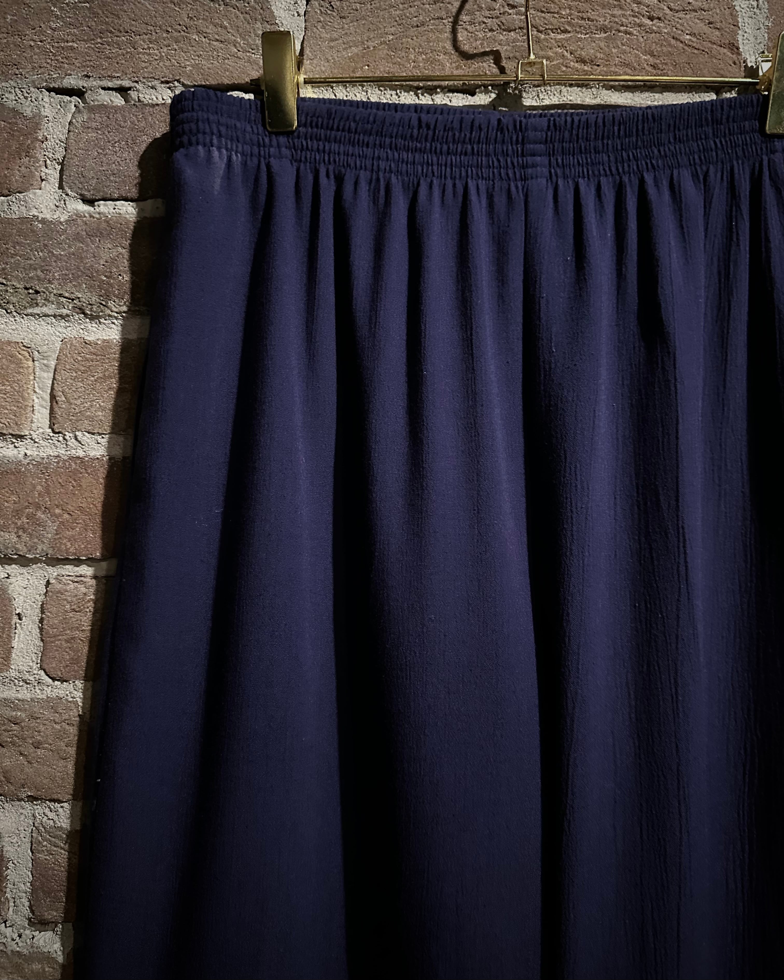 ウエストはゴムのイージー仕様でズドンとワイドなストレートシルエット。ギャザーによって美しい落ち感が演出され、ドレープがボディに深い陰影を与えています。