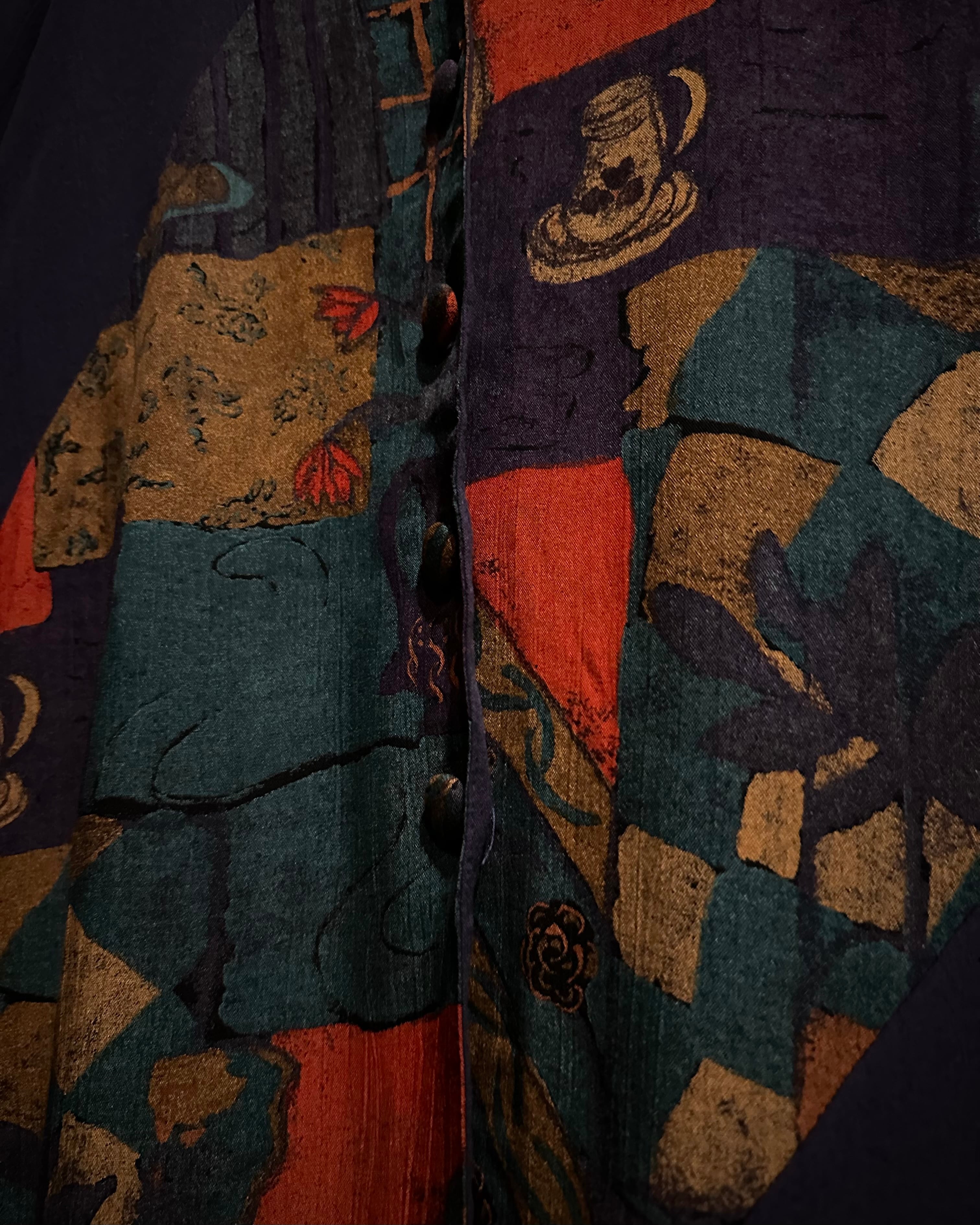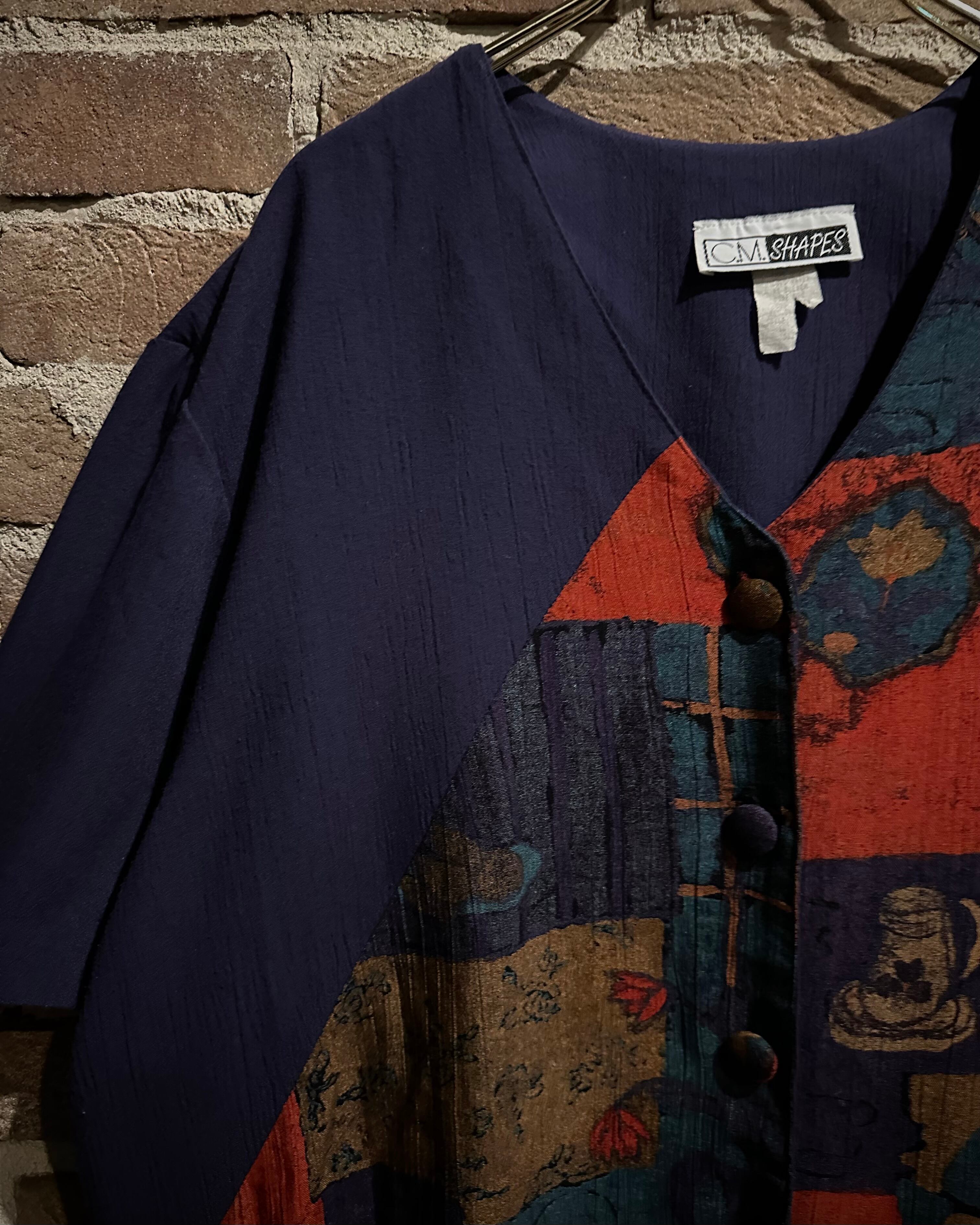 シャツはVネック仕様で抜け感があり、アートの切り替えが唯一無二感を演出。デザインに馴染むくるみボタン使いも◎