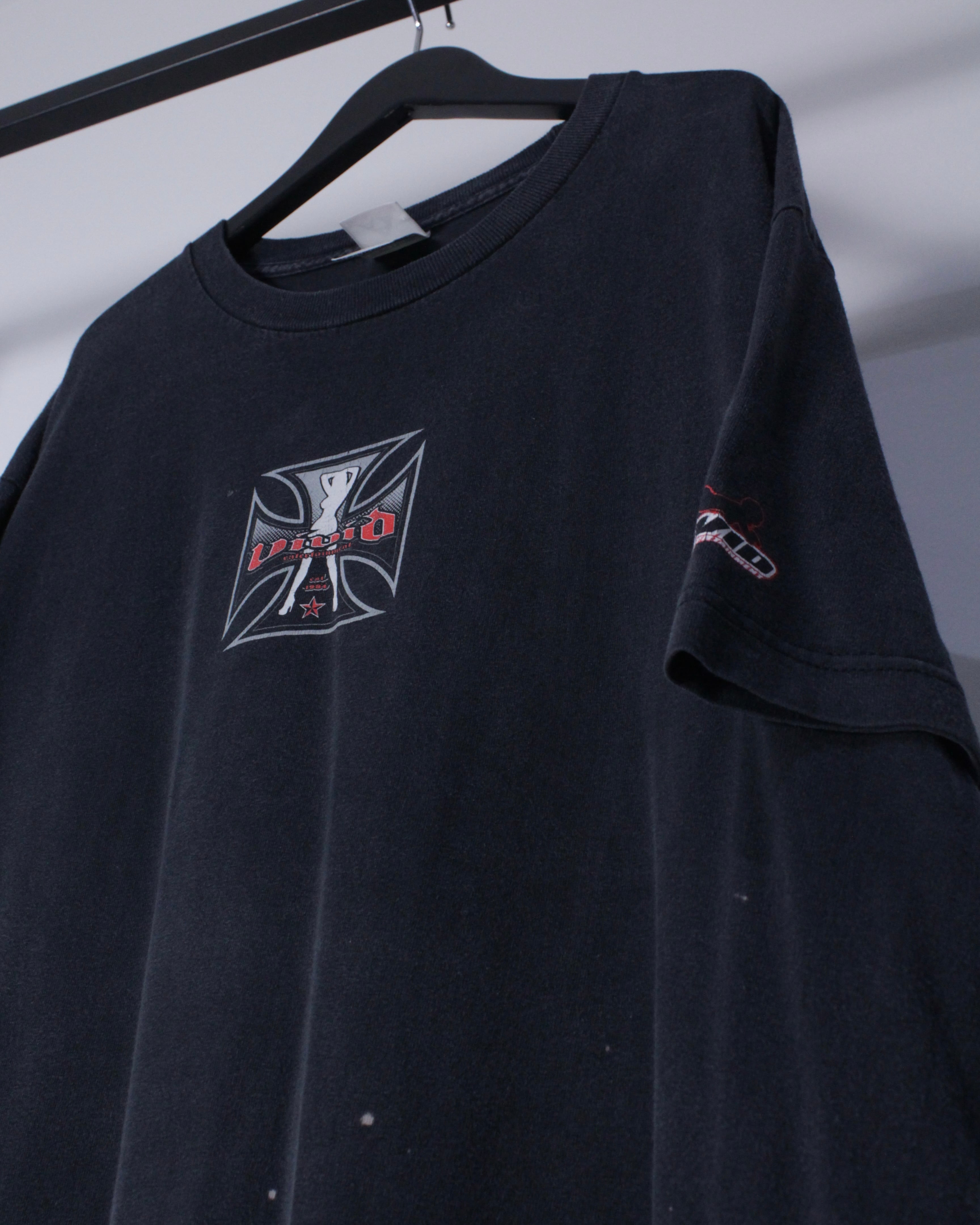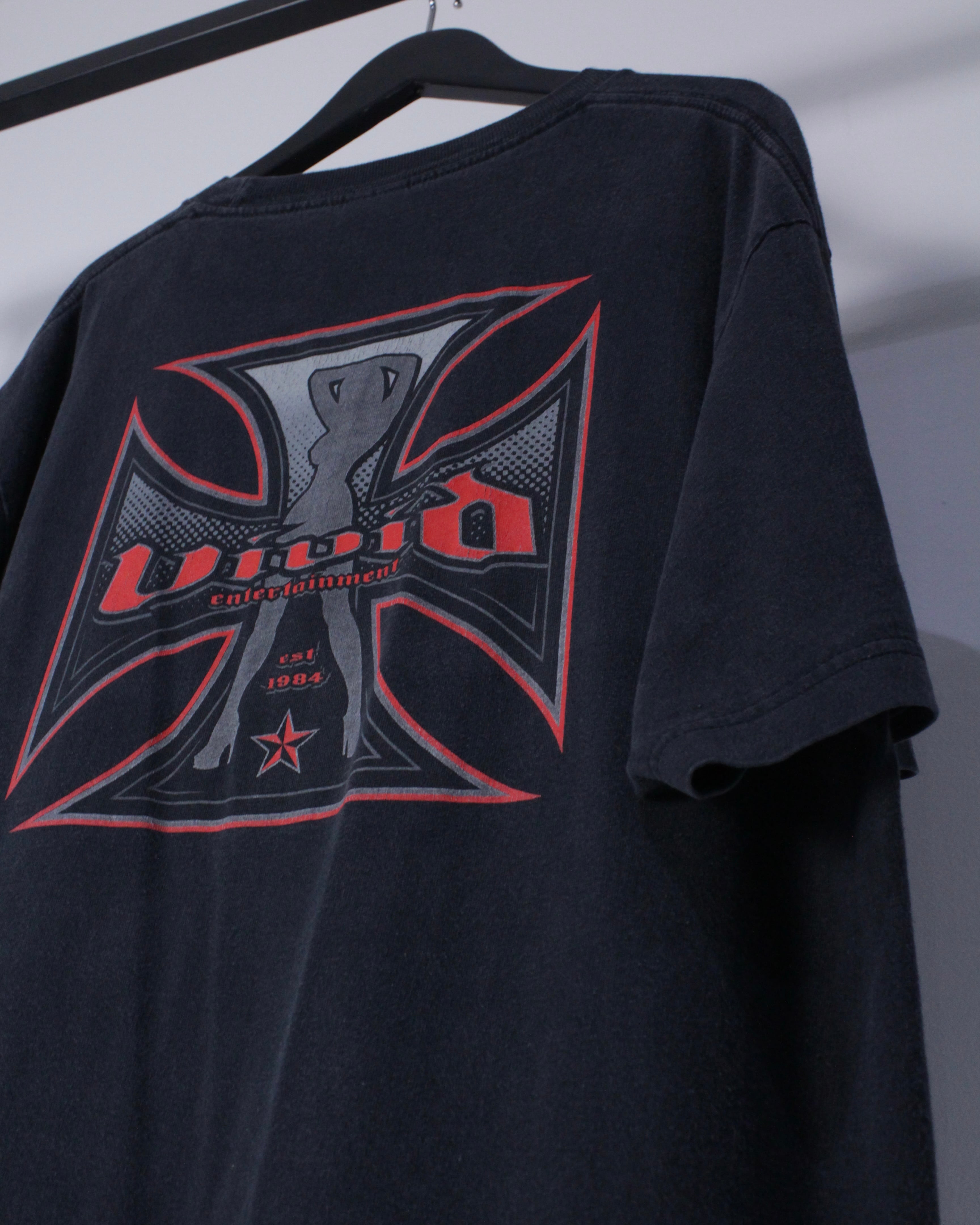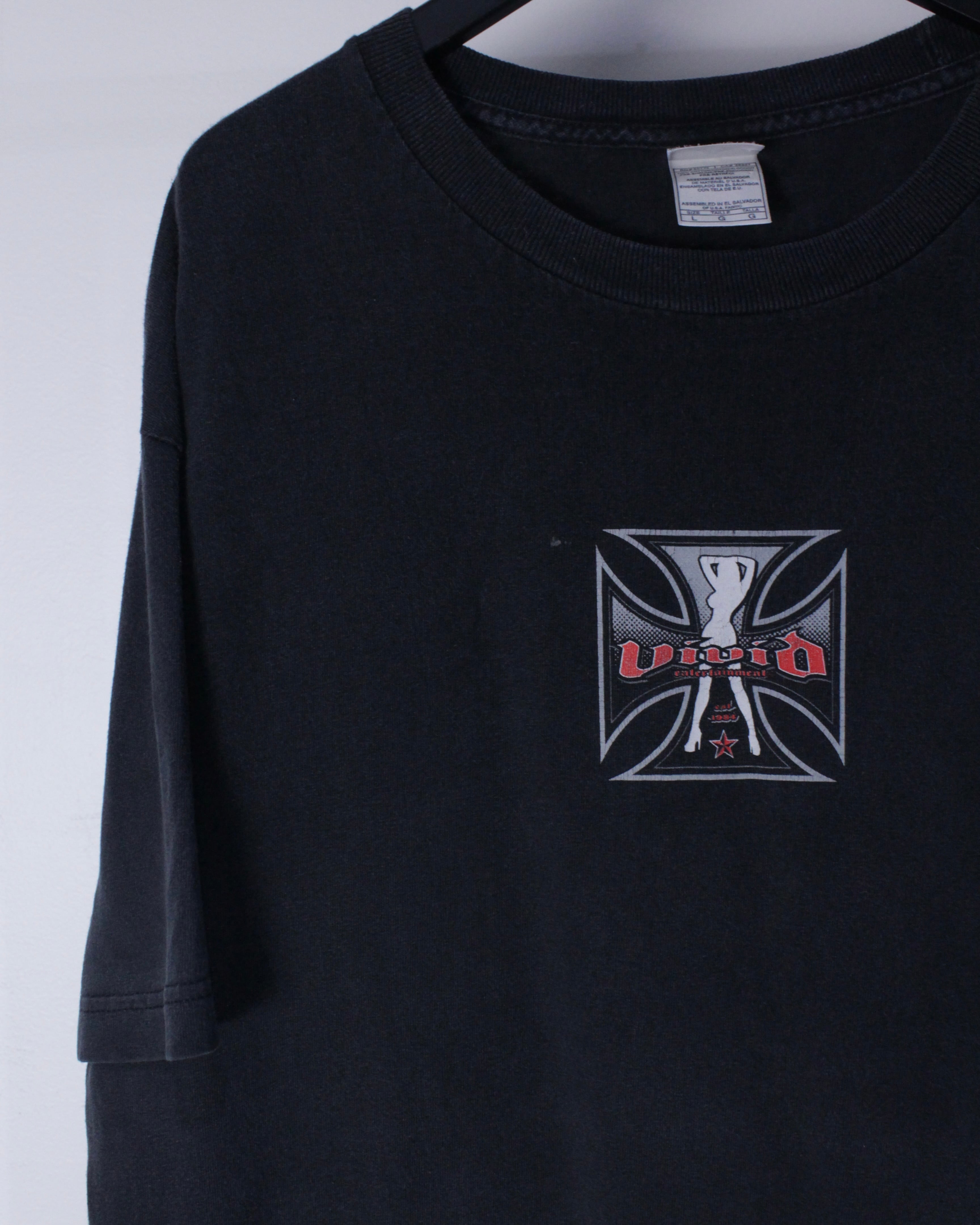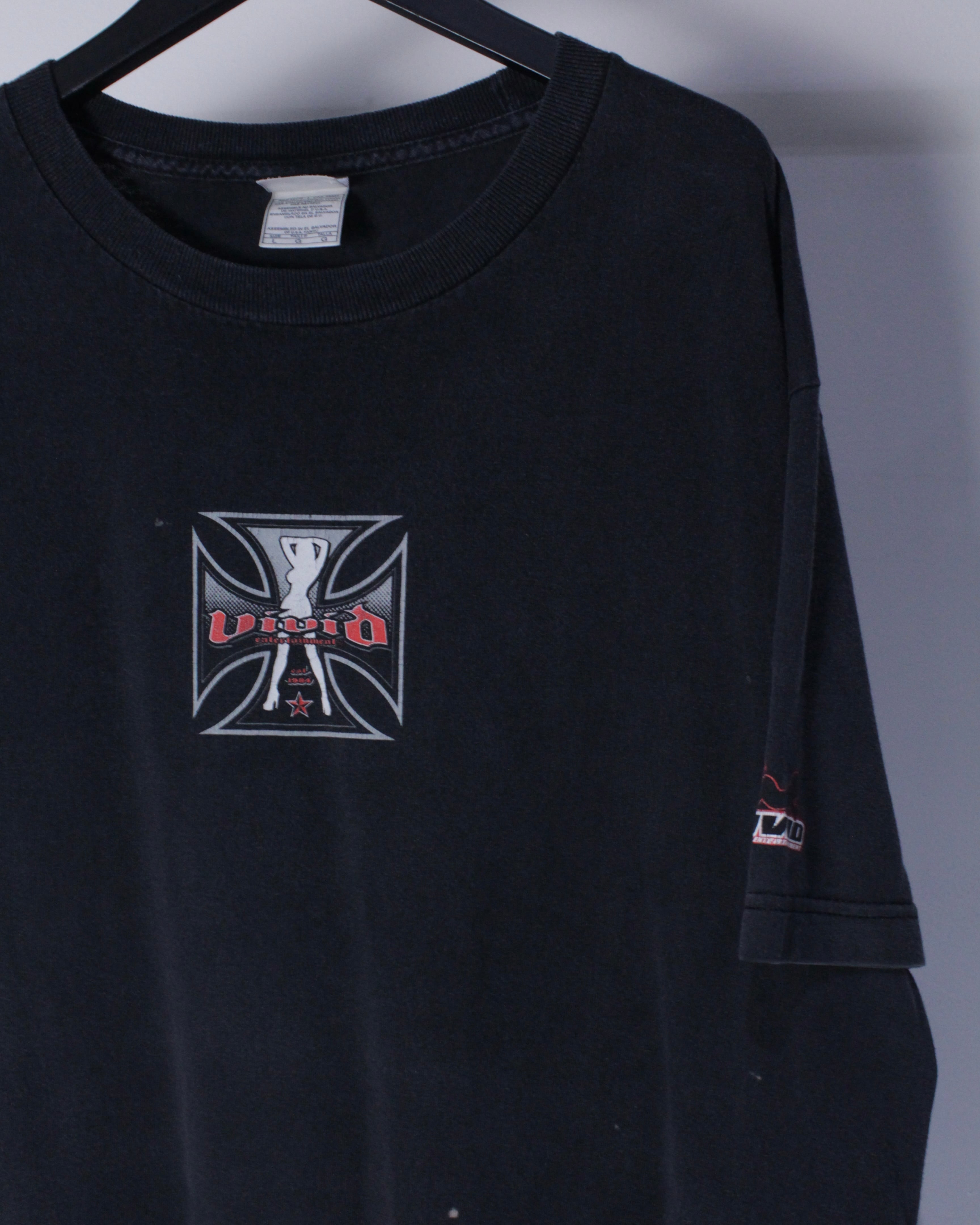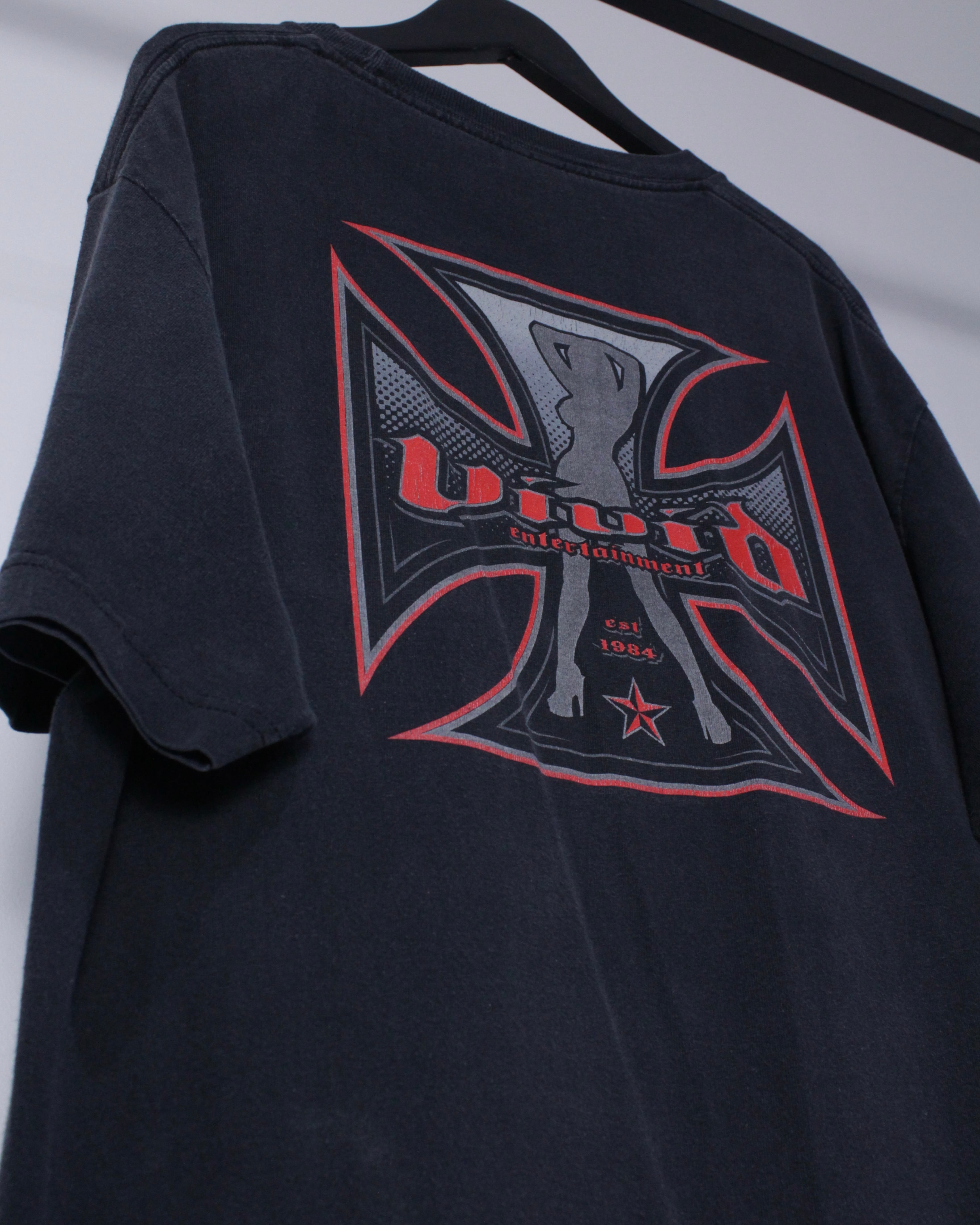 アメリカのAV会社"Vivid Entertainment"の、アイアンクロスのロゴ、セクシーな女性をプリントしたTシャツ。