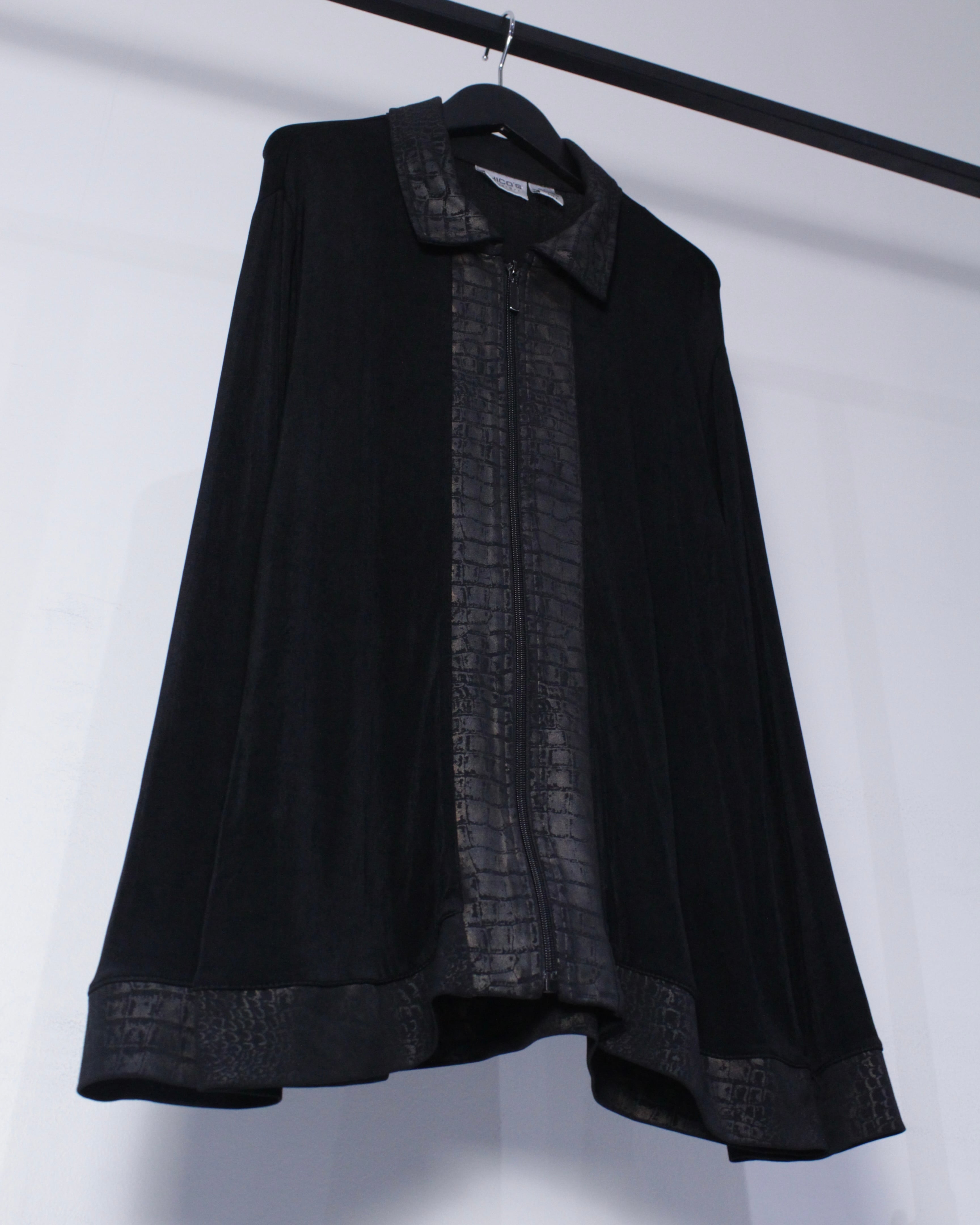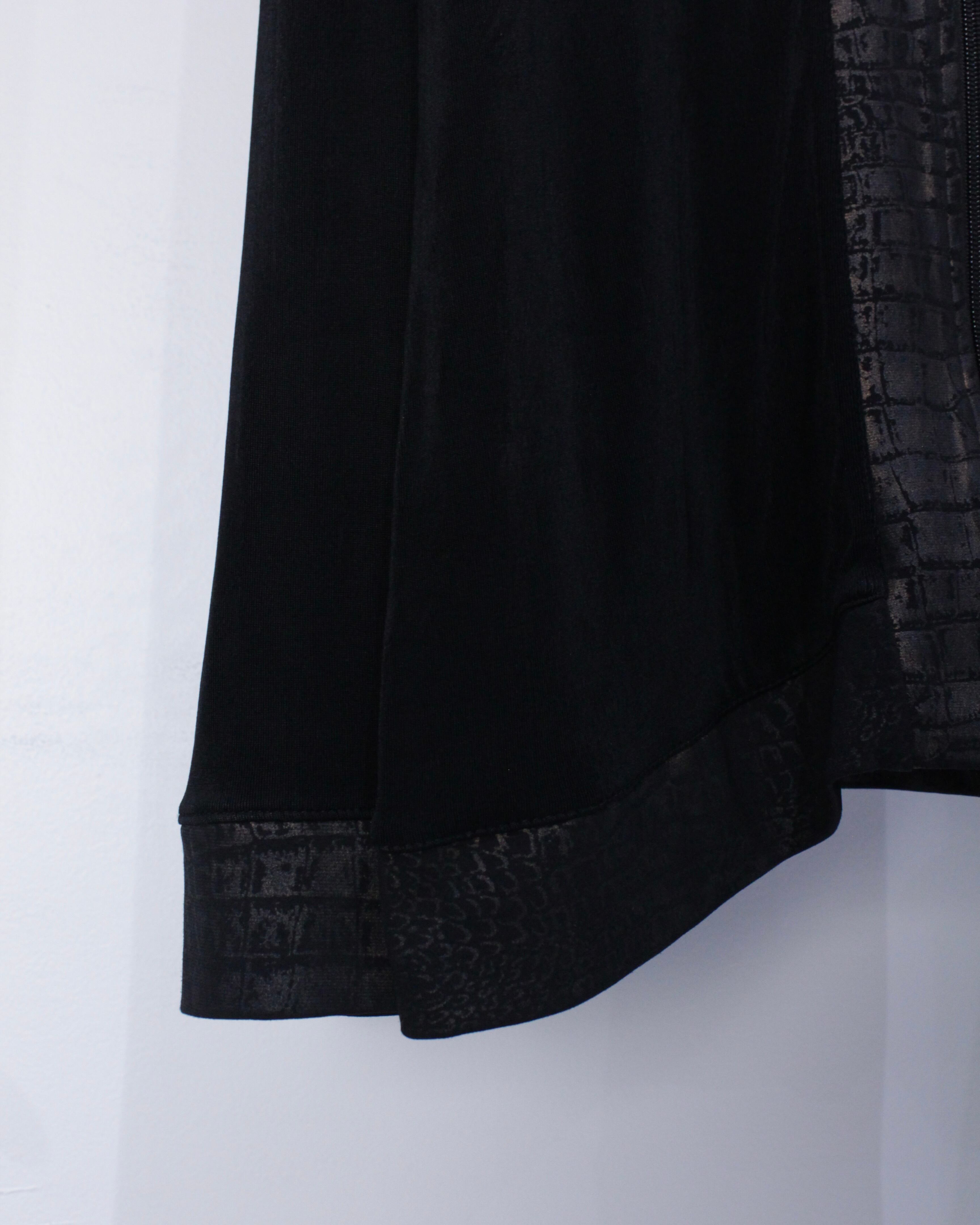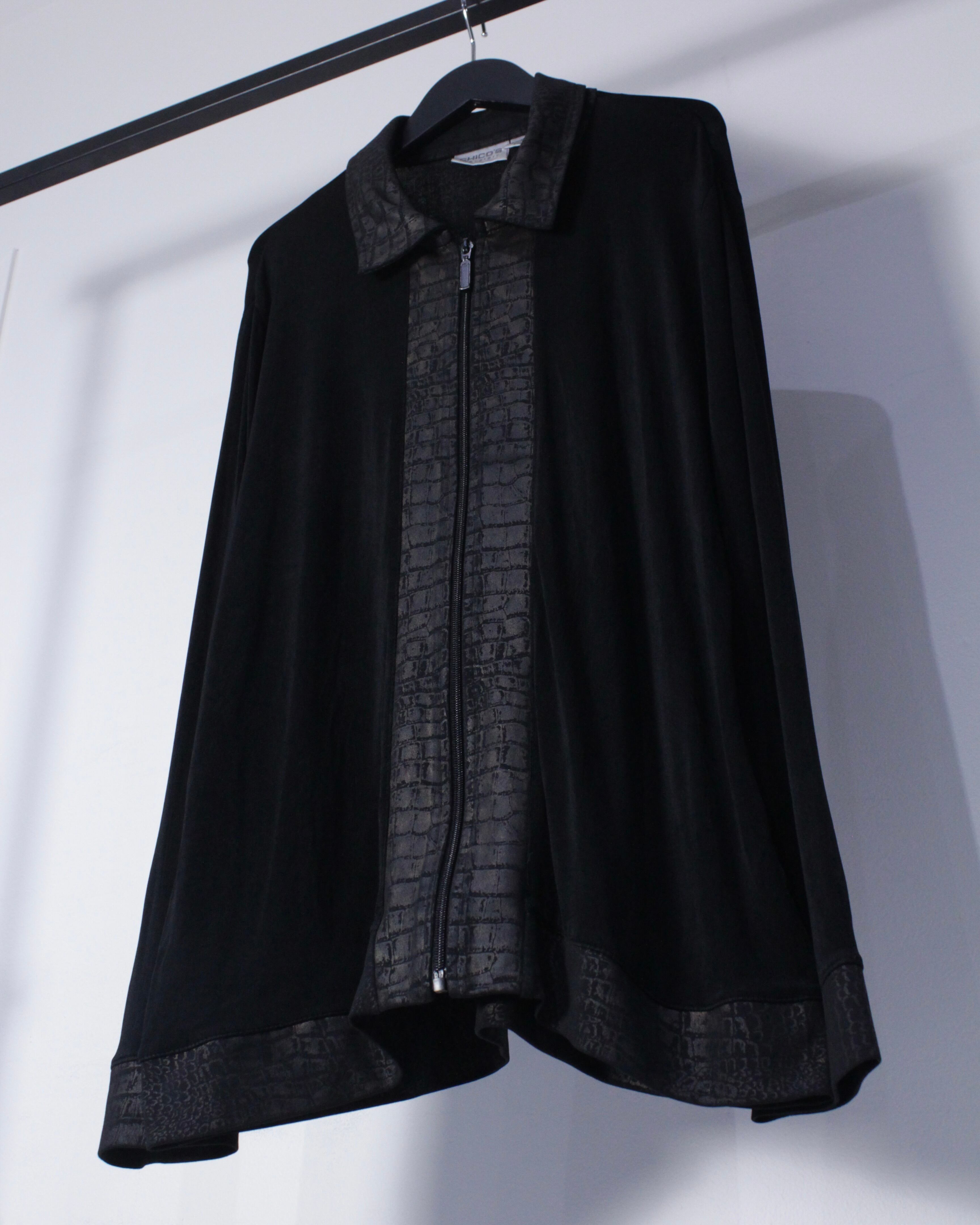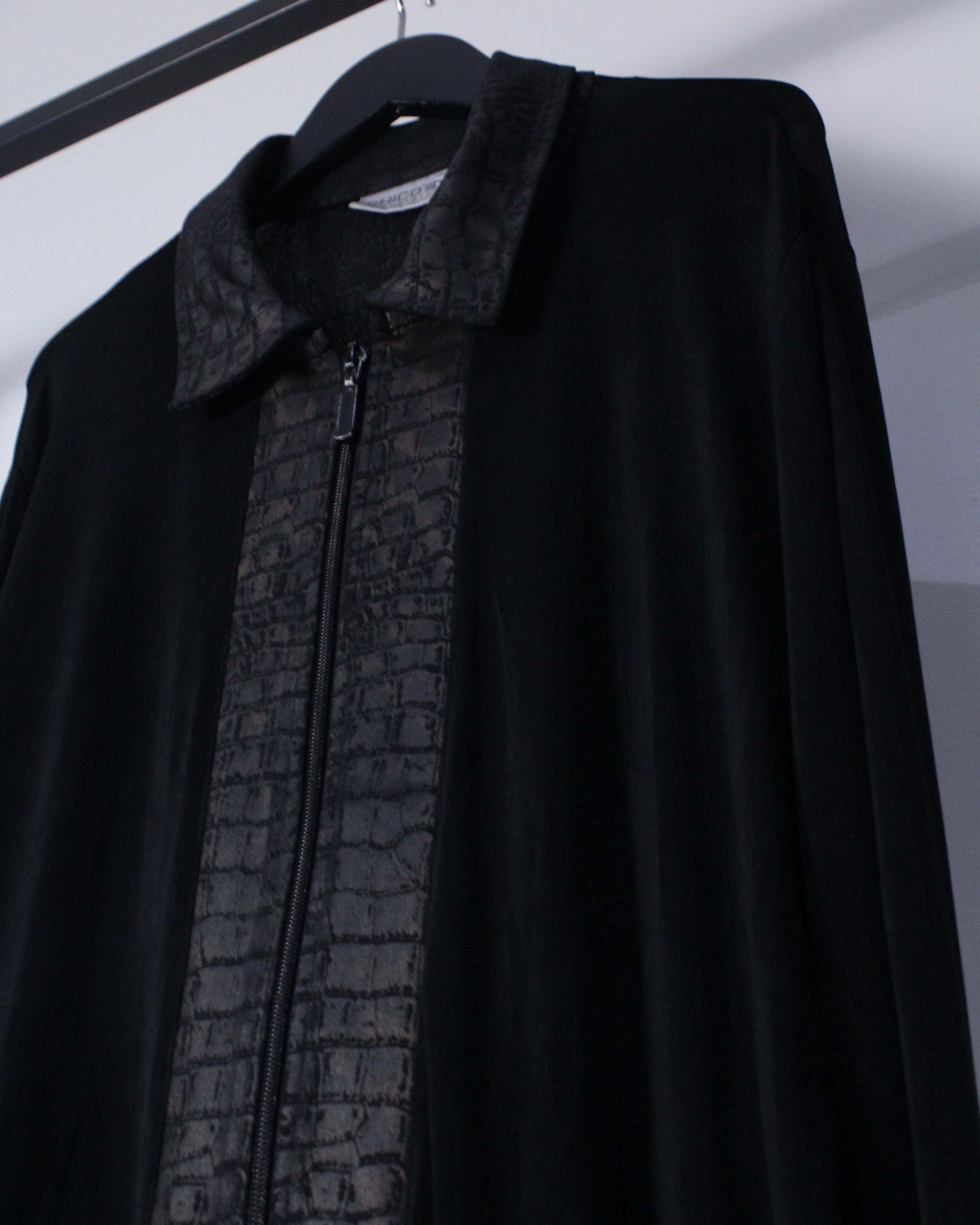 ブラックのボディをベースに、襟、フロント、裾にクロコダイル風の柄模様を切り替えたジップアップジャケット。