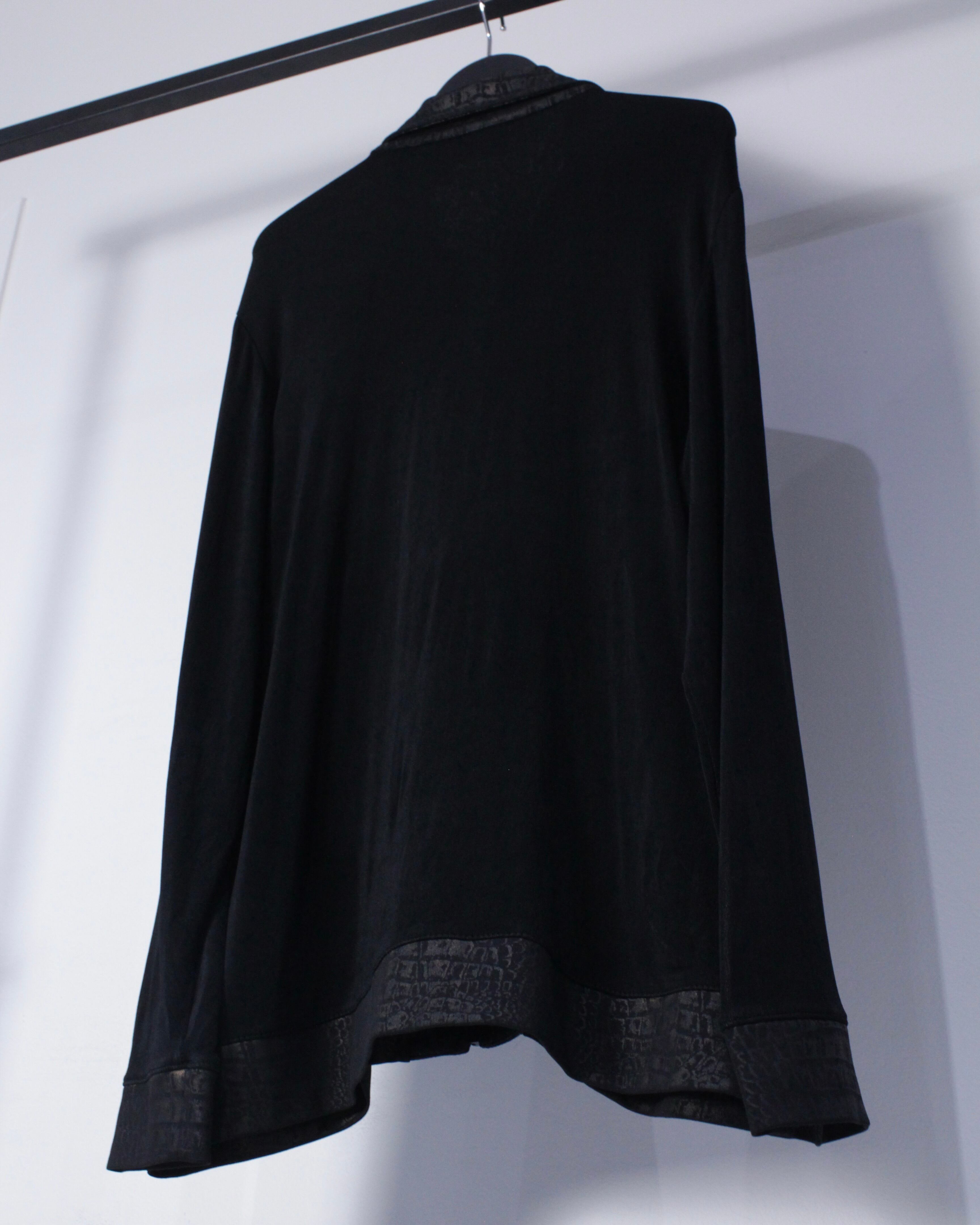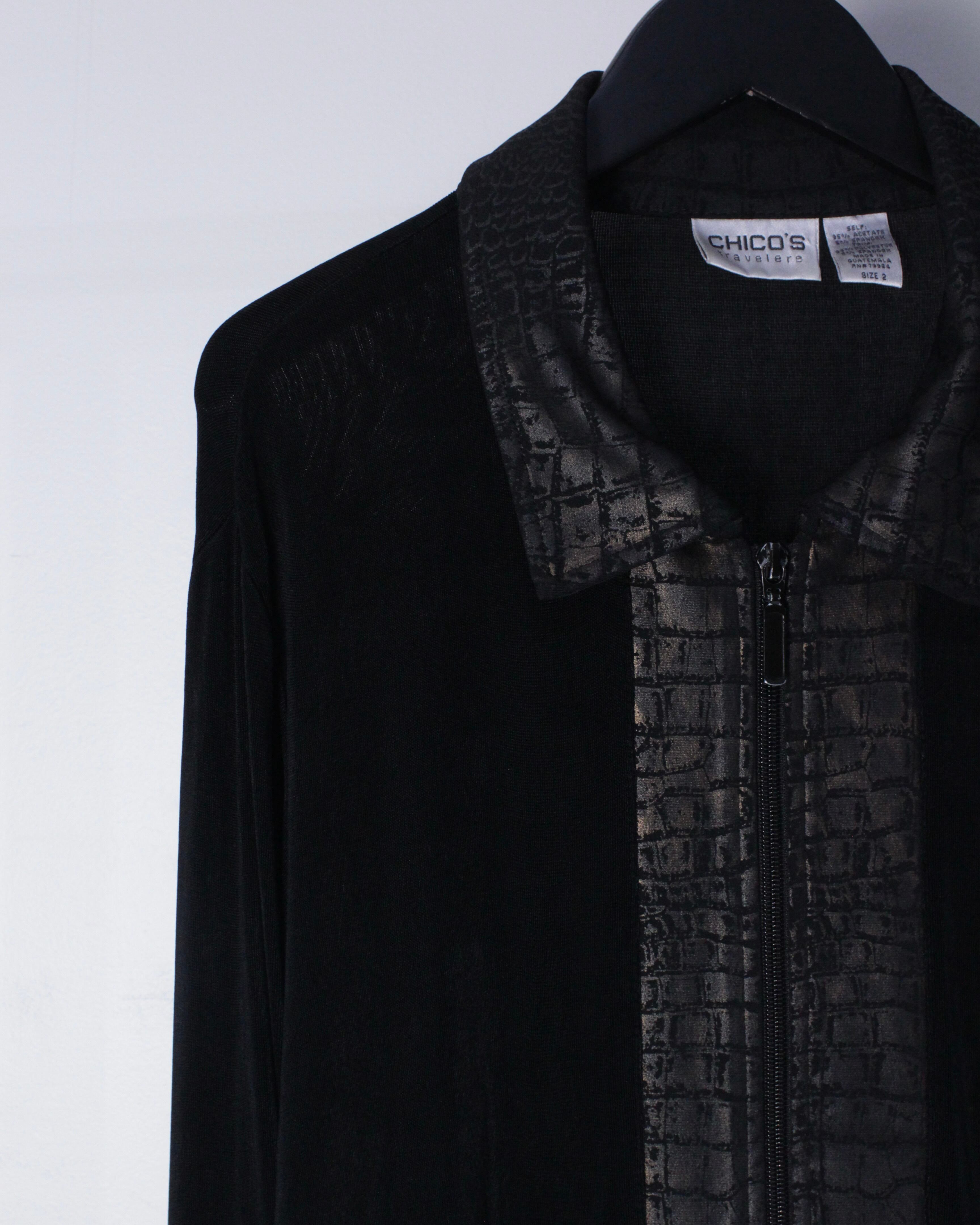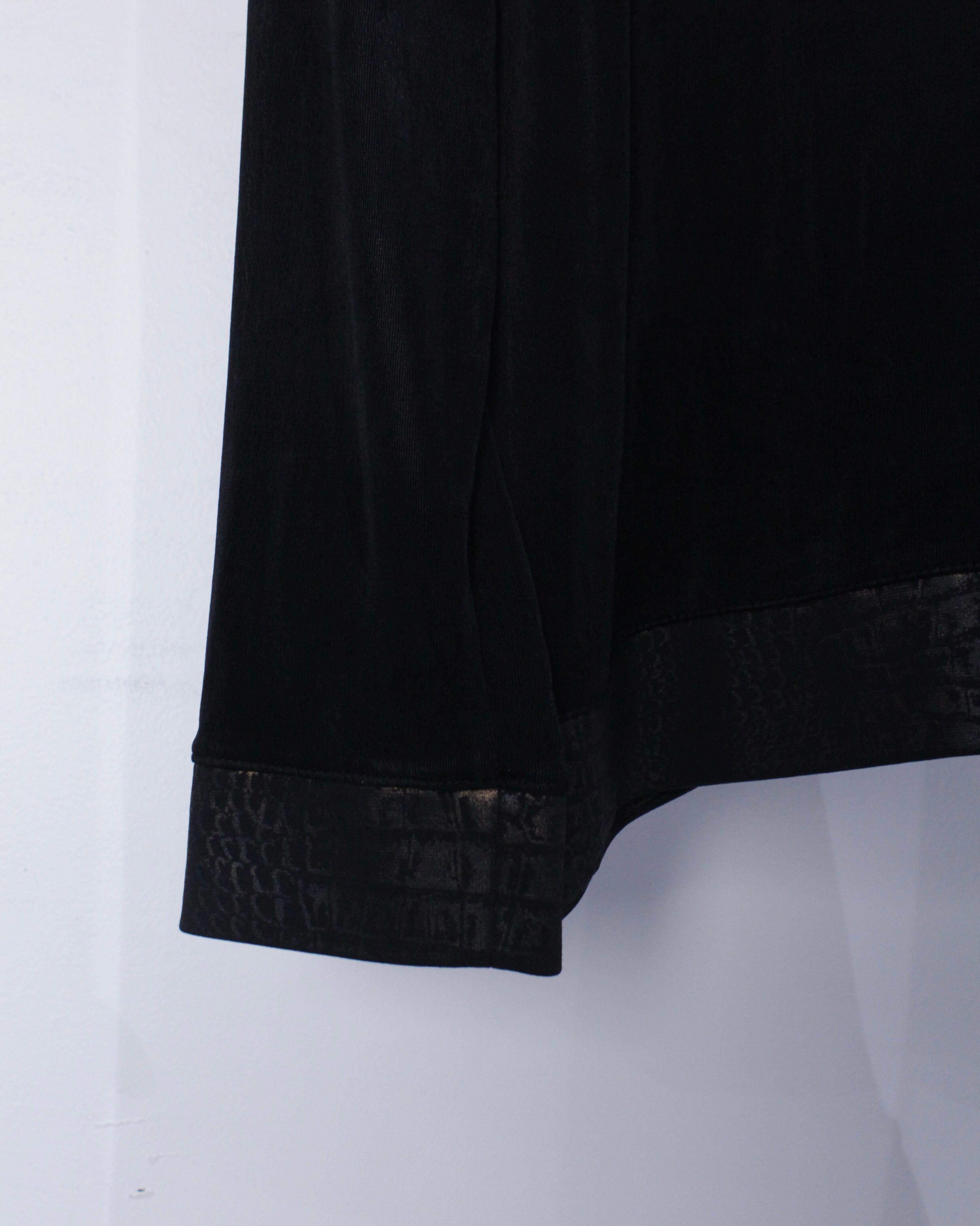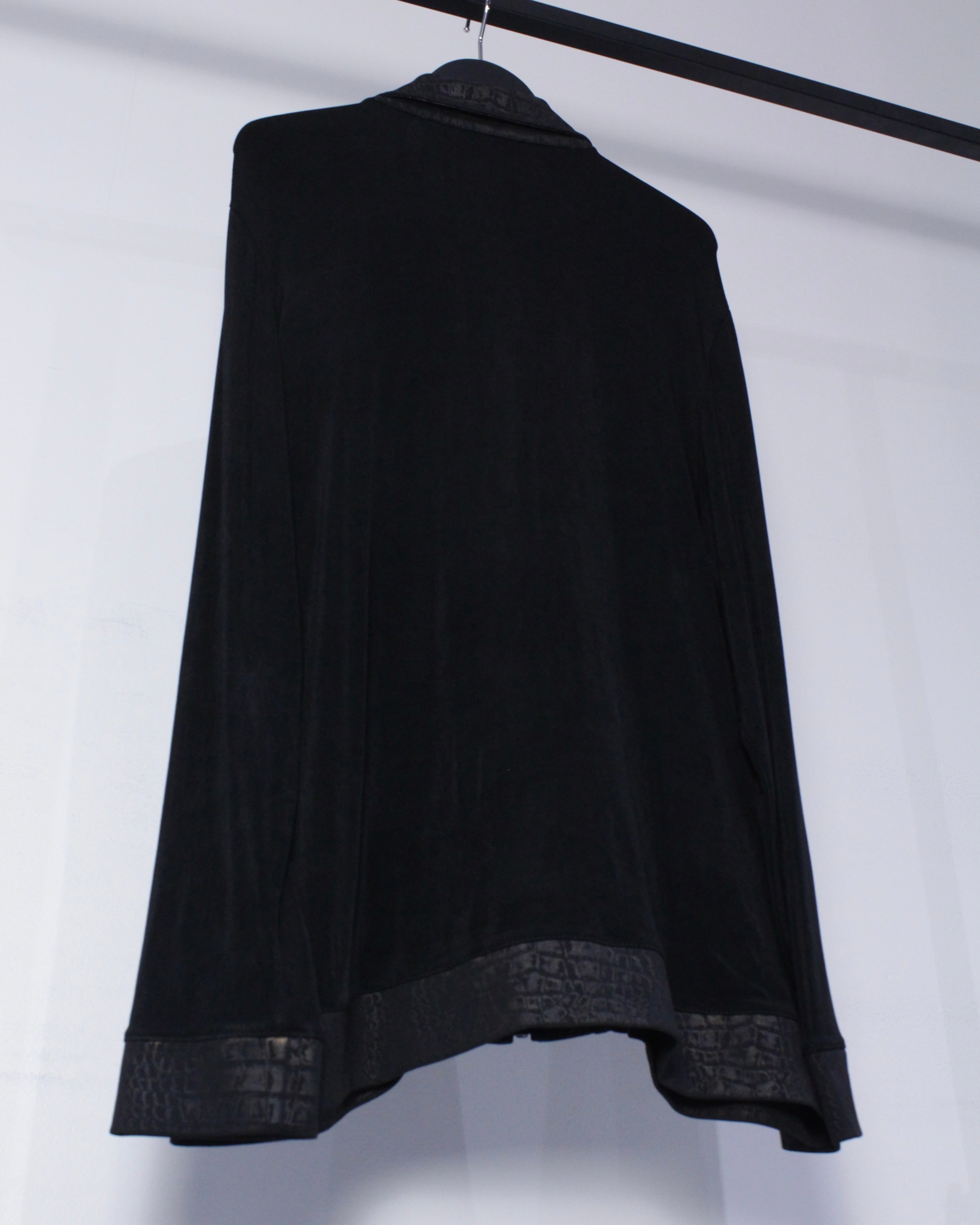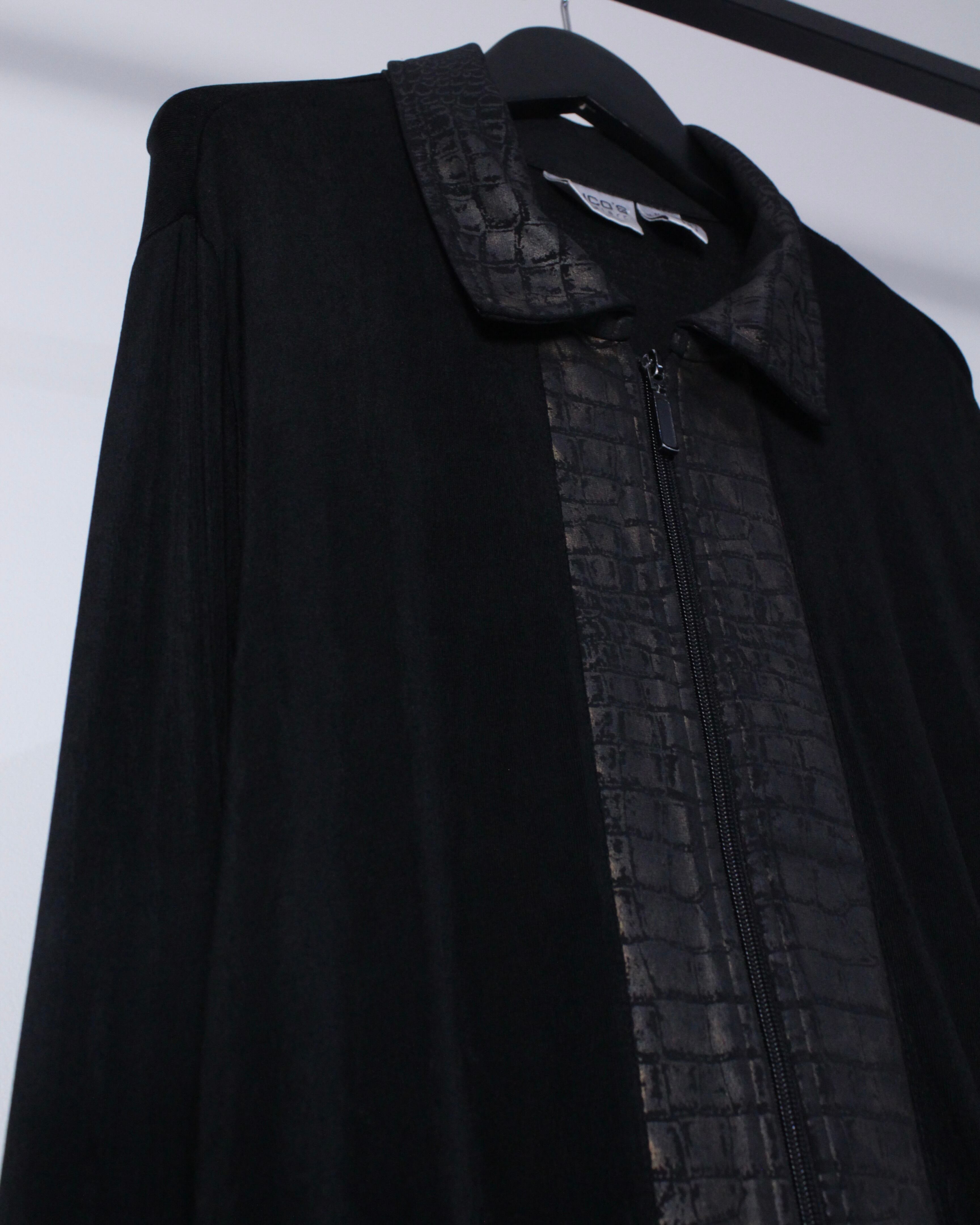 ブラックのボディをベースに、襟、フロント、裾にクロコダイル風の柄模様を切り替えたジップアップジャケット。