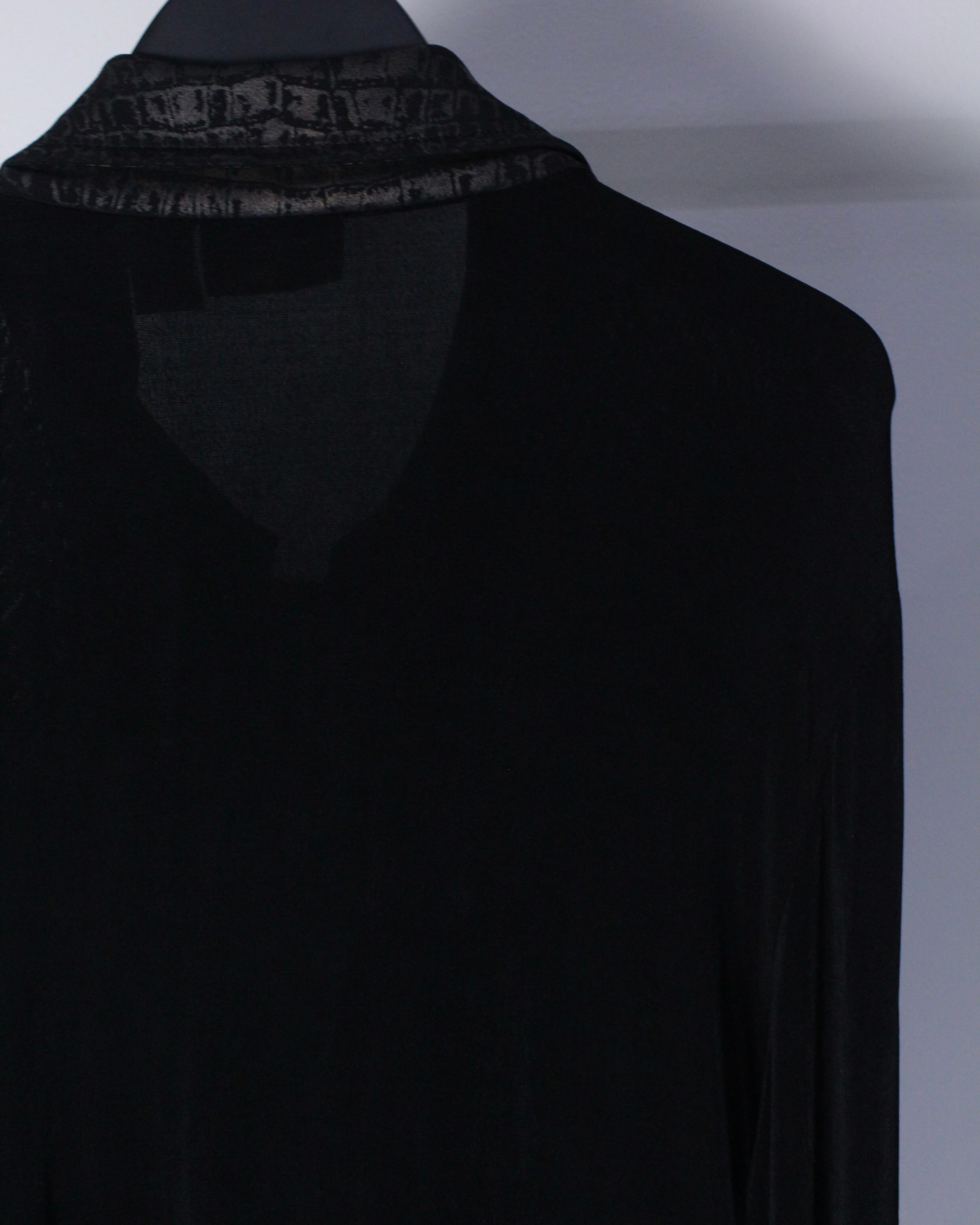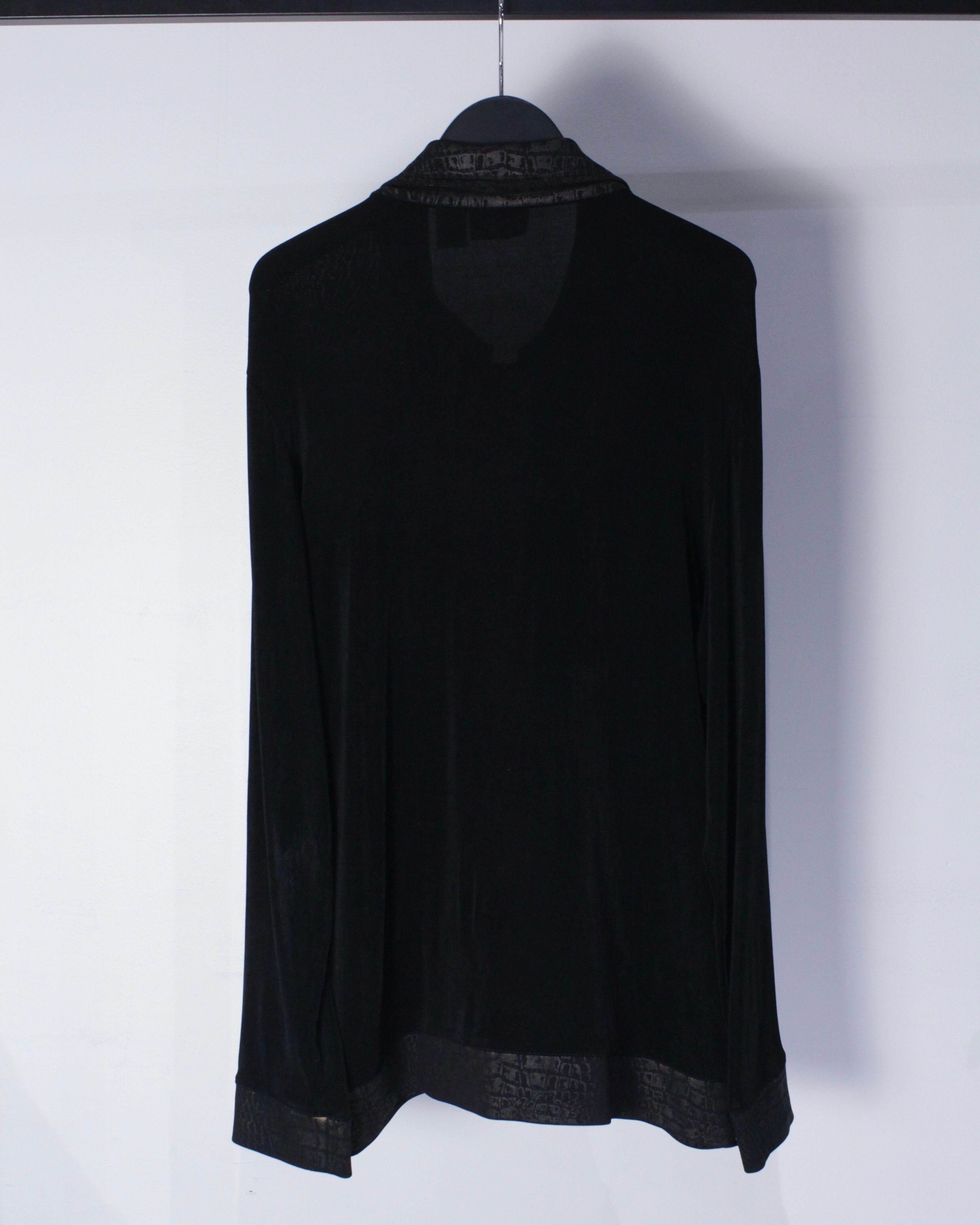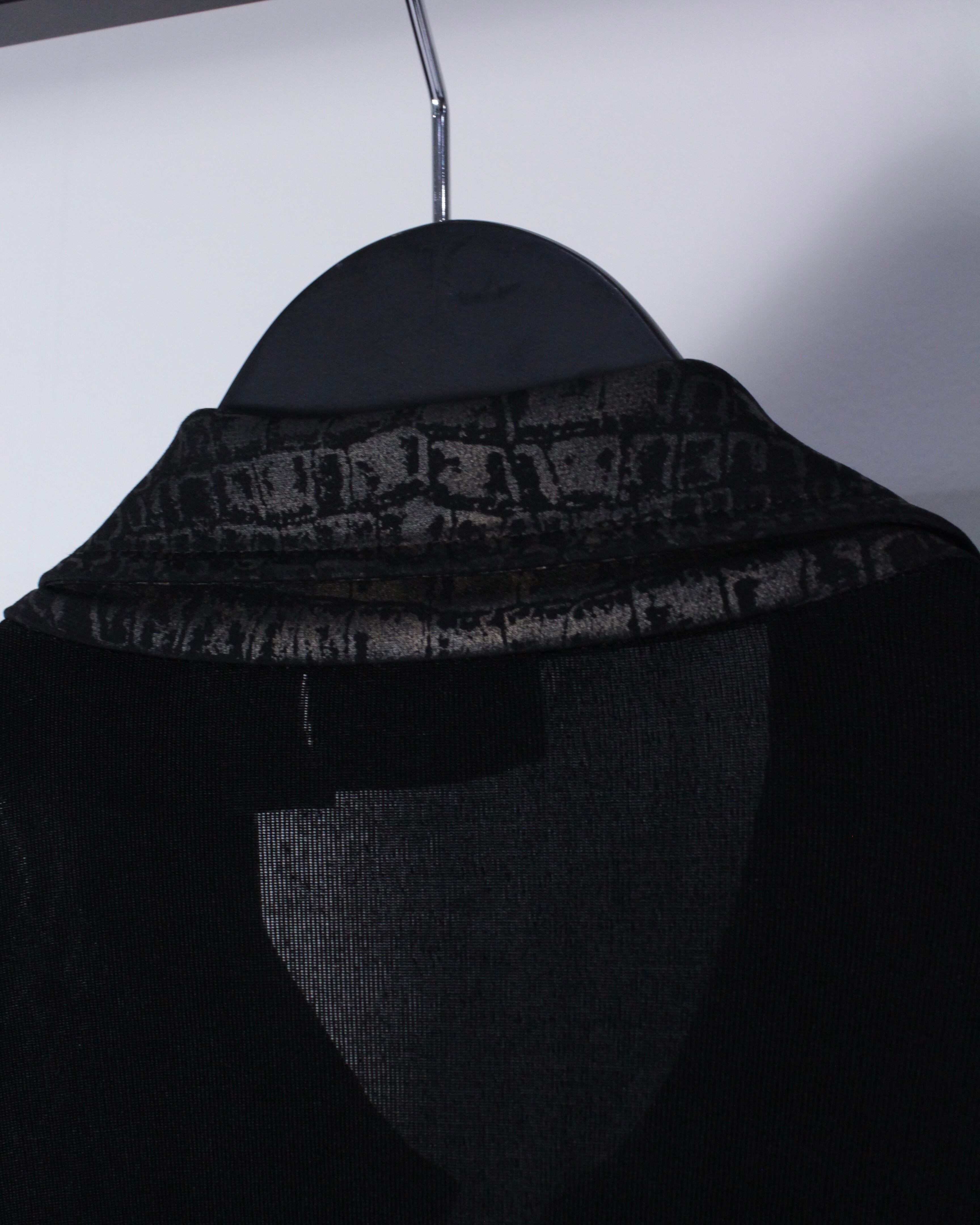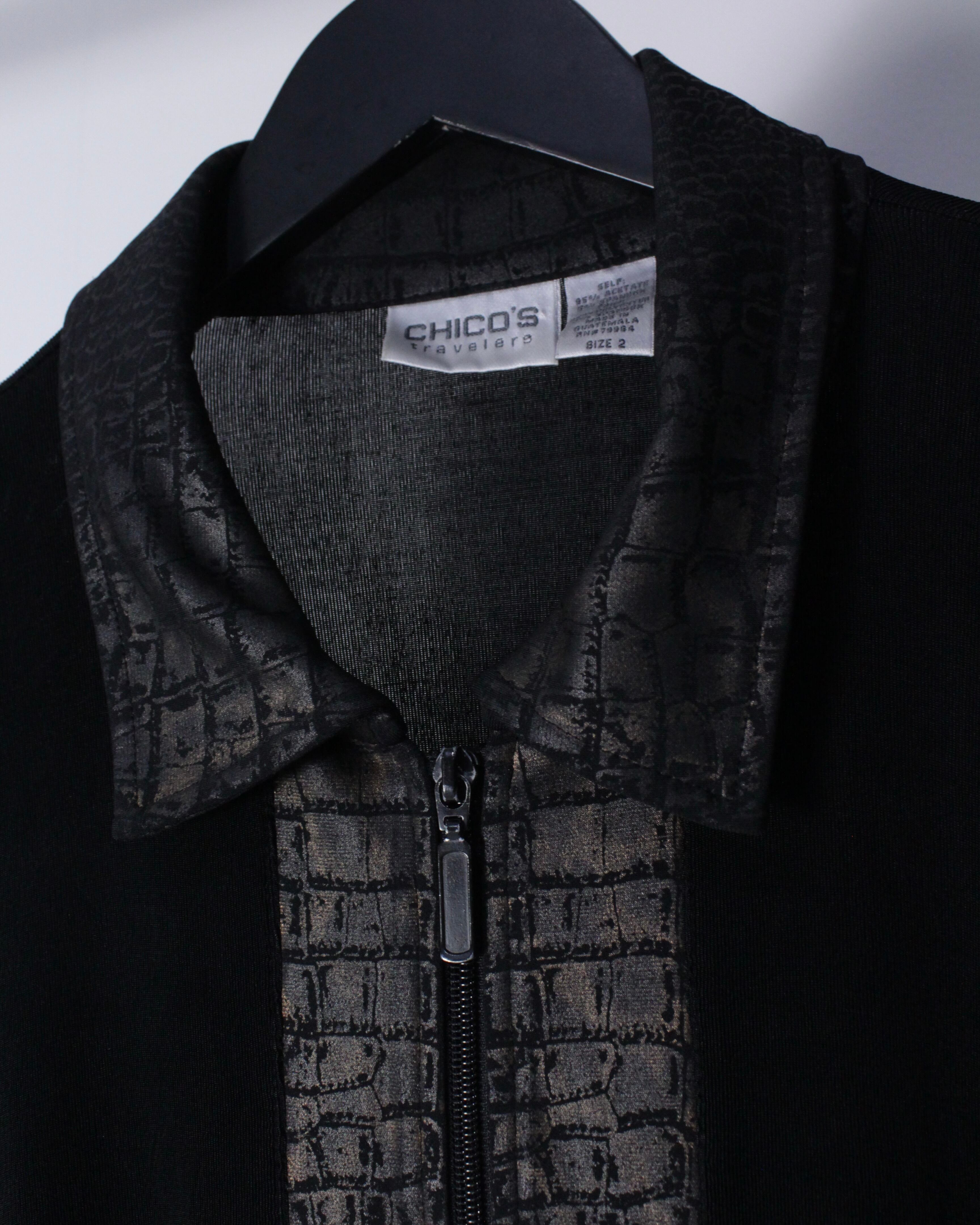ブラックのボディをベースに、襟、フロント、裾にクロコダイル風の柄模様を切り替えたジップアップジャケット。