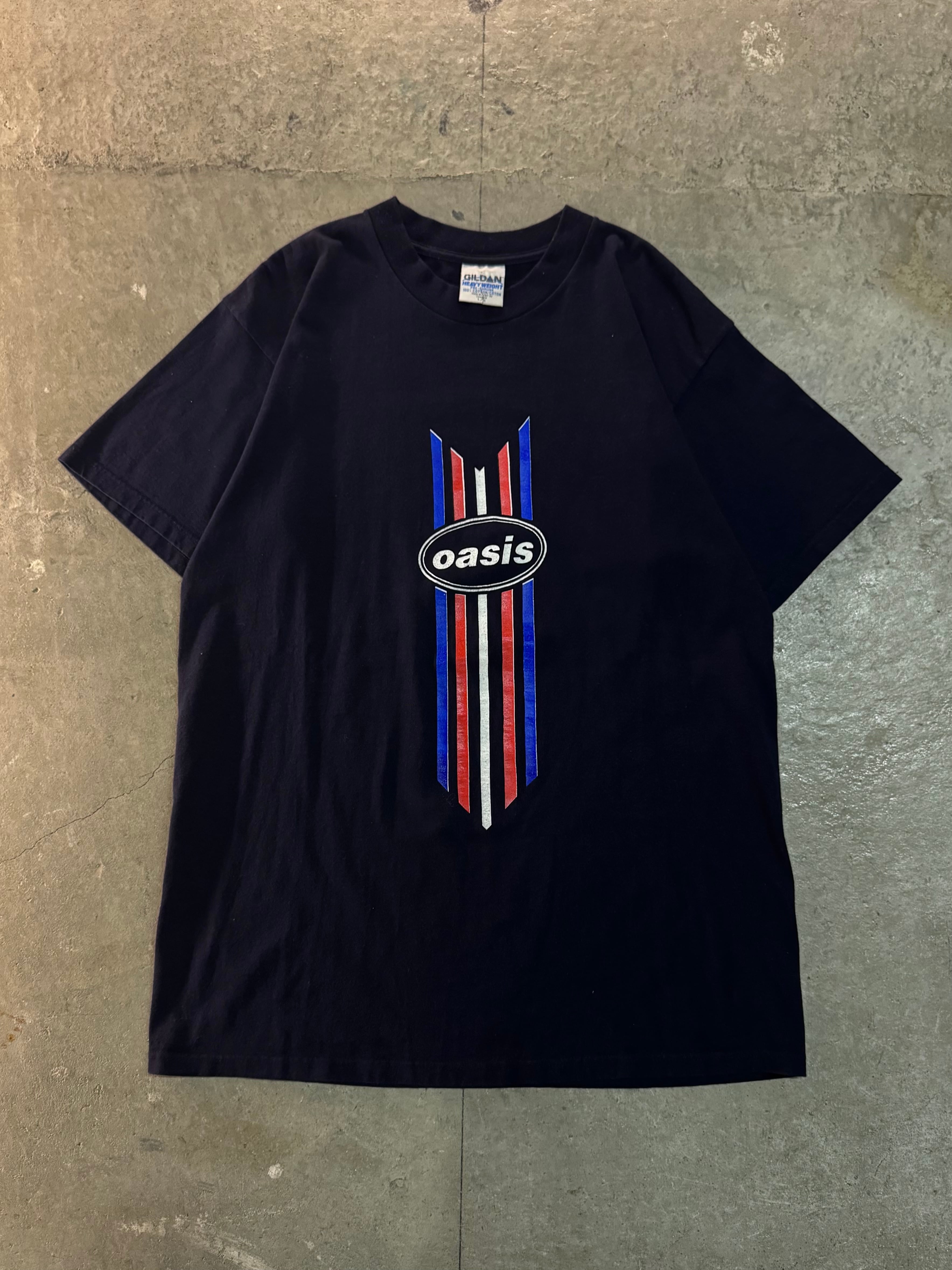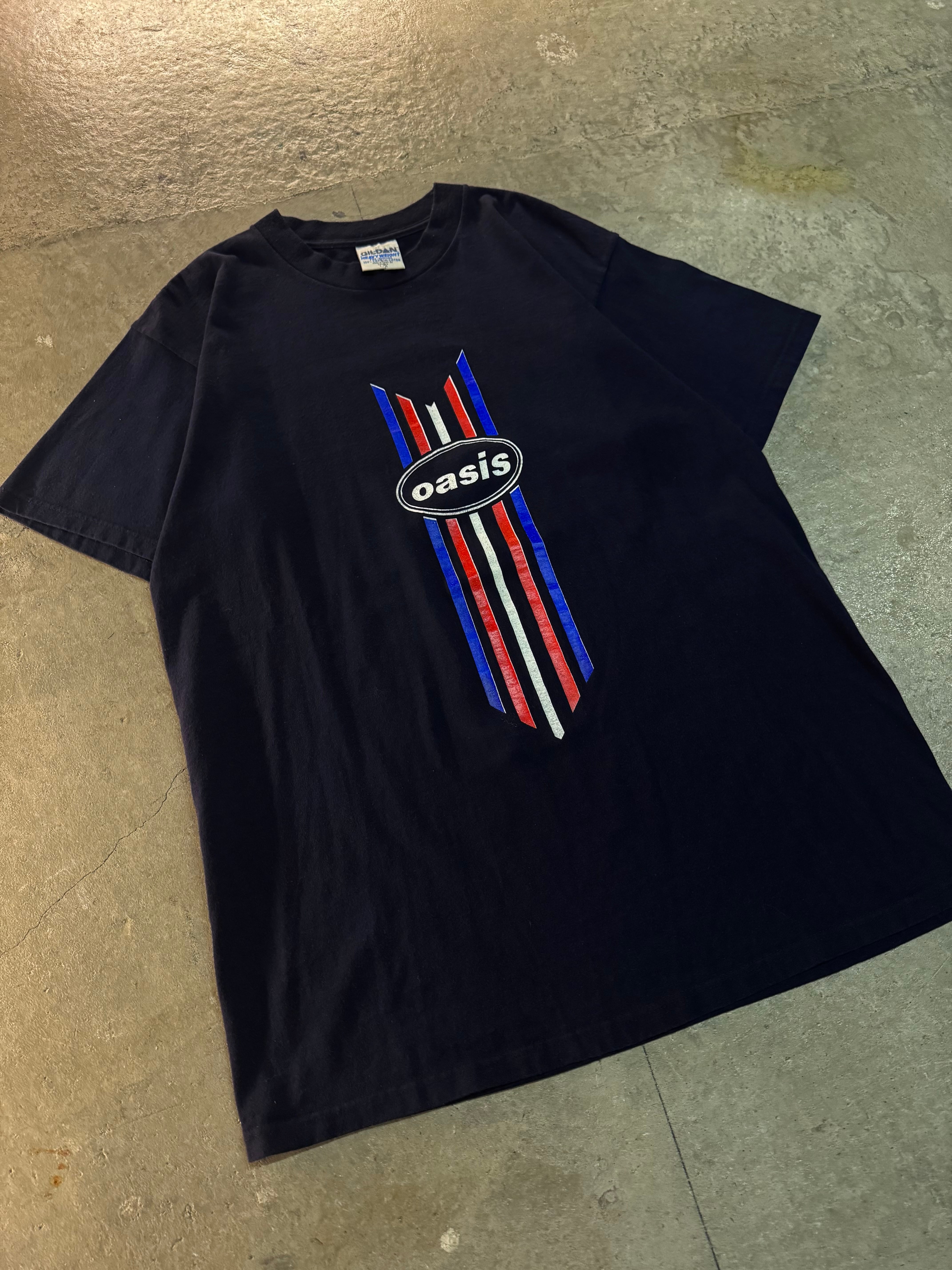 濃紺のボディにユニオンジャックの配色で縦線を走らせ、"Oasis"のロゴを中央にプリントしたTシャツ。