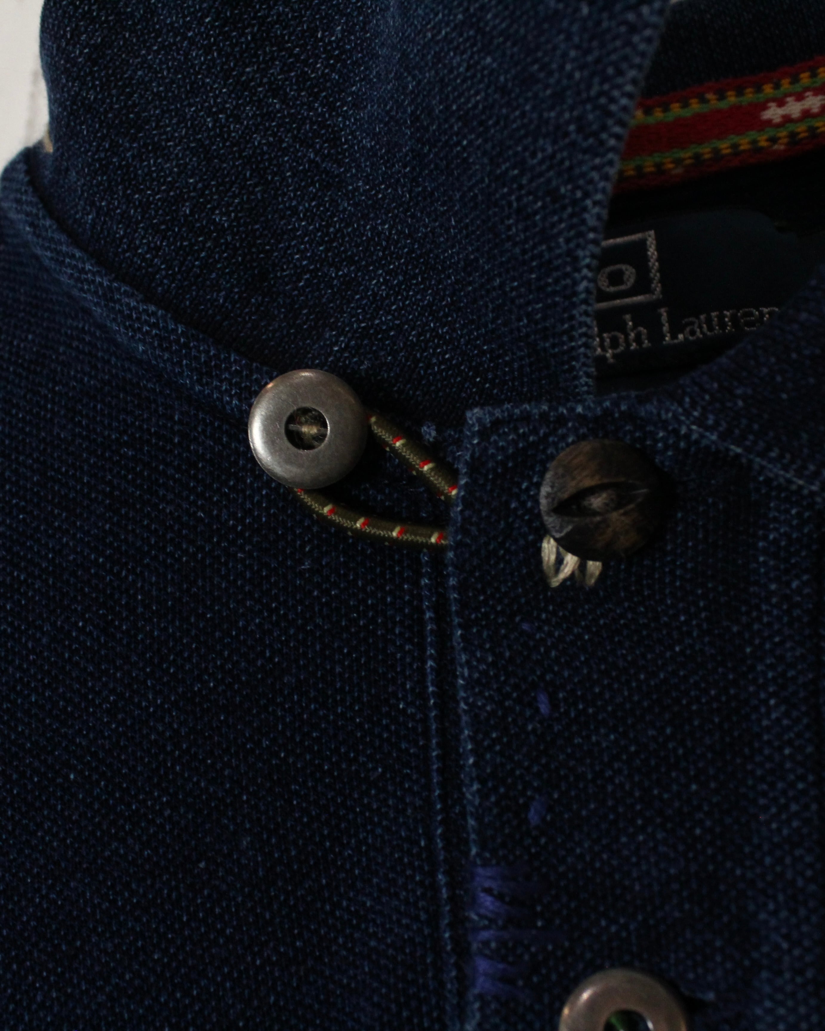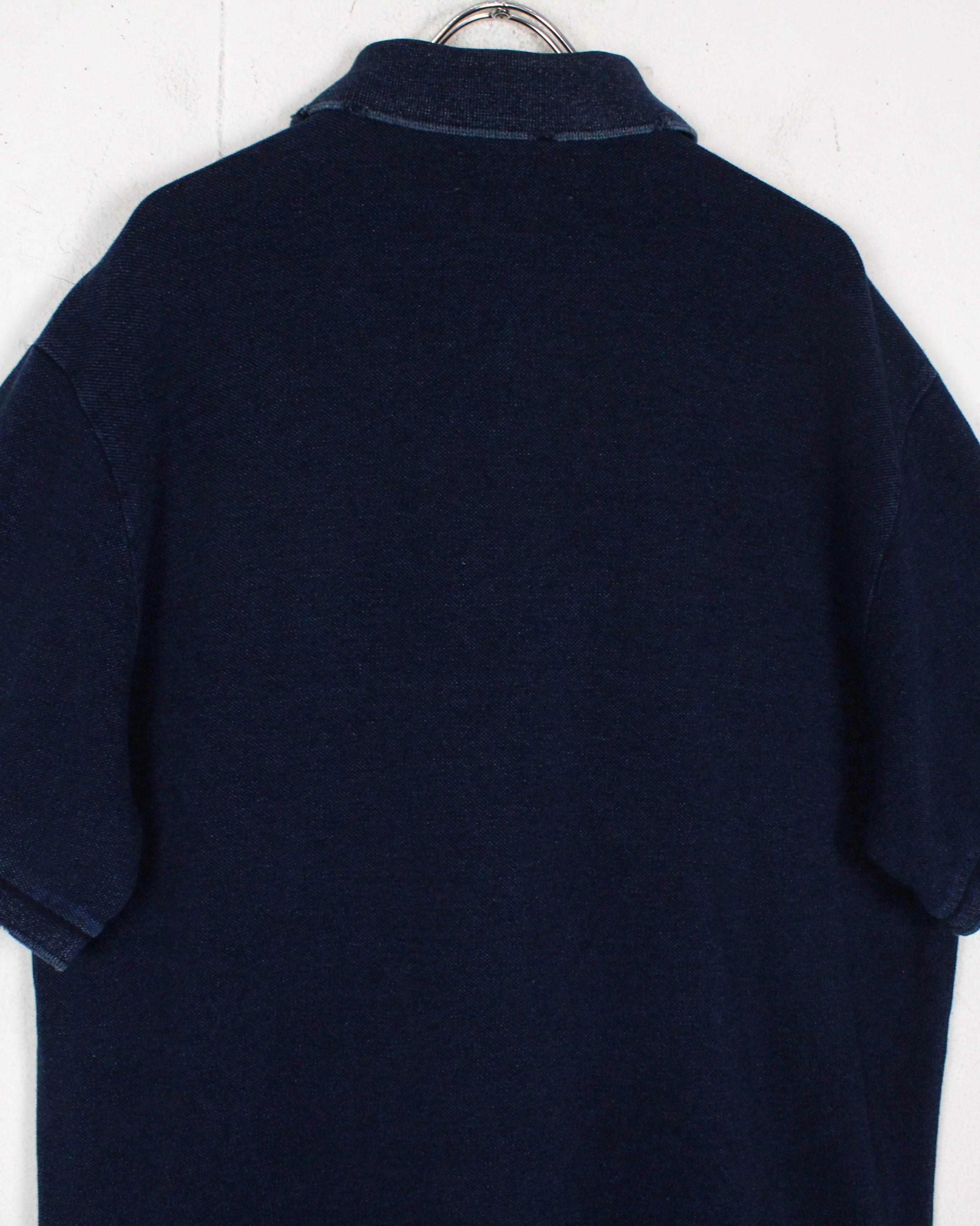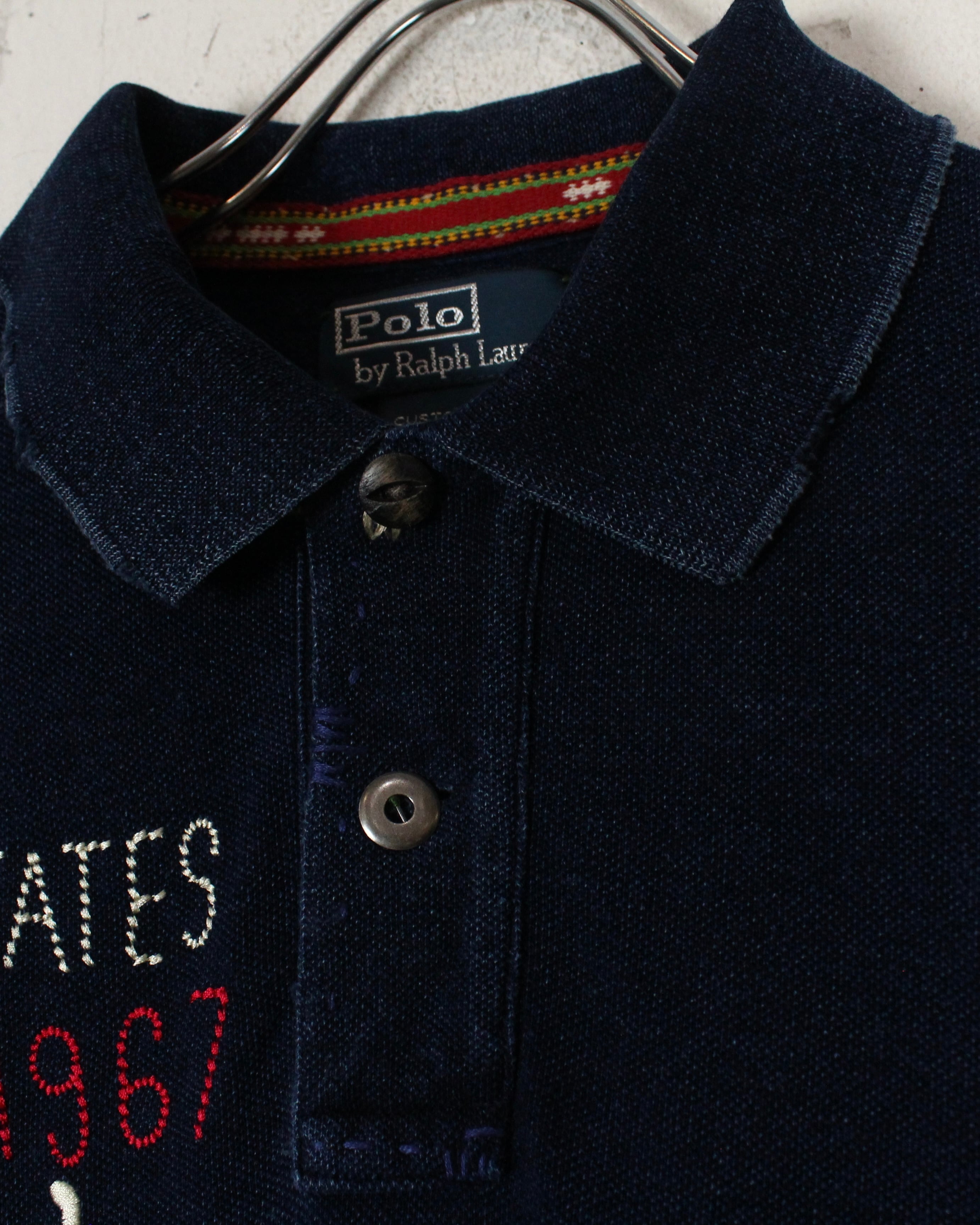 ボディの風合いに加え、襟や前開きに施されたダメージやリペア加工のデザインも相まって雰囲気増し増し。首元のボタンにはメタルボタンを採用するなど、ラルフならではの造り込みのクオリティの高さが随所のディテールに垣間見えます。
