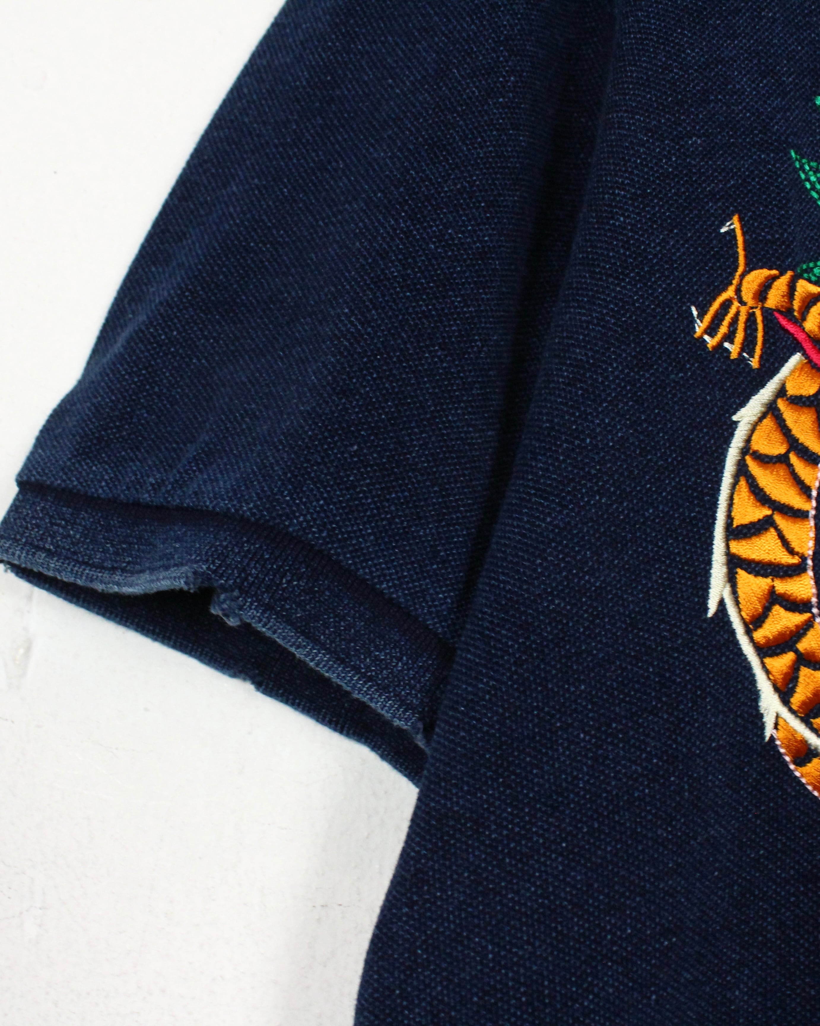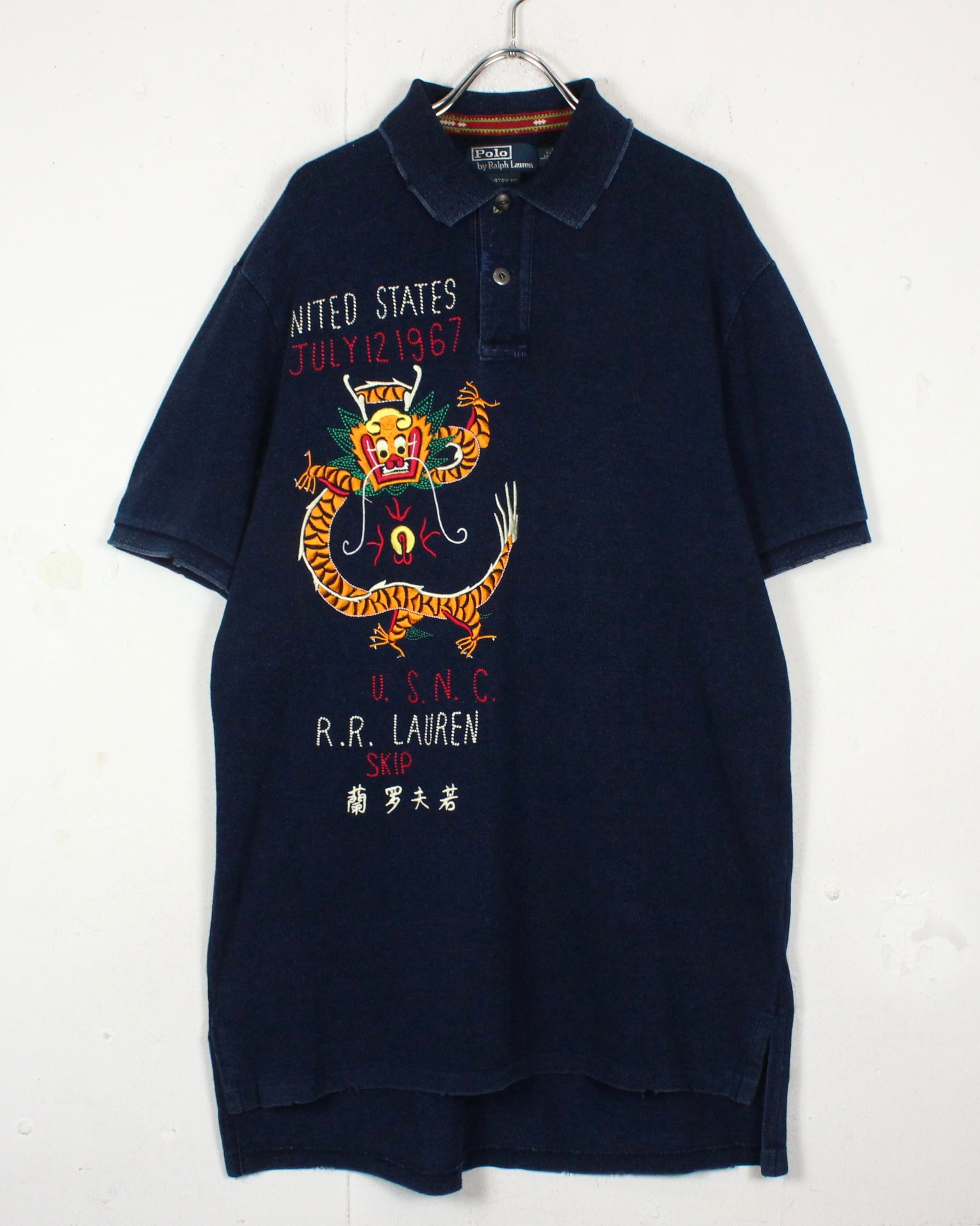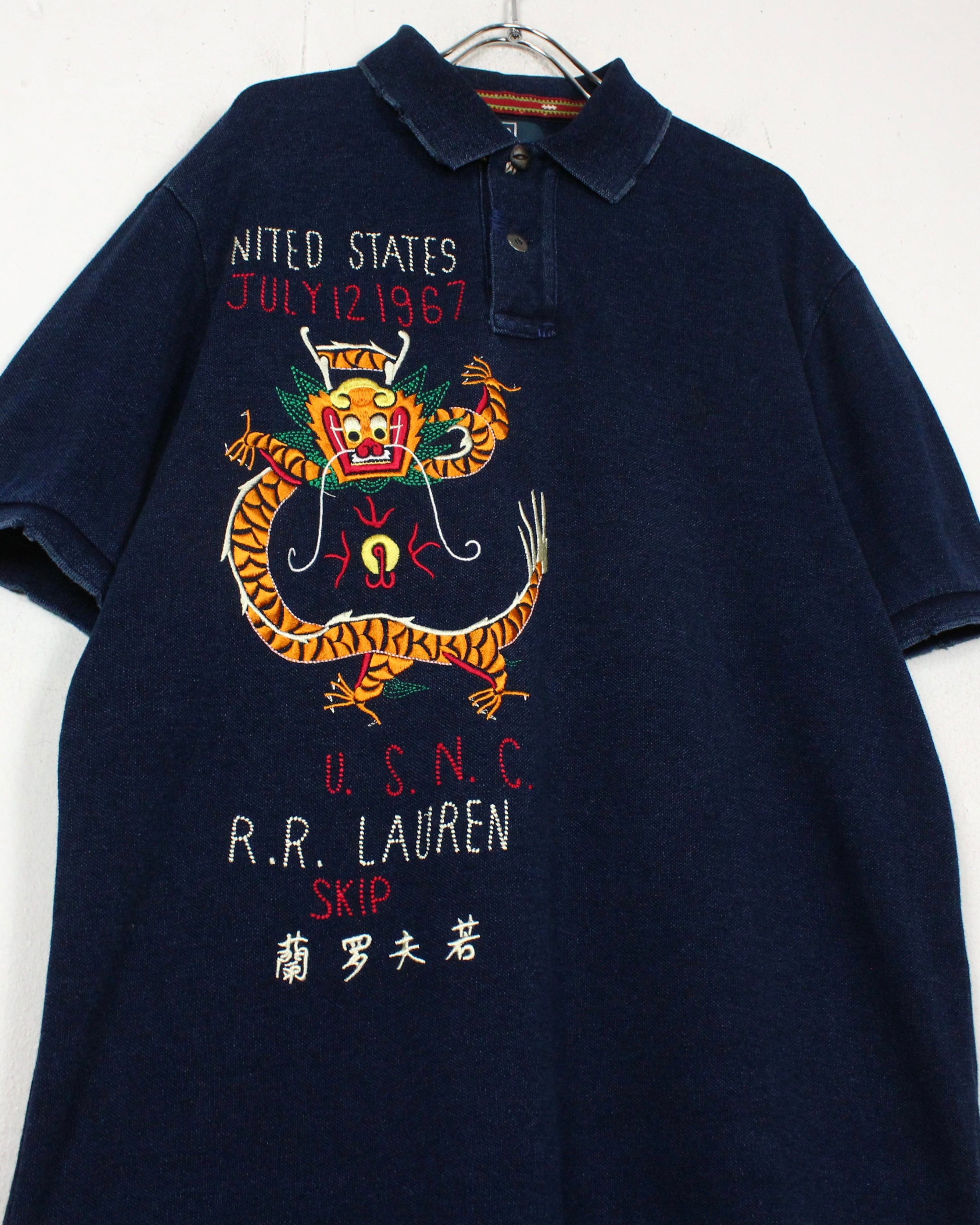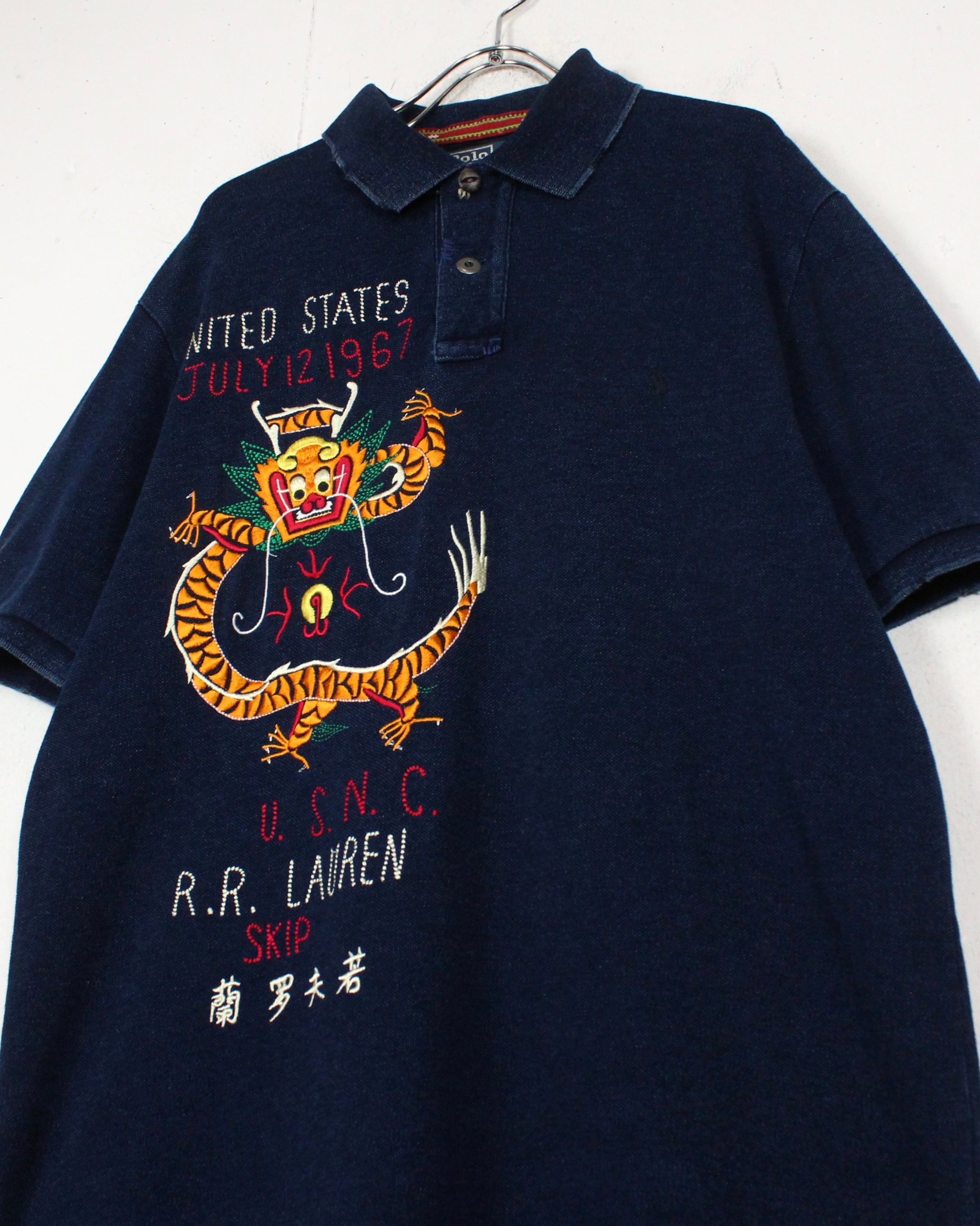 インディゴ染めによって仕上げられた、深みのある表情を見せる鹿の子生地をボディに使用し、スーベニア風のオリエンタルな龍の刺繍を刻み込んだ1着。