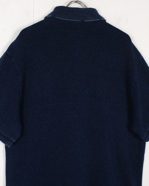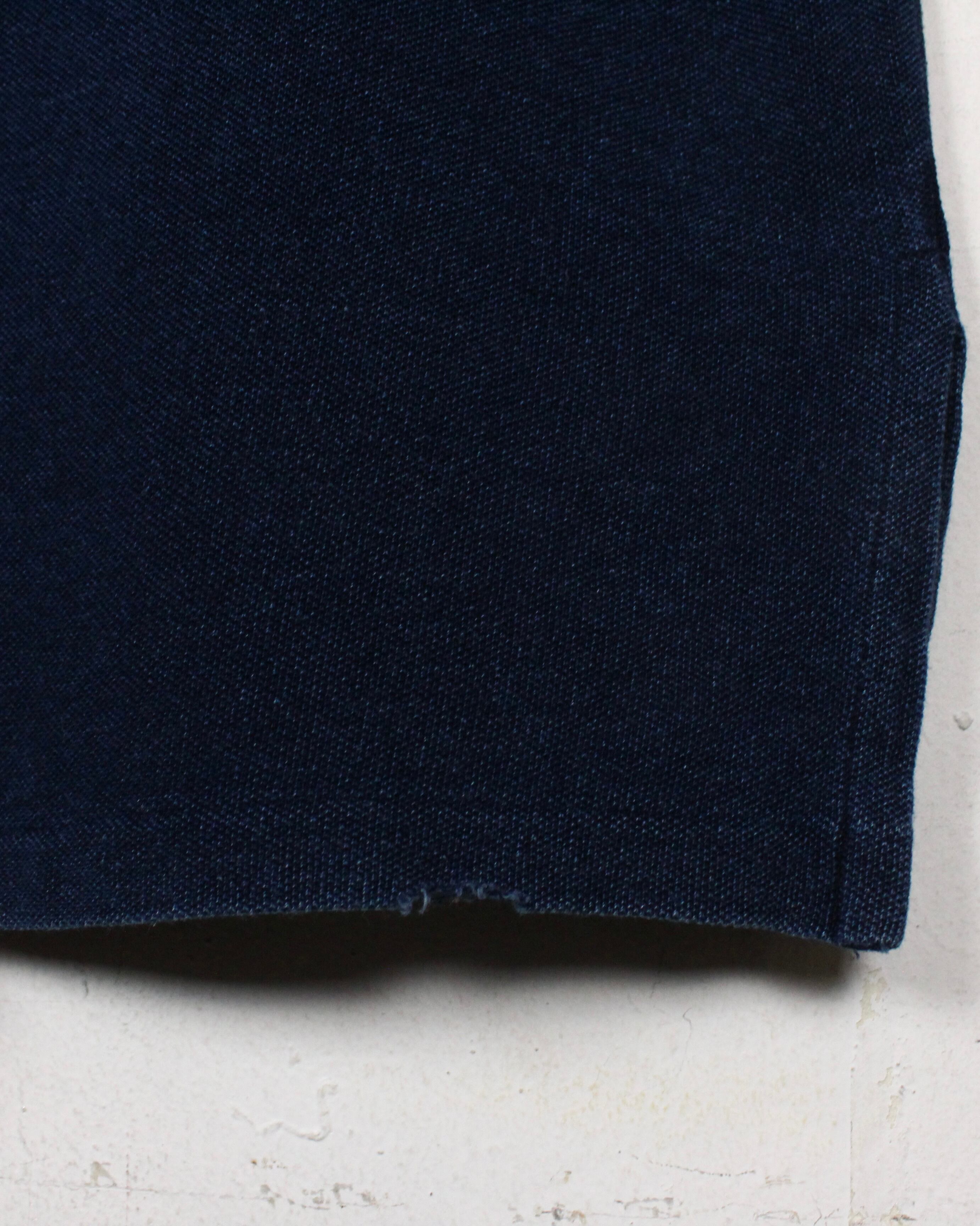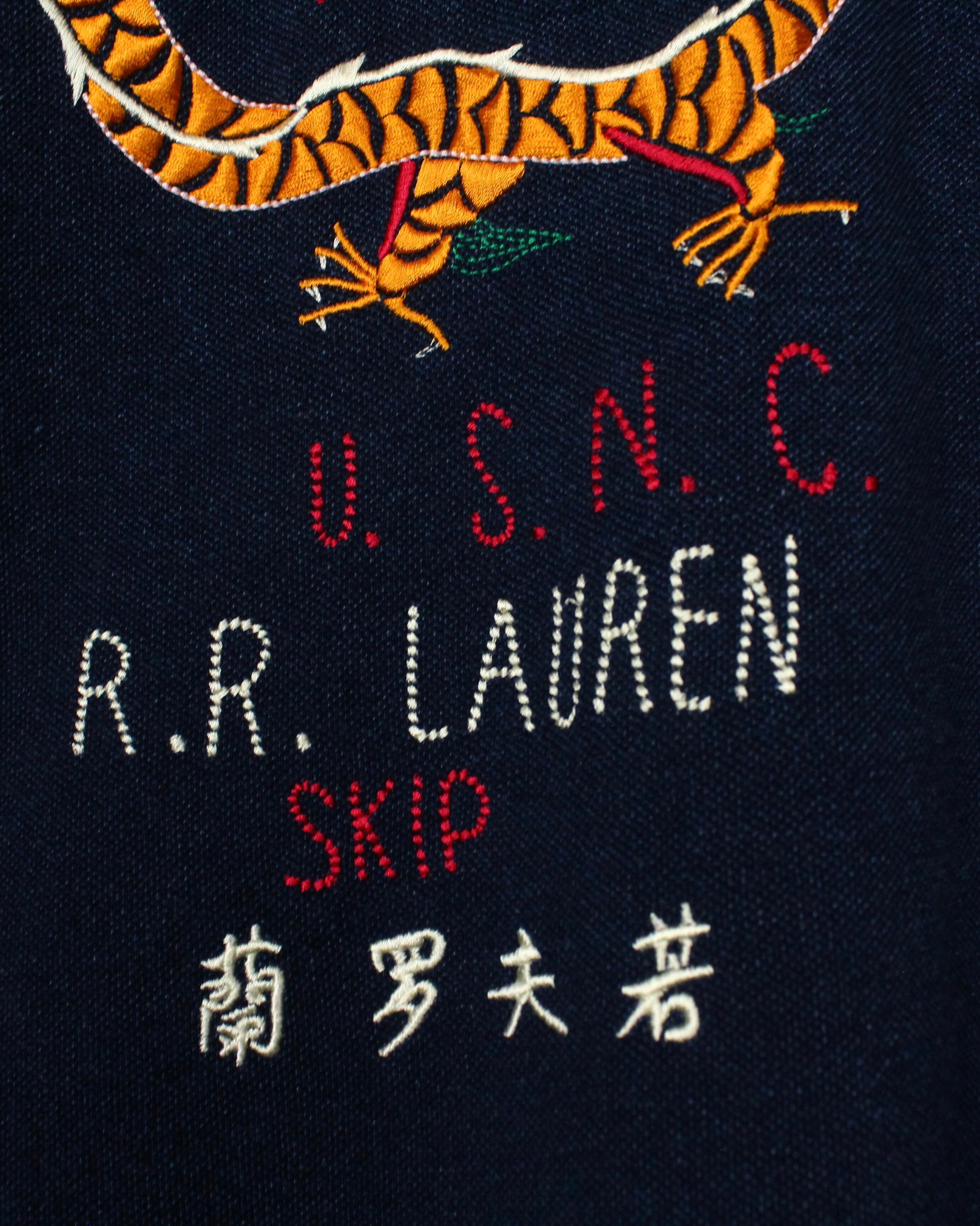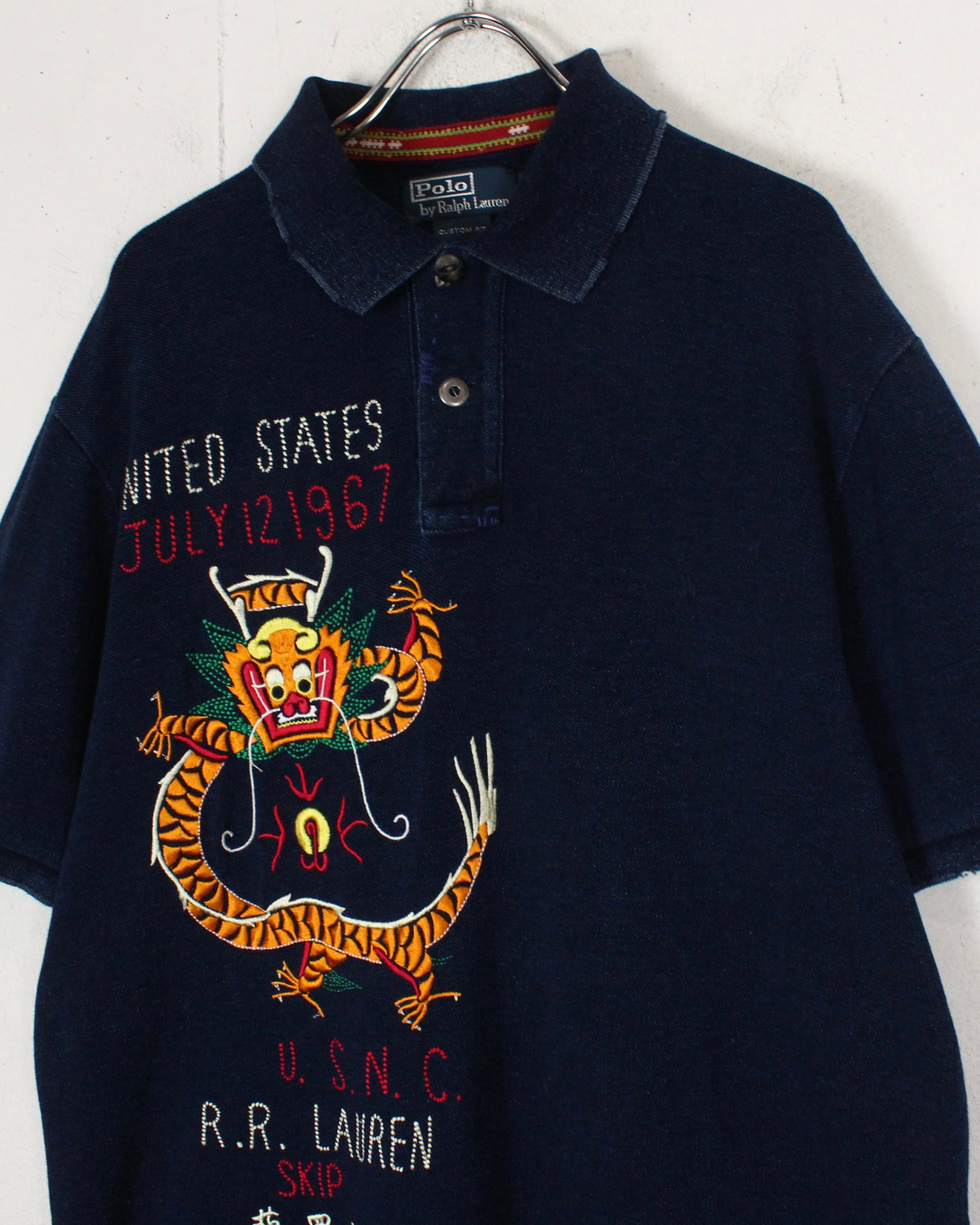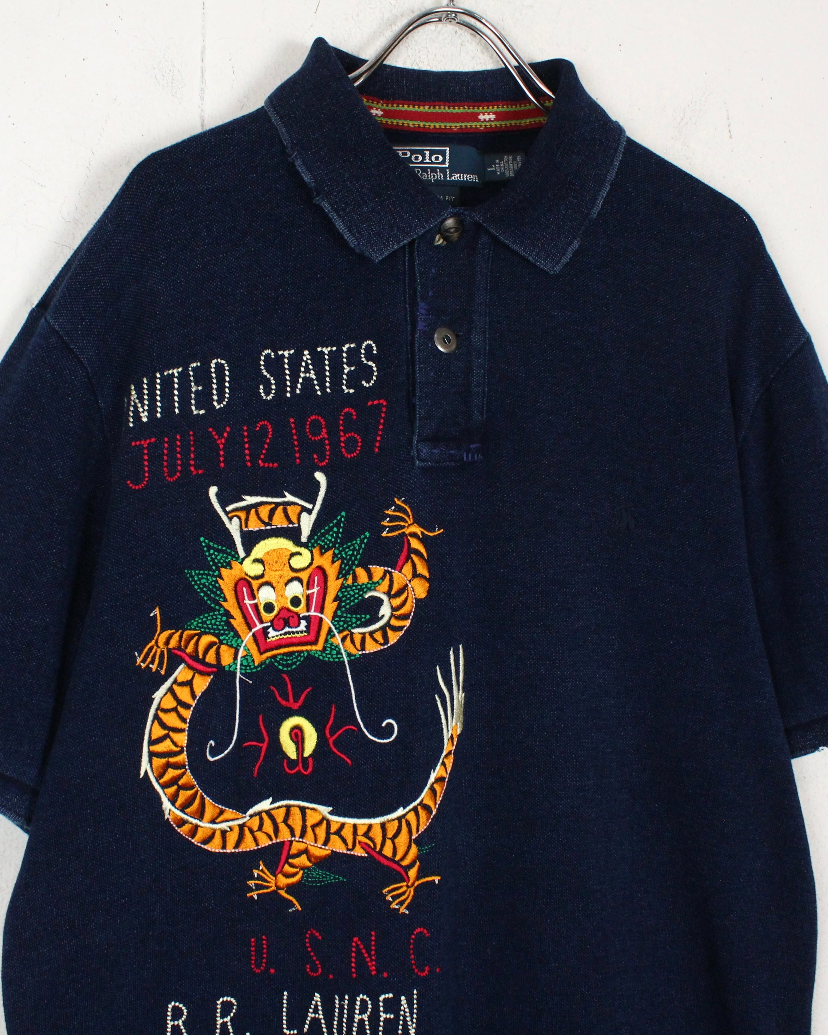 インディゴ染めによって仕上げられた、深みのある表情を見せる鹿の子生地をボディに使用し、スーベニア風のオリエンタルな龍の刺繍を刻み込んだ1着。