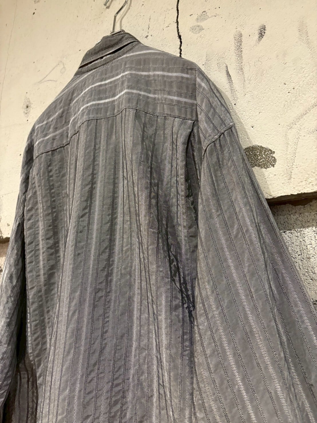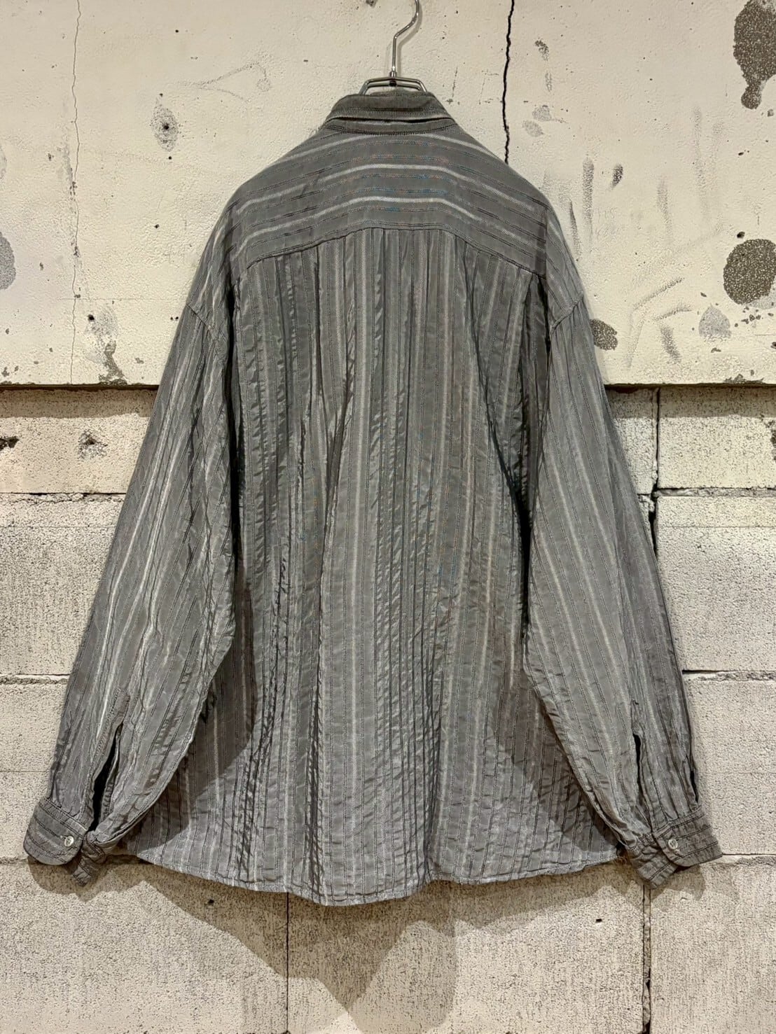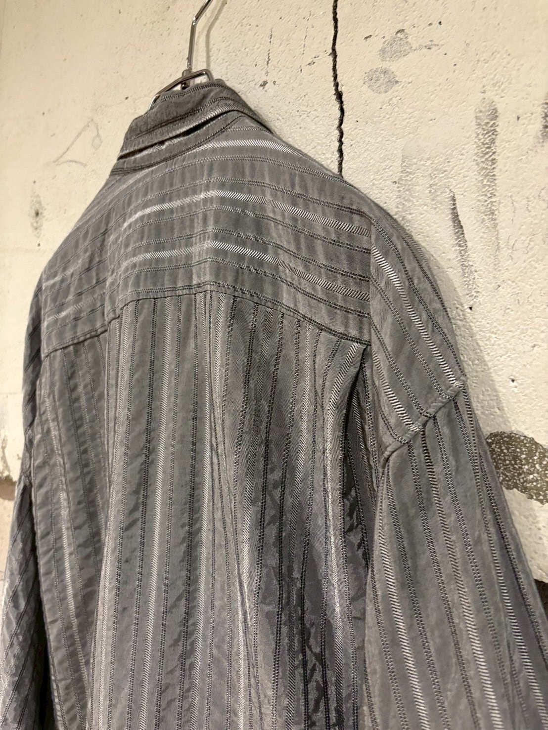 微光沢を放つメタリックなシルバーのボディにストライプを載せたイタリーメイドの長袖シャツ。