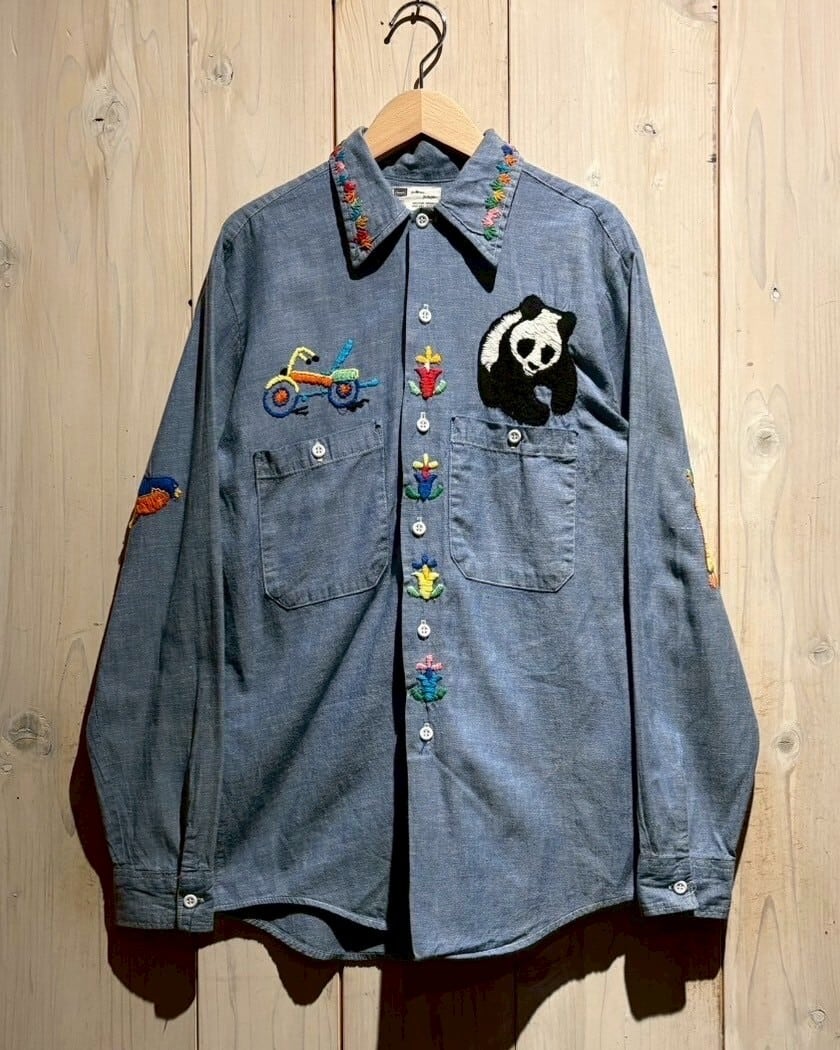 肌触りの柔らかな生地を用いたボディに、パンダや花、鳥、太陽などの刺繍が刻まれた長袖シャツ。