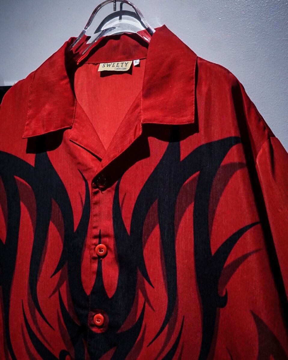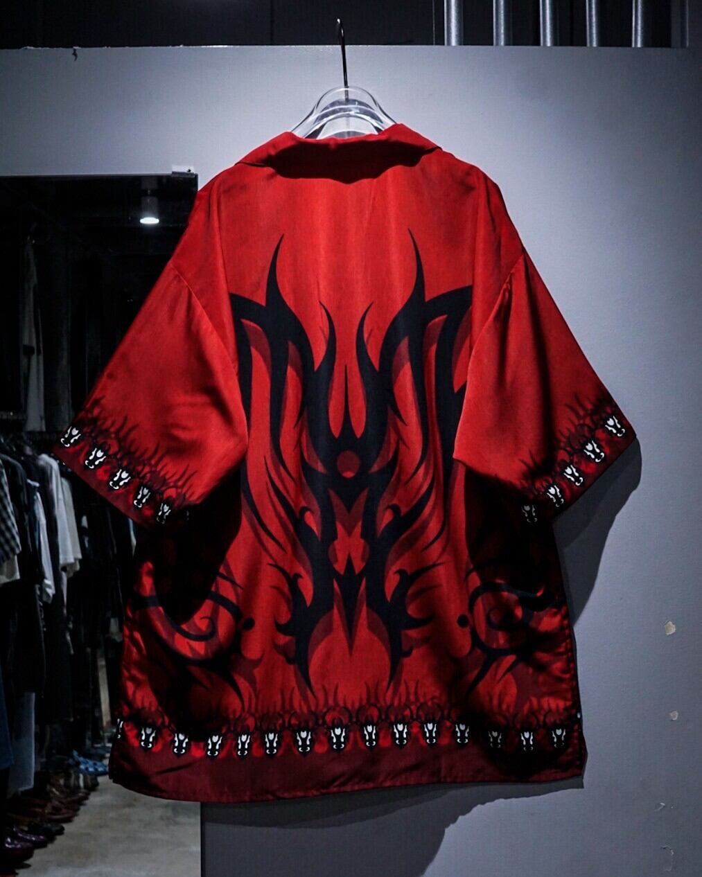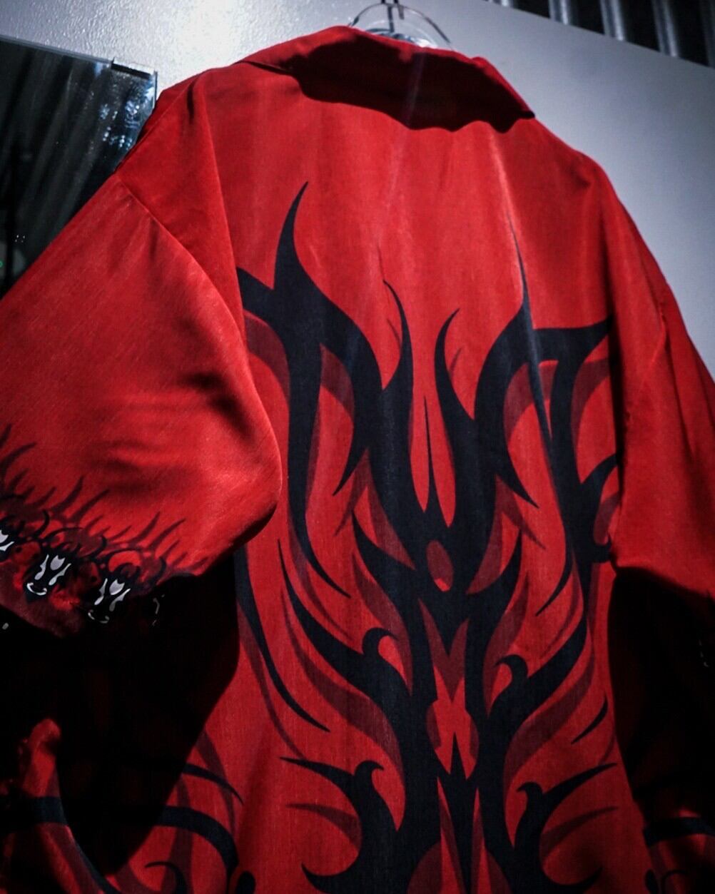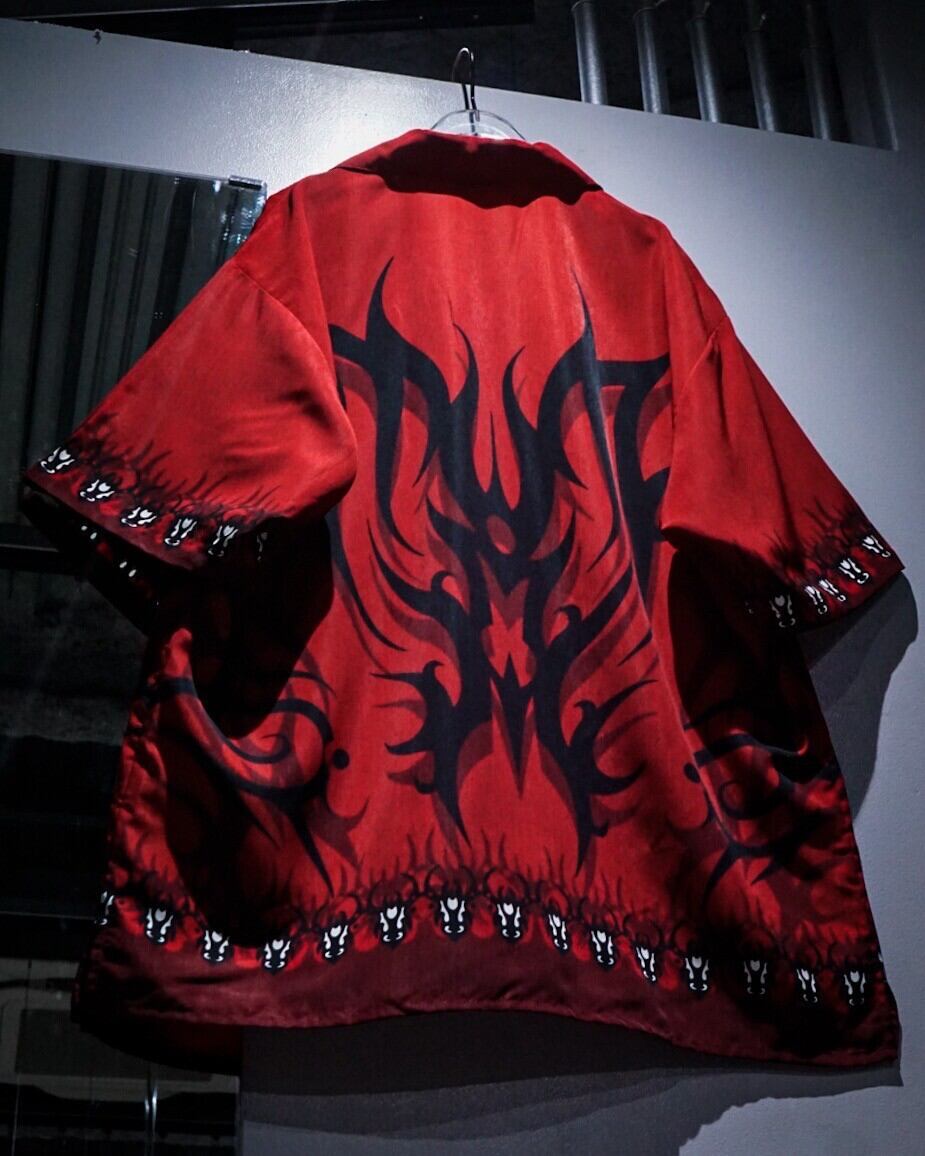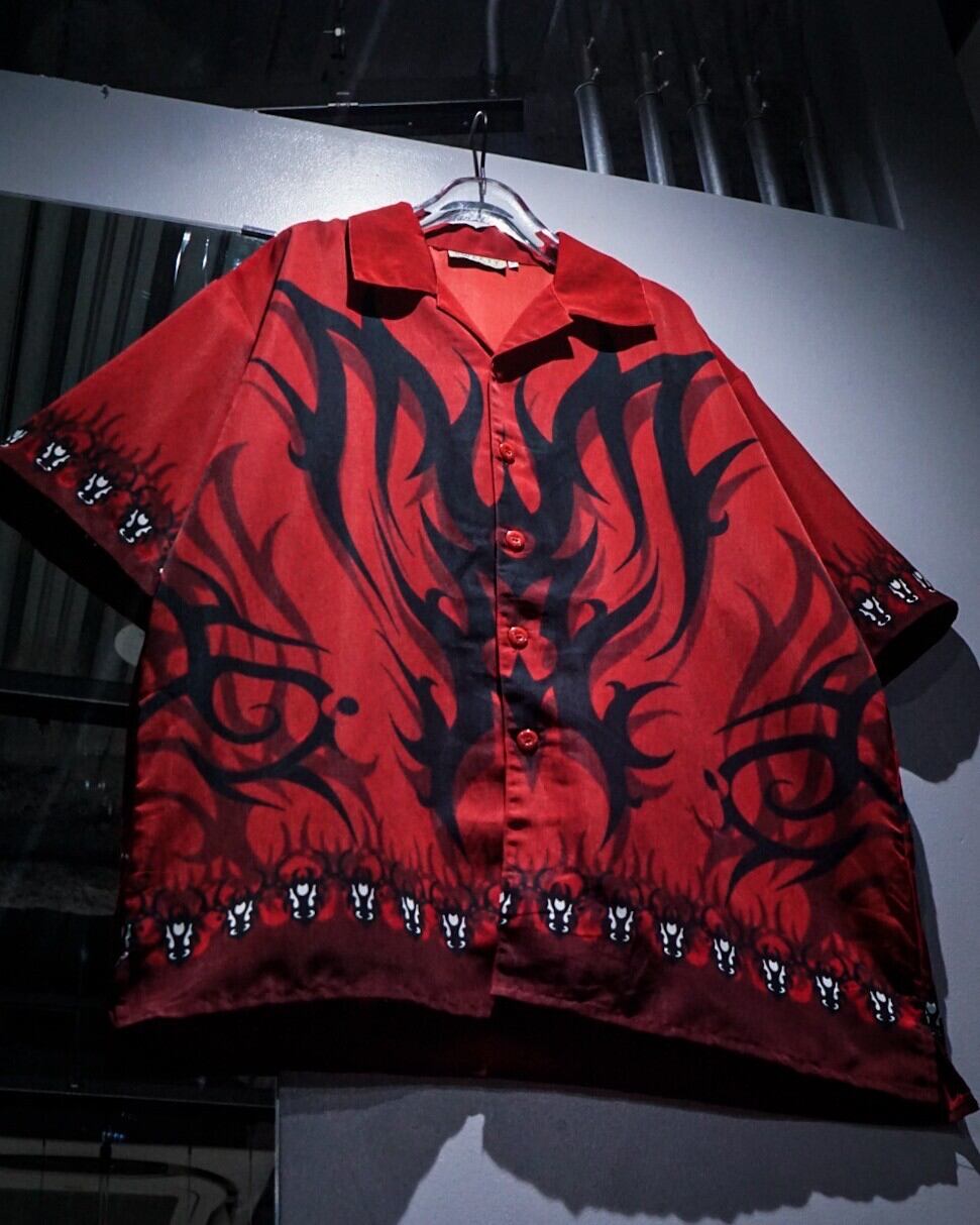 赤×黒の配色をベースに、トライバルパターンをボディ全面に載せた半袖オープンカラーシャツ。