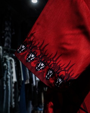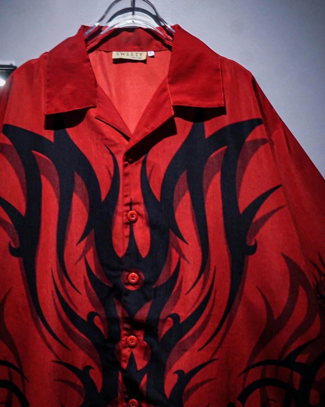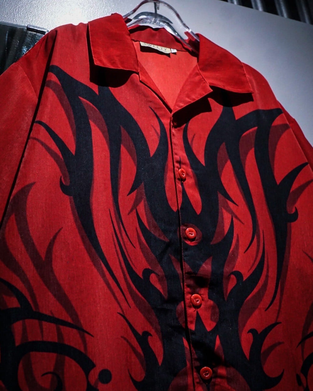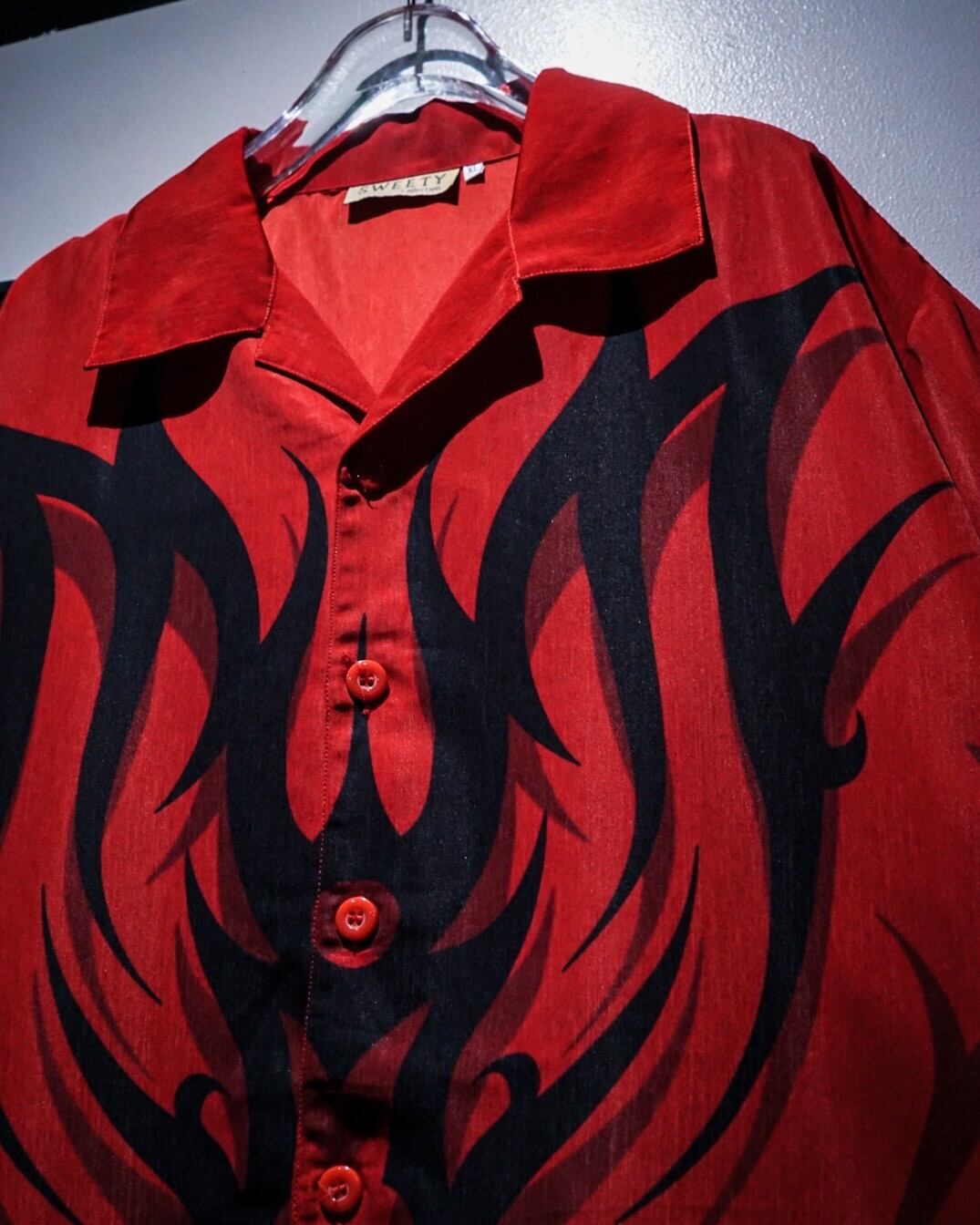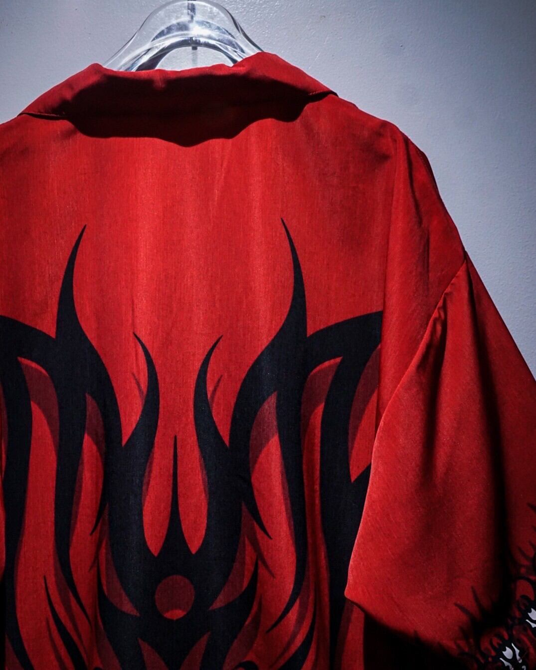 赤×黒の配色をベースに、トライバルパターンをボディ全面に載せた半袖オープンカラーシャツ。
