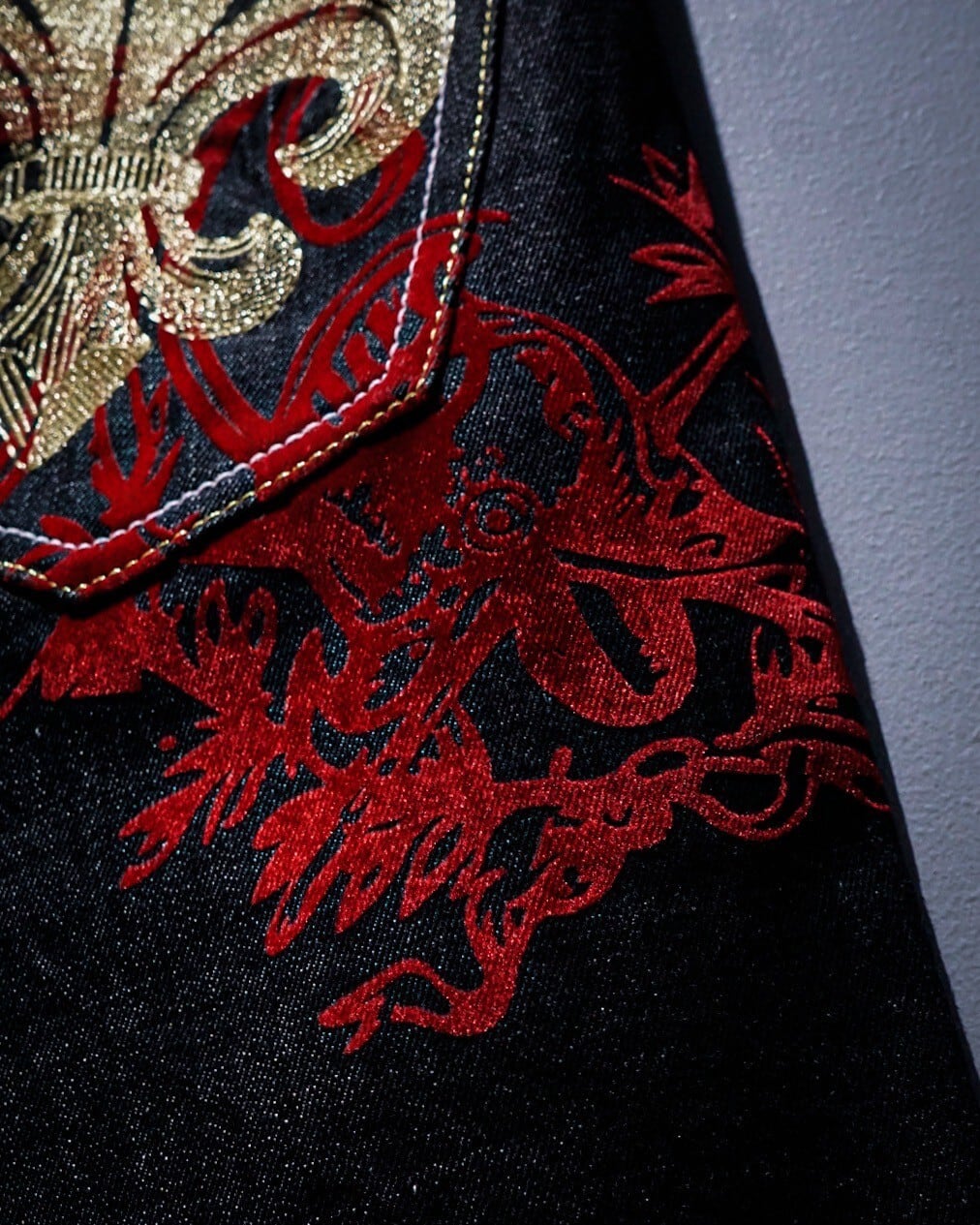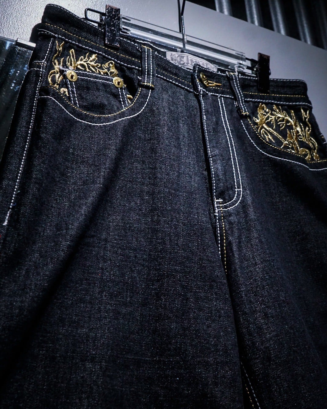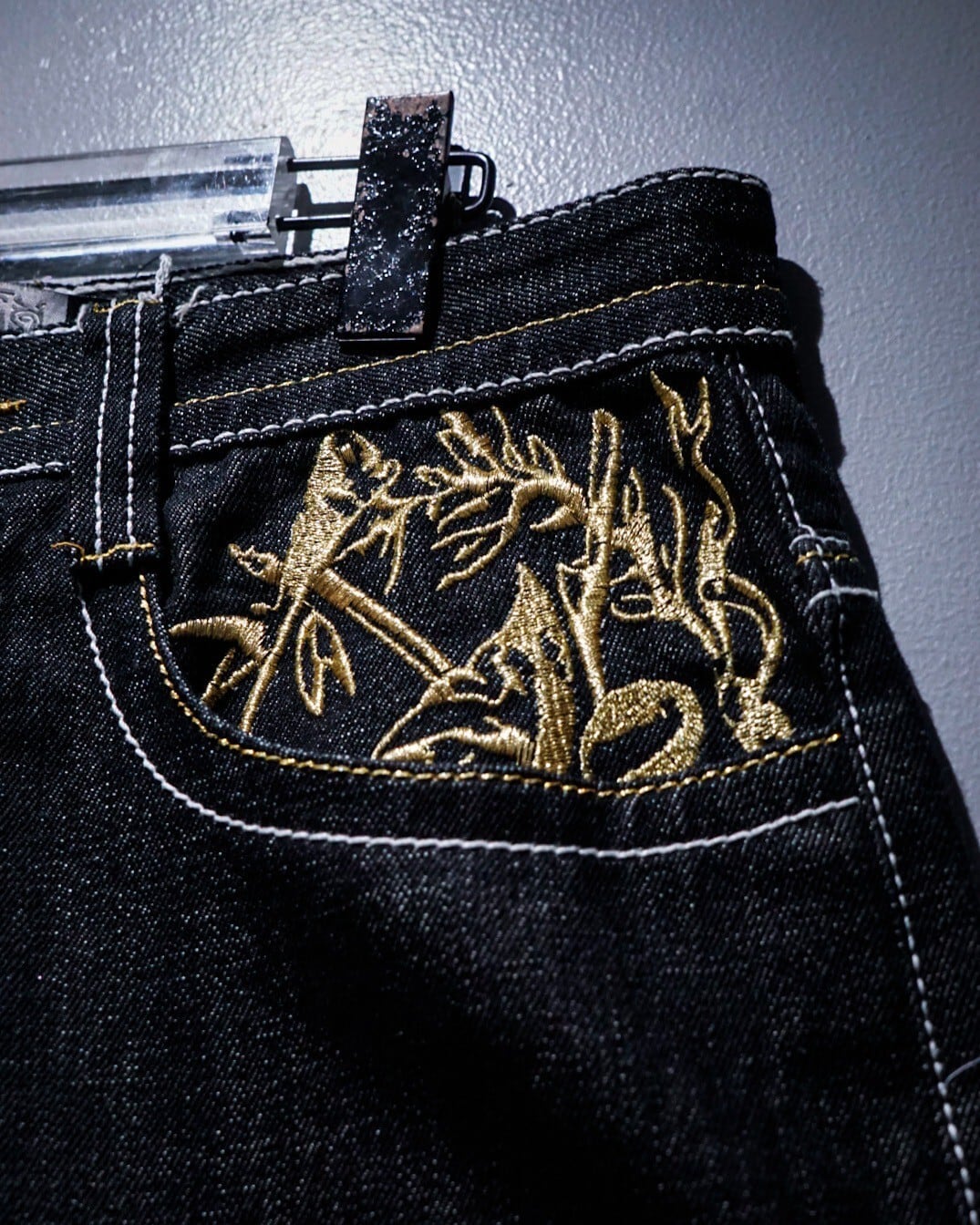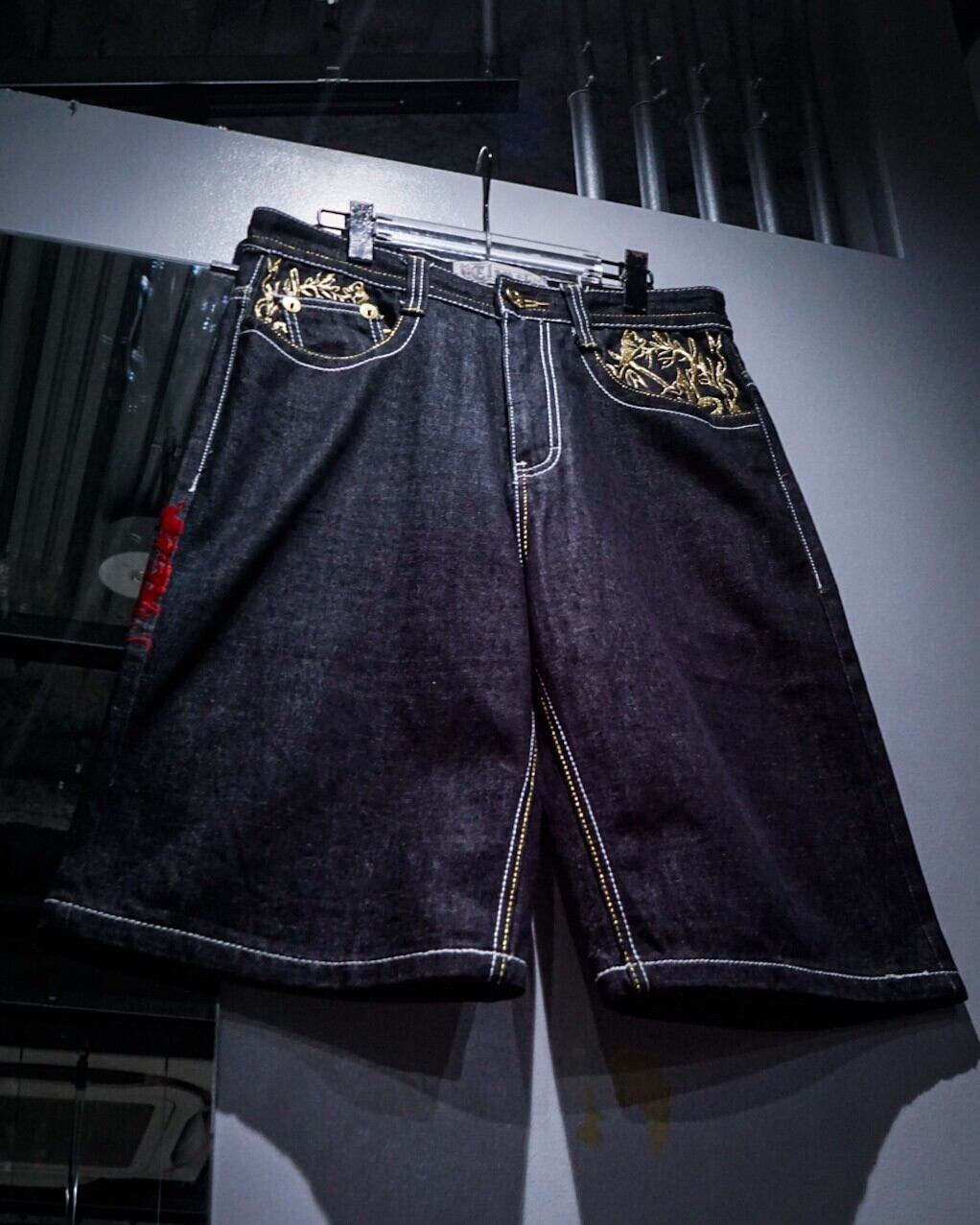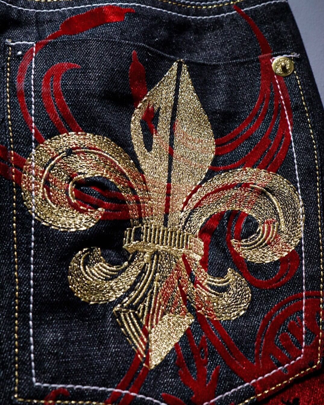 ブラックデニムを用いたボディに、緻密な刺繍でクロムハーツ等のブランドでも踏襲された、フランス王家の紋章"フルール・ド・リス"をバックポケットに刻んだバギーショーツ。