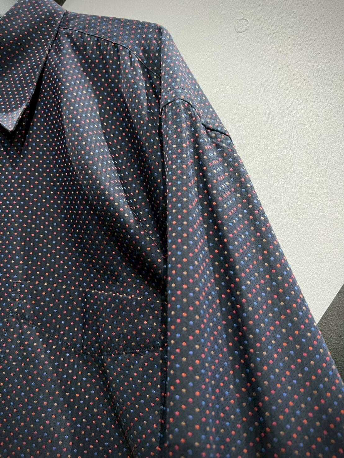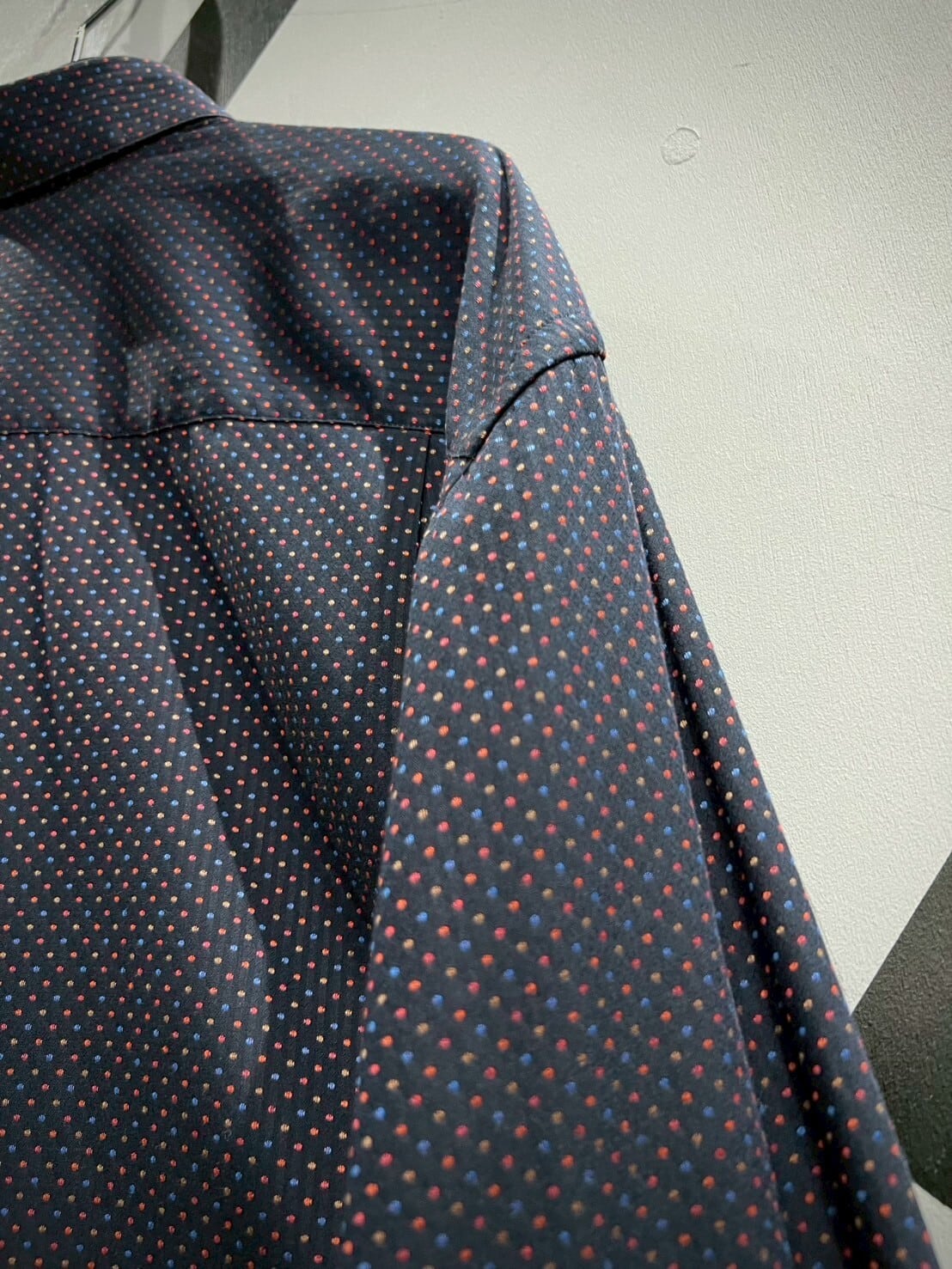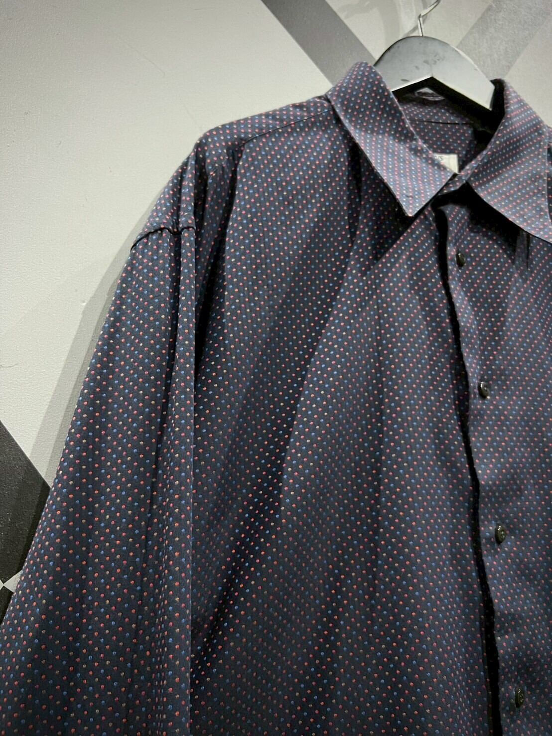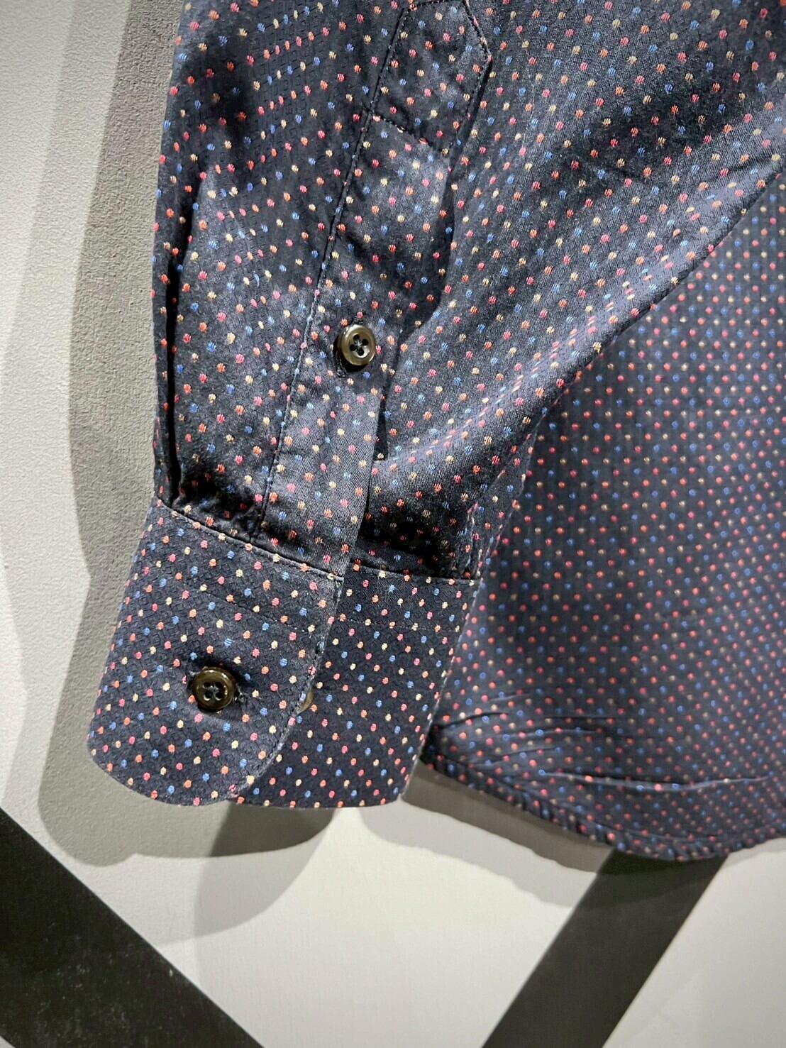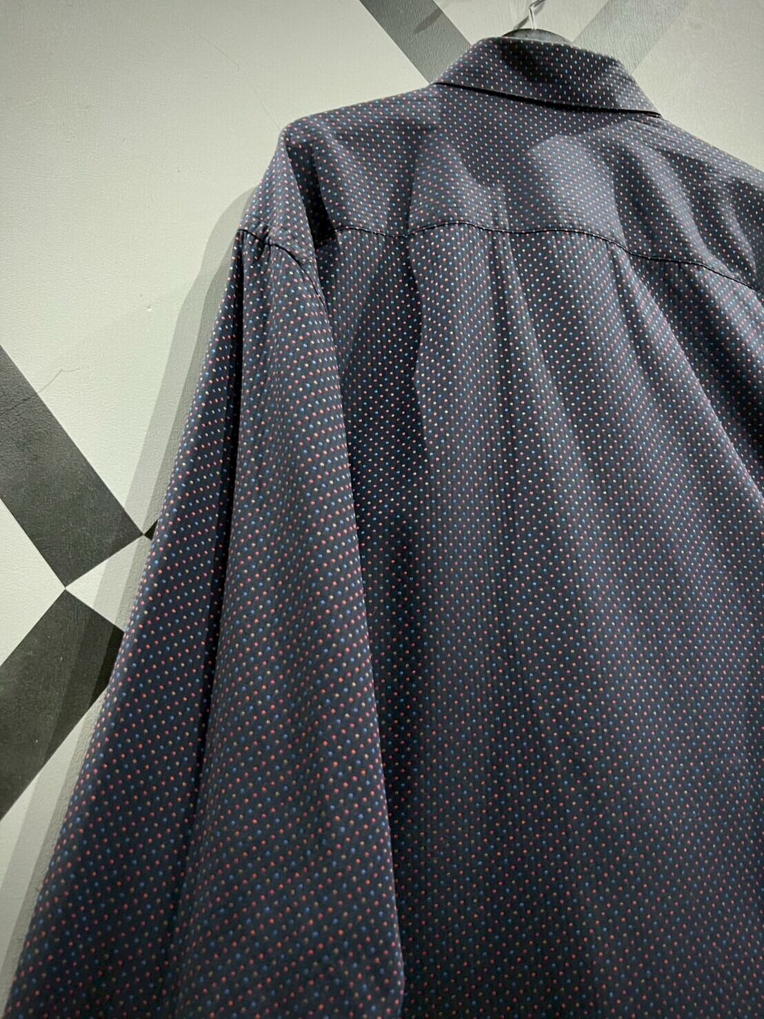 ネイビーカラーをボディのベースに、ジャガード織りによってマルチカラーの細かなドット柄をボディ全面に配した長袖シャツ。