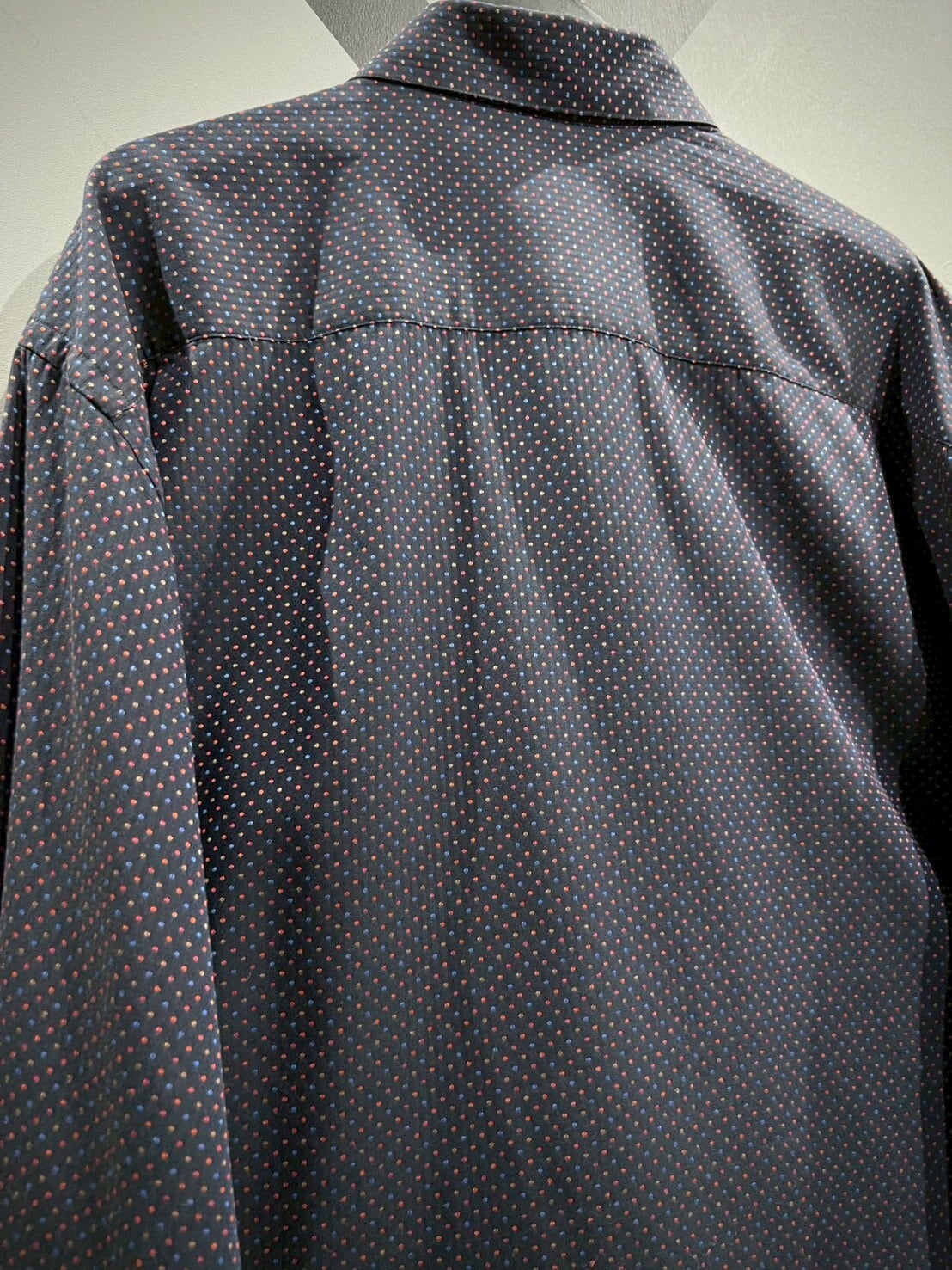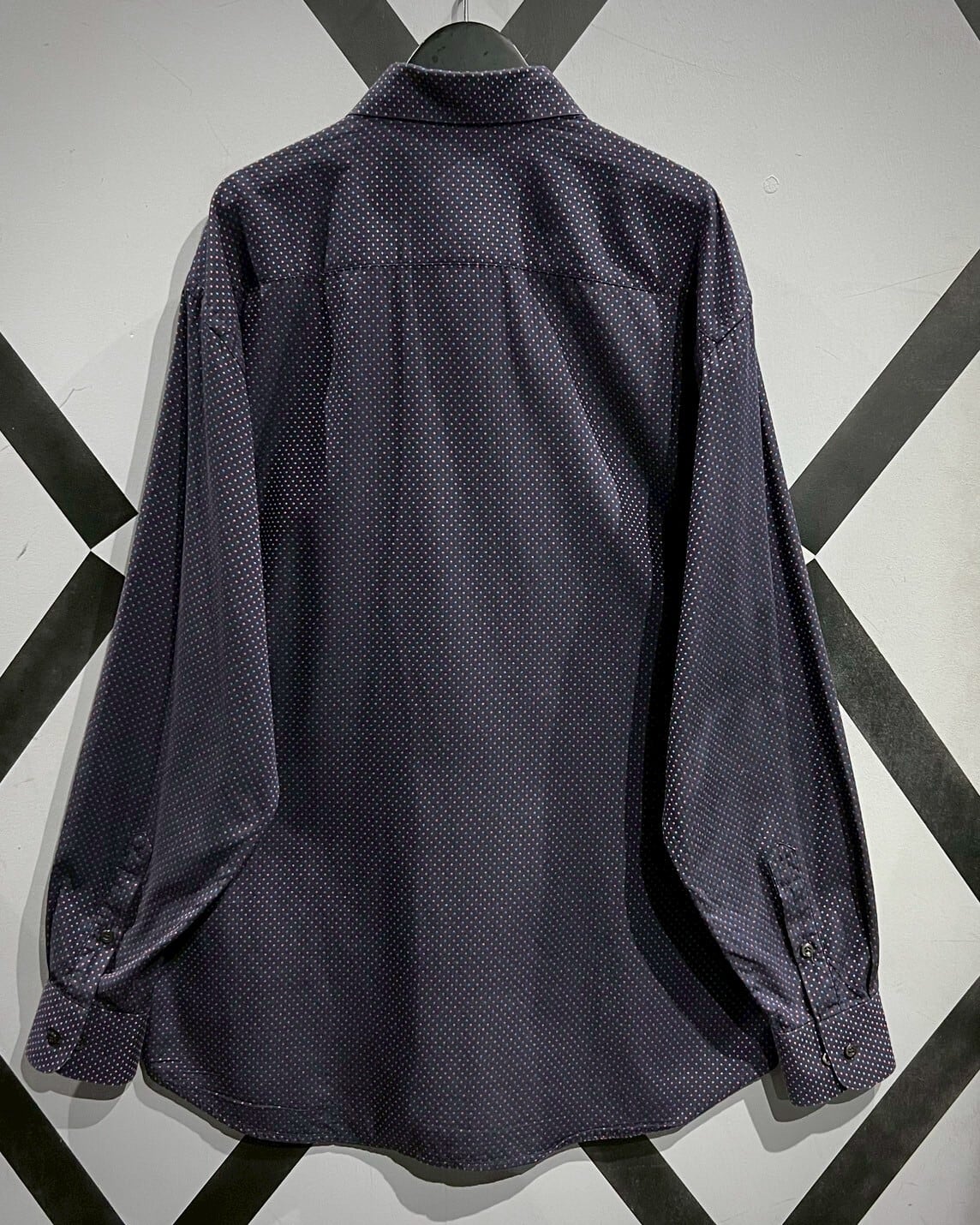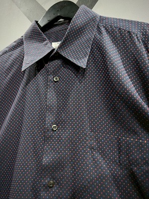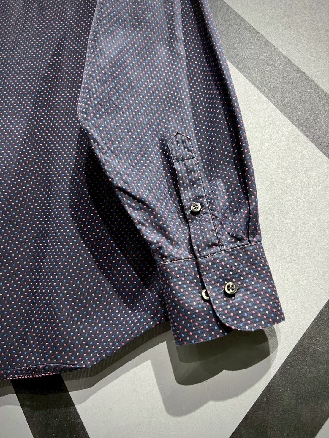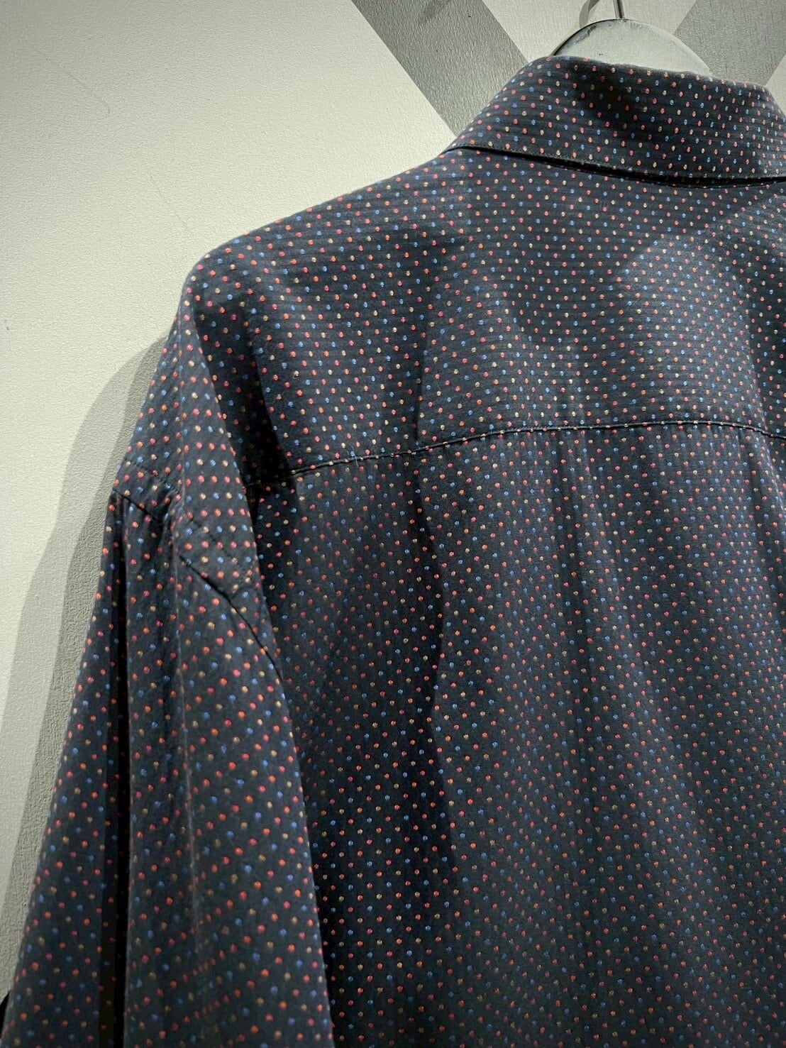 ネイビーカラーをボディのベースに、ジャガード織りによってマルチカラーの細かなドット柄をボディ全面に配した長袖シャツ。