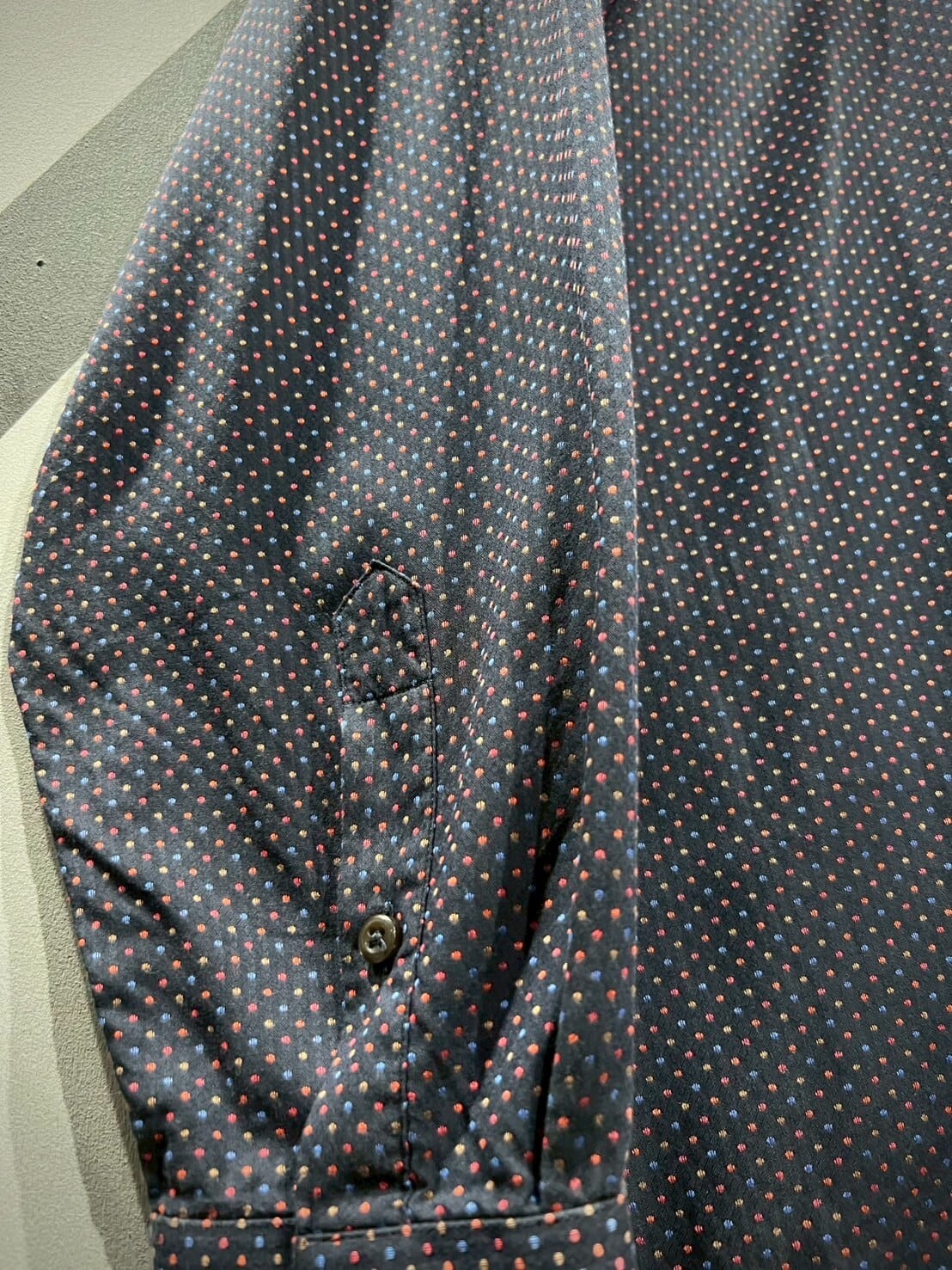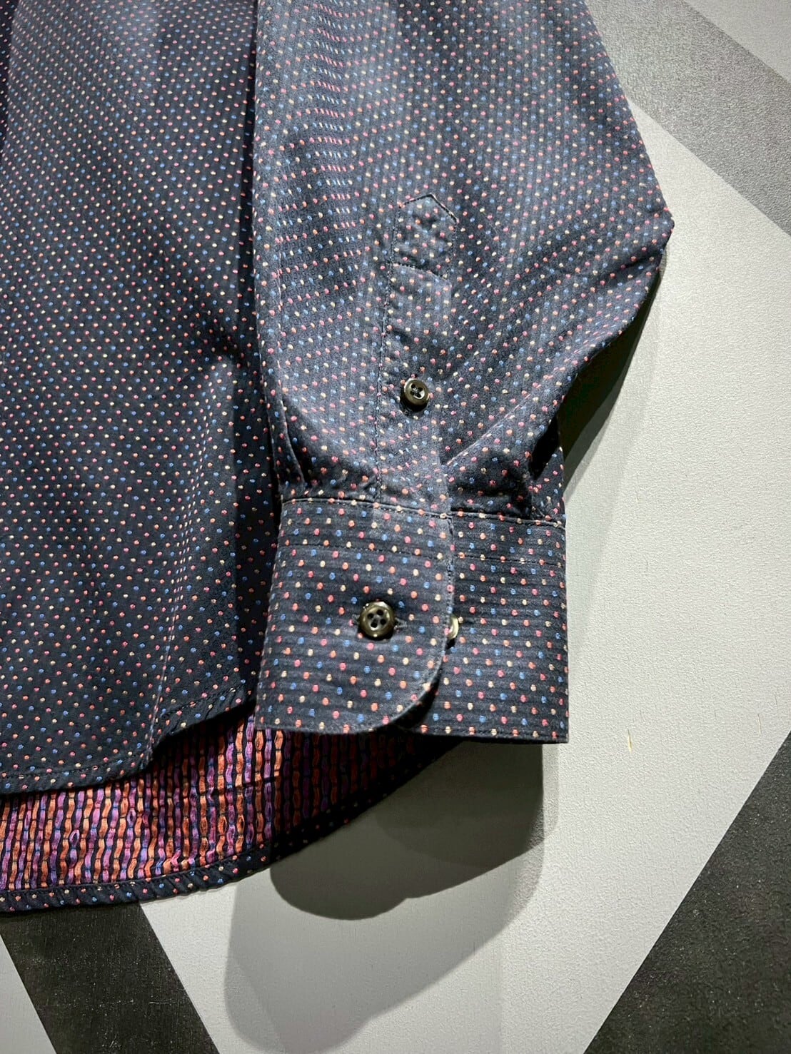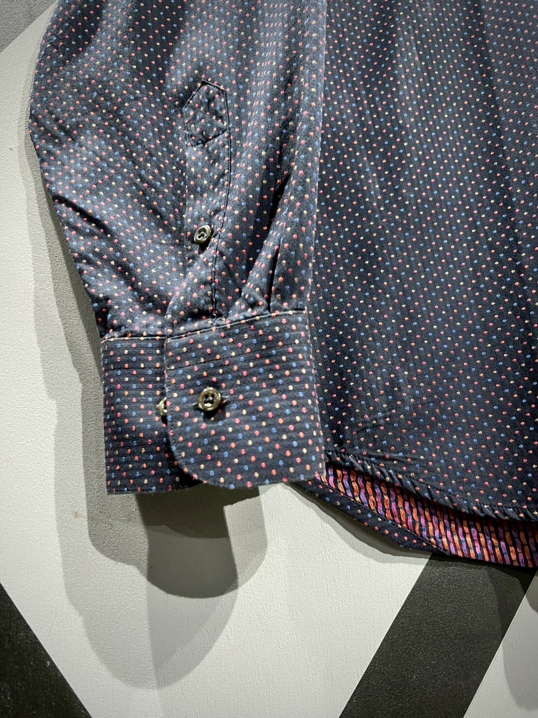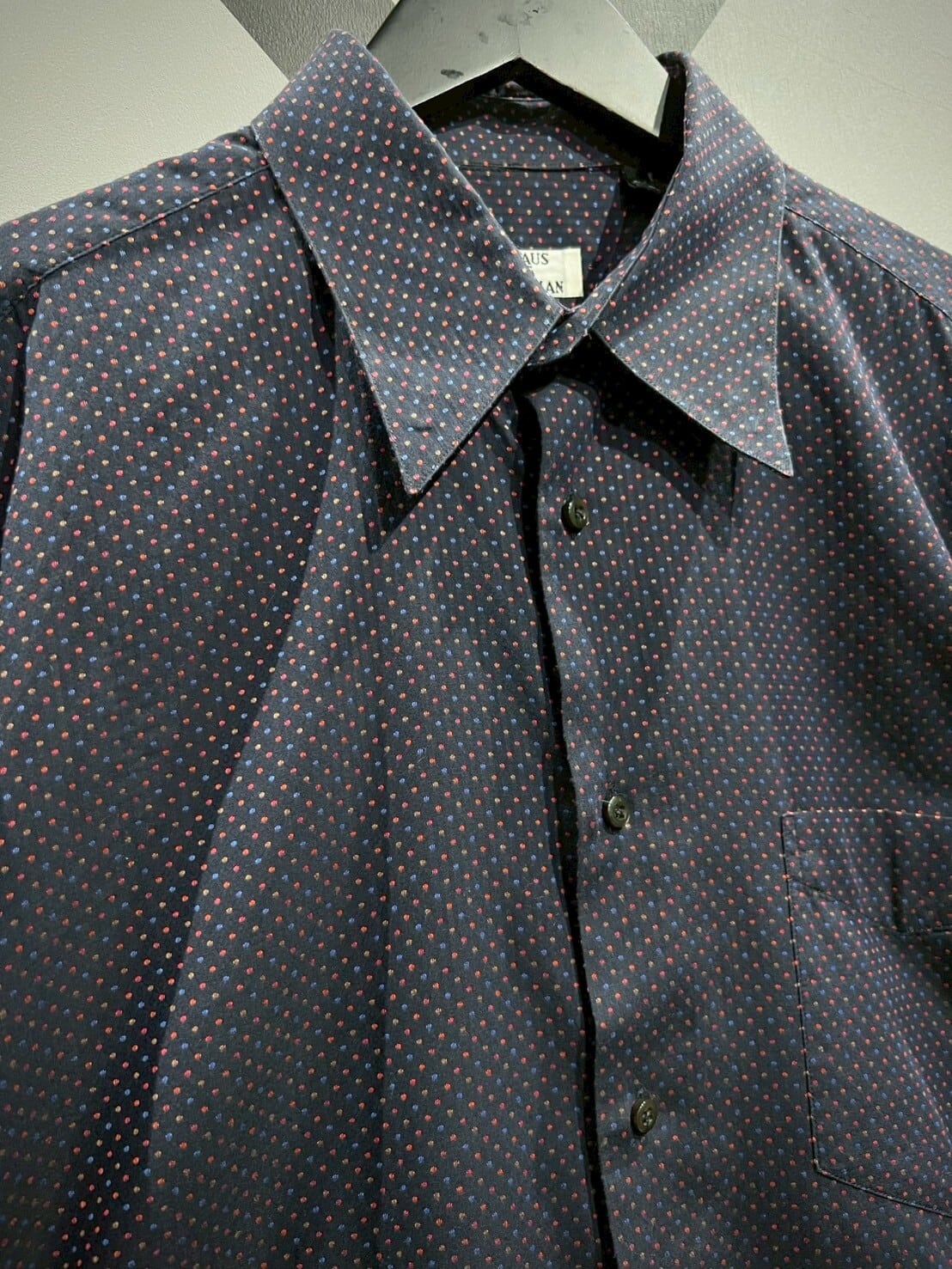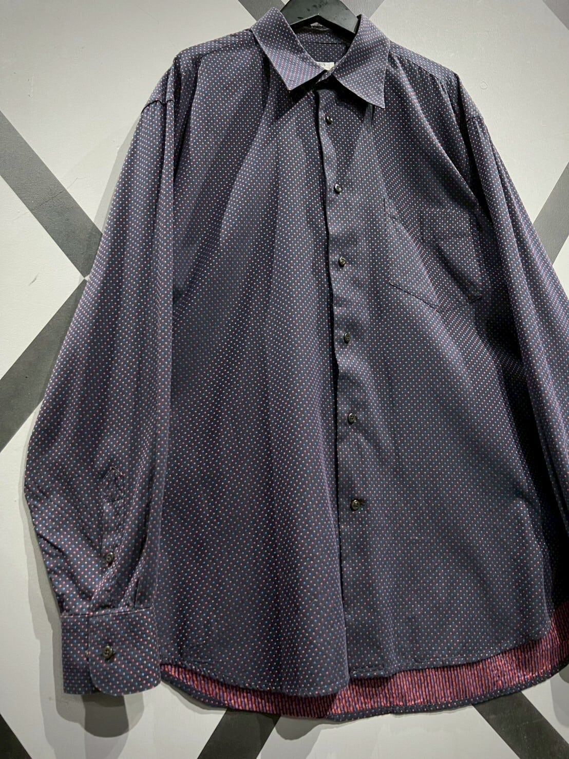 ネイビーカラーをボディのベースに、ジャガード織りによってマルチカラーの細かなドット柄をボディ全面に配した長袖シャツ。