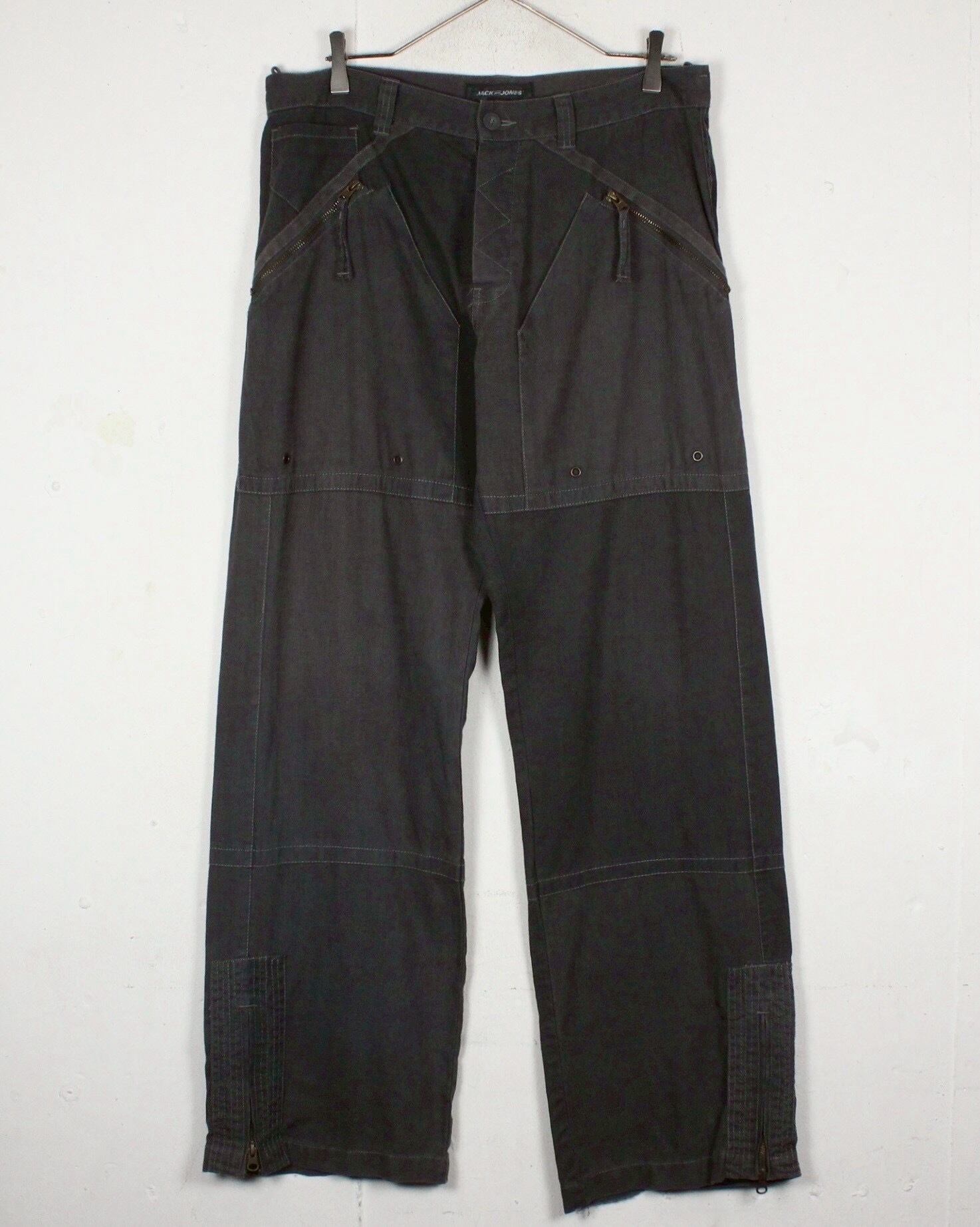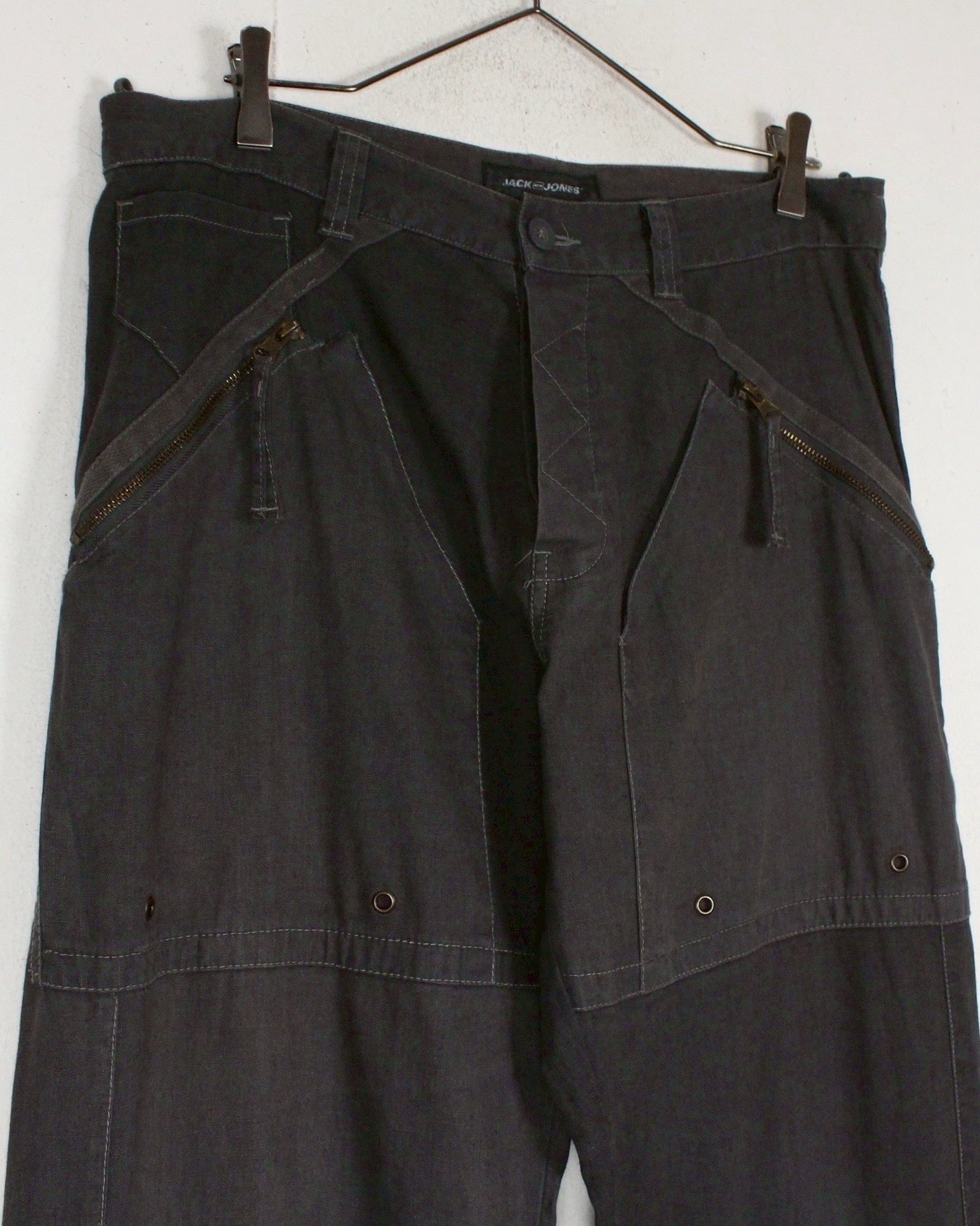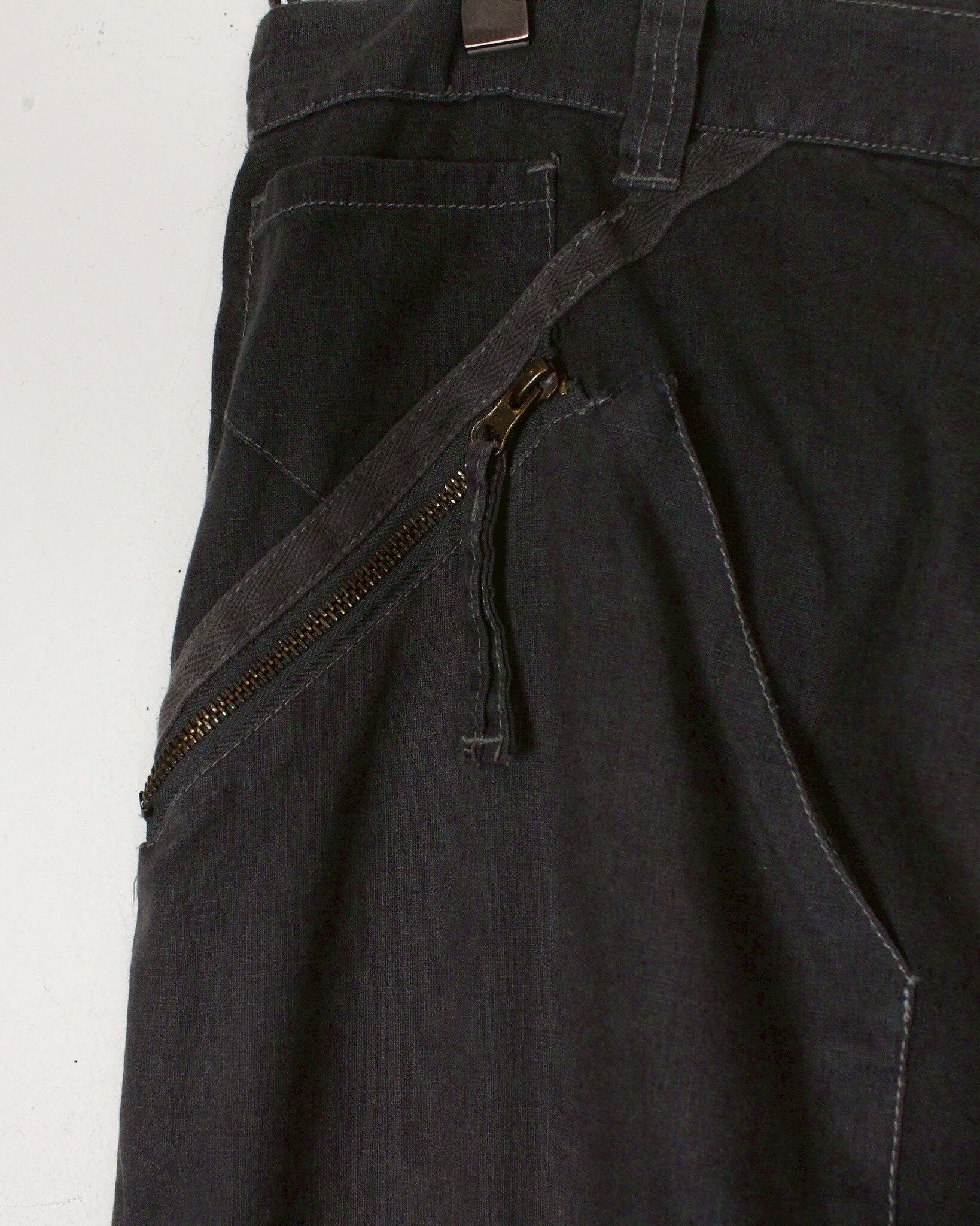 グレーのリネン素材をボディに使用し、切り替えやジップによるデザインが施された稀有なリネンパンツ。