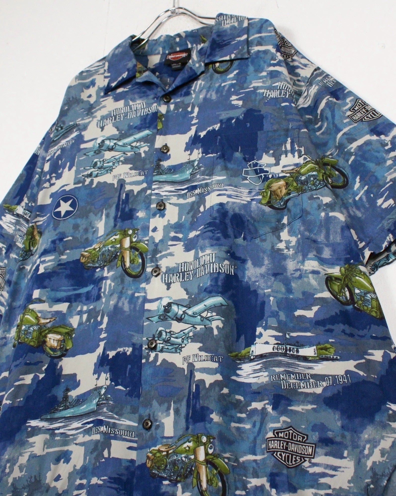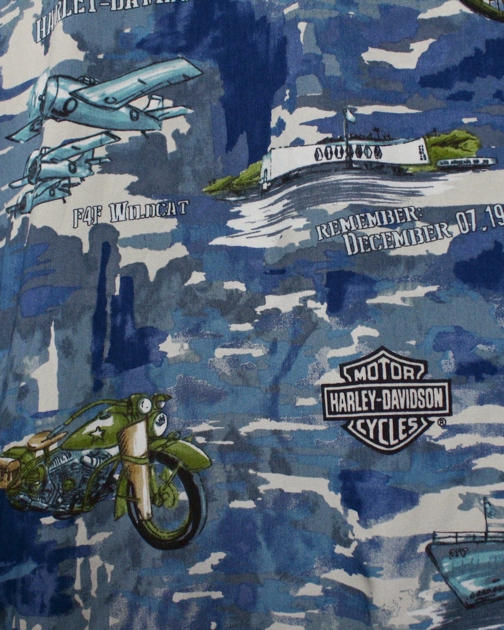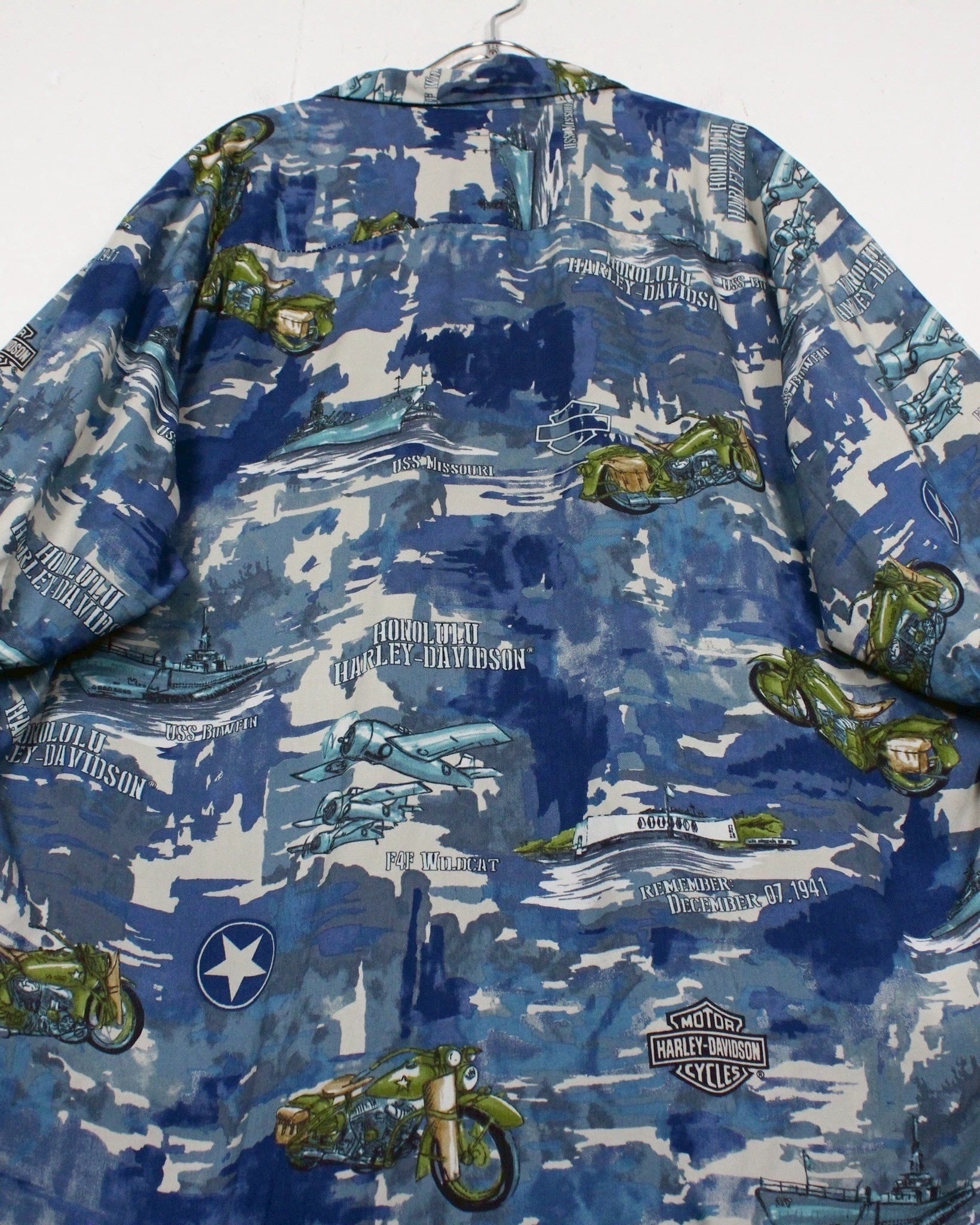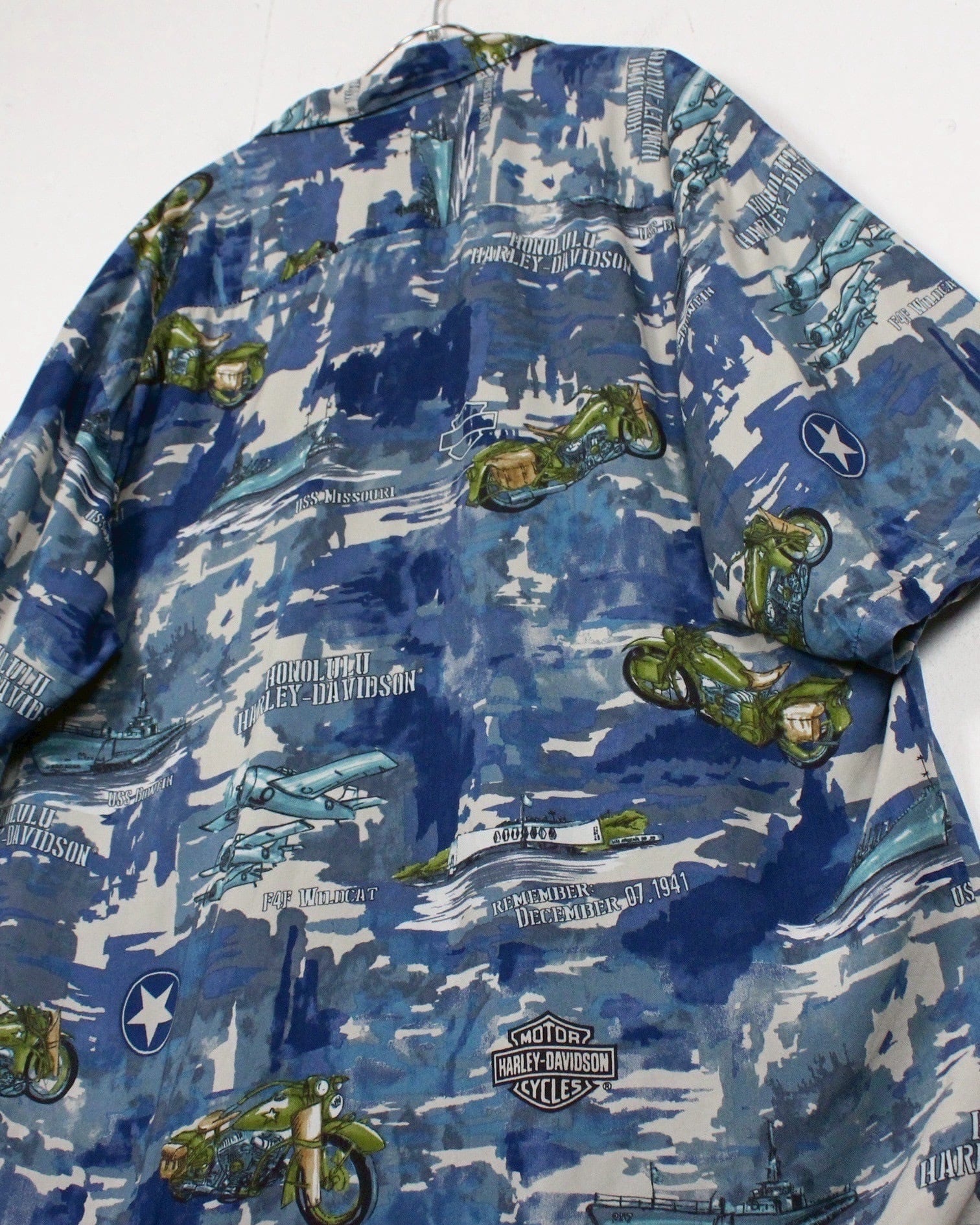 1941年12月7日に行われた"真珠湾攻撃"をソースとした柄を落とし込んだ、ホノルル・ハーレーダビッドソンからのハワイ製の稀有なオープンカラーシャツ。