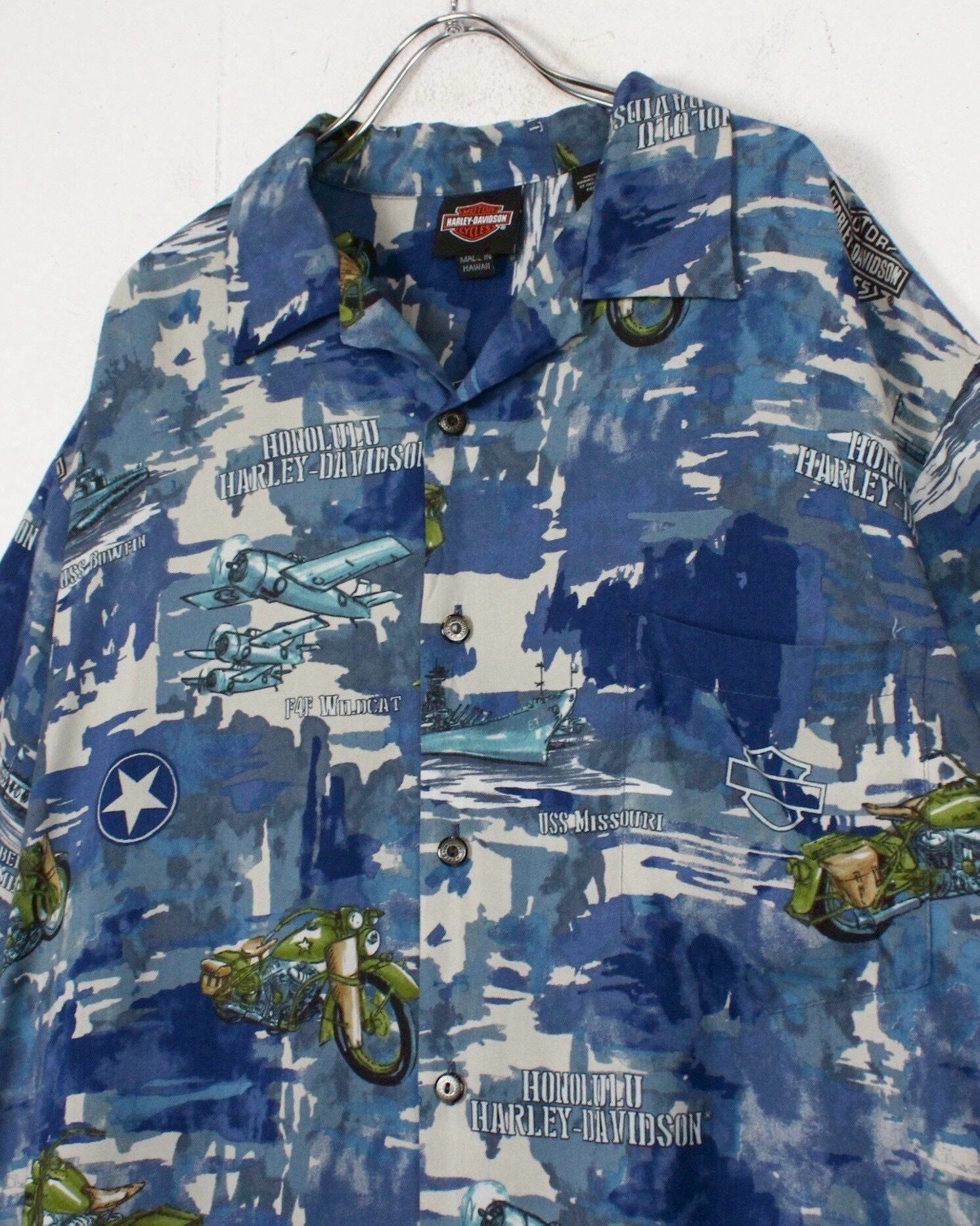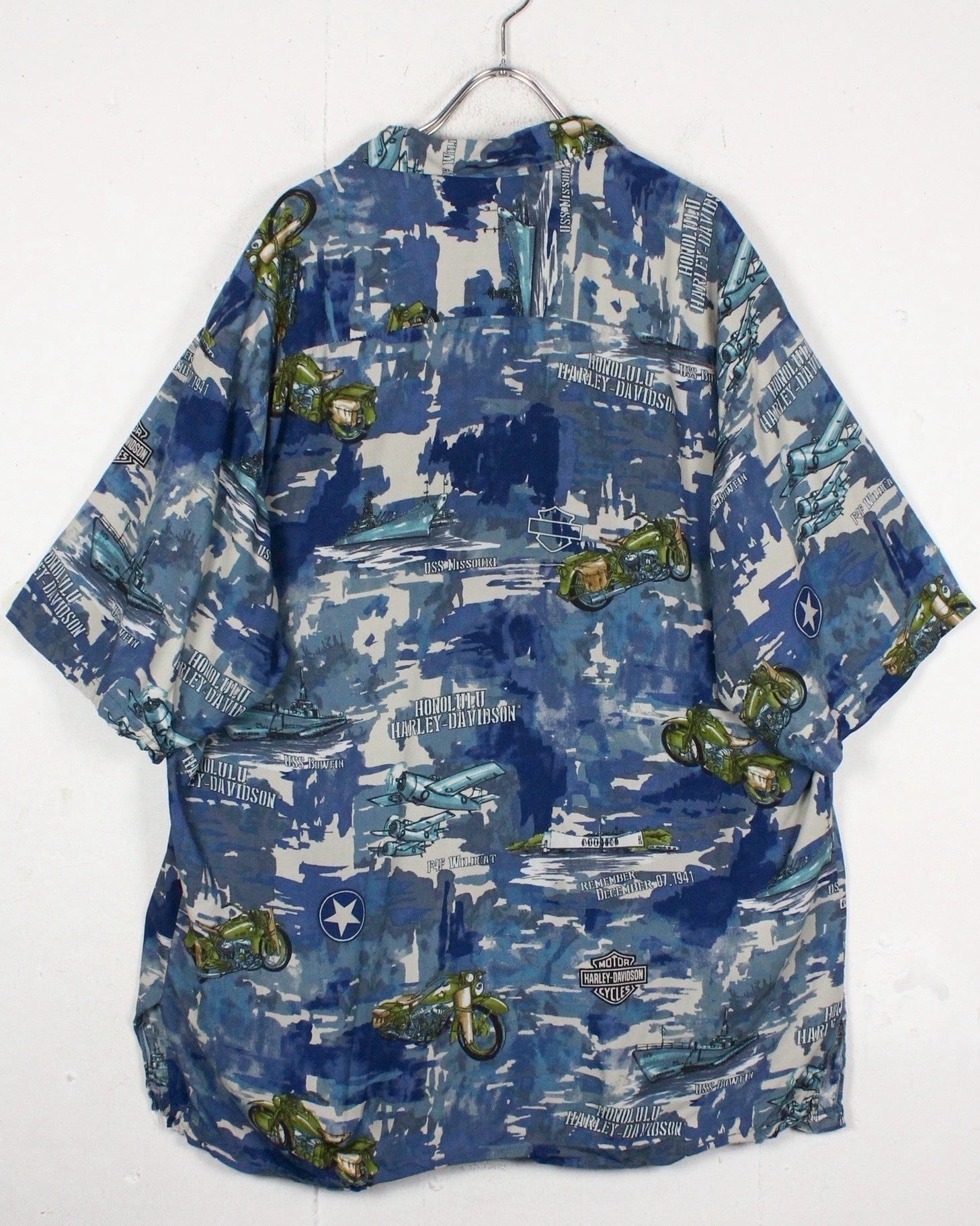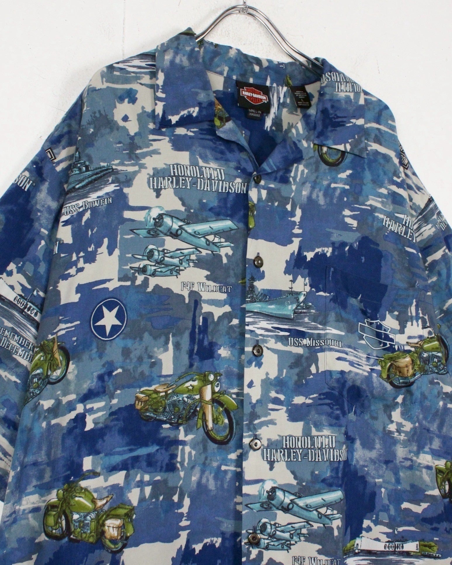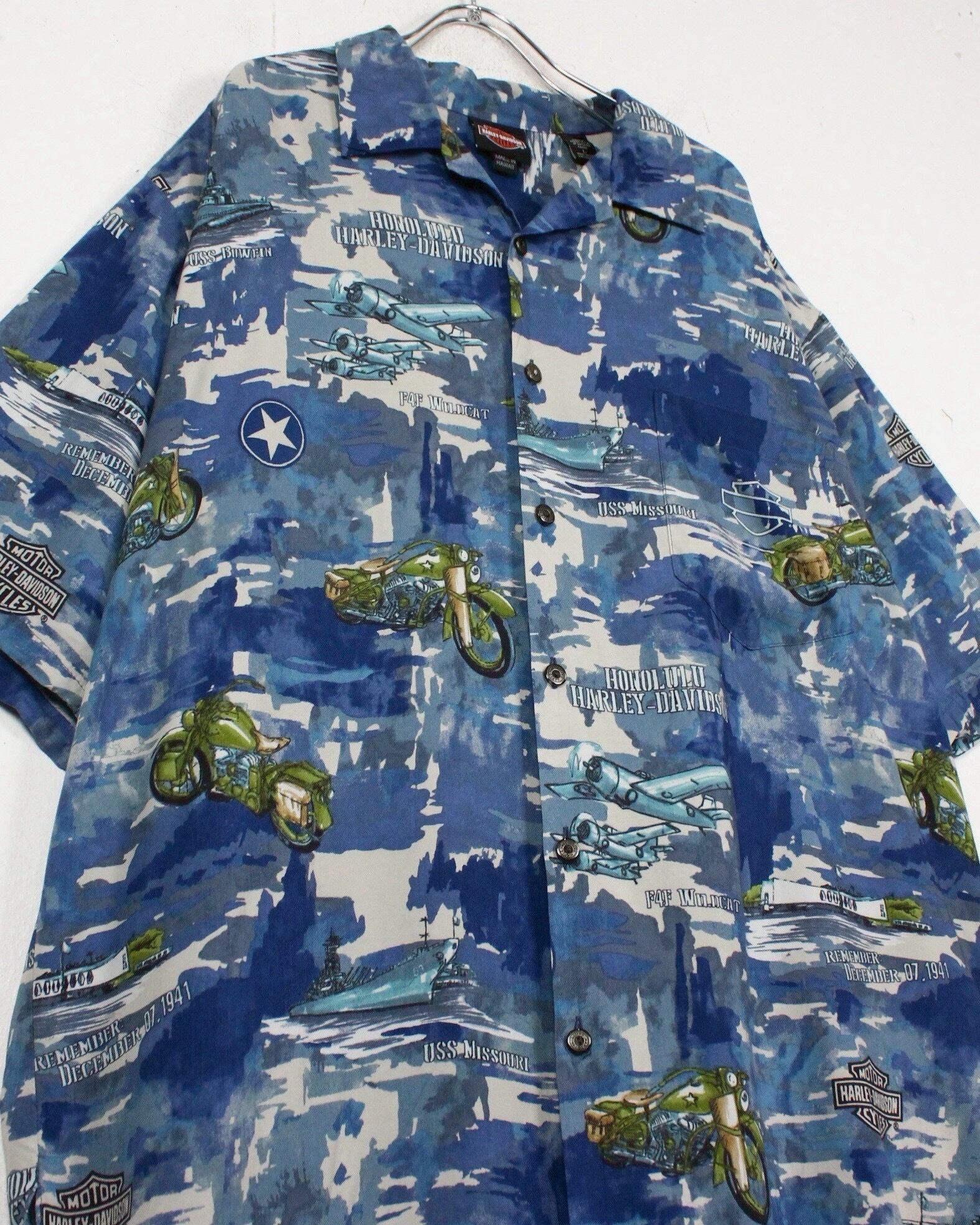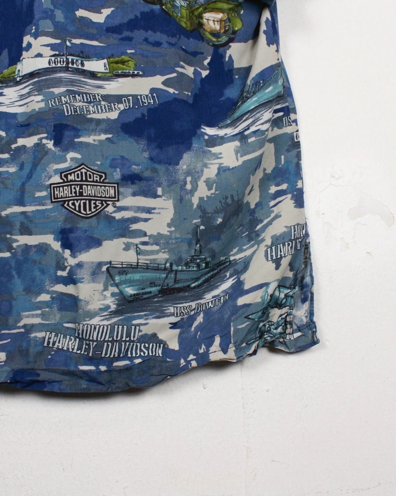 1941年12月7日に行われた"真珠湾攻撃"をソースとした柄を落とし込んだ、ホノルル・ハーレーダビッドソンからのハワイ製の稀有なオープンカラーシャツ。