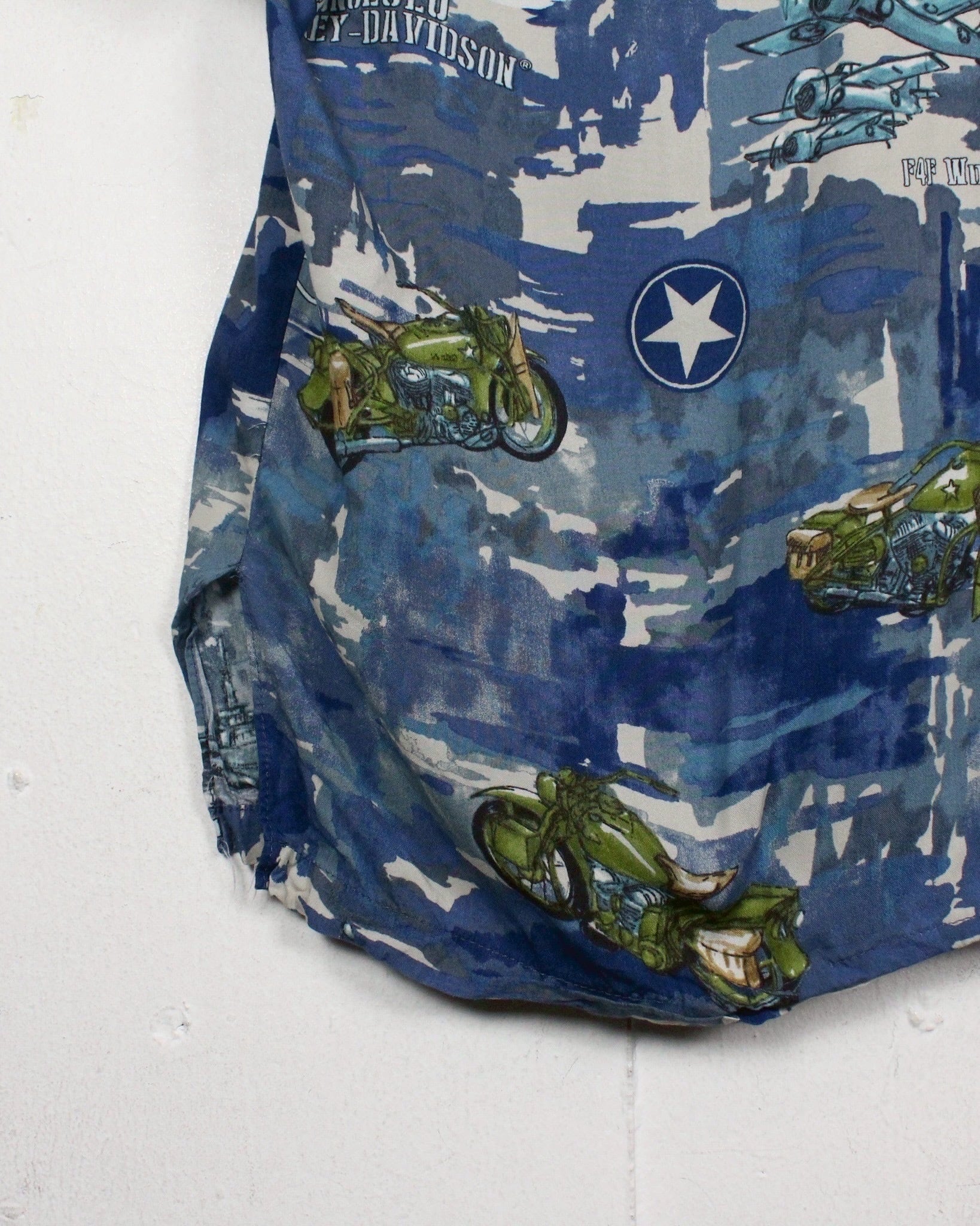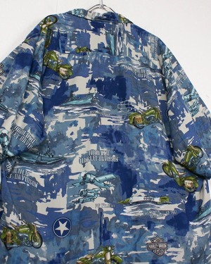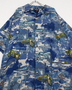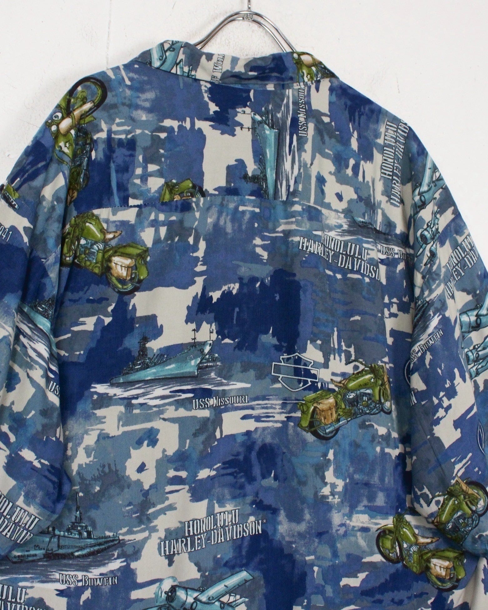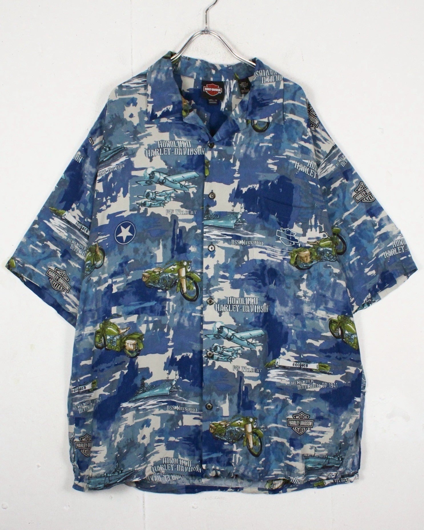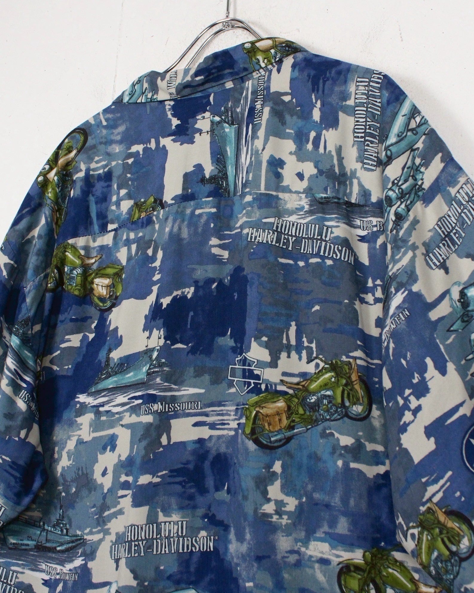 1941年12月7日に行われた"真珠湾攻撃"をソースとした柄を落とし込んだ、ホノルル・ハーレーダビッドソンからのハワイ製の稀有なオープンカラーシャツ。