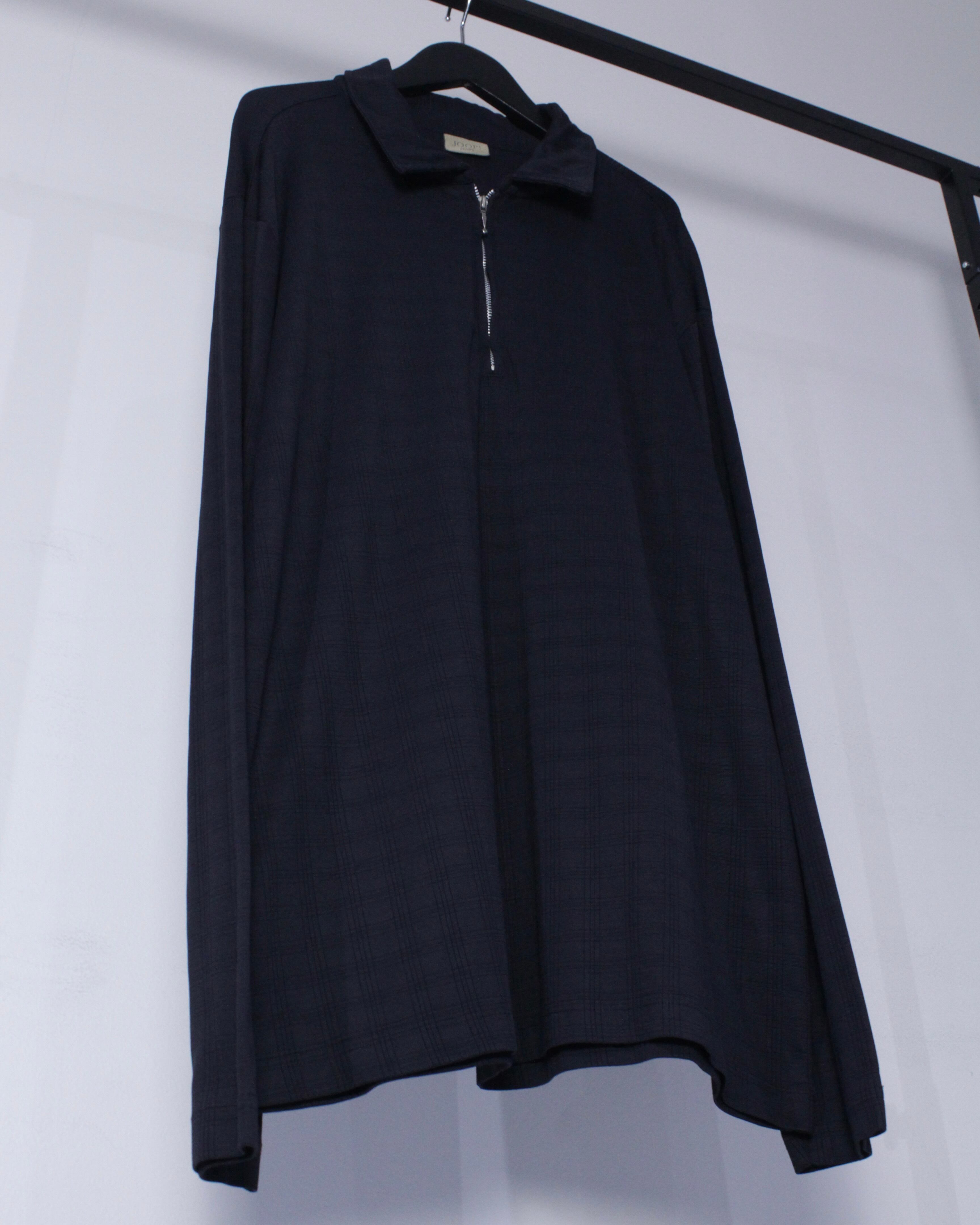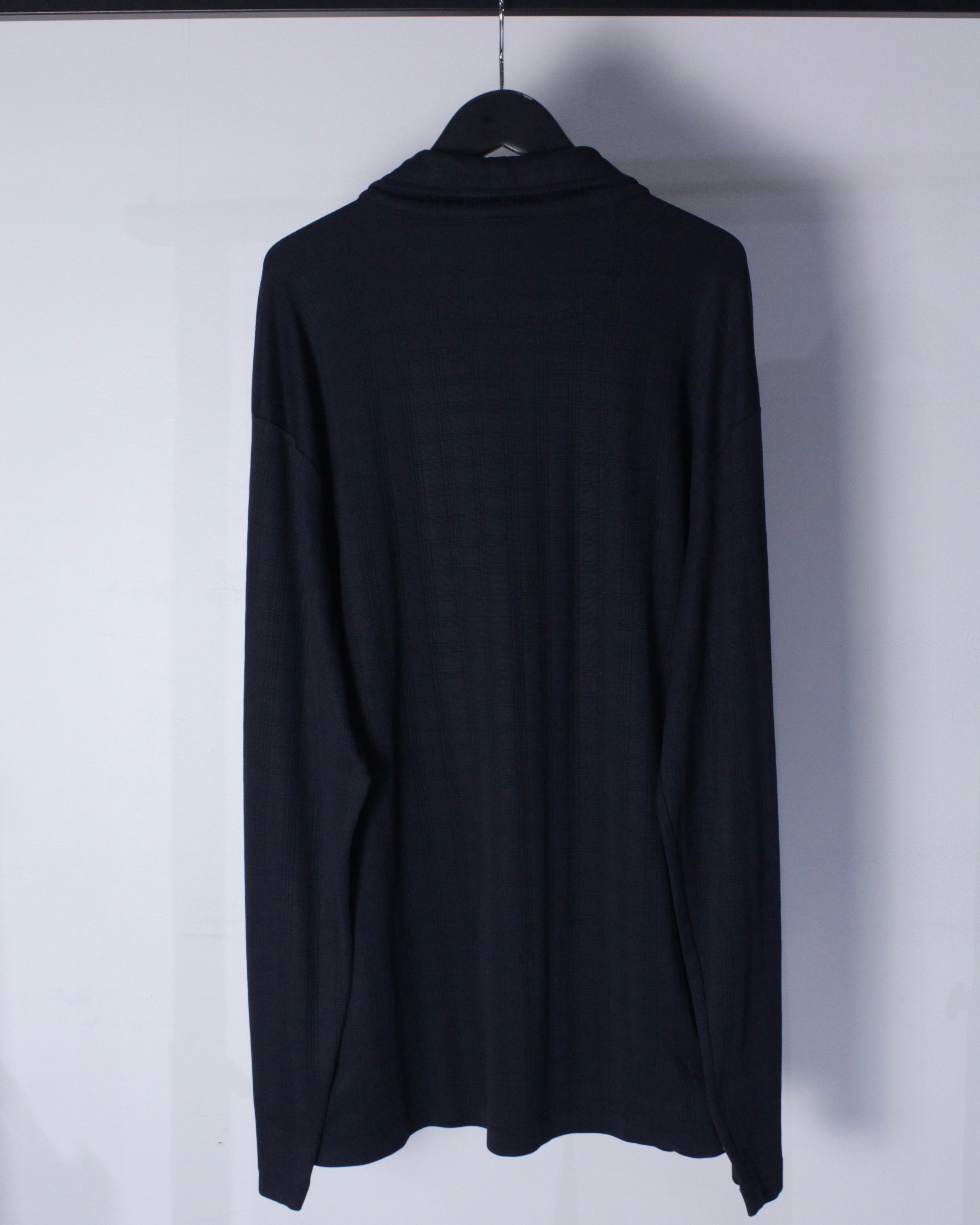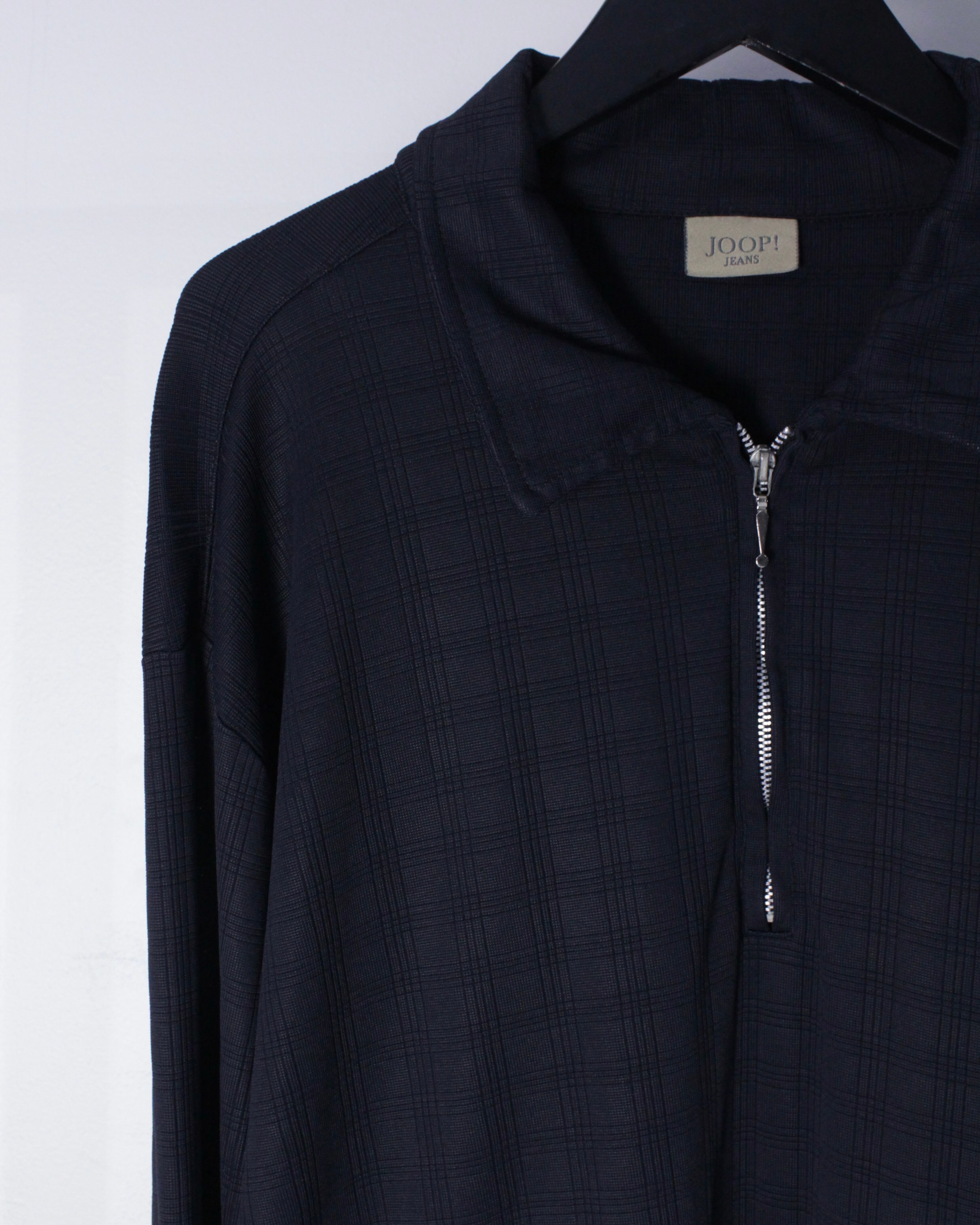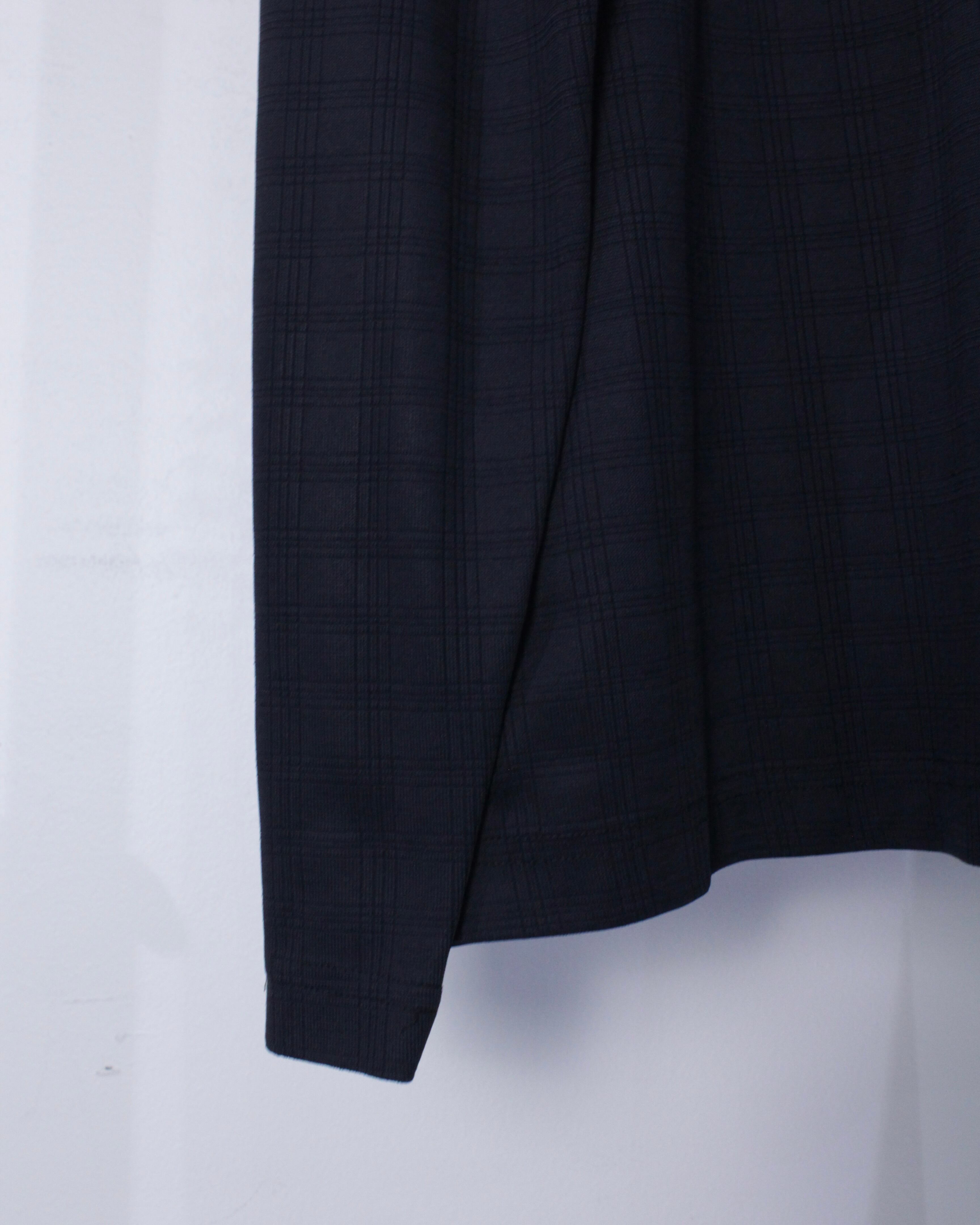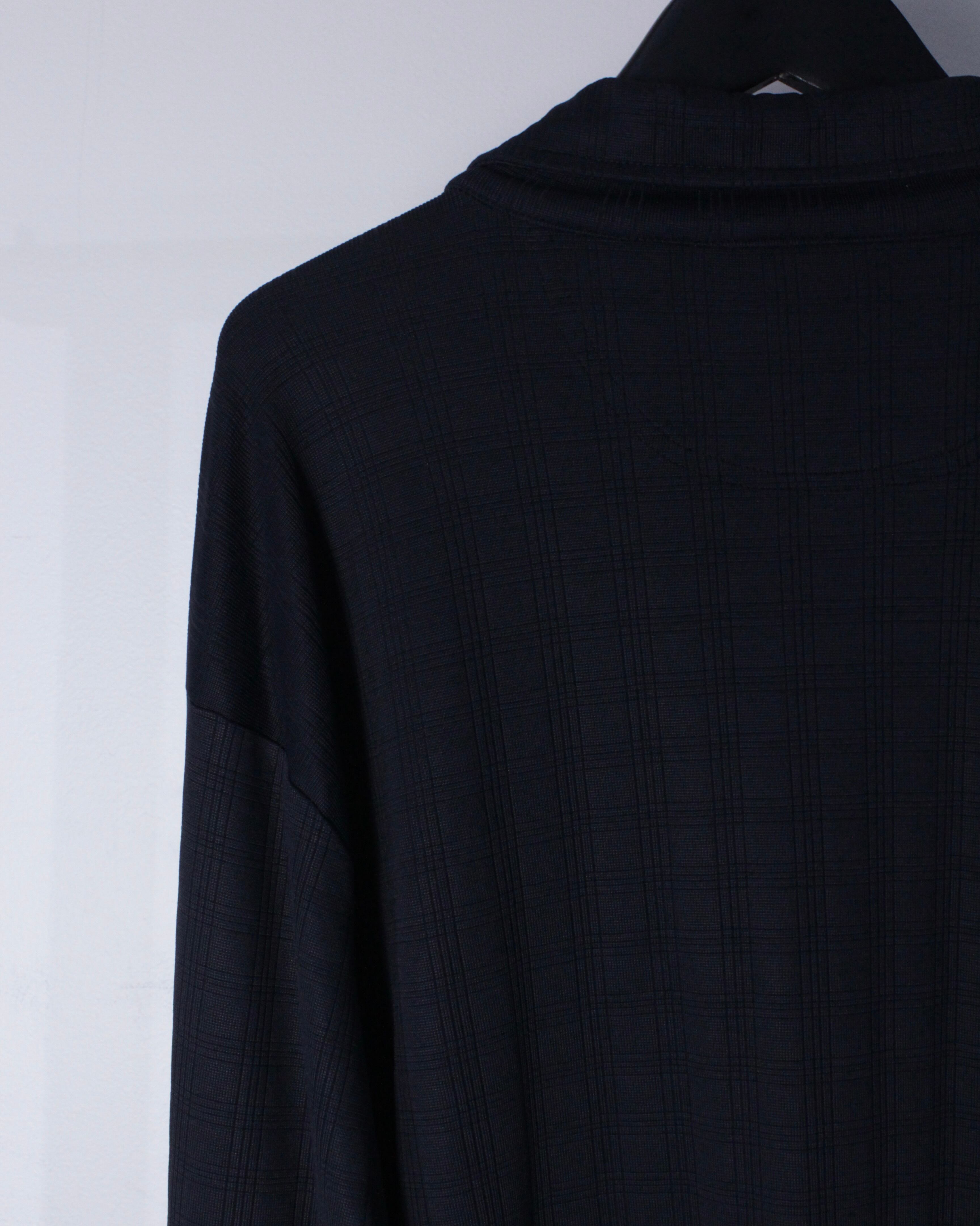 チェック柄が配された伸縮性のある滑らかな質感の生地をボディに使用したハーフジッププルオーバー。