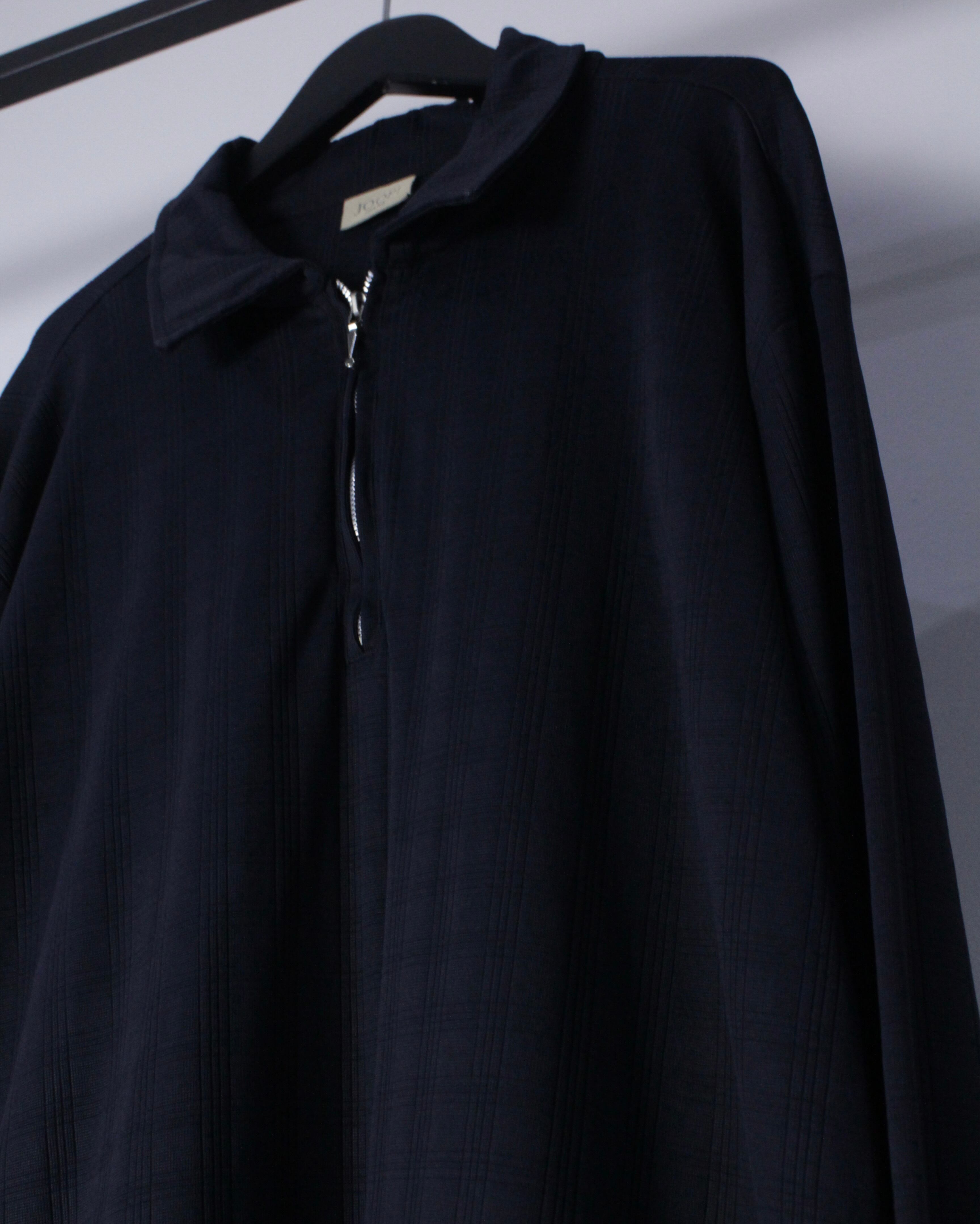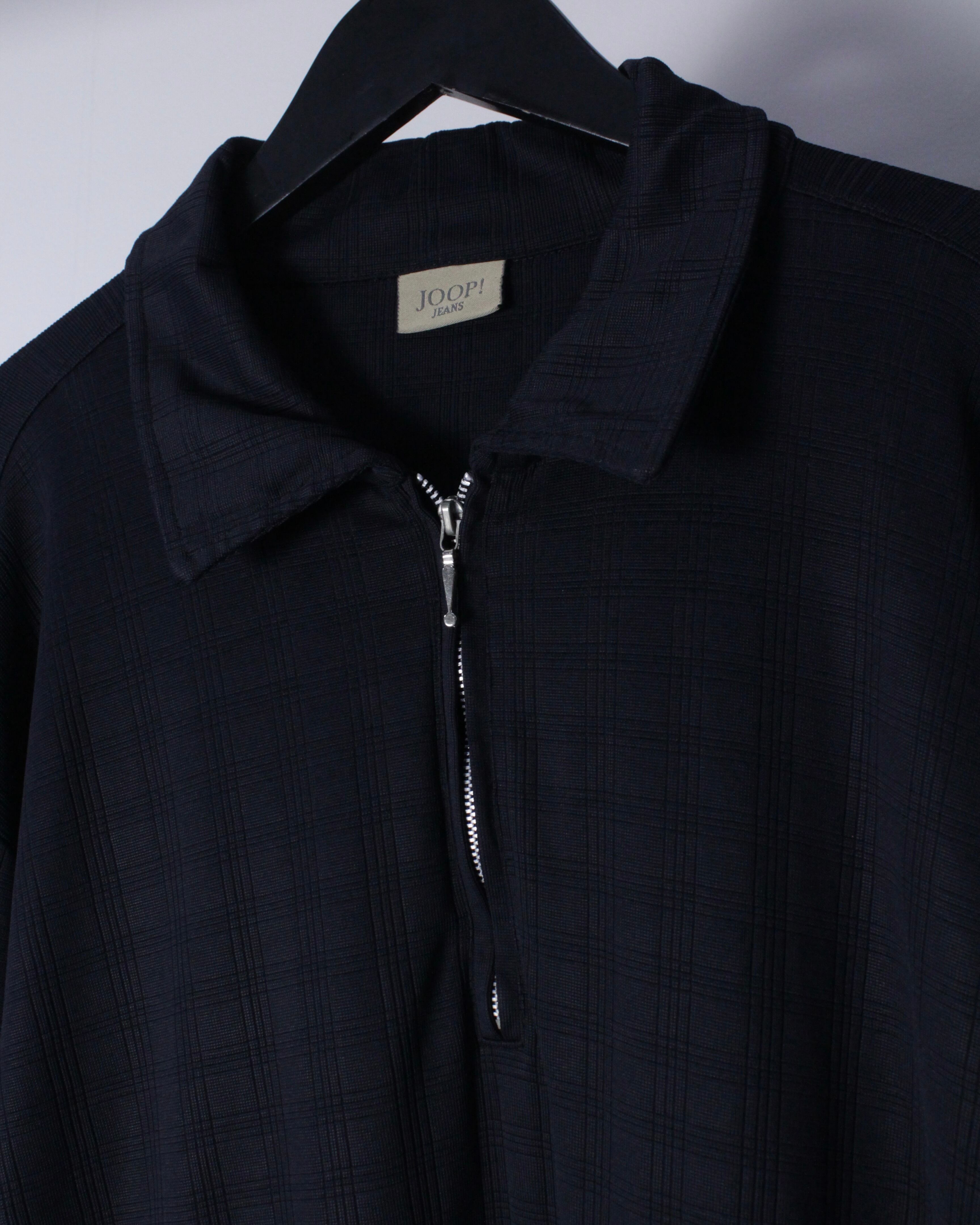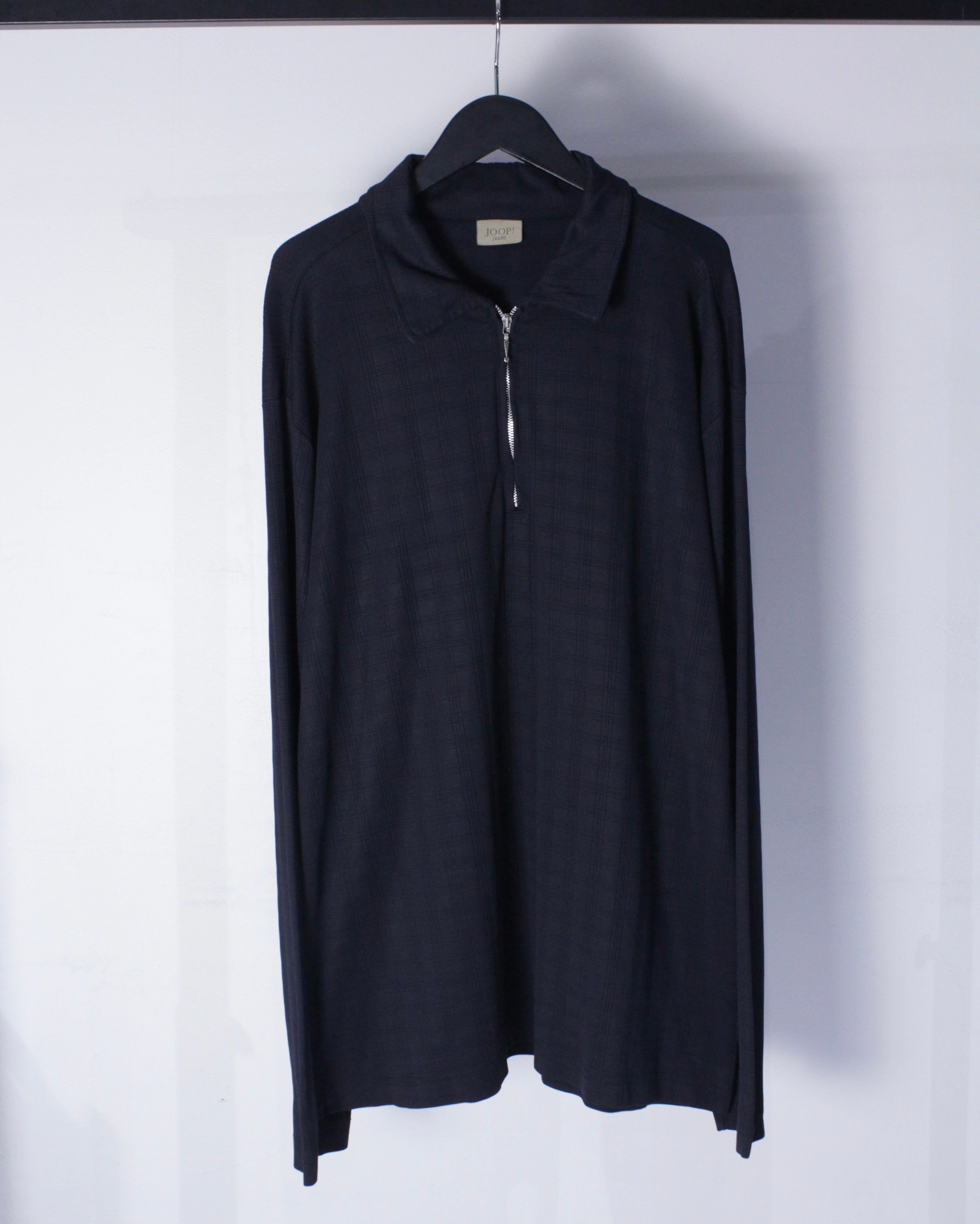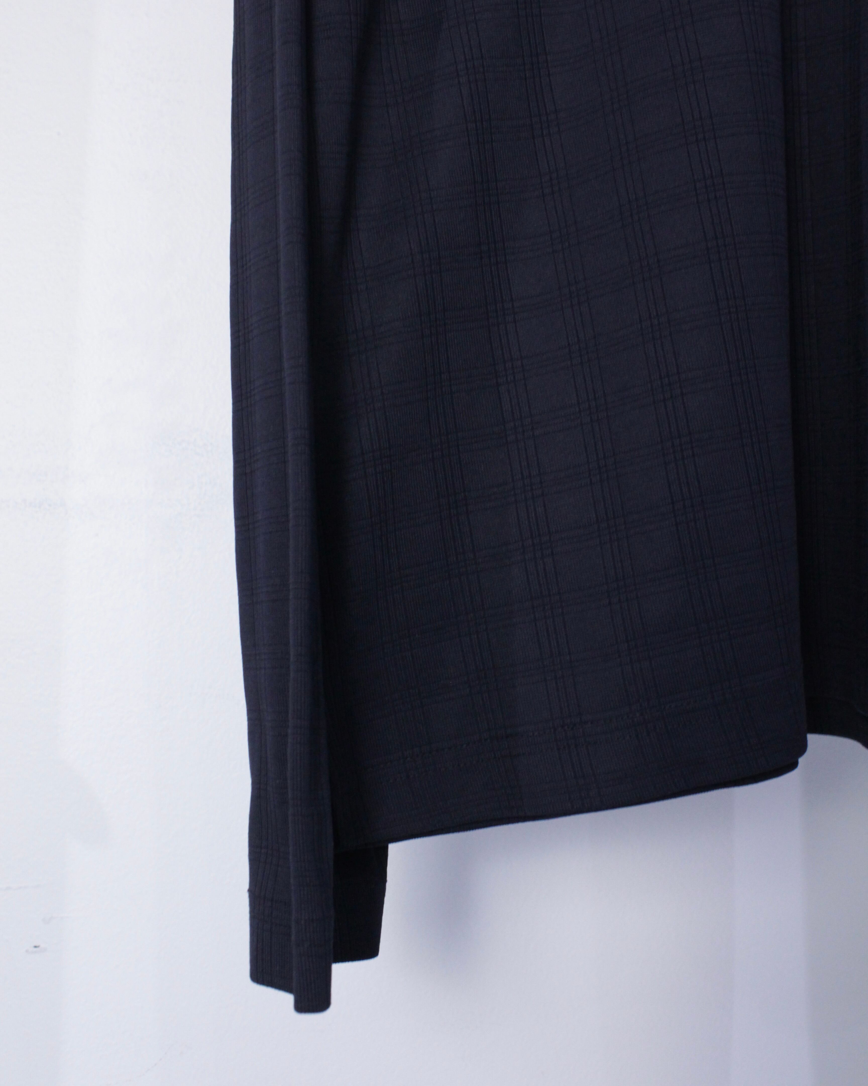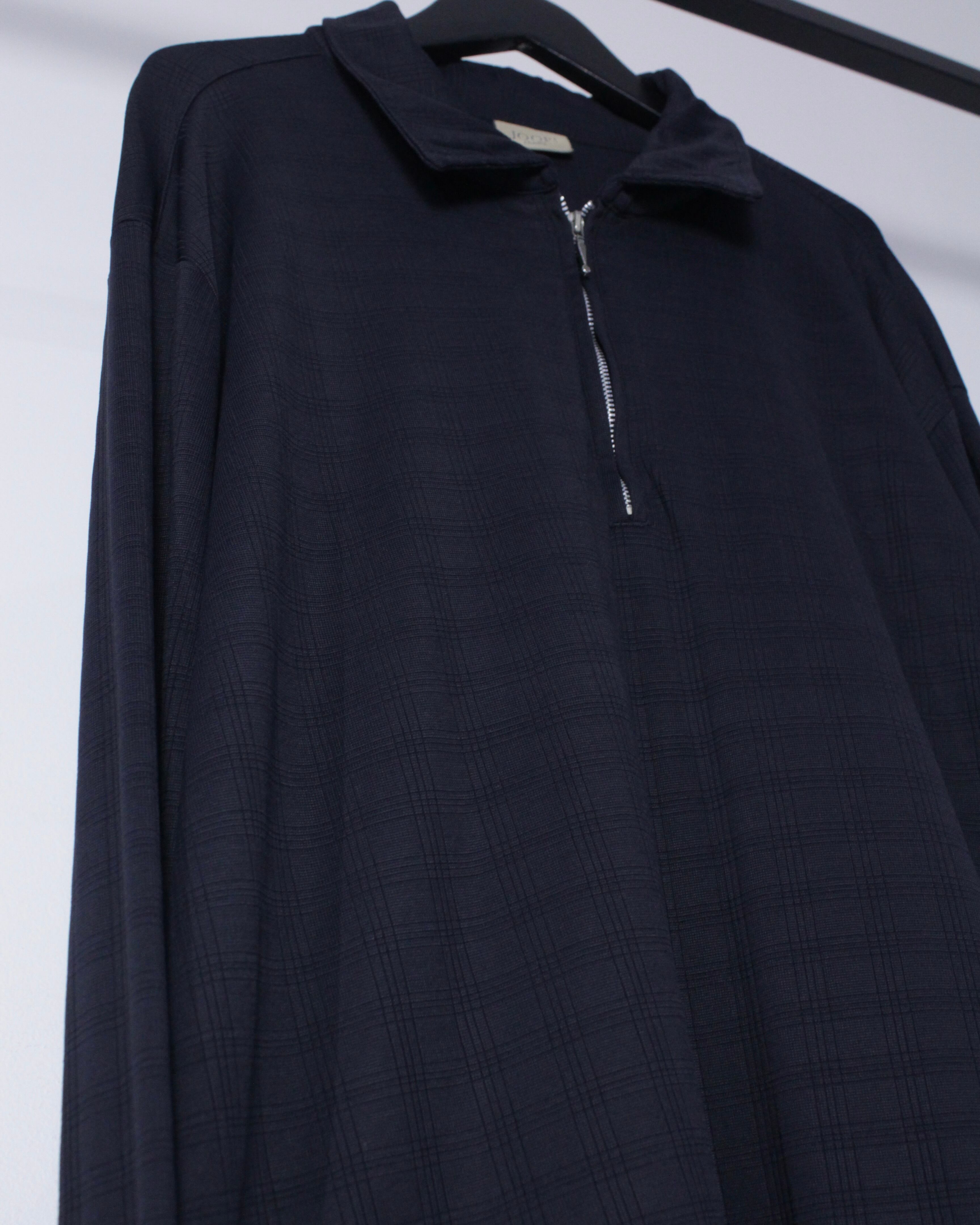 チェック柄が配された伸縮性のある滑らかな質感の生地をボディに使用したハーフジッププルオーバー。