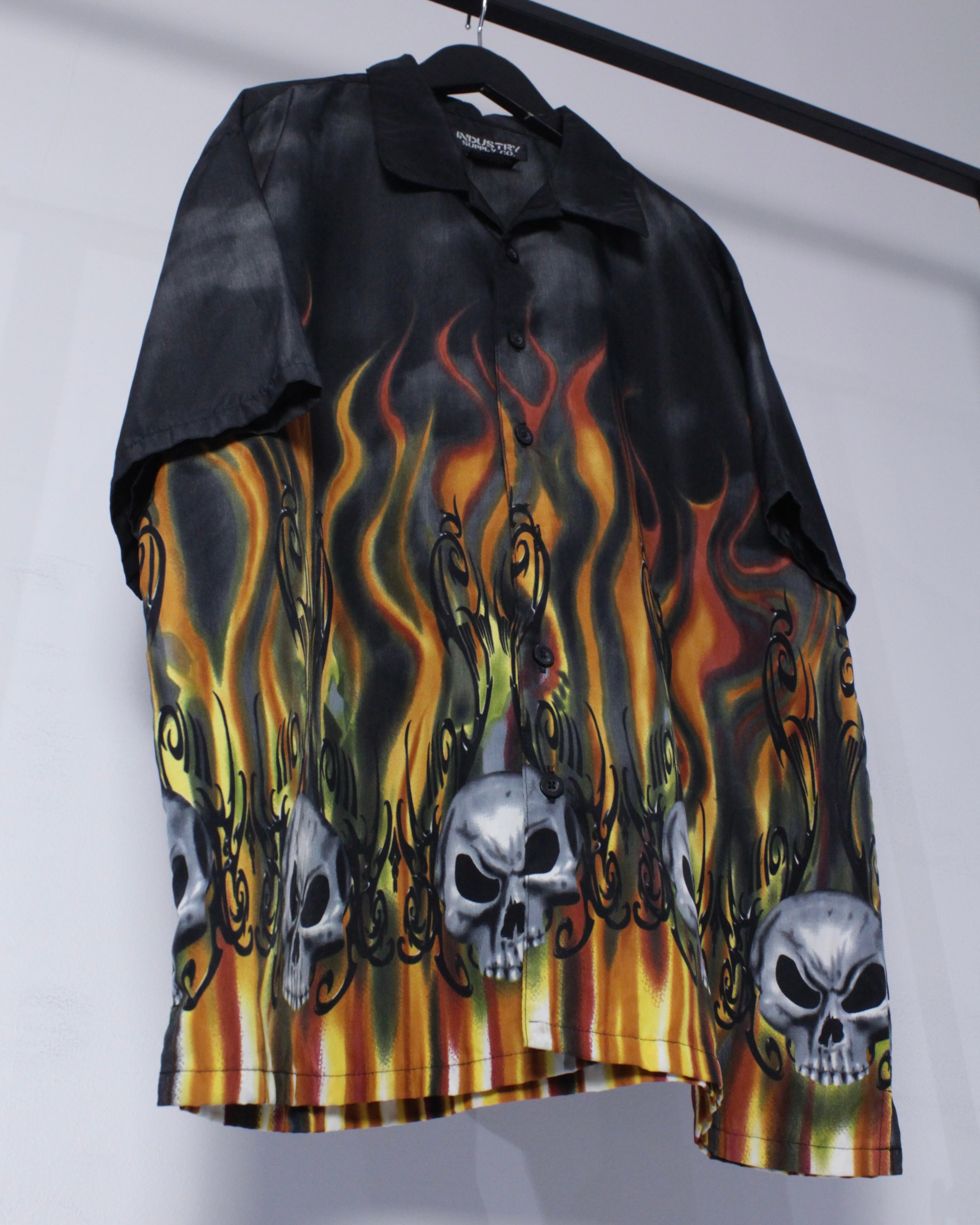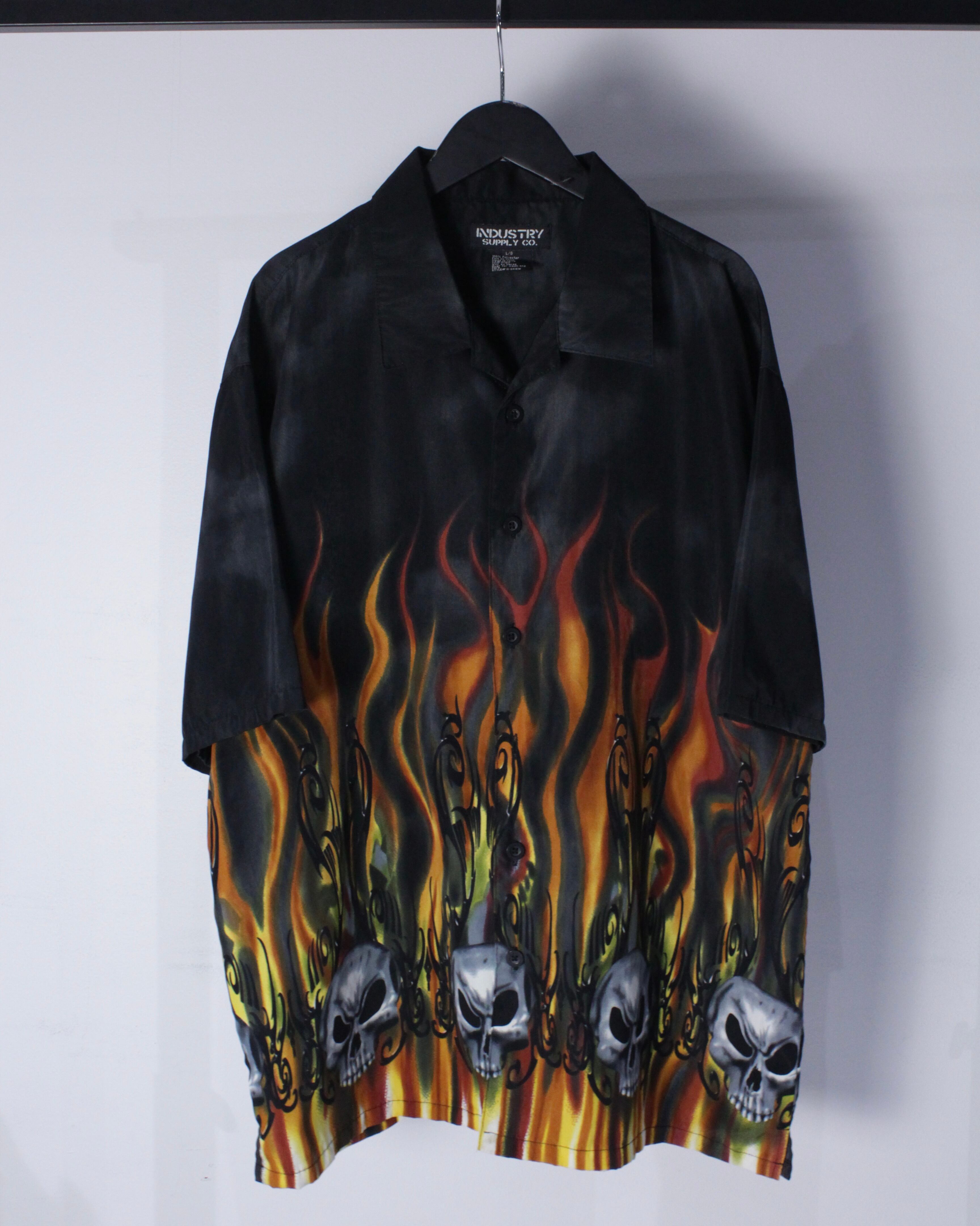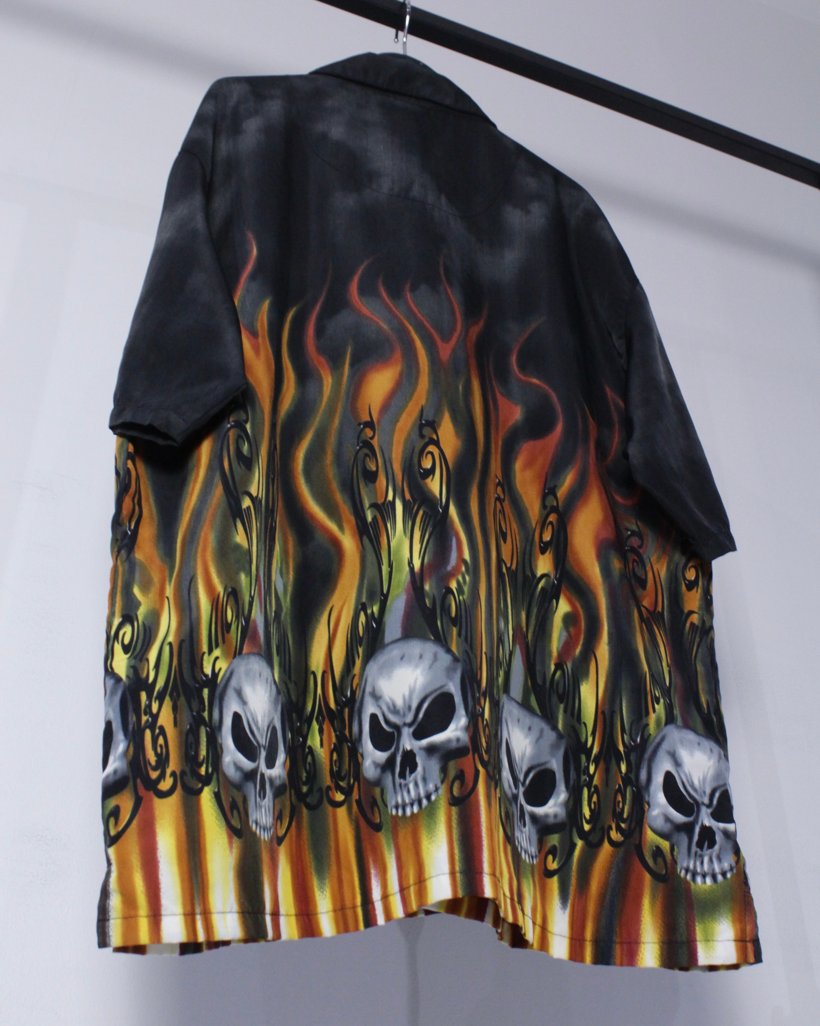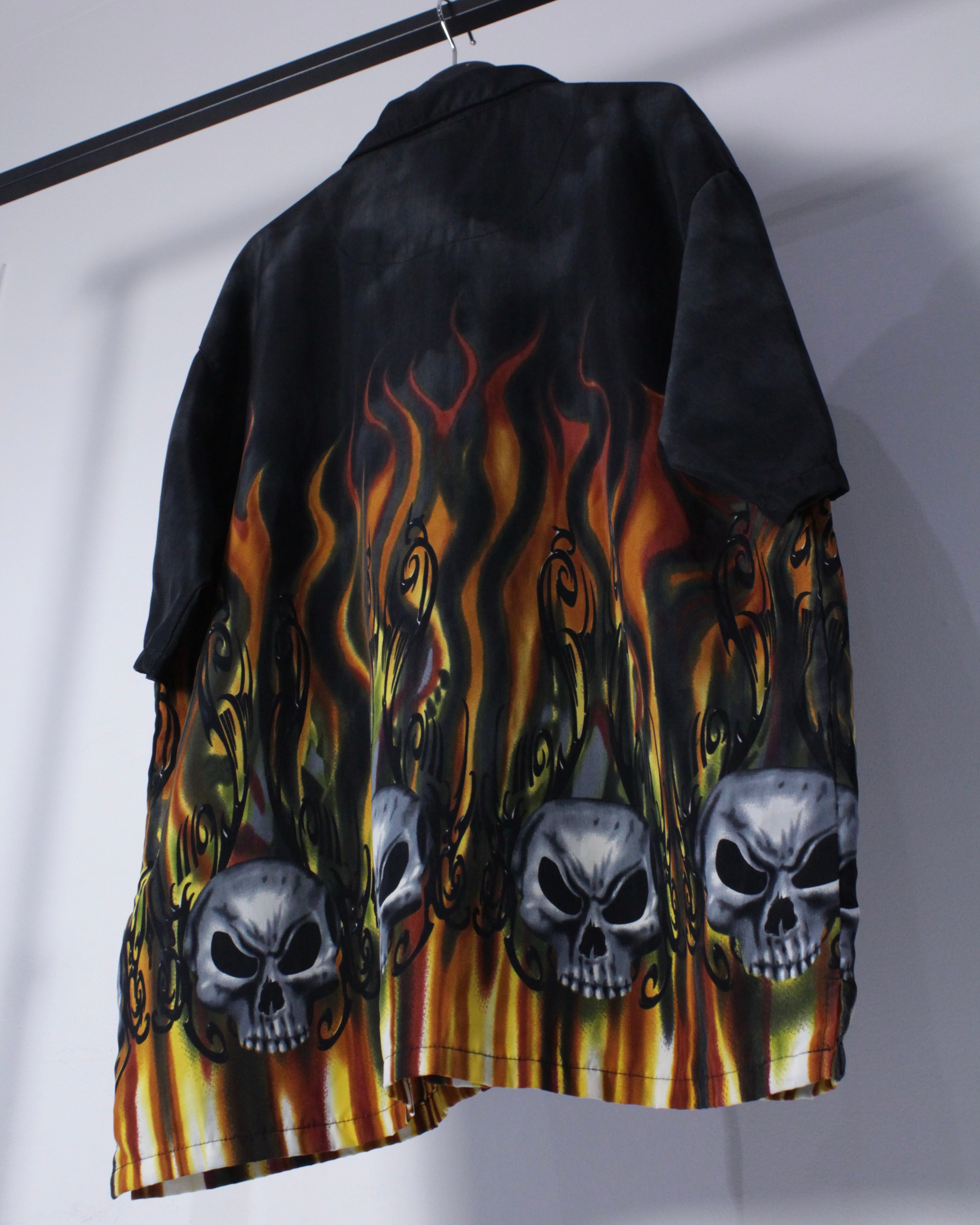 ブラックのボディをベースに、ファイヤーパターン×スカルを載せた、抜群の存在感を放つ半袖オープンカラーシャツ。